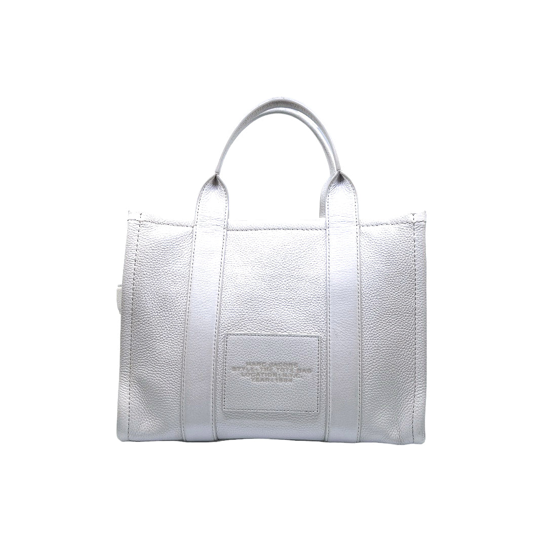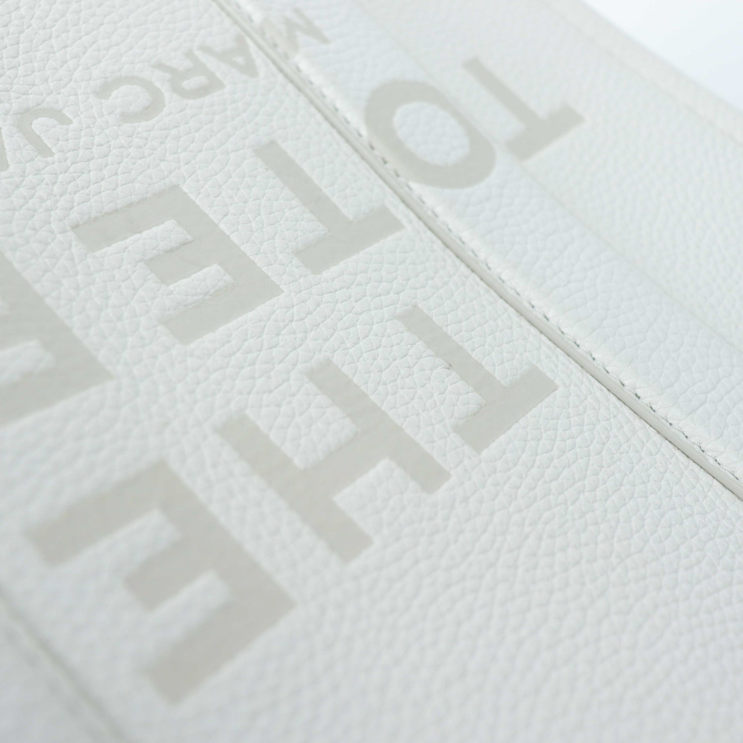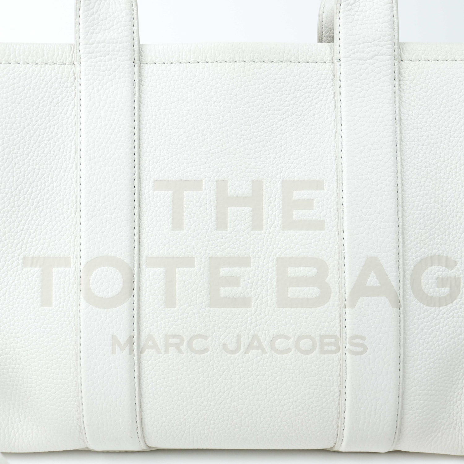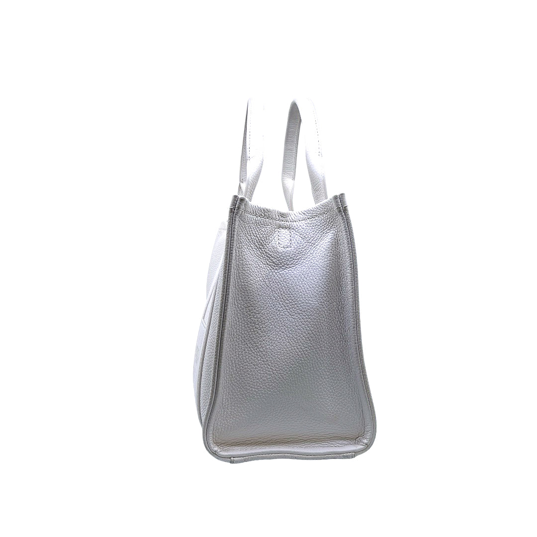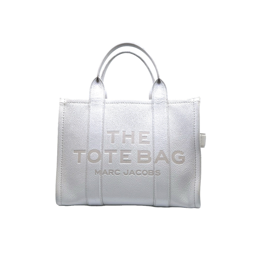 Bolso marca Marc Jacobs, de la línea The Tote Bag, confeccionado en piel color blanco, con 2 asas rígidas superiores, forro interior en tela, cuenta con correa para llevar al hombro, marcas de uso en asas y superficie.