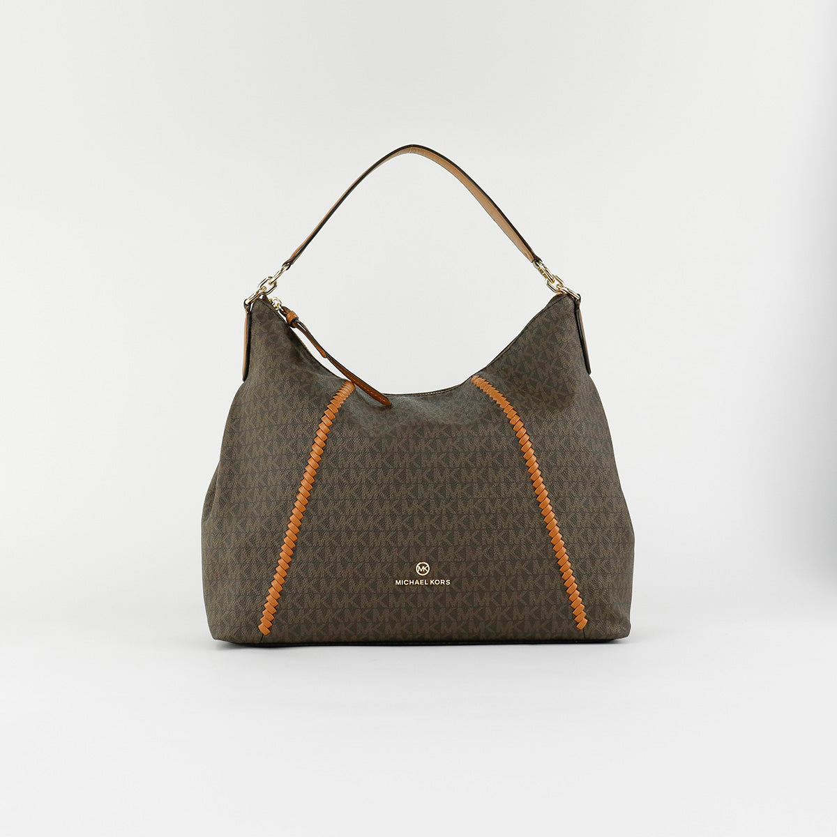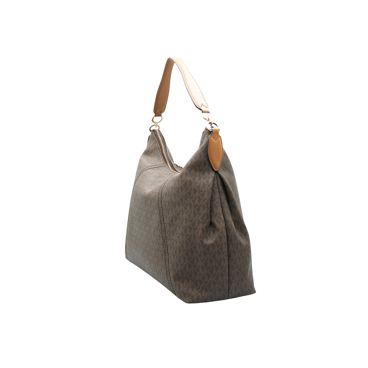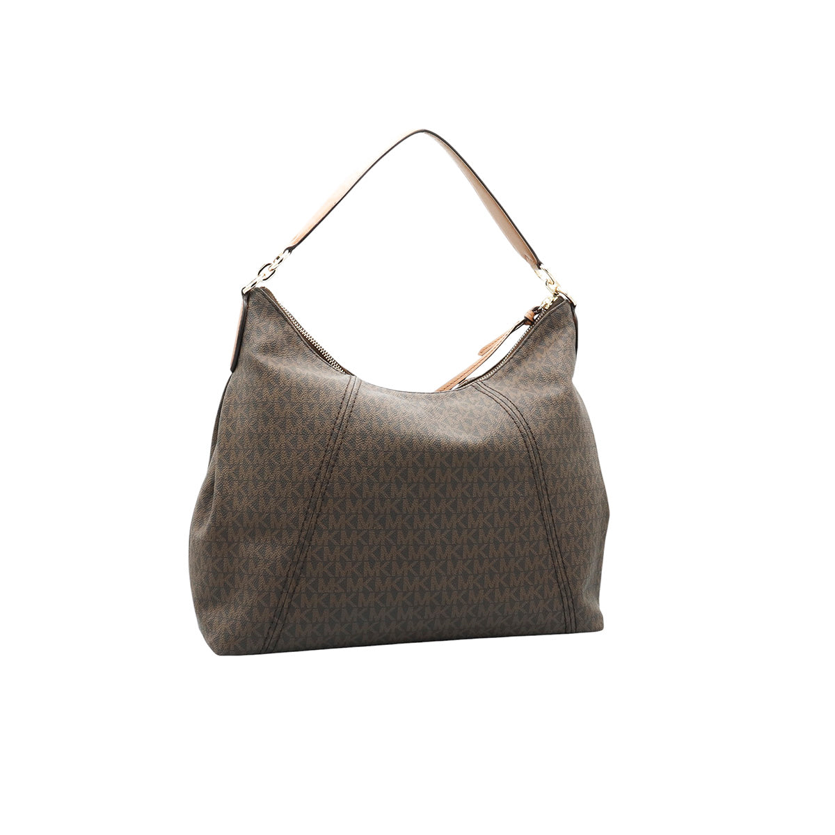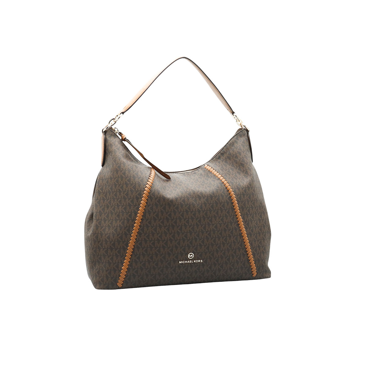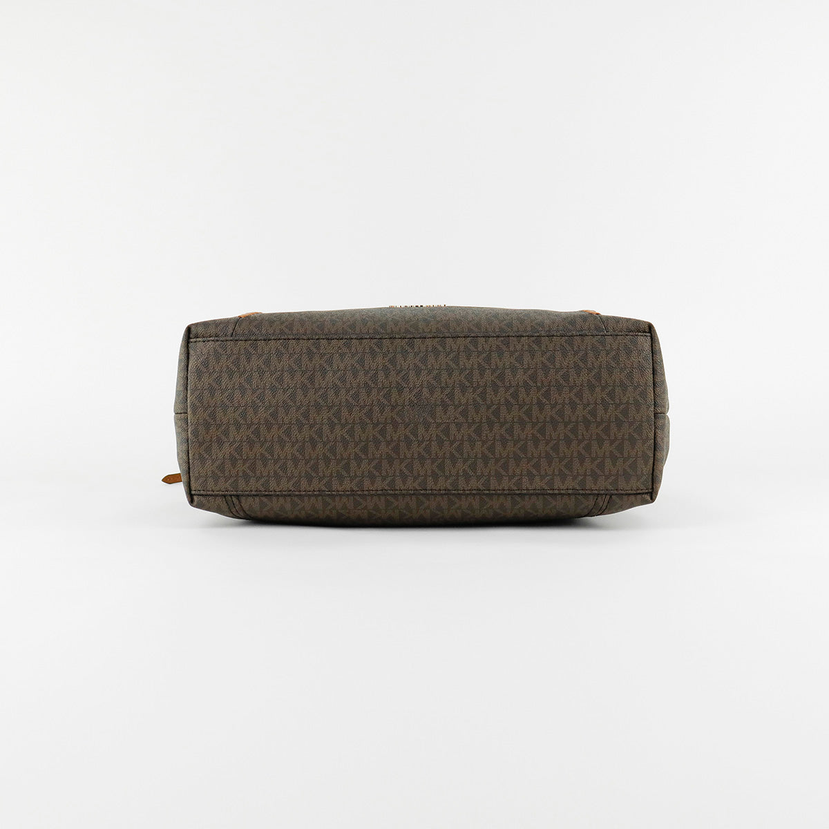 Bolso tipo de la marca Michael Kors línea Sienna, confeccionado en lona monograbada MK color café, forro interno con leve mancha, herrajes en color dorado, asa superior en piel marrón.
