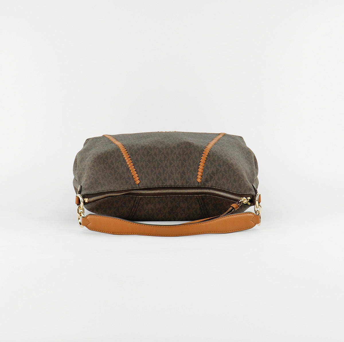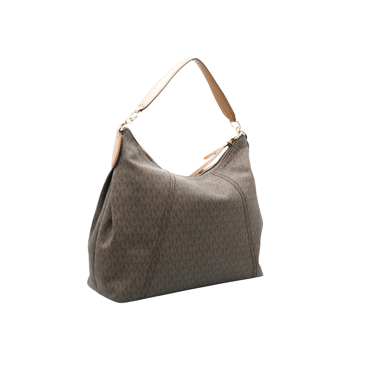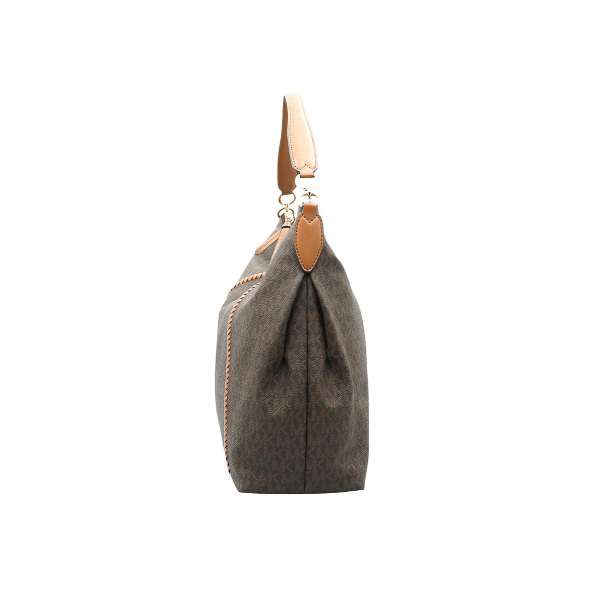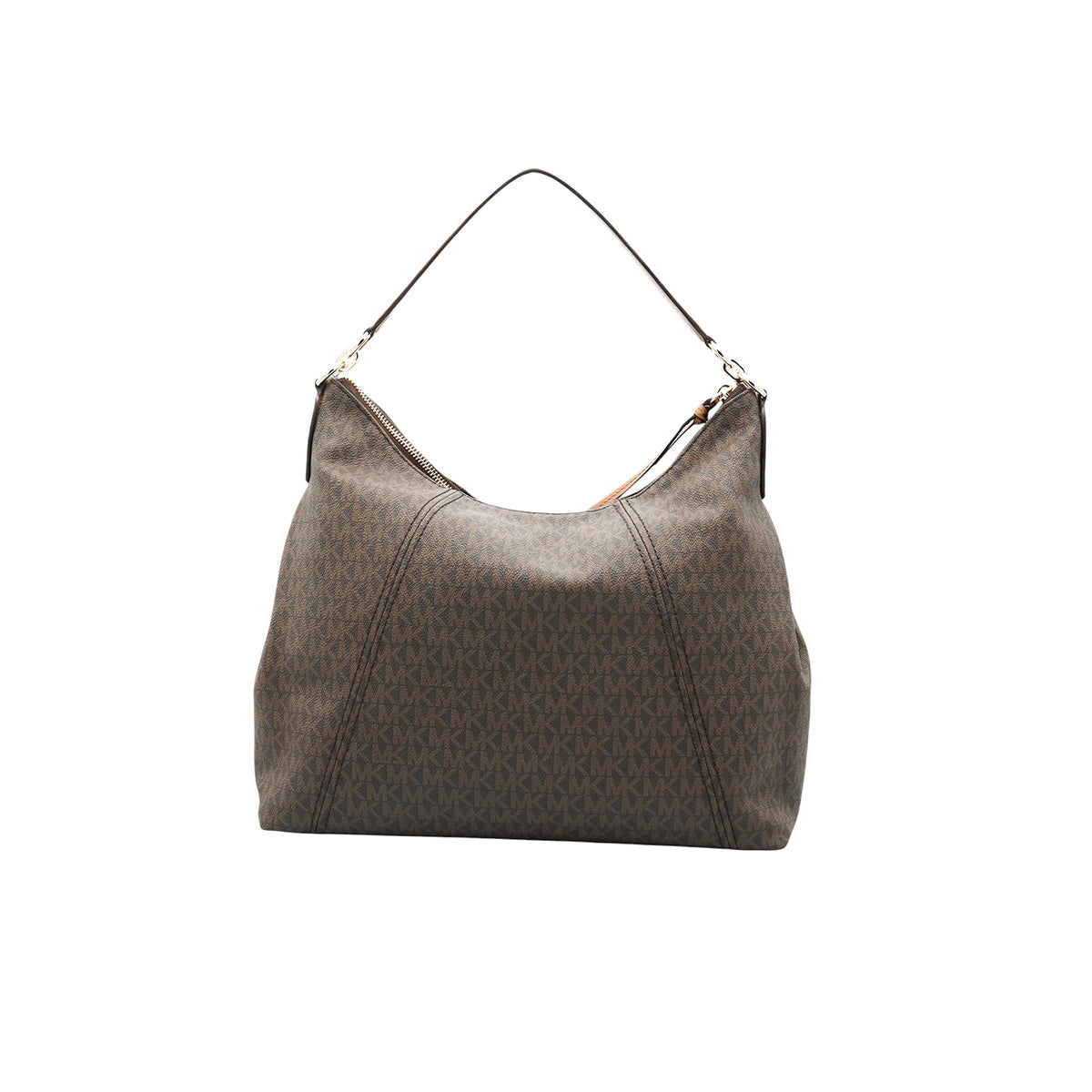Bolso tipo de la marca Michael Kors línea Sienna, confeccionado en lona monograbada MK color café, forro interno con leve mancha, herrajes en color dorado, asa superior en piel marrón.