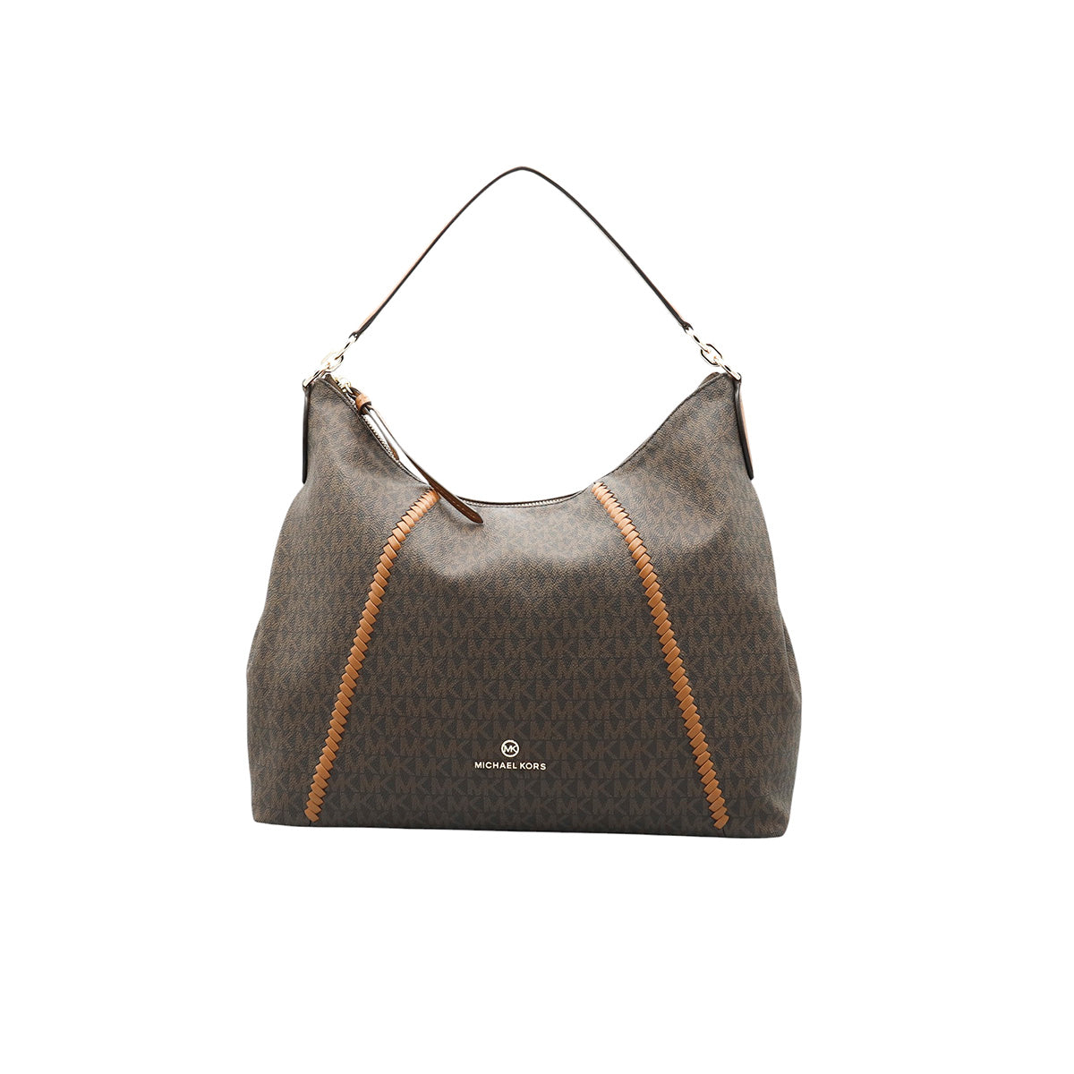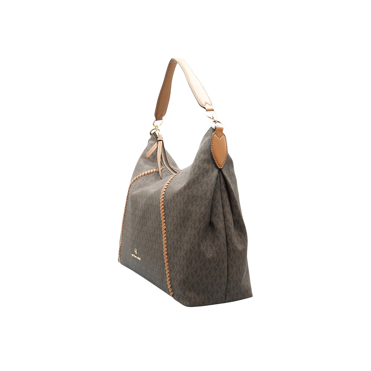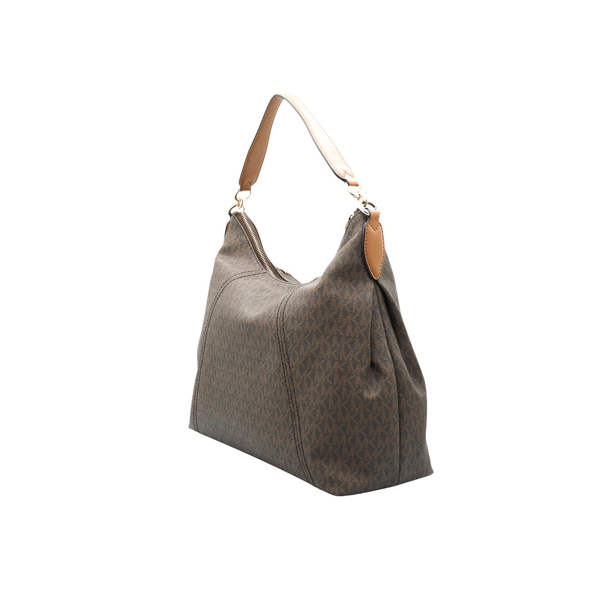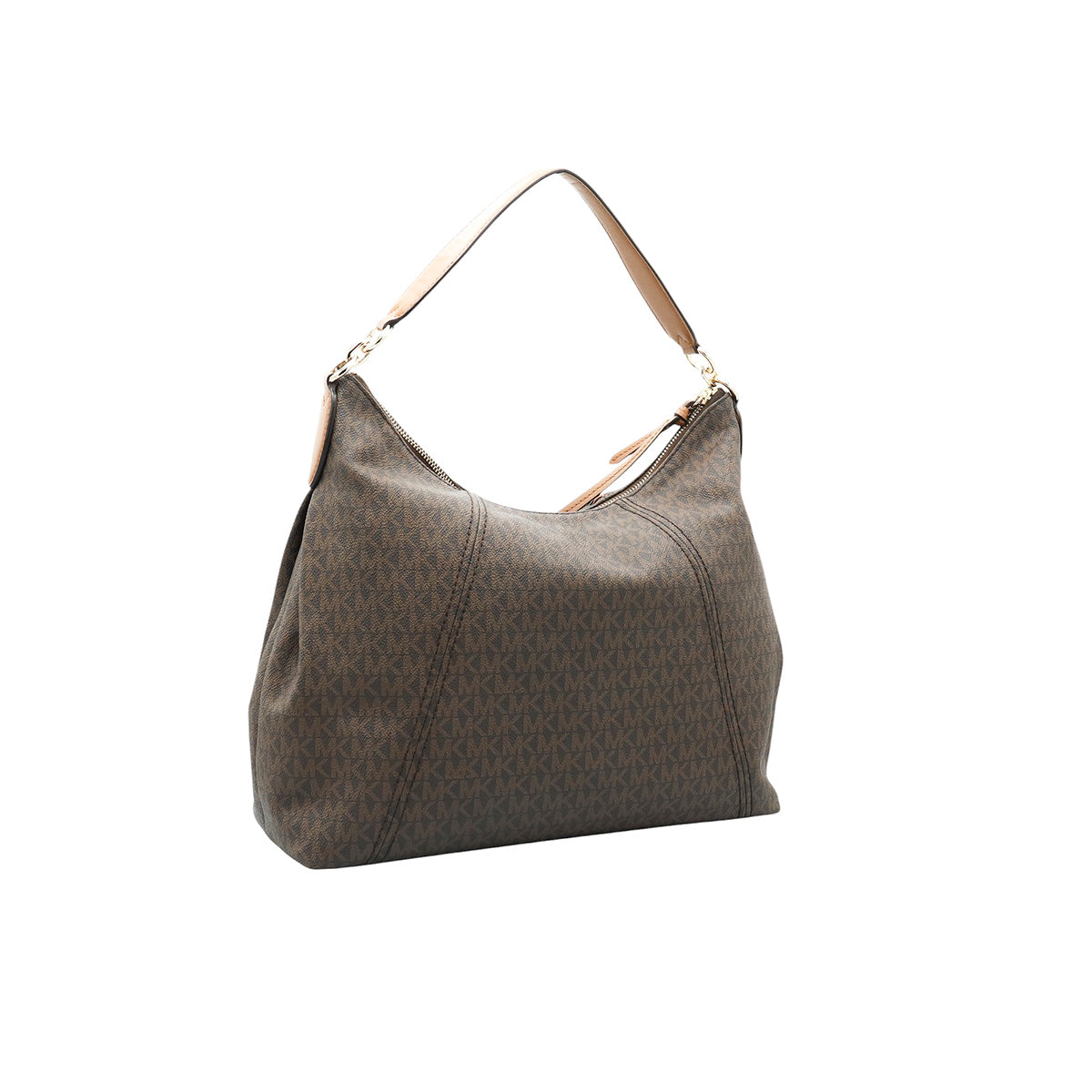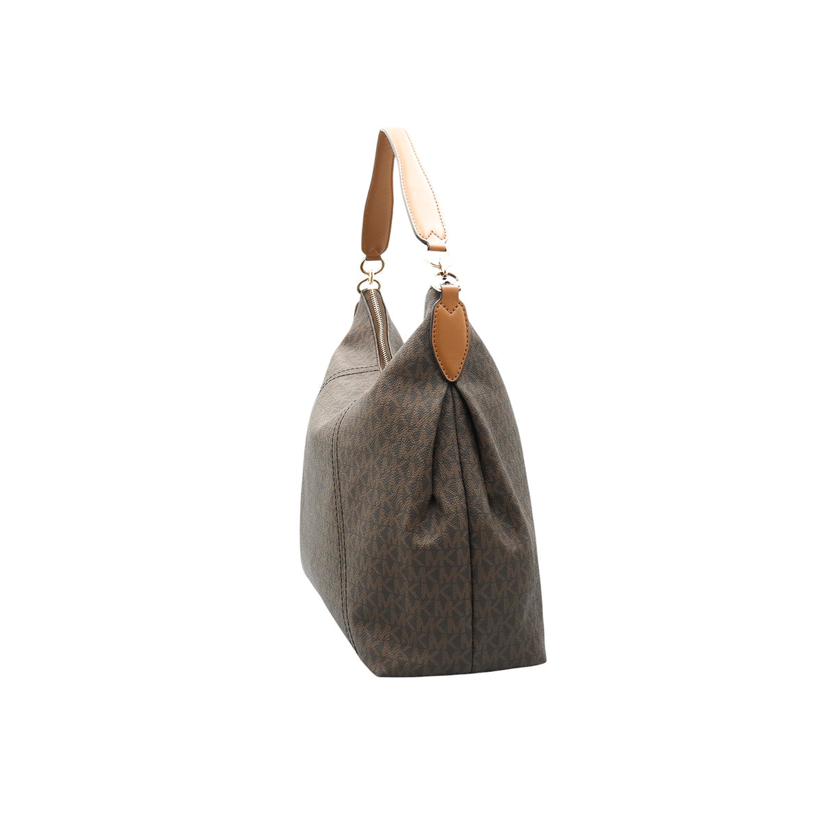 Bolso tipo de la marca Michael Kors línea Sienna, confeccionado en lona monograbada MK color café, forro interno con leve mancha, herrajes en color dorado, asa superior en piel marrón.