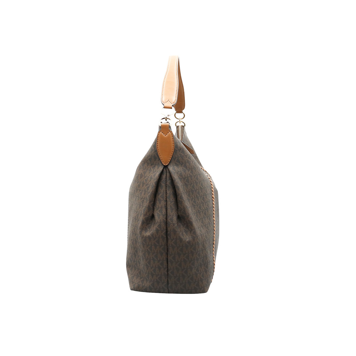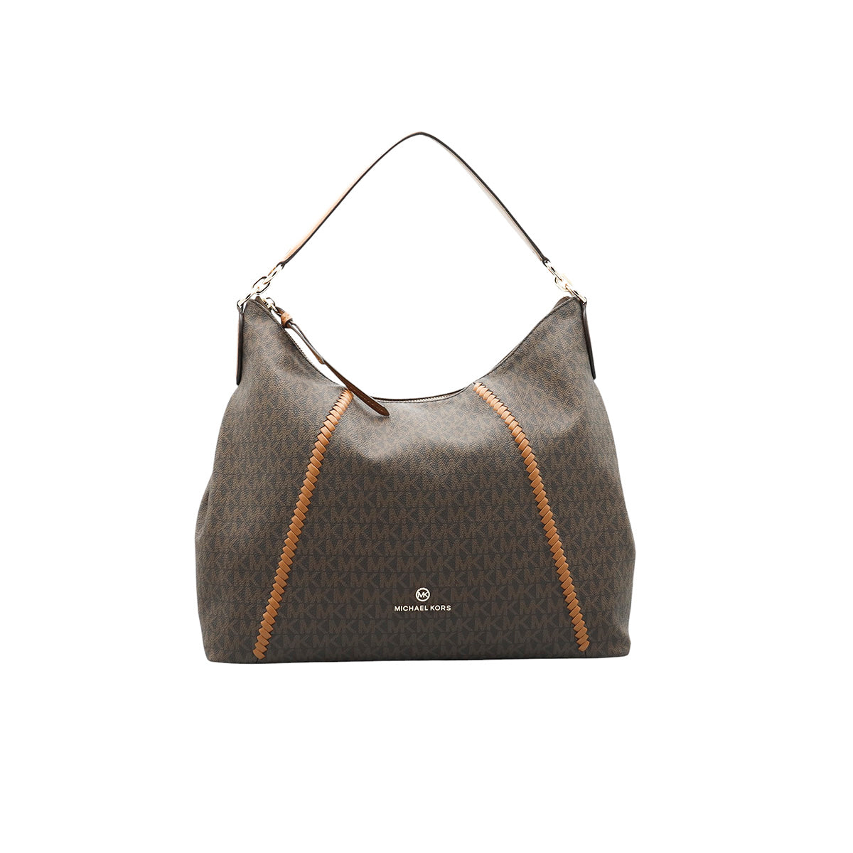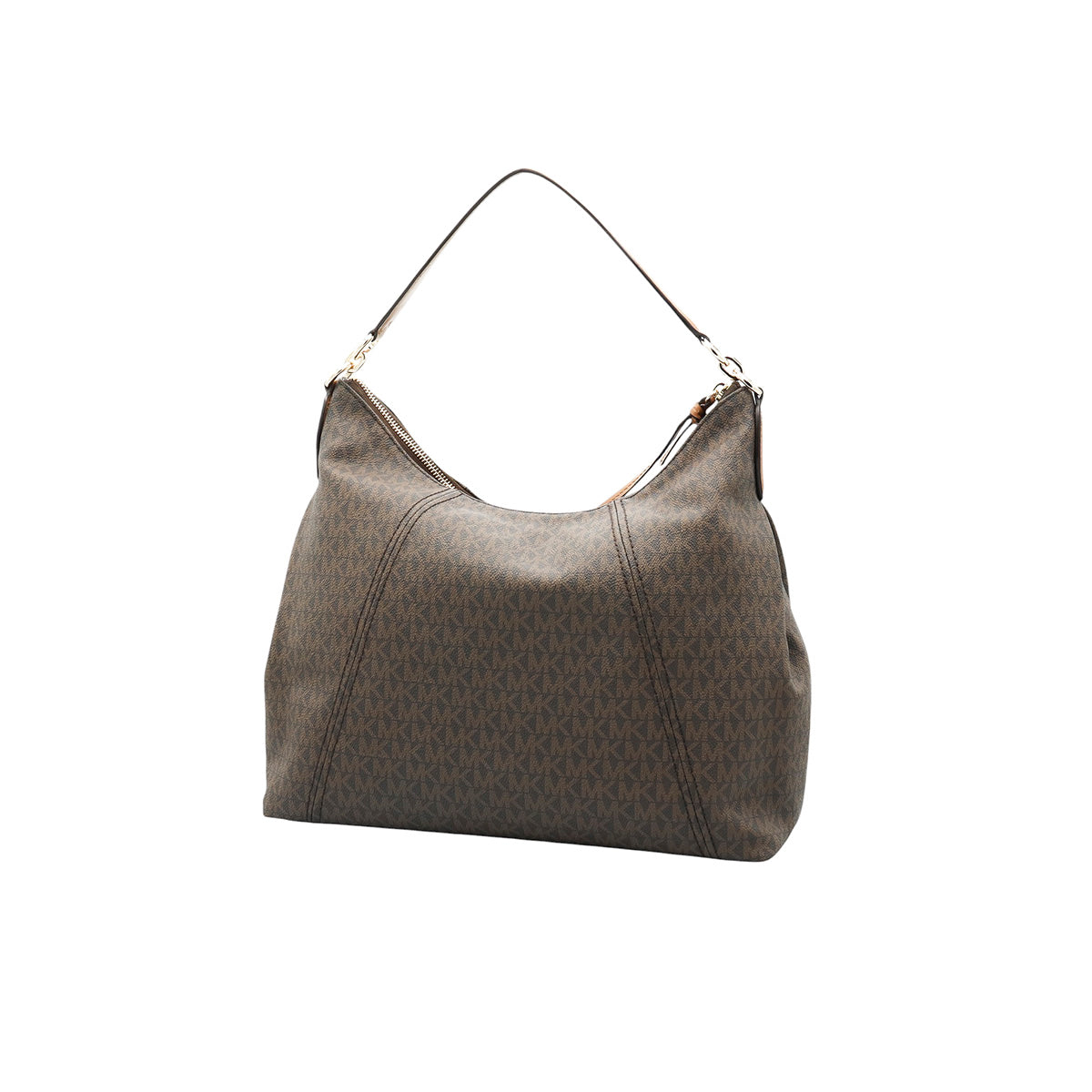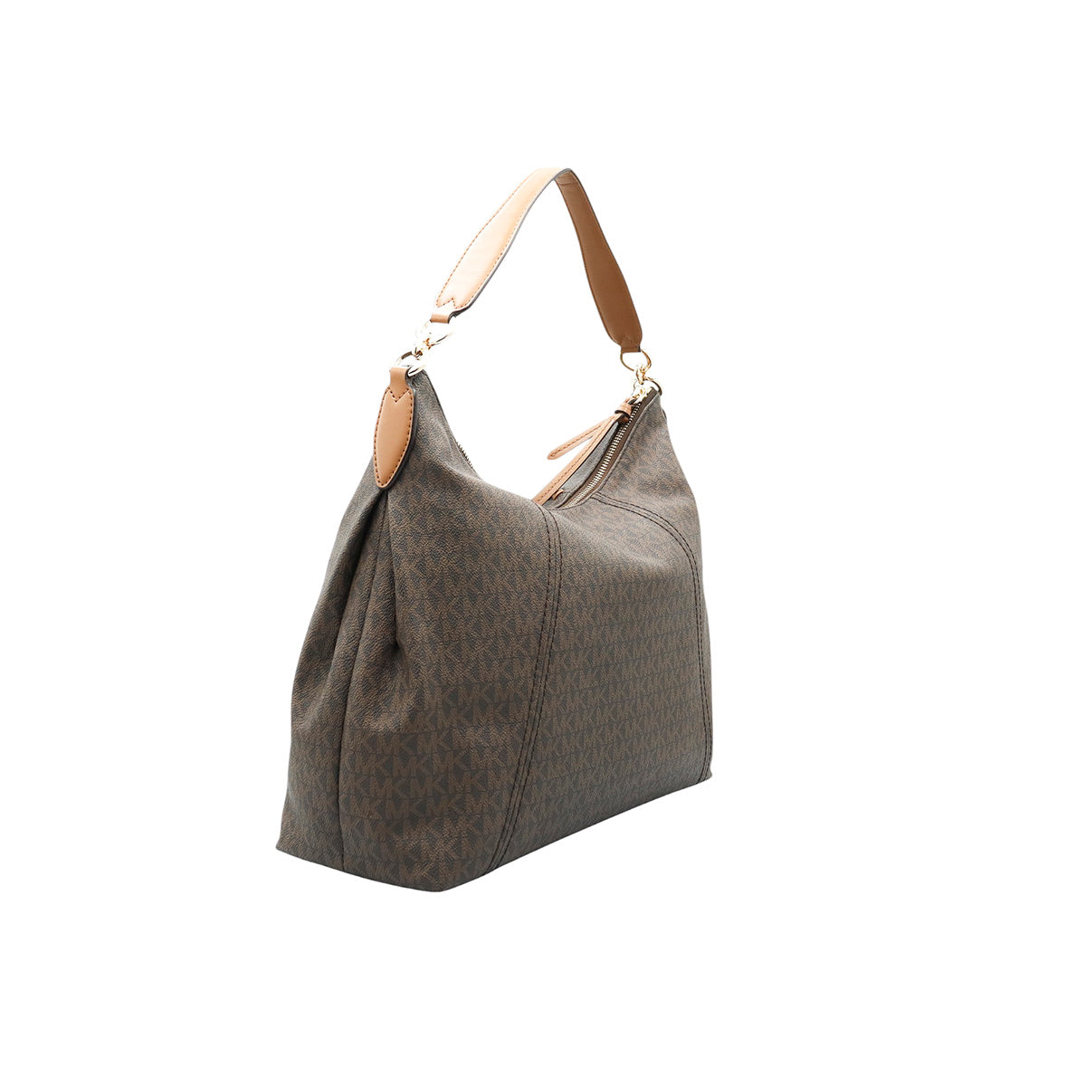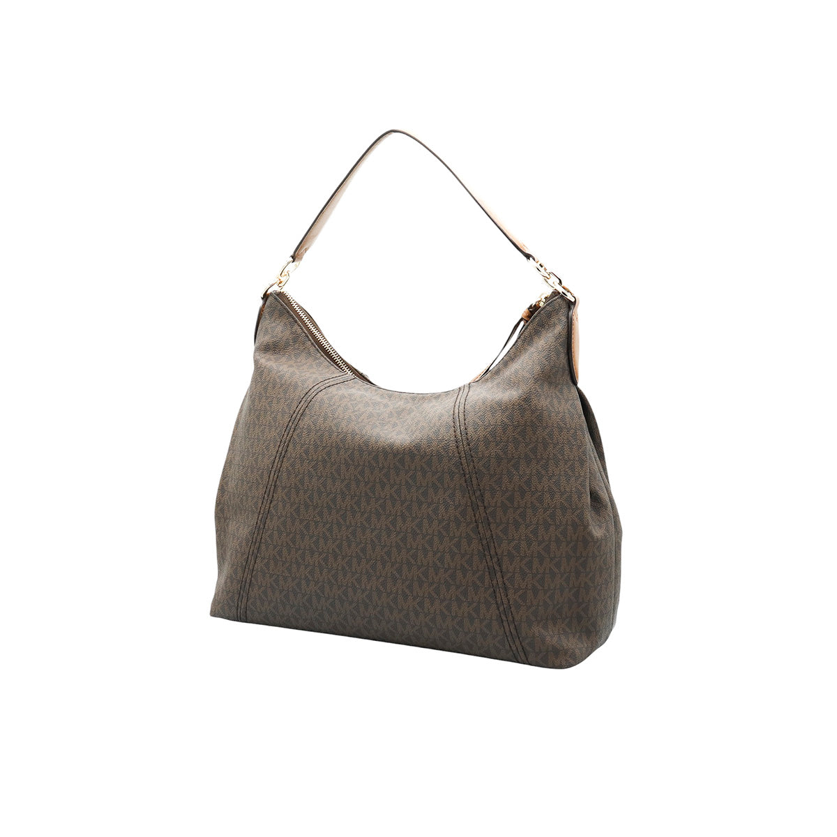 Bolso tipo de la marca Michael Kors línea Sienna, confeccionado en lona monograbada MK color café, forro interno con leve mancha, herrajes en color dorado, asa superior en piel marrón.