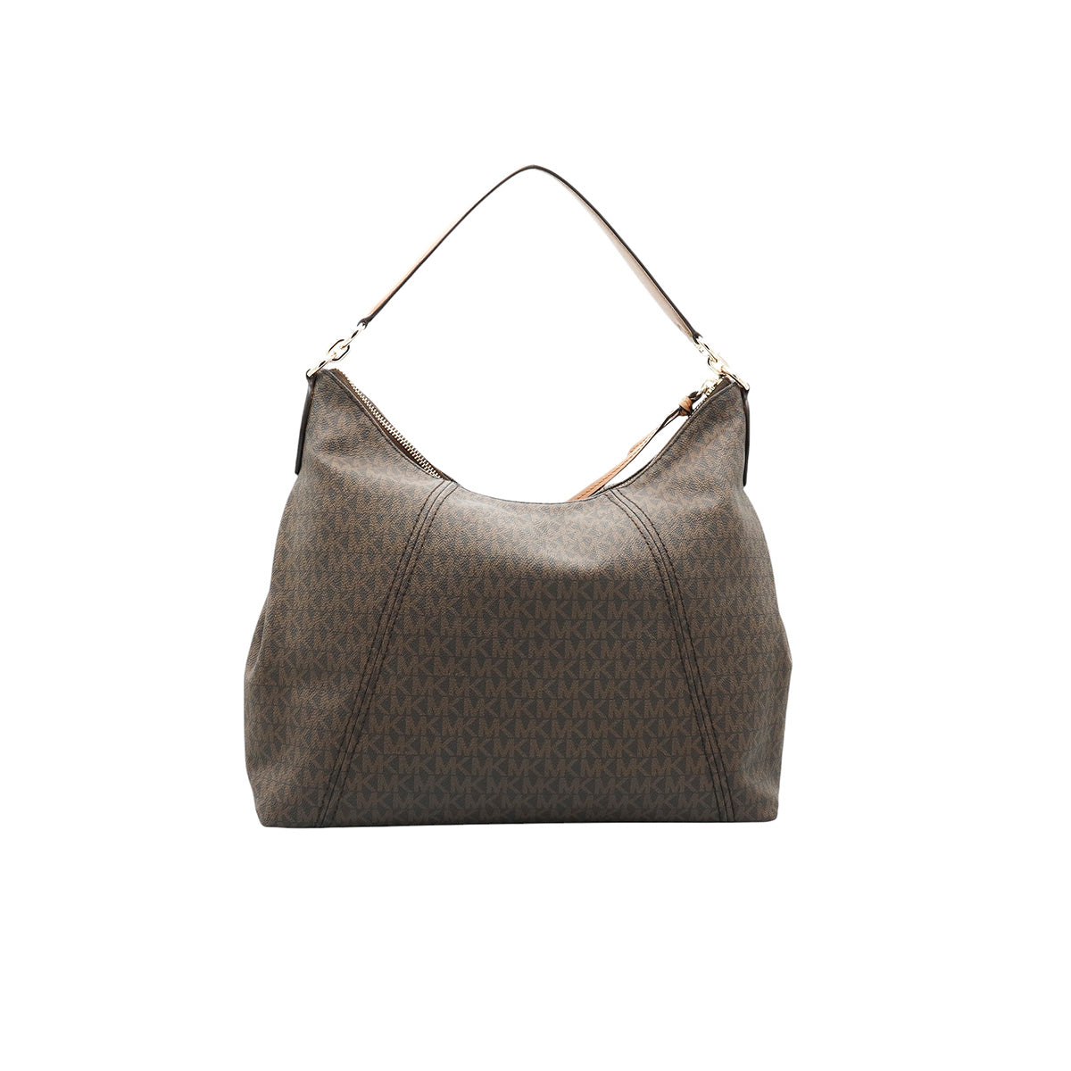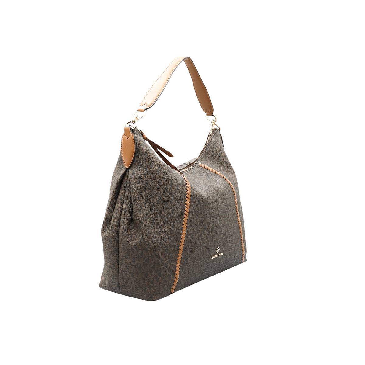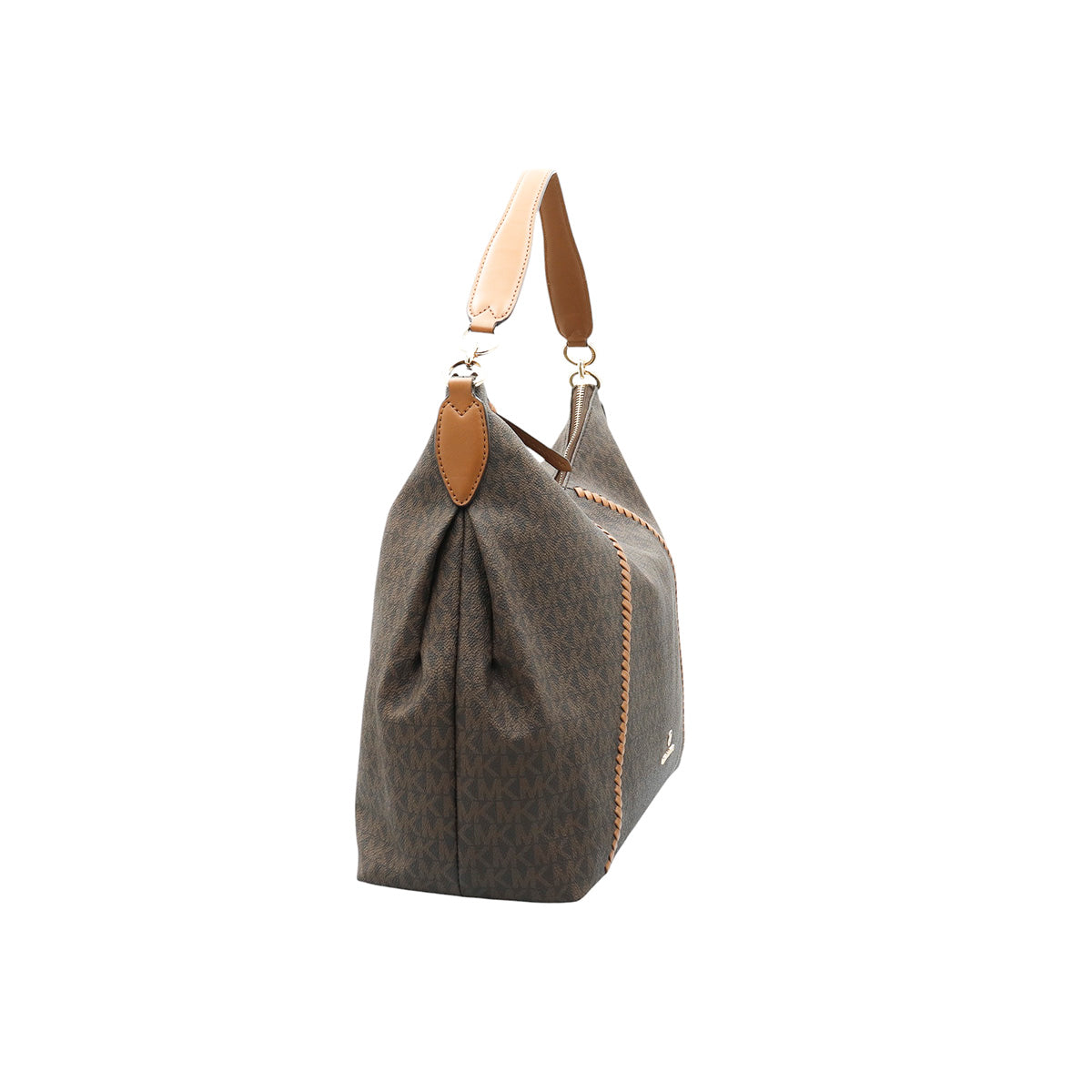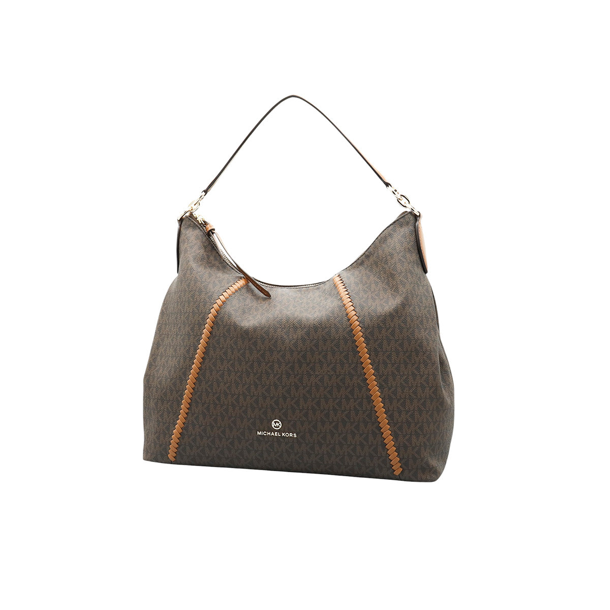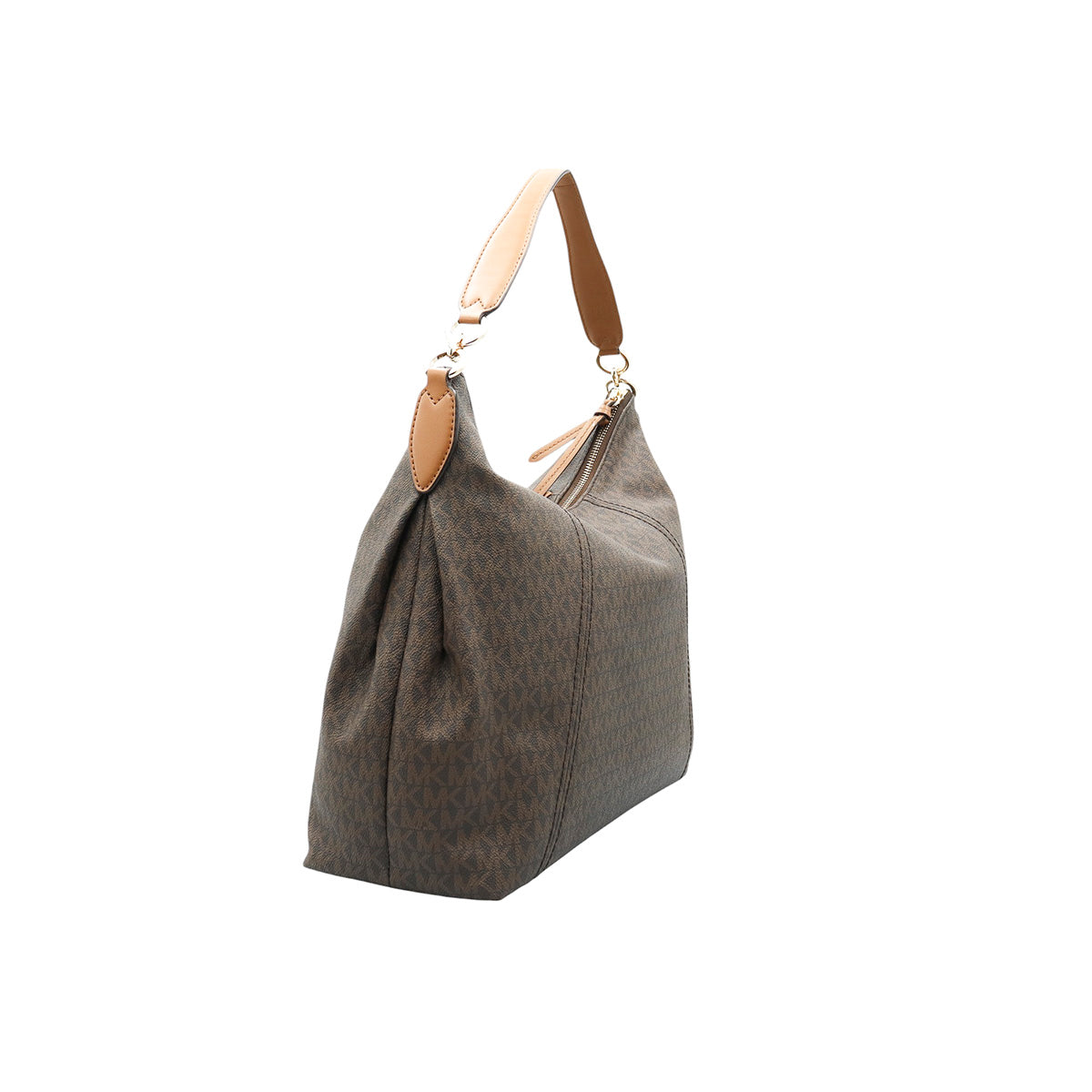 Bolso tipo de la marca Michael Kors línea Sienna, confeccionado en lona monograbada MK color café, forro interno con leve mancha, herrajes en color dorado, asa superior en piel marrón.