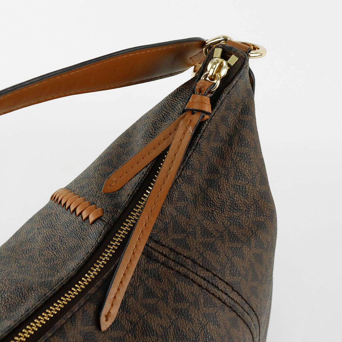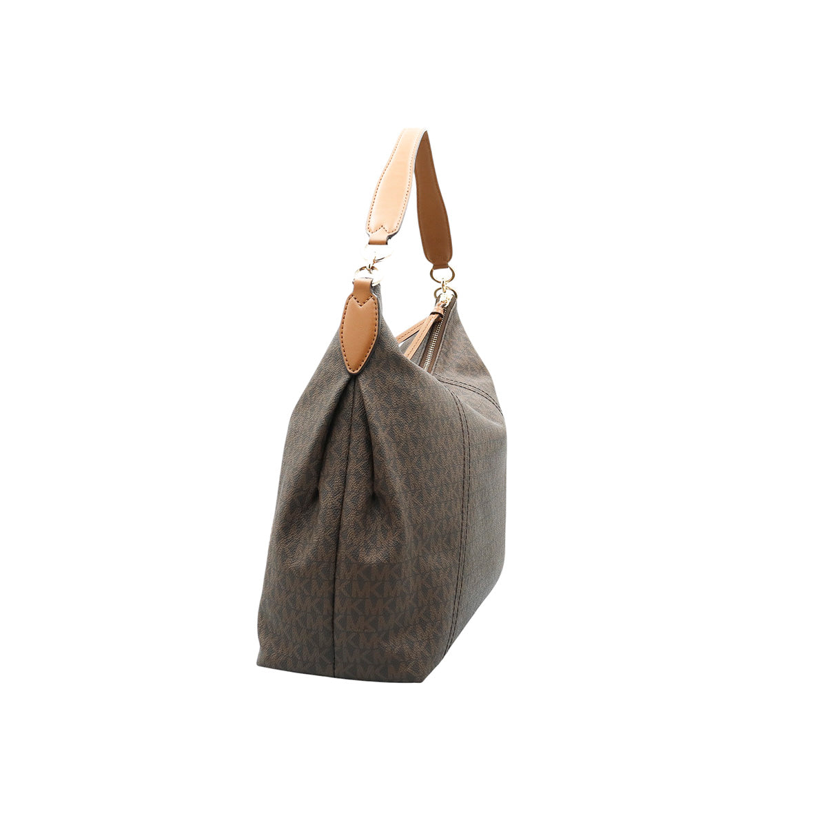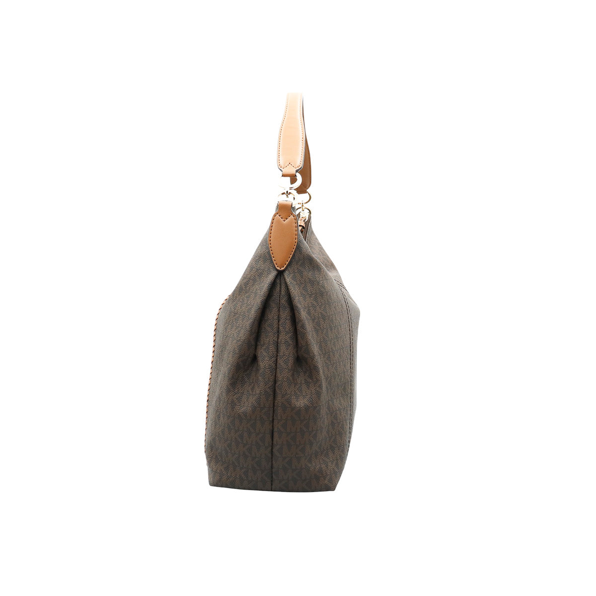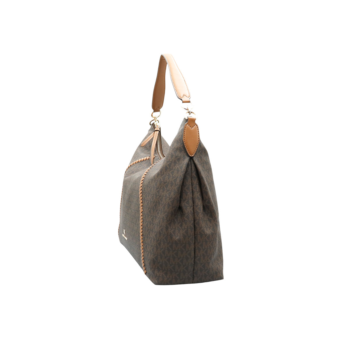 Bolso tipo de la marca Michael Kors línea Sienna, confeccionado en lona monograbada MK color café, forro interno con leve mancha, herrajes en color dorado, asa superior en piel marrón.