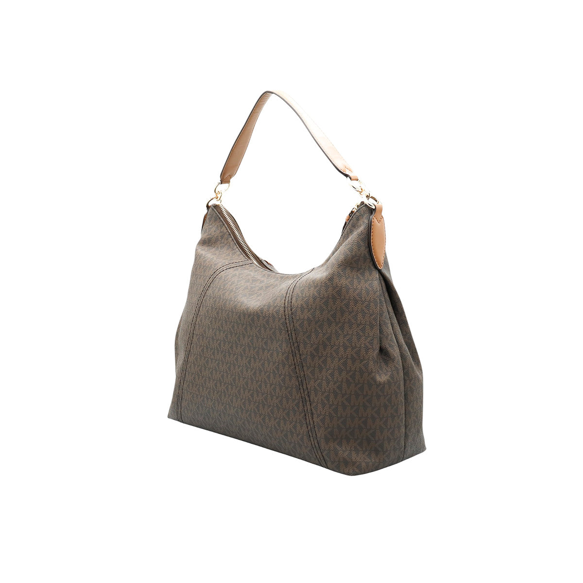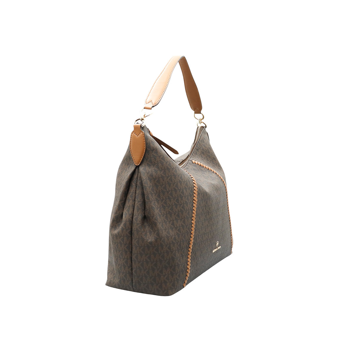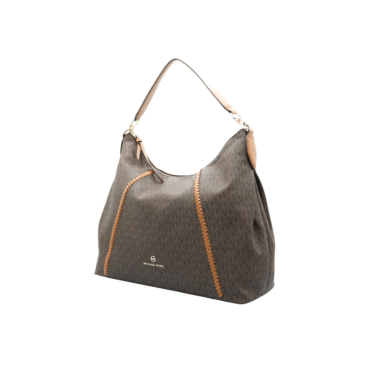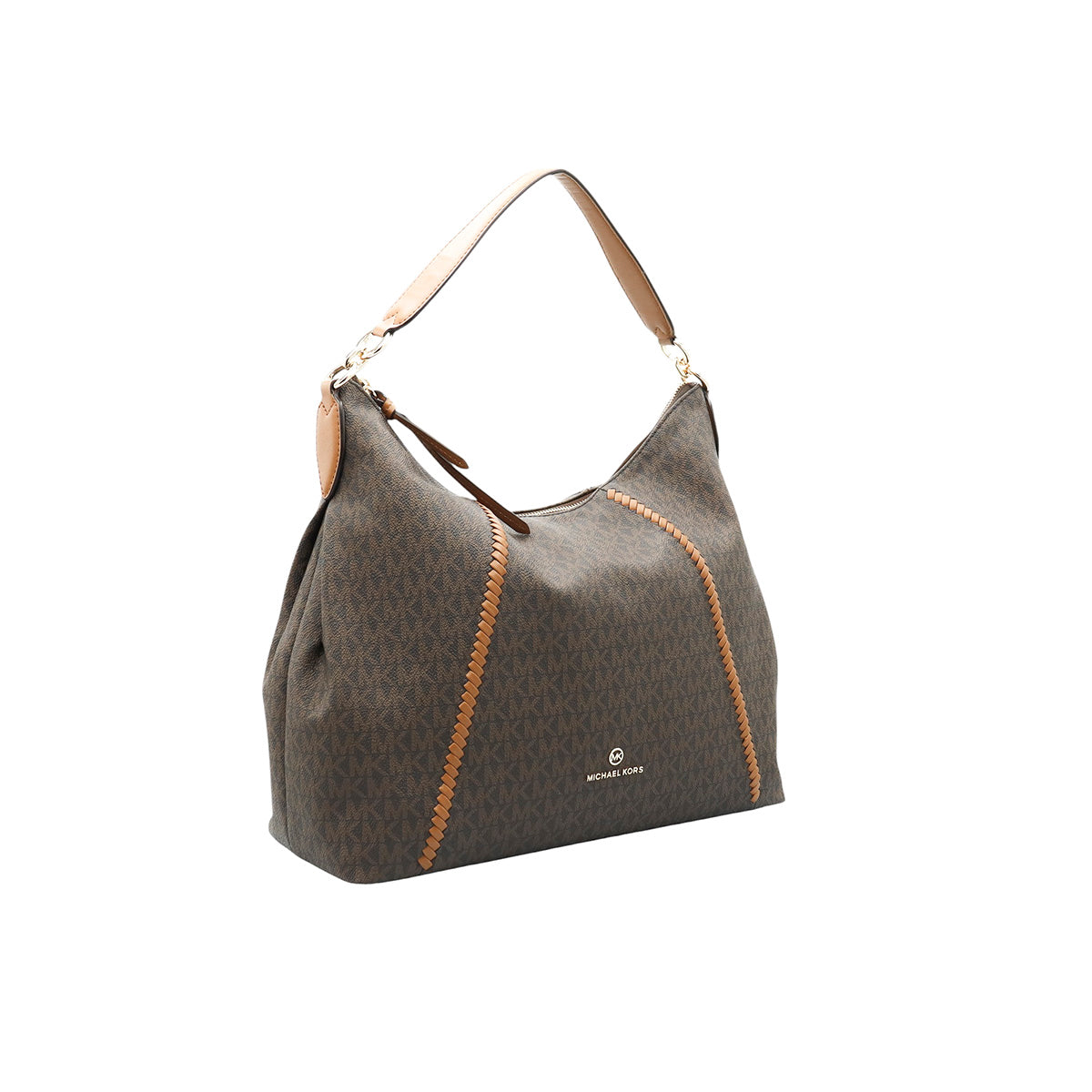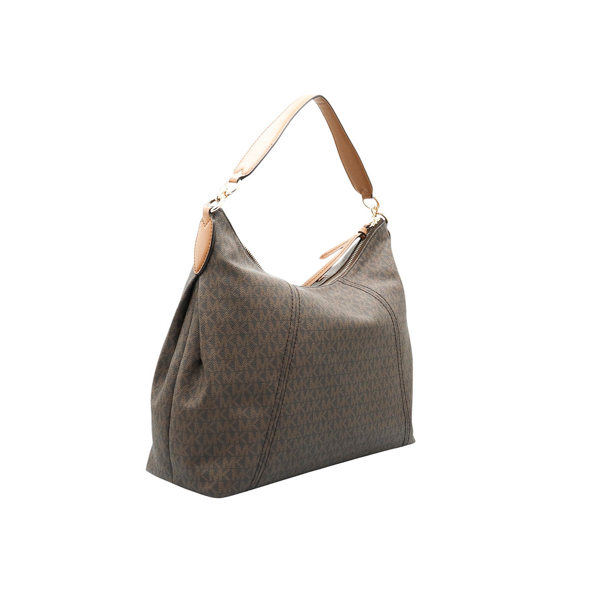 Bolso tipo de la marca Michael Kors línea Sienna, confeccionado en lona monograbada MK color café, forro interno con leve mancha, herrajes en color dorado, asa superior en piel marrón.