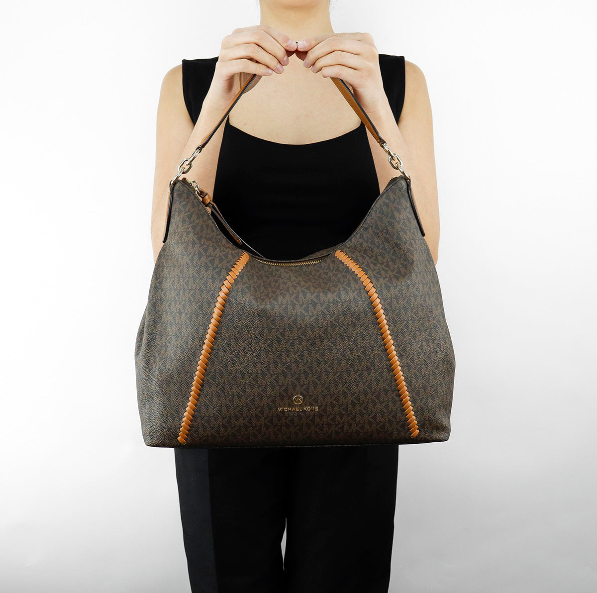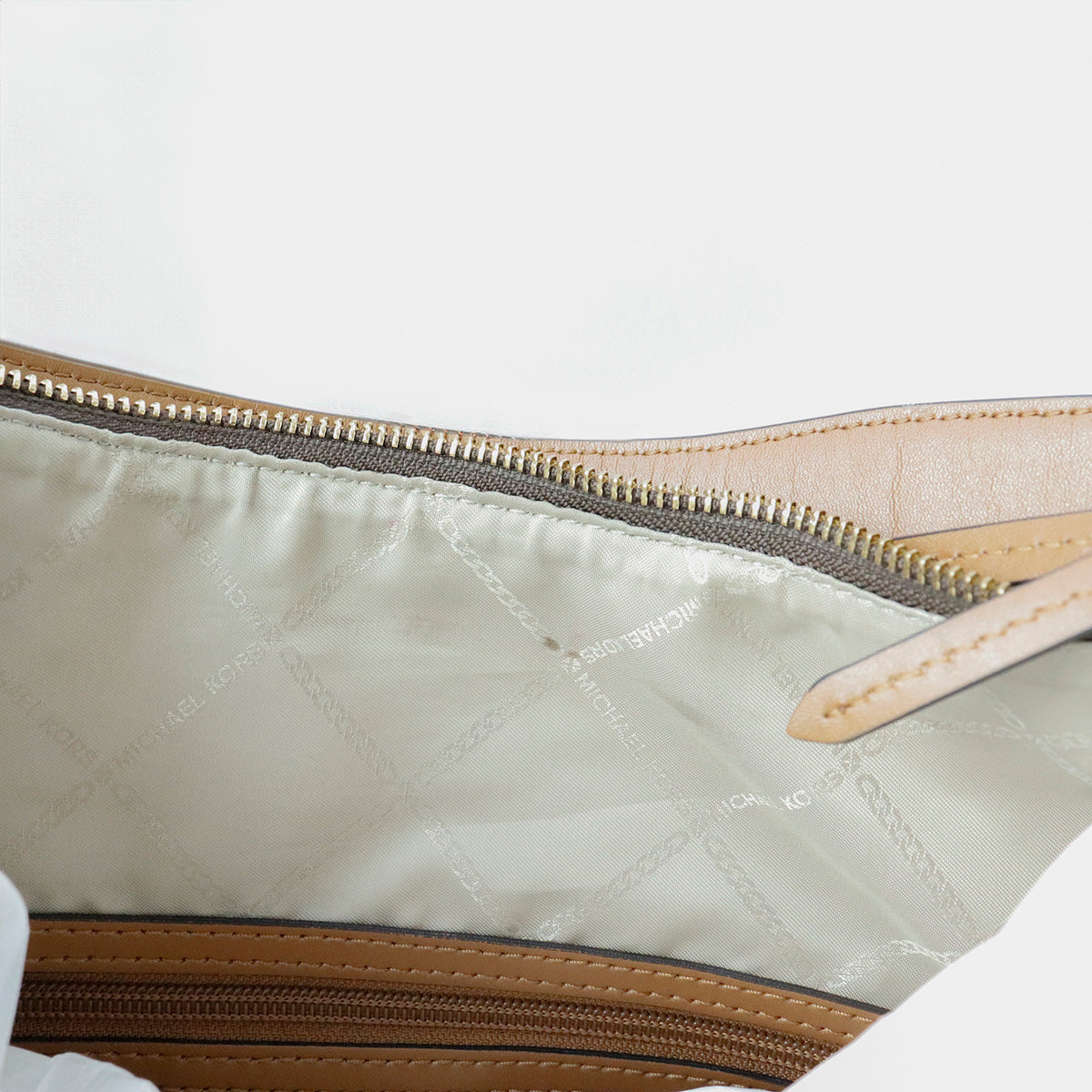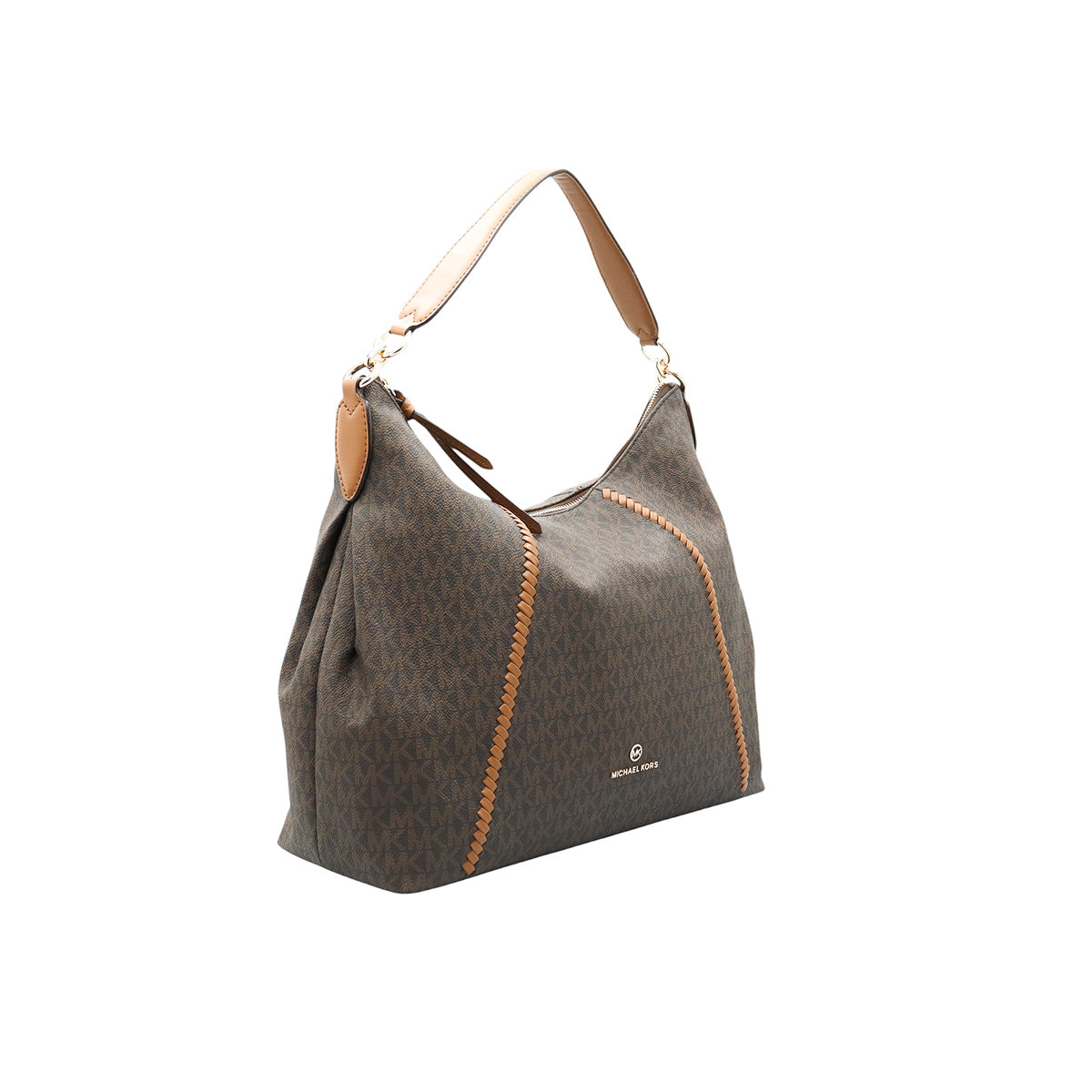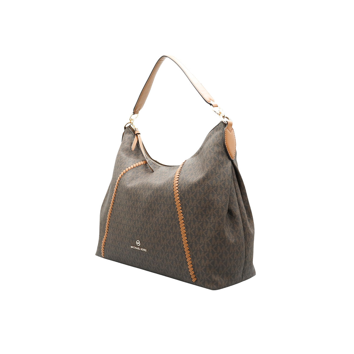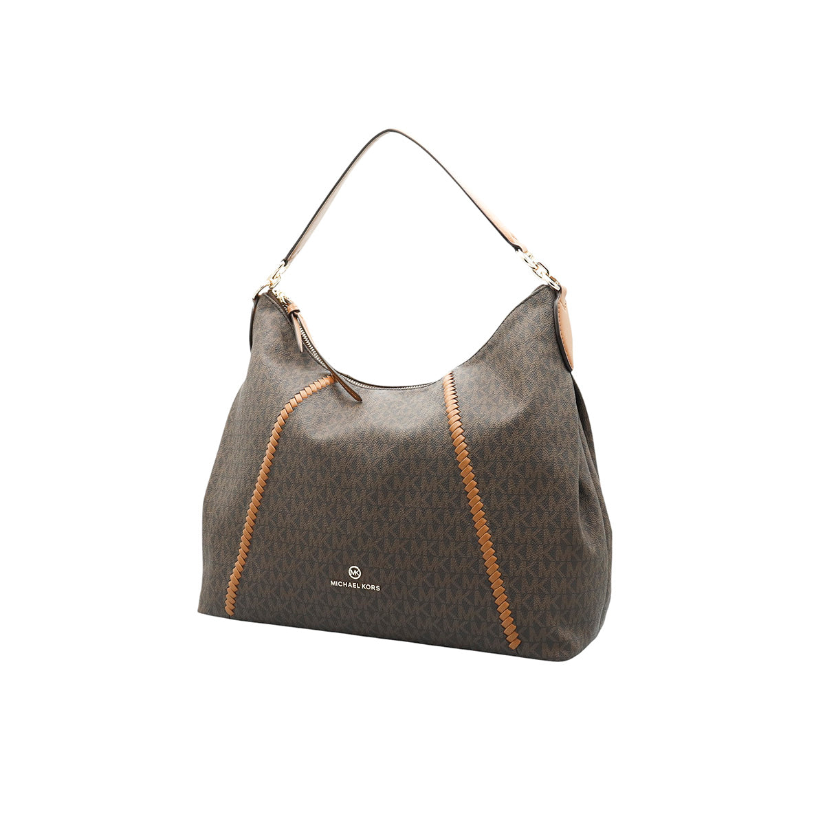 Bolso tipo de la marca Michael Kors línea Sienna, confeccionado en lona monograbada MK color café, forro interno con leve mancha, herrajes en color dorado, asa superior en piel marrón.
