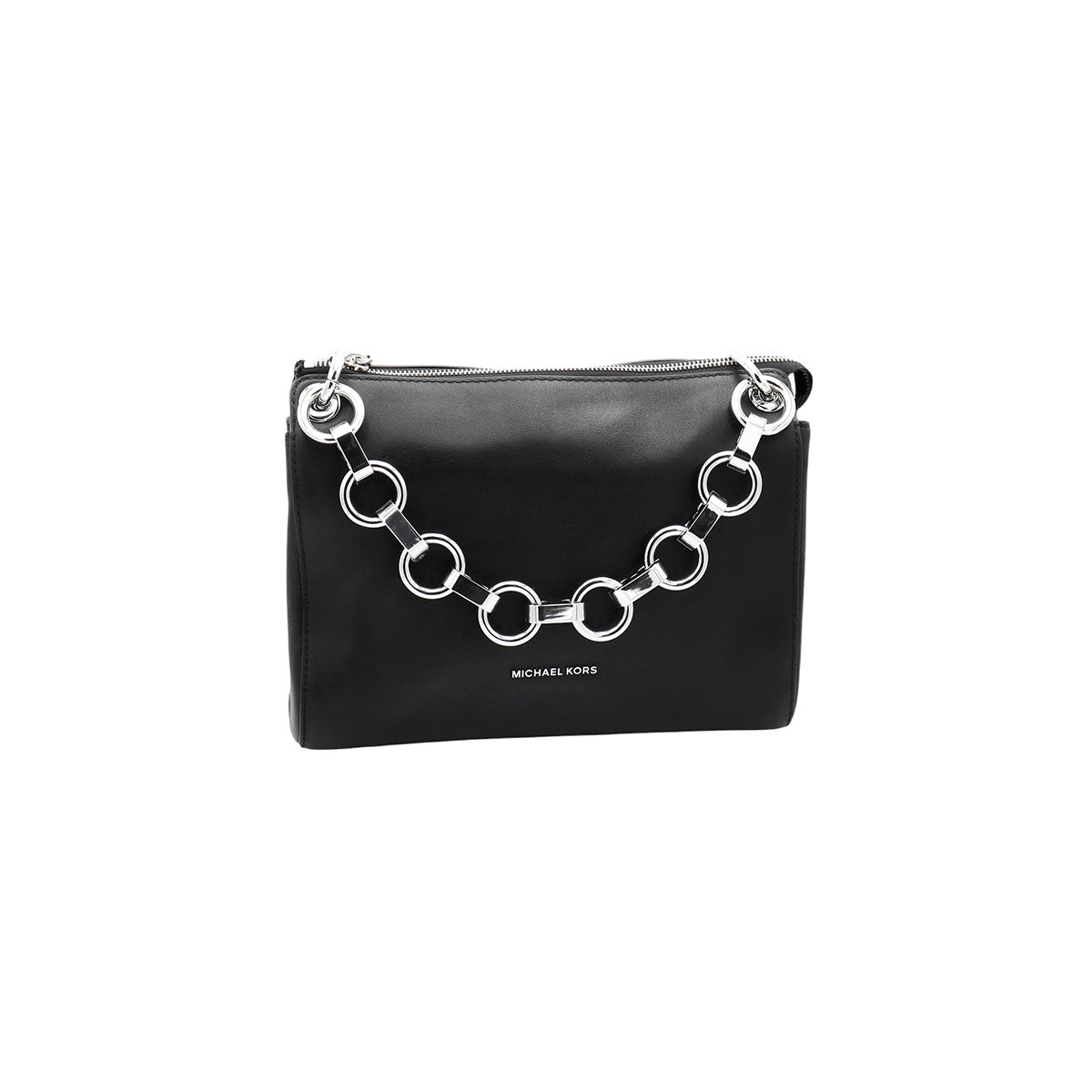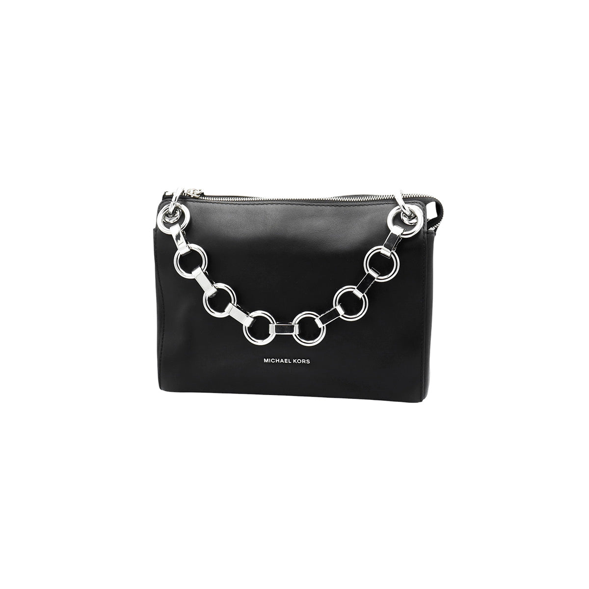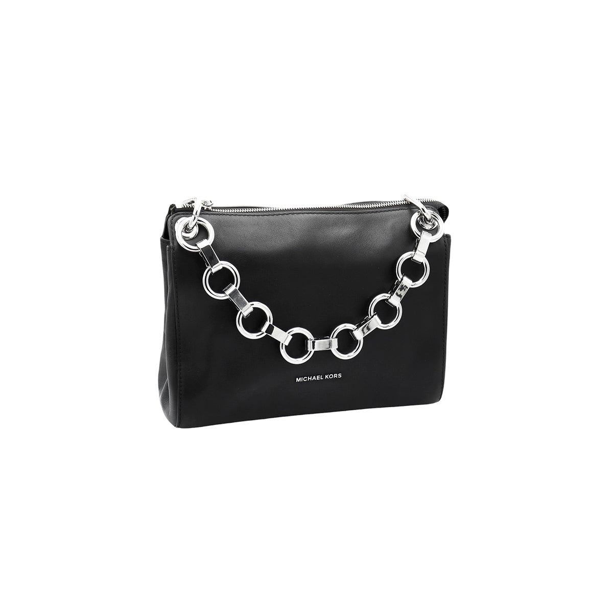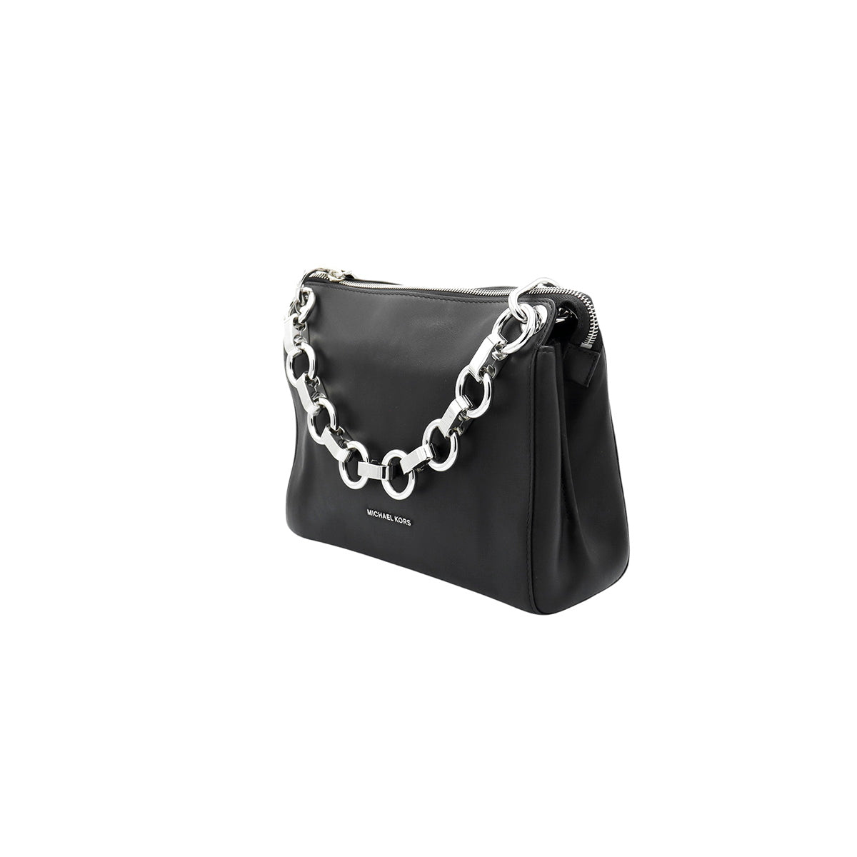 Bolso Michael Kors de la línea Gianna, confeccionado en piel color negro con forro interno en textil del mismo tono, con asa tipo cadena y bandolera de cuero, herrajes en color plateado.