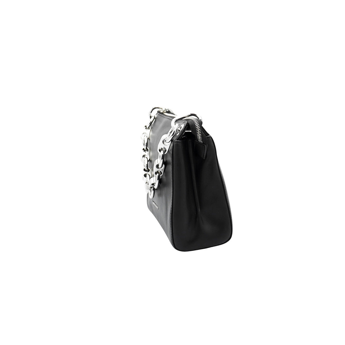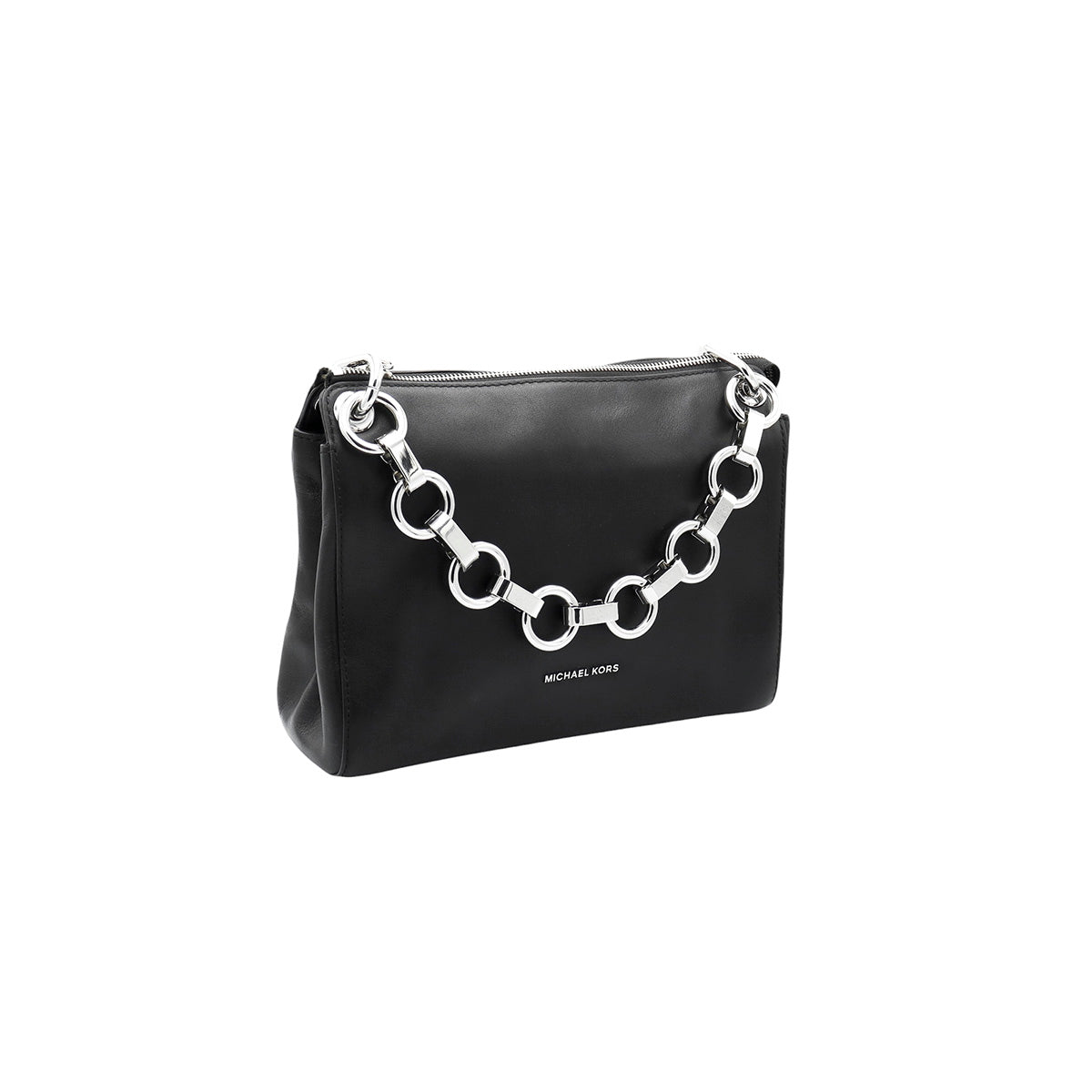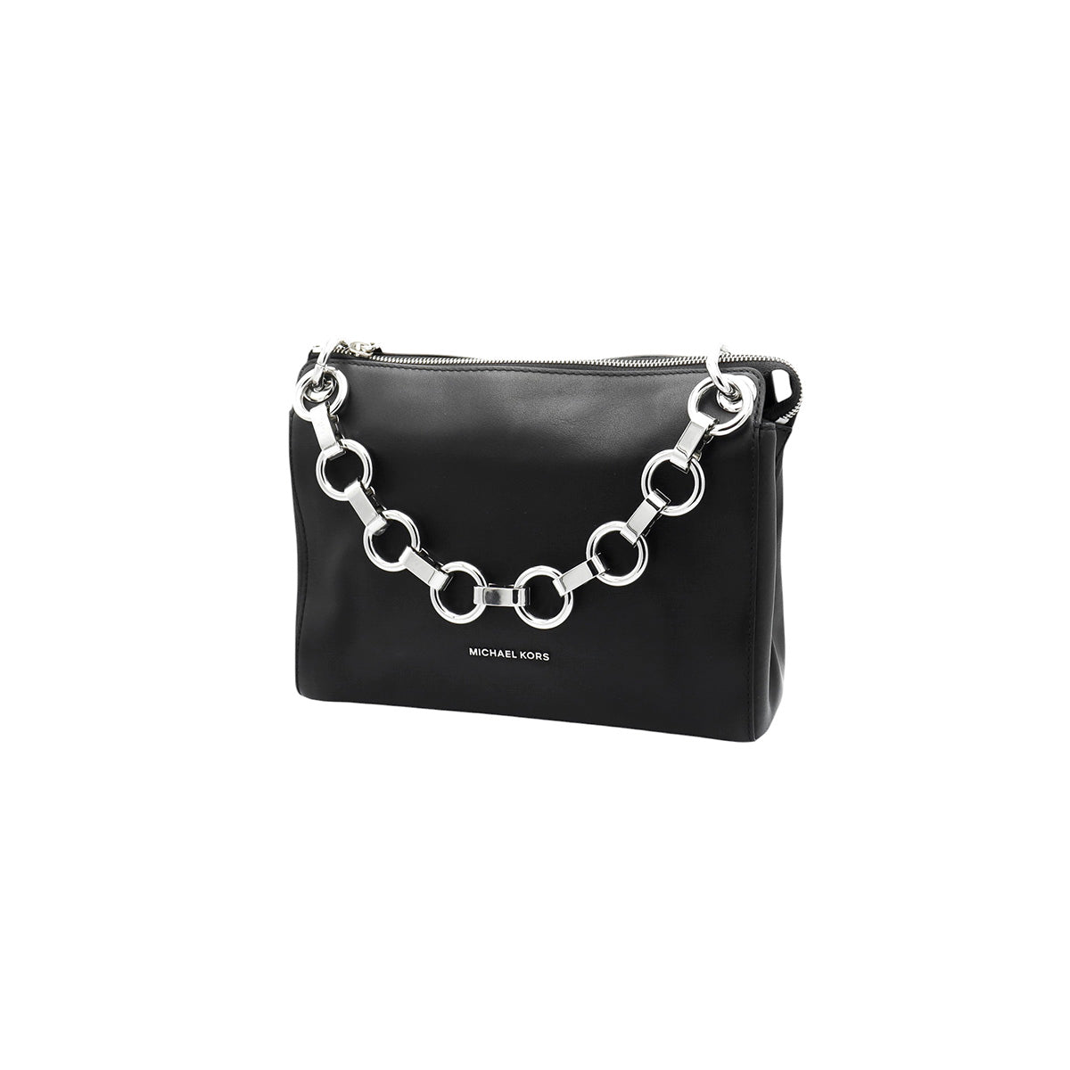 Bolso Michael Kors de la línea Gianna, confeccionado en piel color negro con forro interno en textil del mismo tono, con asa tipo cadena y bandolera de cuero, herrajes en color plateado.