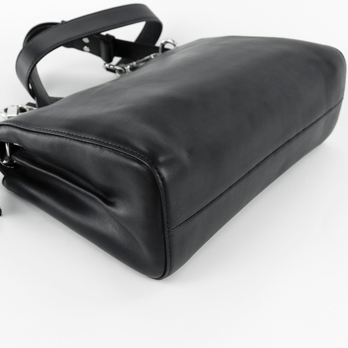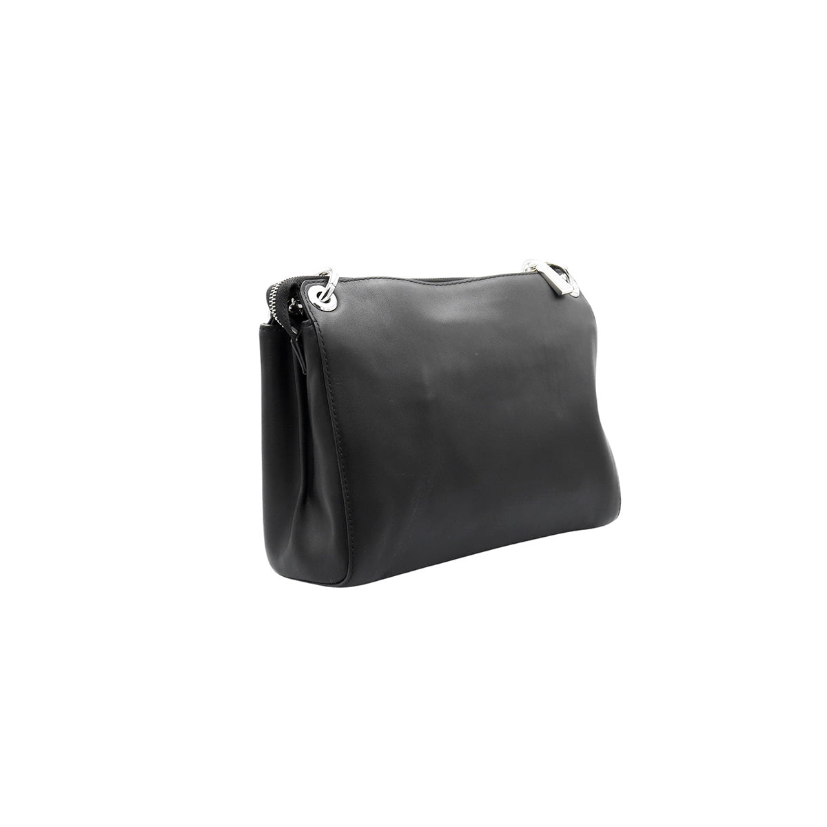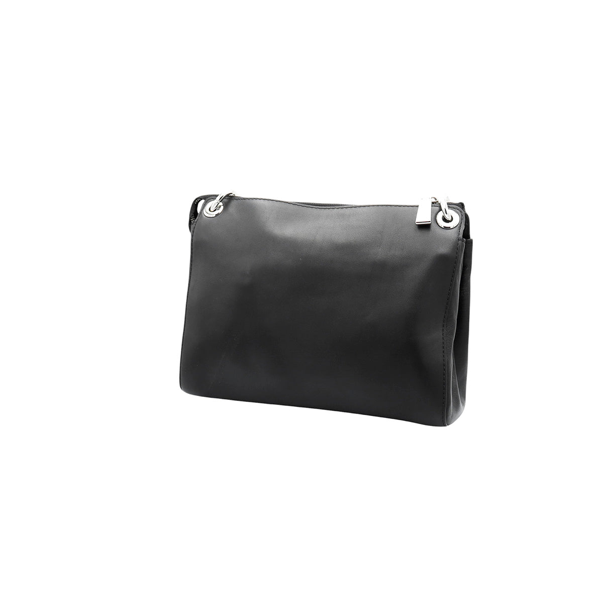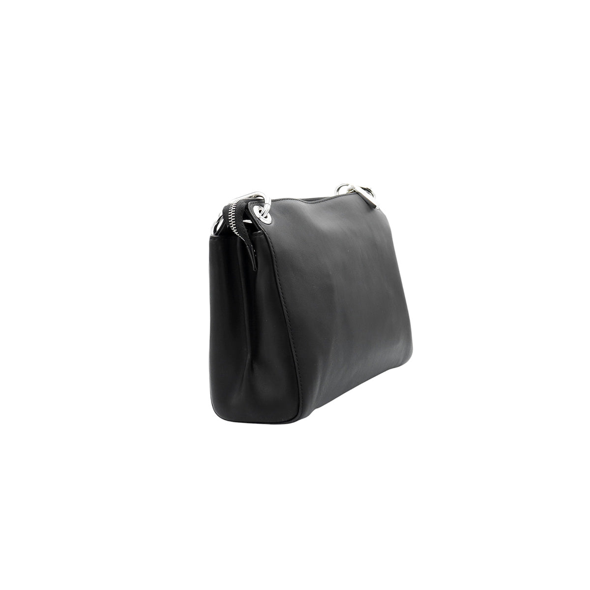 Bolso Michael Kors de la línea Gianna, confeccionado en piel color negro con forro interno en textil del mismo tono, con asa tipo cadena y bandolera de cuero, herrajes en color plateado.