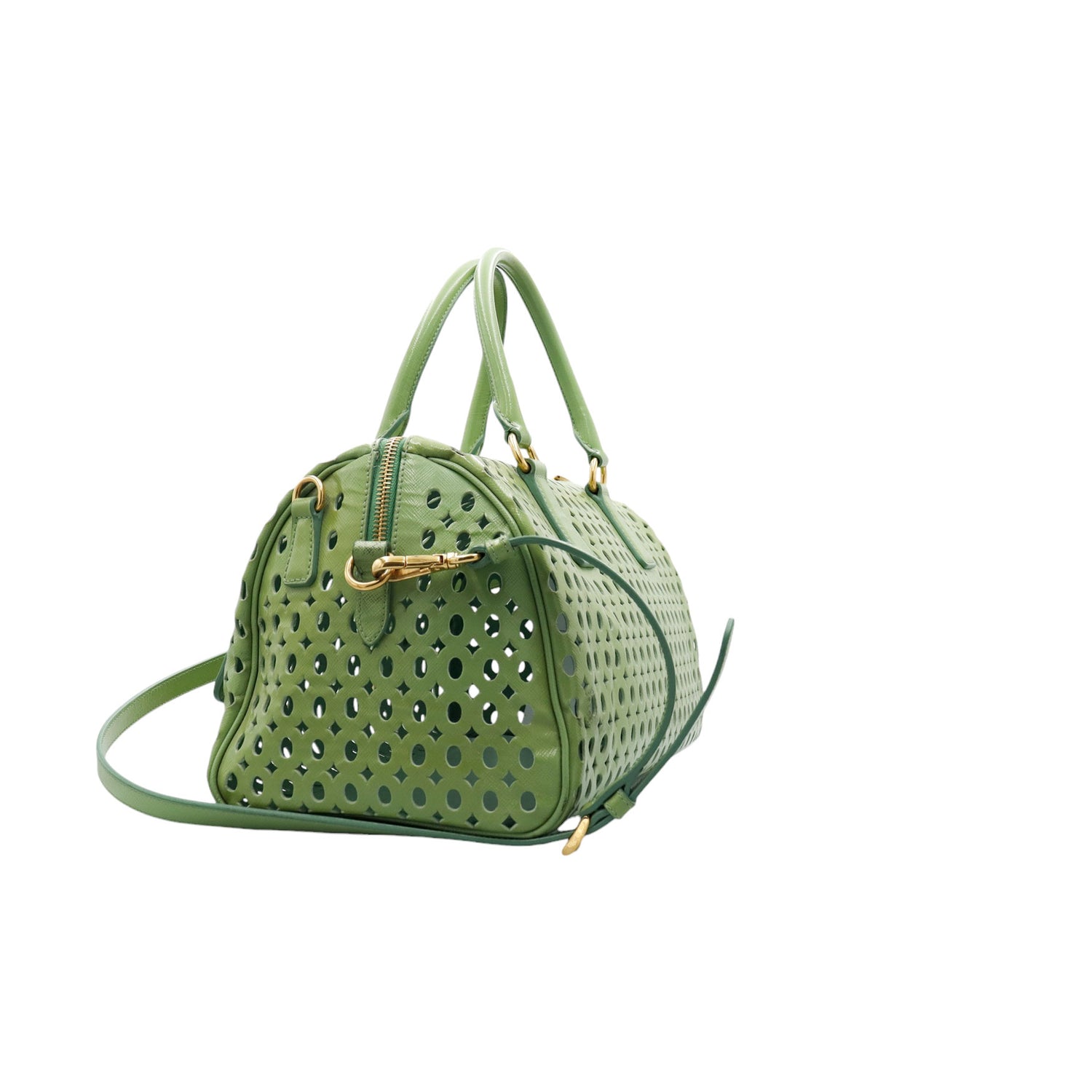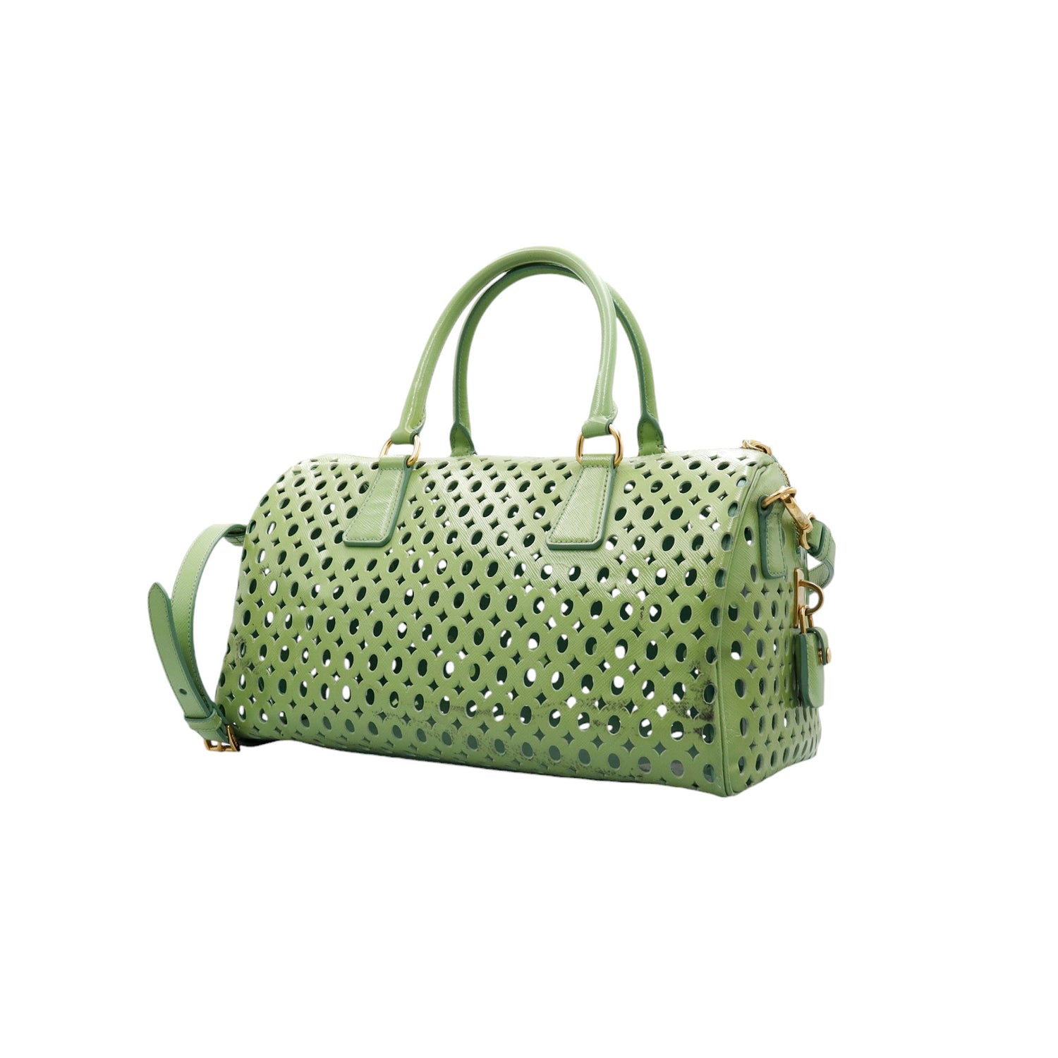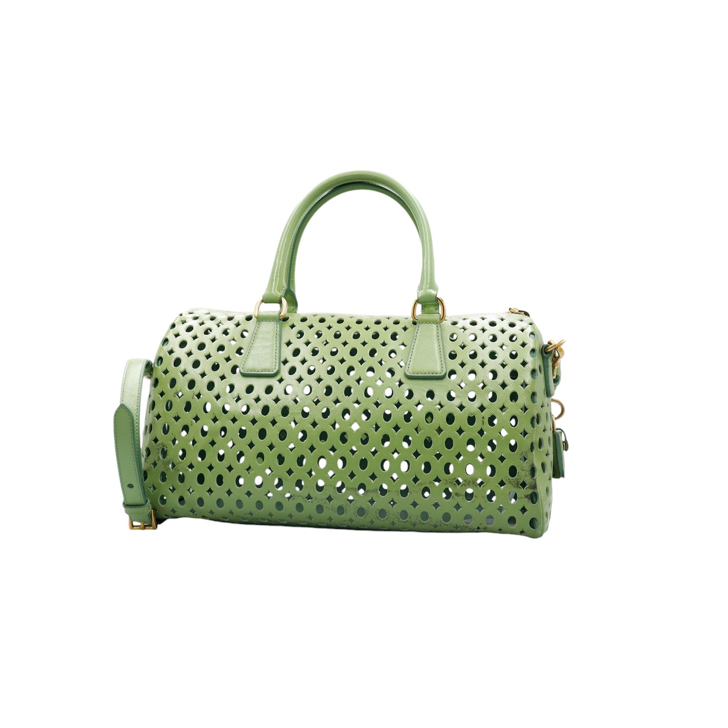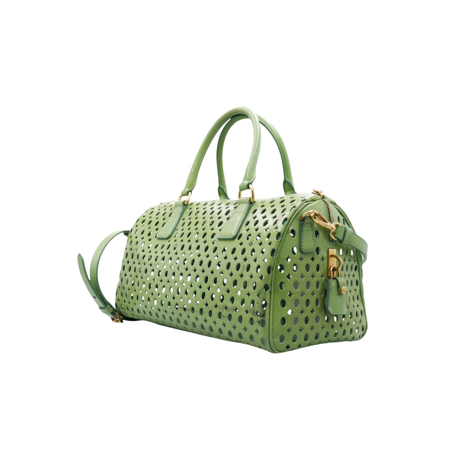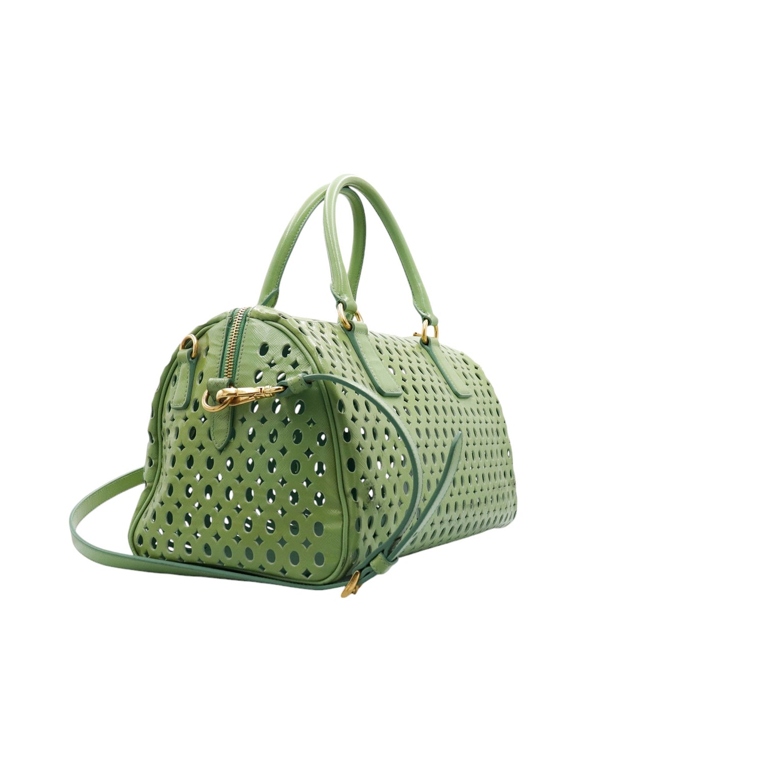 Bolso Prada tipo Boston Cutout con perforaciones láser, confeccionado en piel saffiano color verde, con herrajes, candado y llaves en color dorado, leves manchas en varias zonas por sol, cuenta con correa para llevar al hombro.