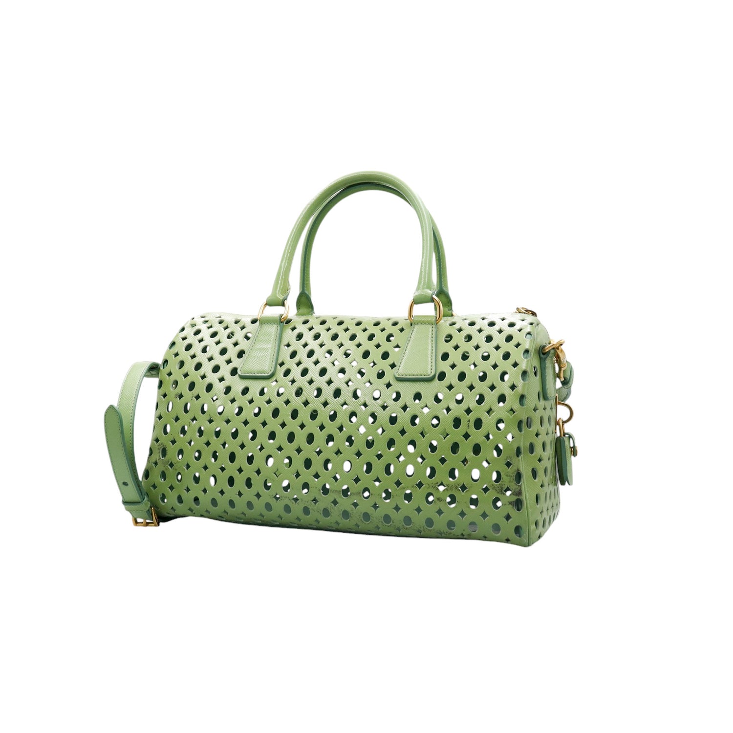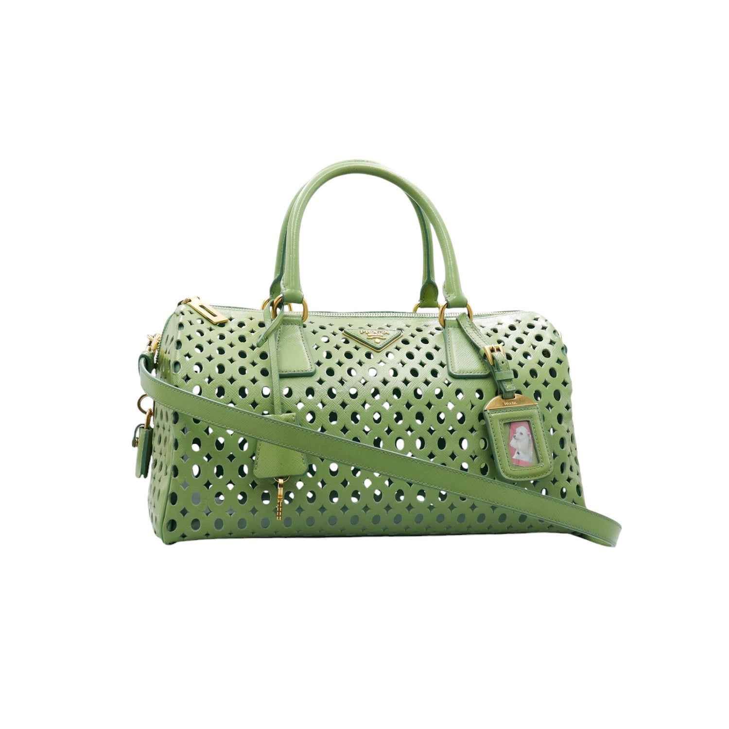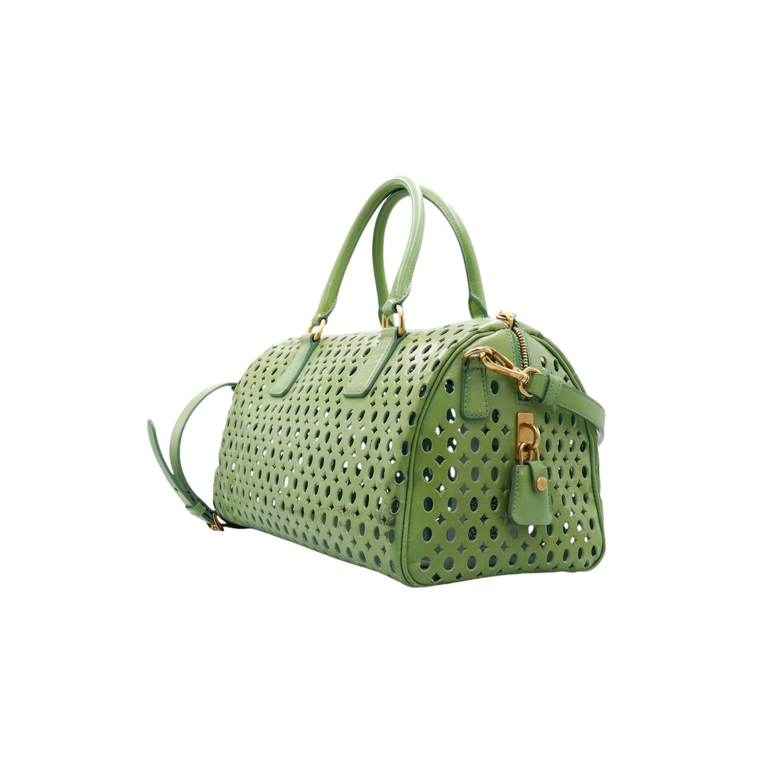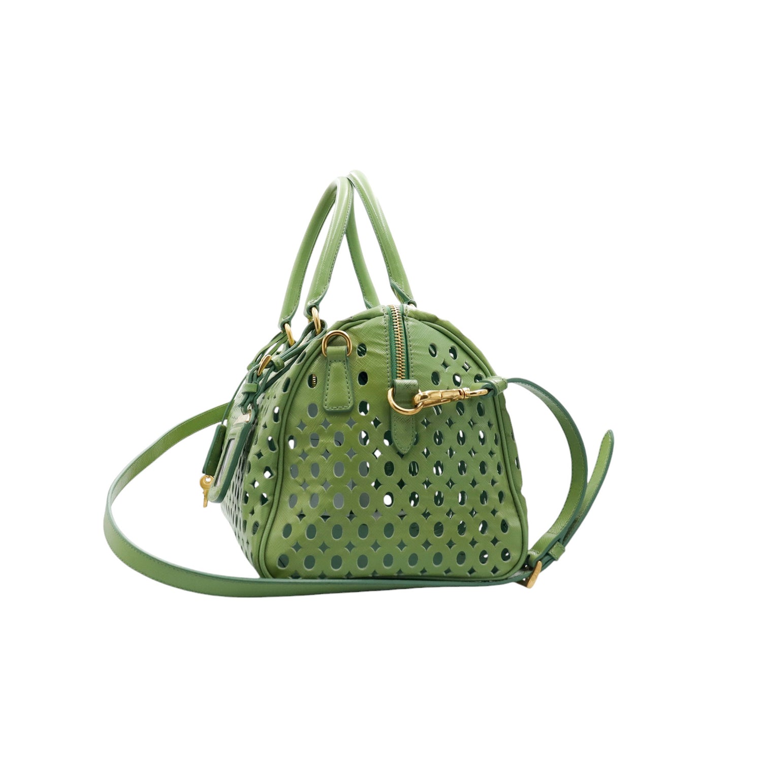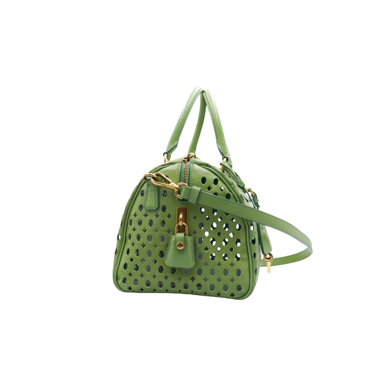 Bolso Prada tipo Boston Cutout con perforaciones láser, confeccionado en piel saffiano color verde, con herrajes, candado y llaves en color dorado, leves manchas en varias zonas por sol, cuenta con correa para llevar al hombro.