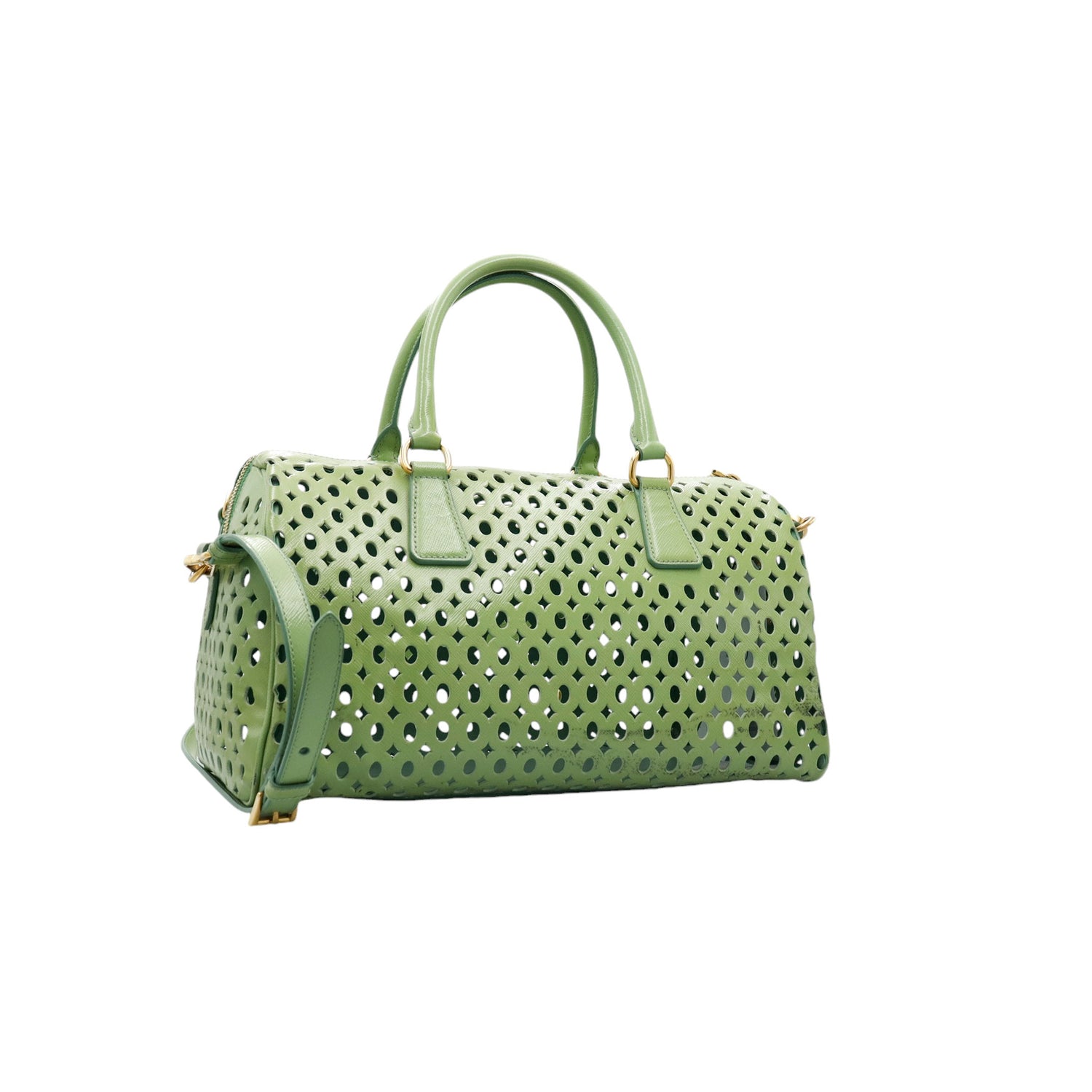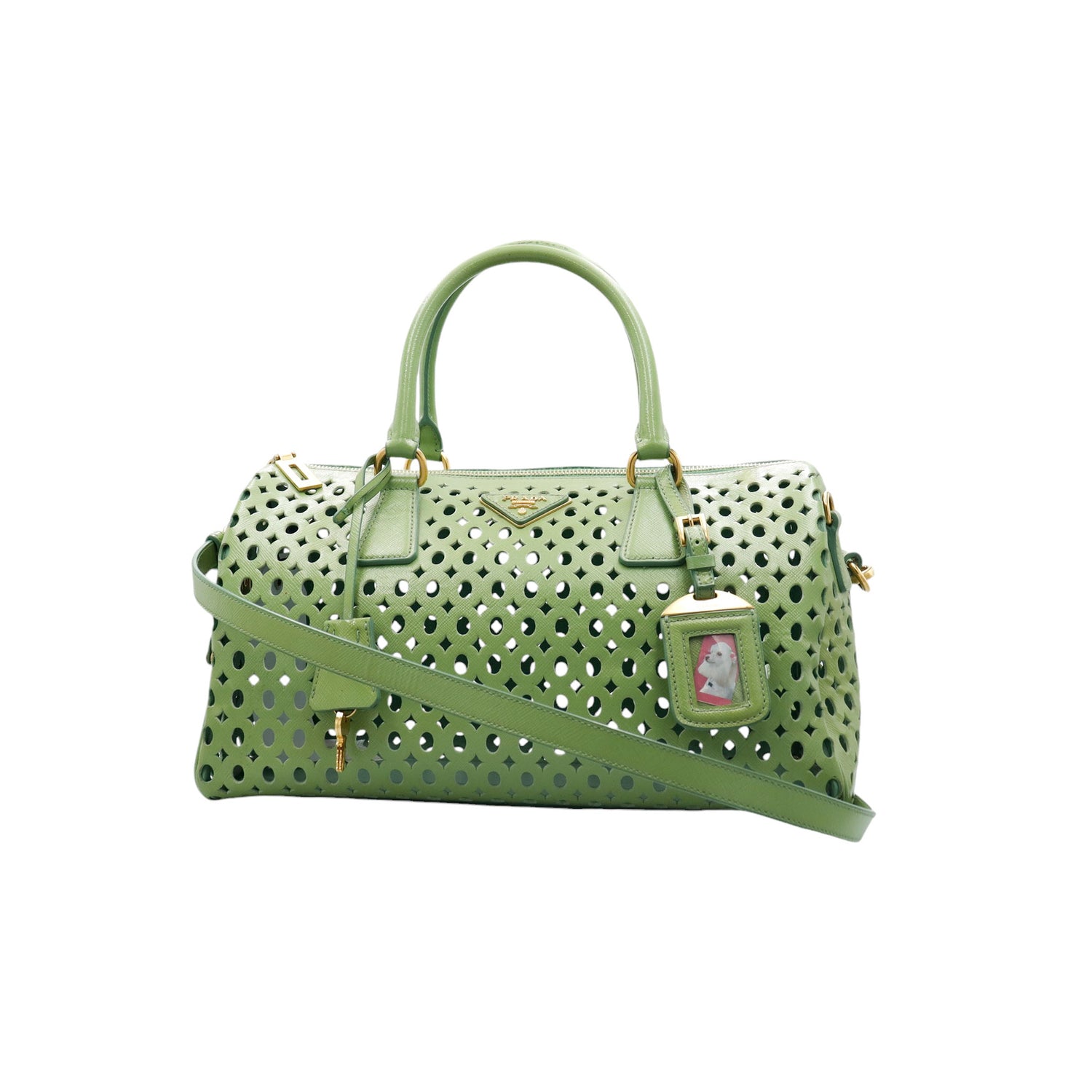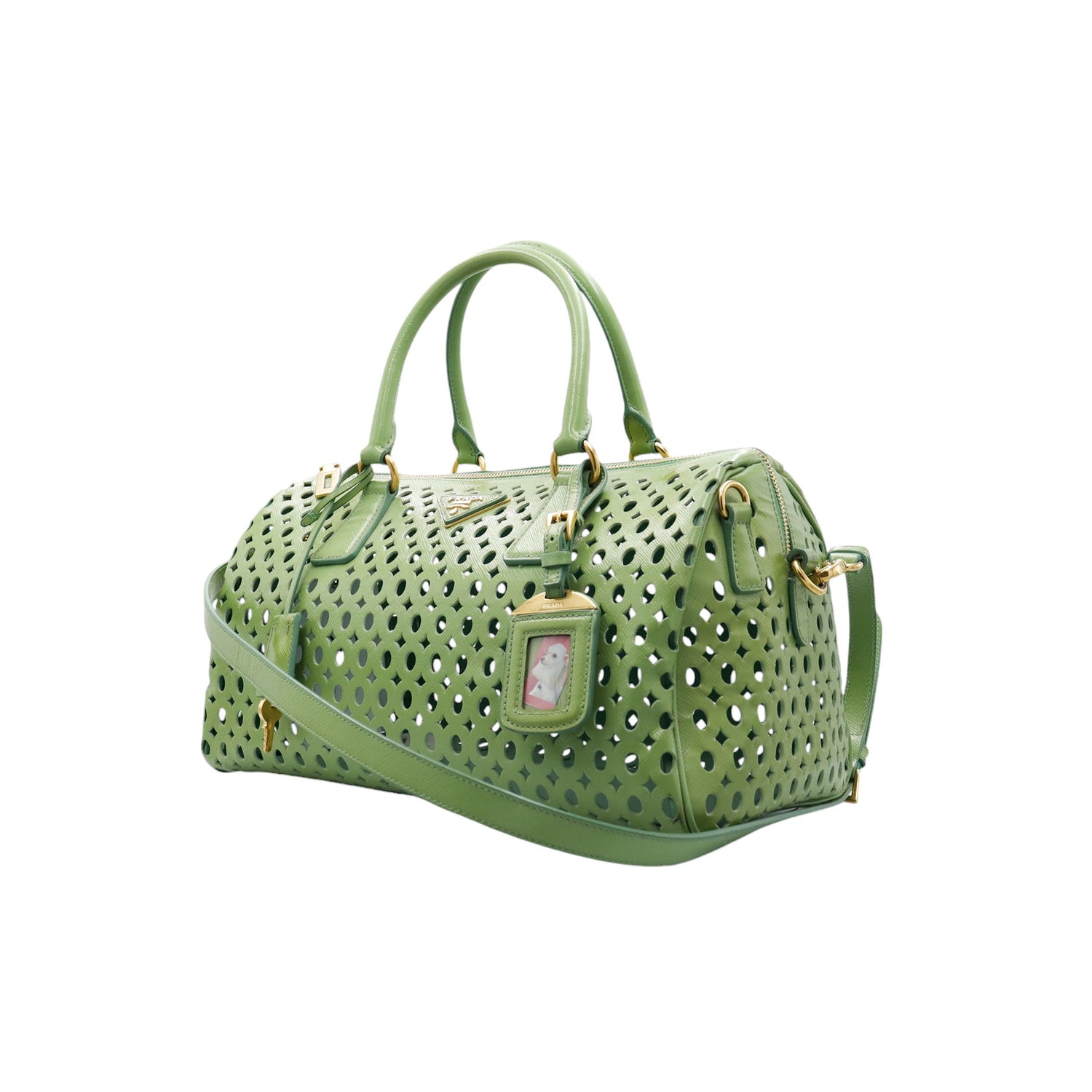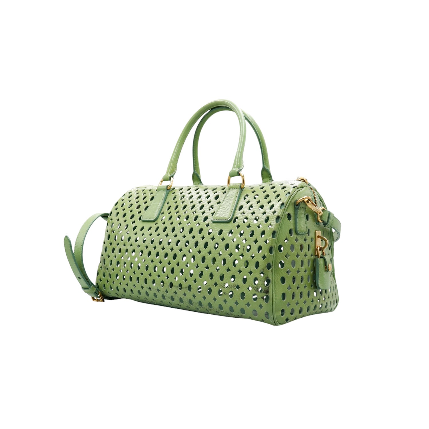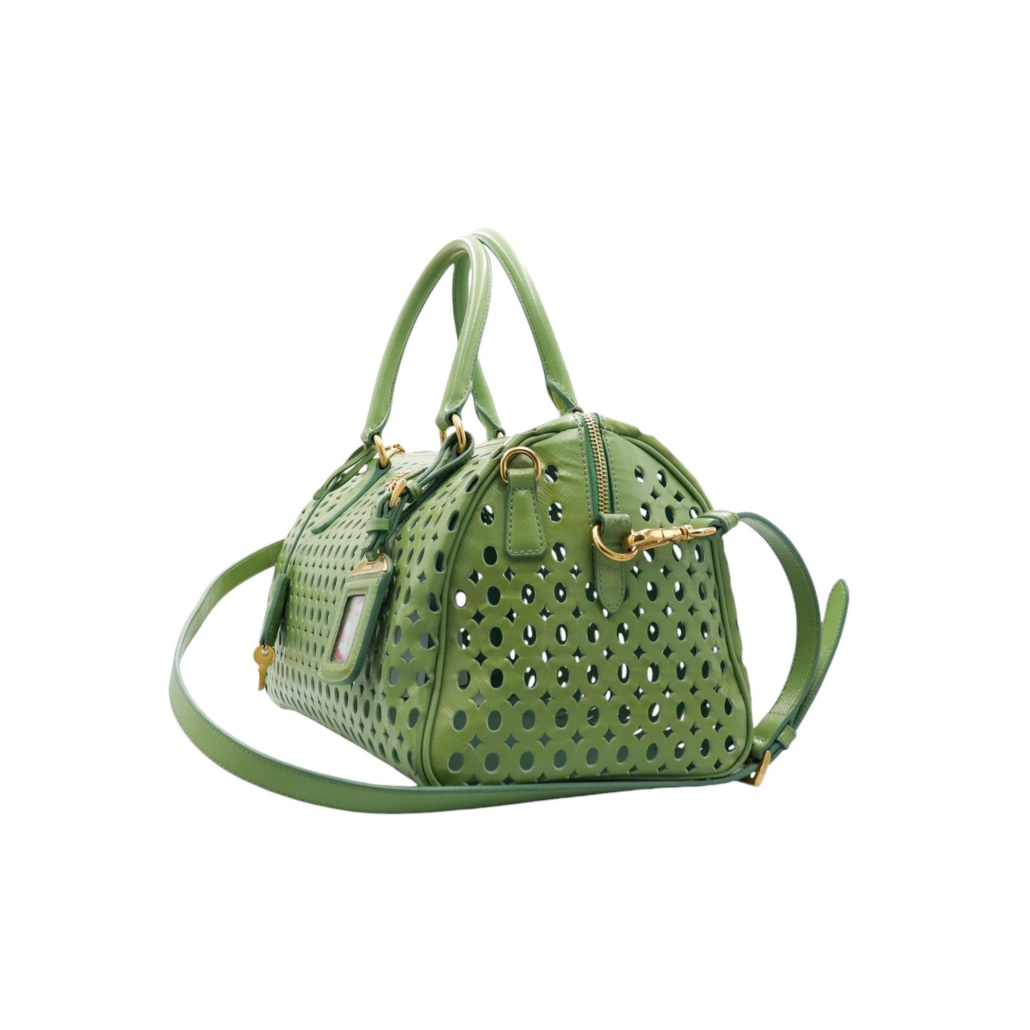 Bolso Prada tipo Boston Cutout con perforaciones láser, confeccionado en piel saffiano color verde, con herrajes, candado y llaves en color dorado, leves manchas en varias zonas por sol, cuenta con correa para llevar al hombro.