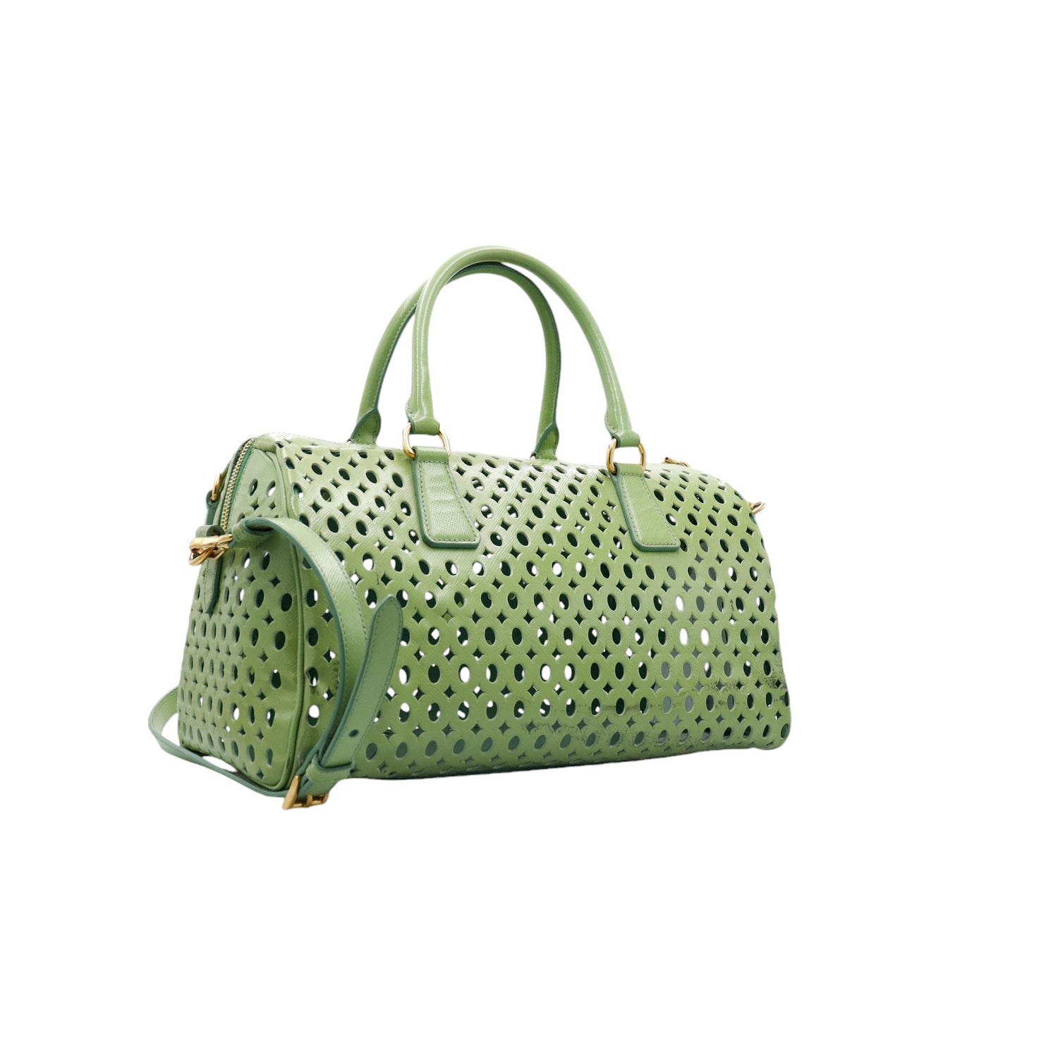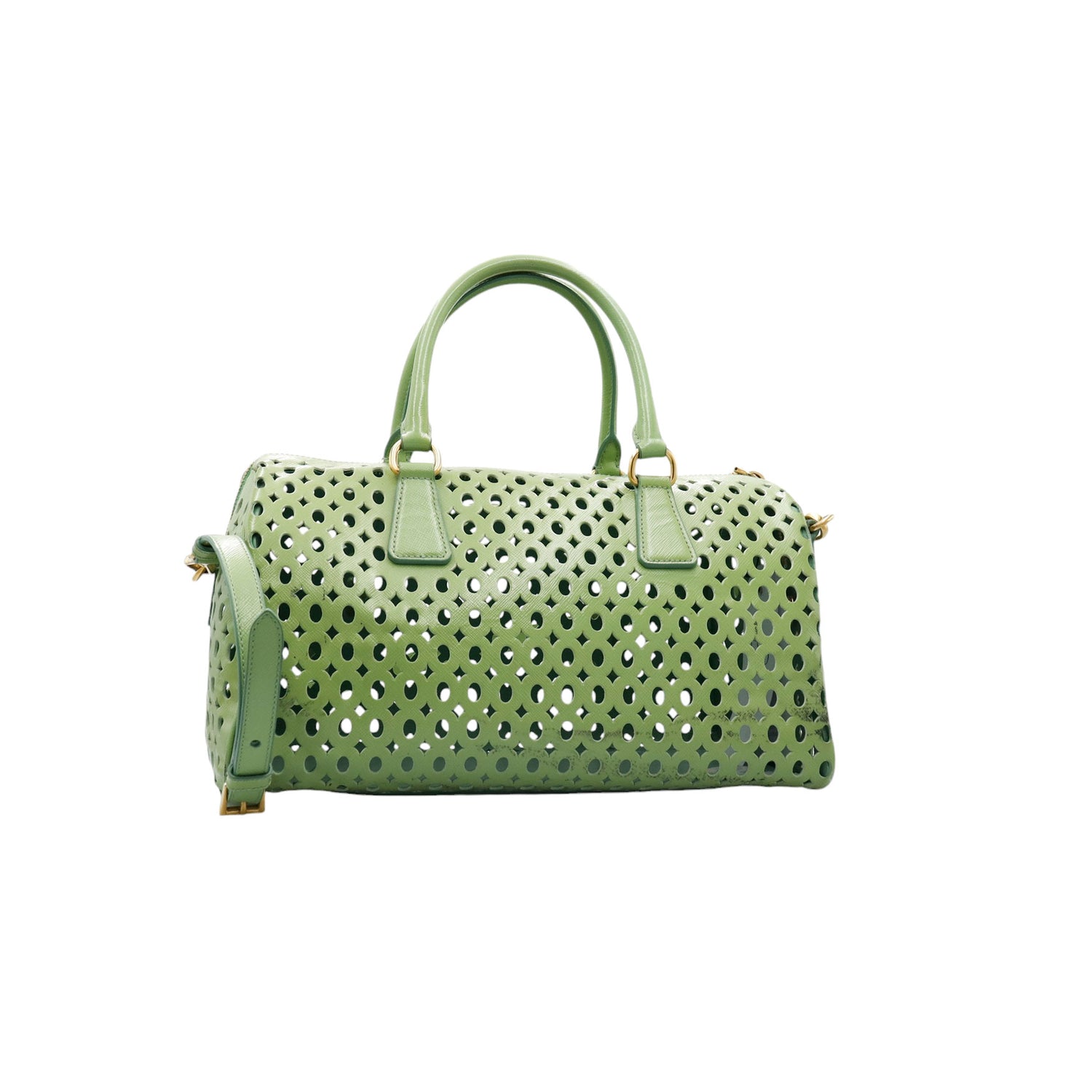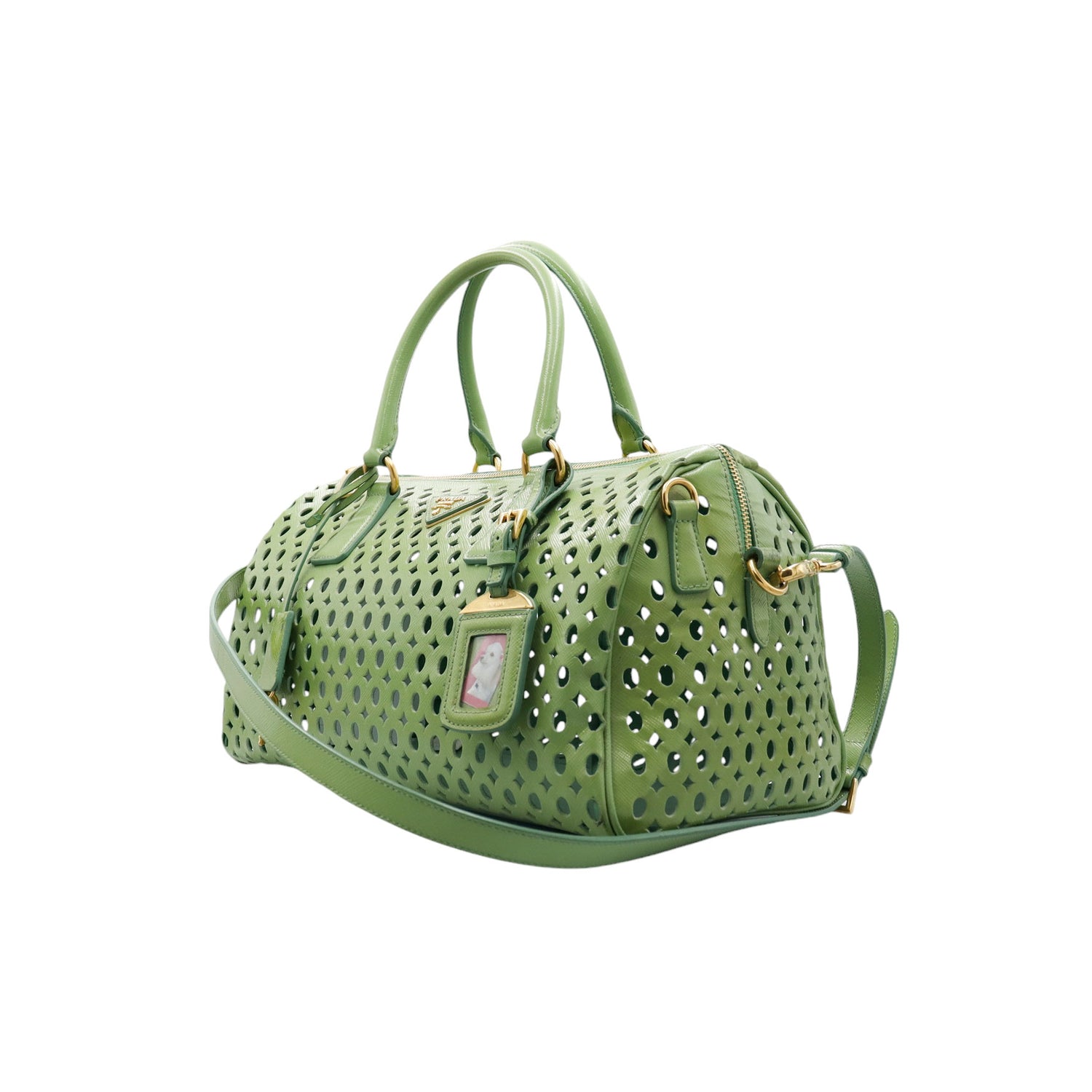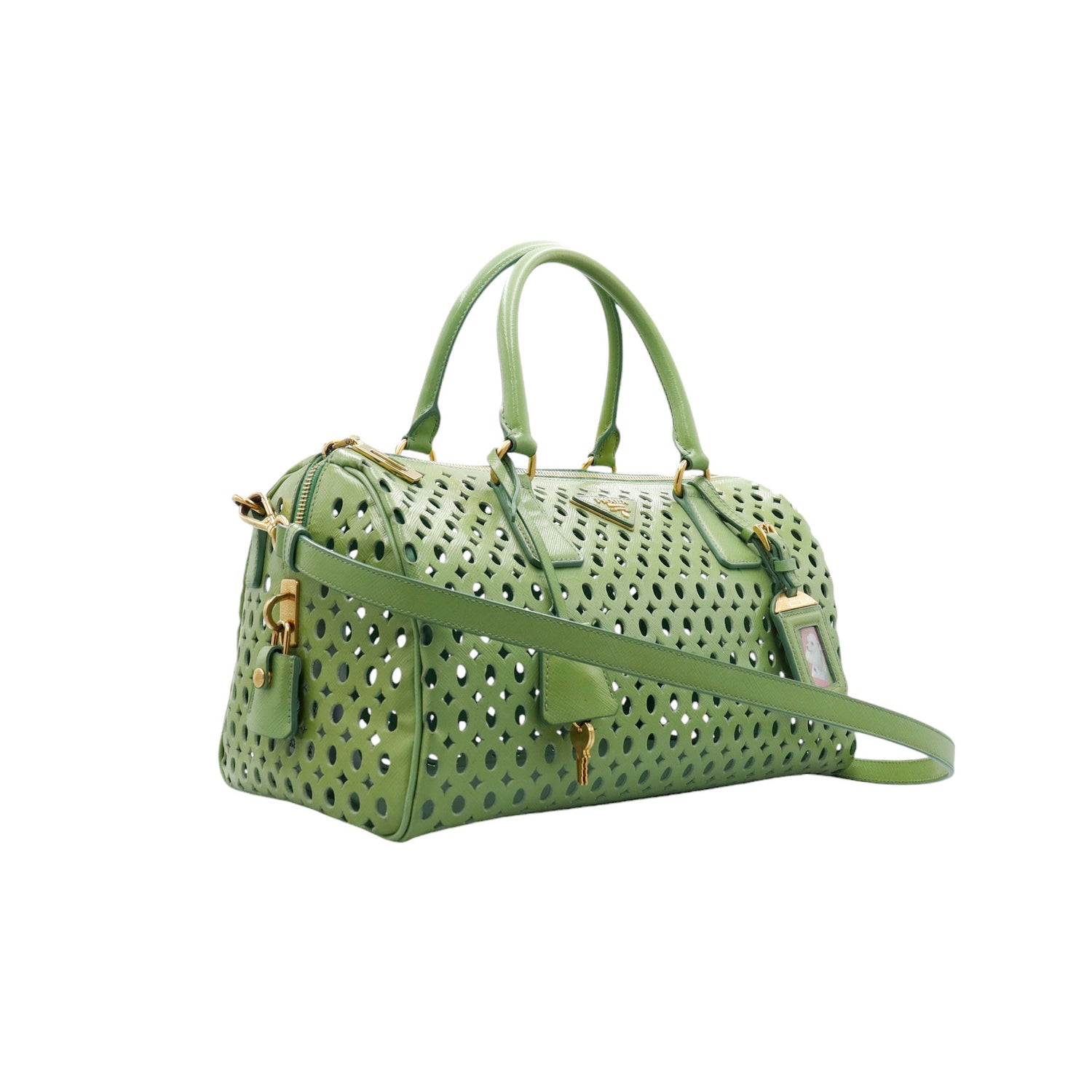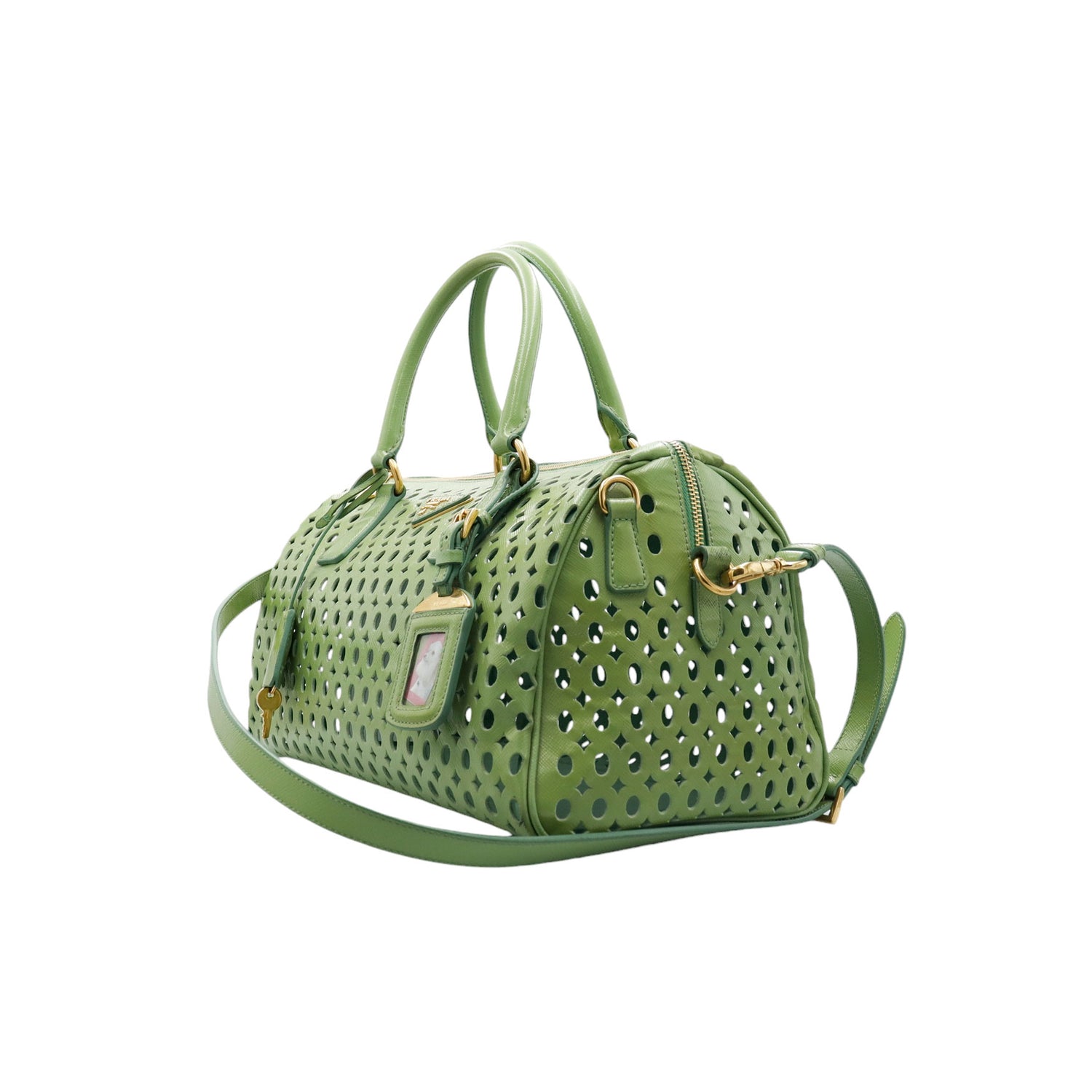 Bolso Prada tipo Boston Cutout con perforaciones láser, confeccionado en piel saffiano color verde, con herrajes, candado y llaves en color dorado, leves manchas en varias zonas por sol, cuenta con correa para llevar al hombro.