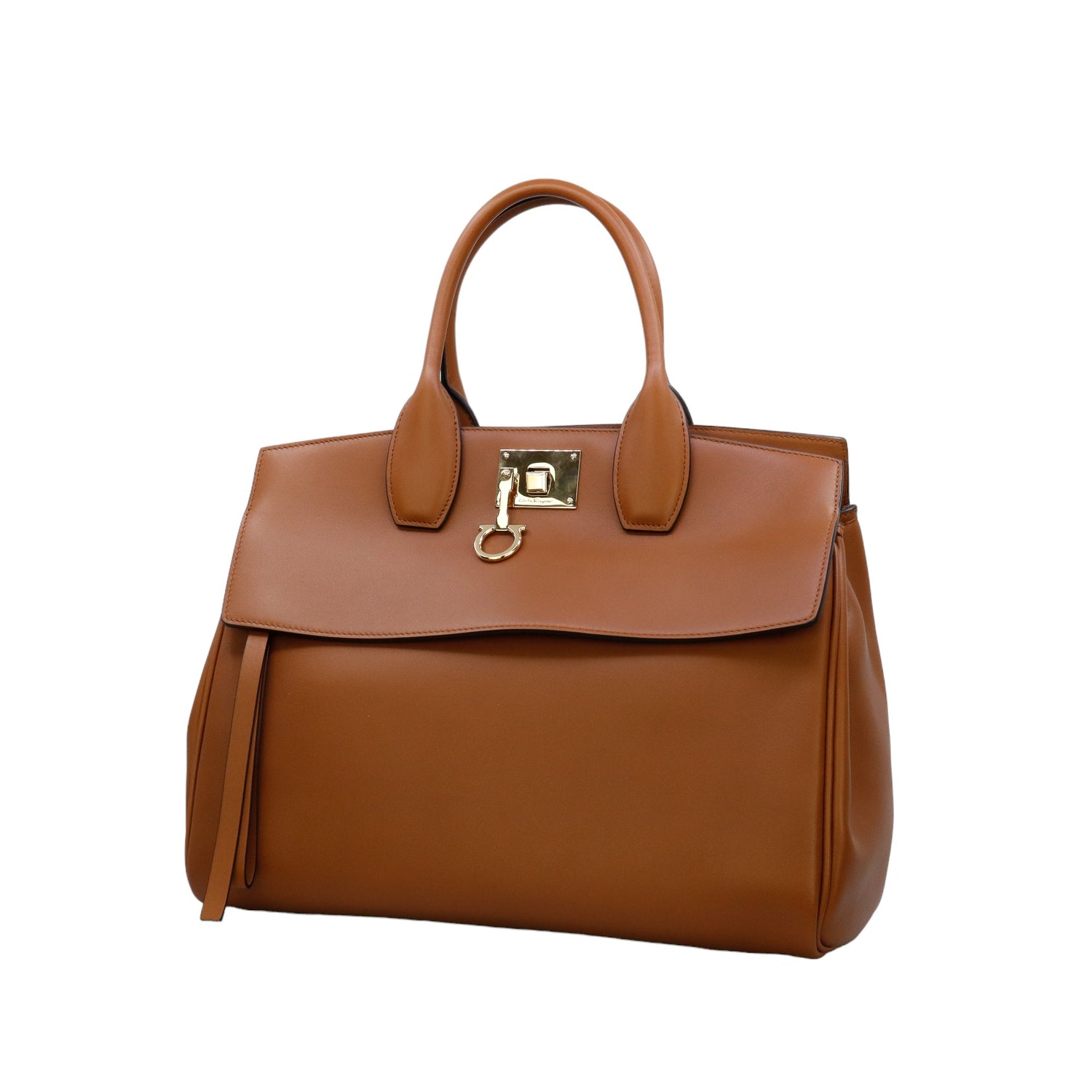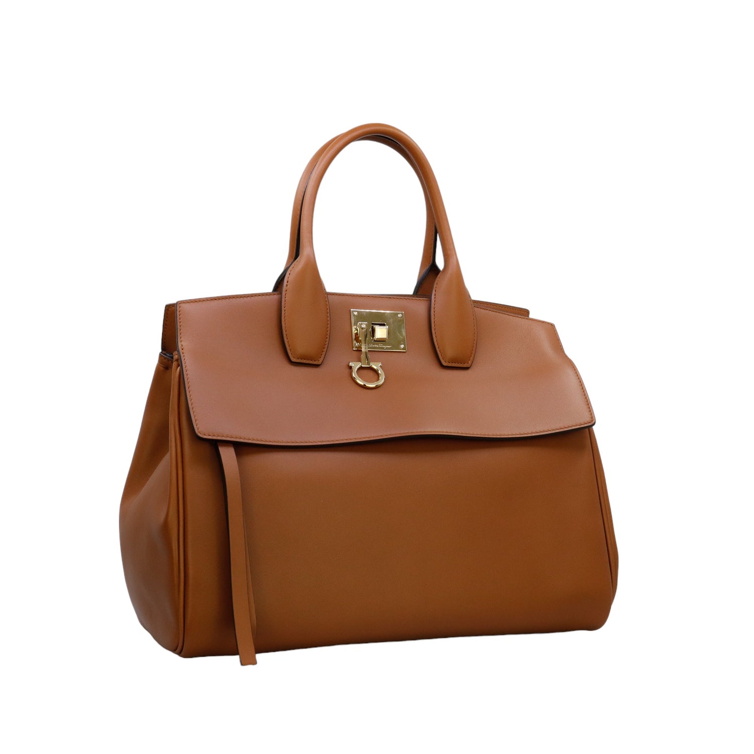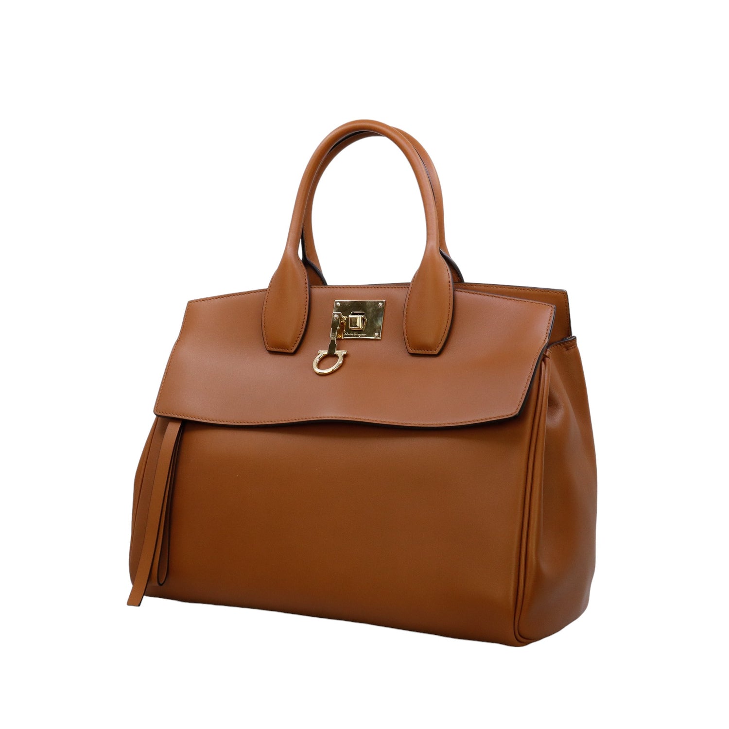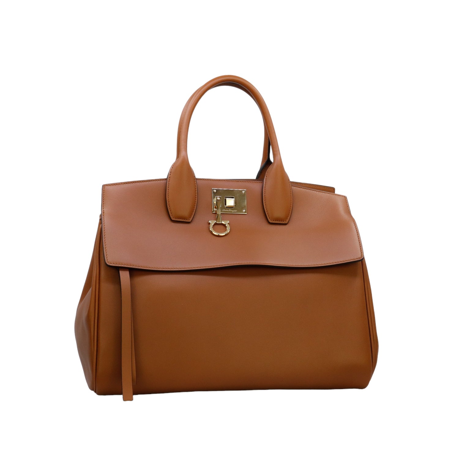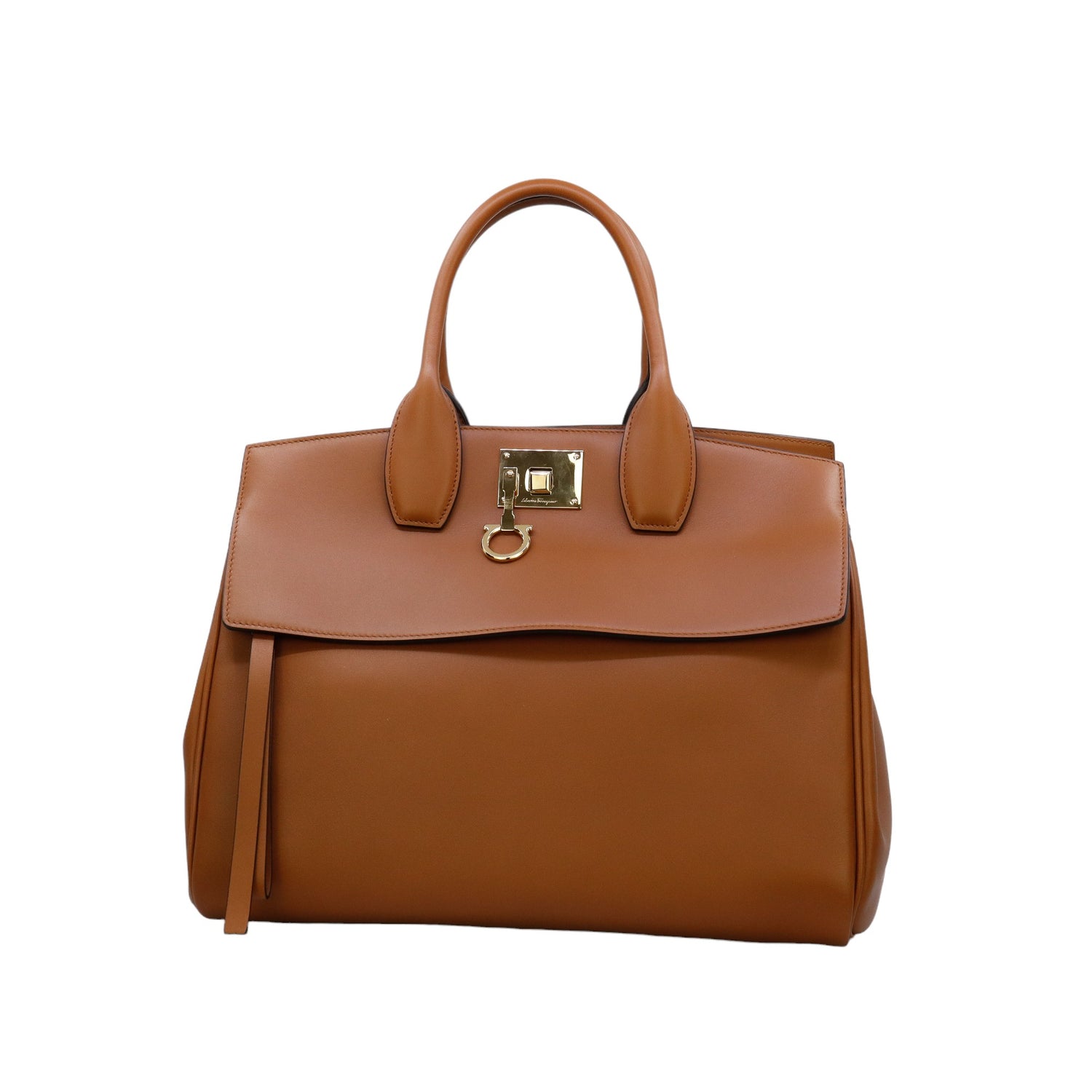 Bolso Salvatore Ferragamo de la línea Studio Bag, confeccionado en piel de becerro a grano color café, con 2 asas rígidas en la parte superior, incluye bolsillo interno plano extraíble y correa en piel para llevar al hombro o cruzado, cierre frontal metálico con el logo Gancini.