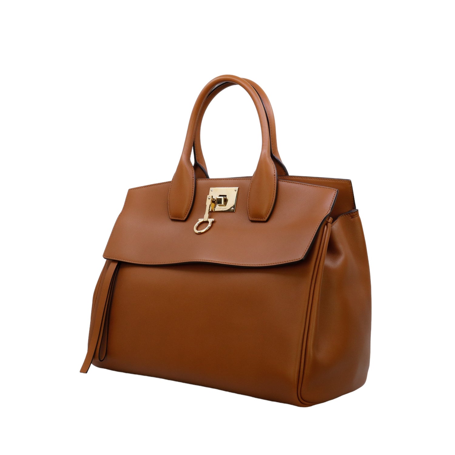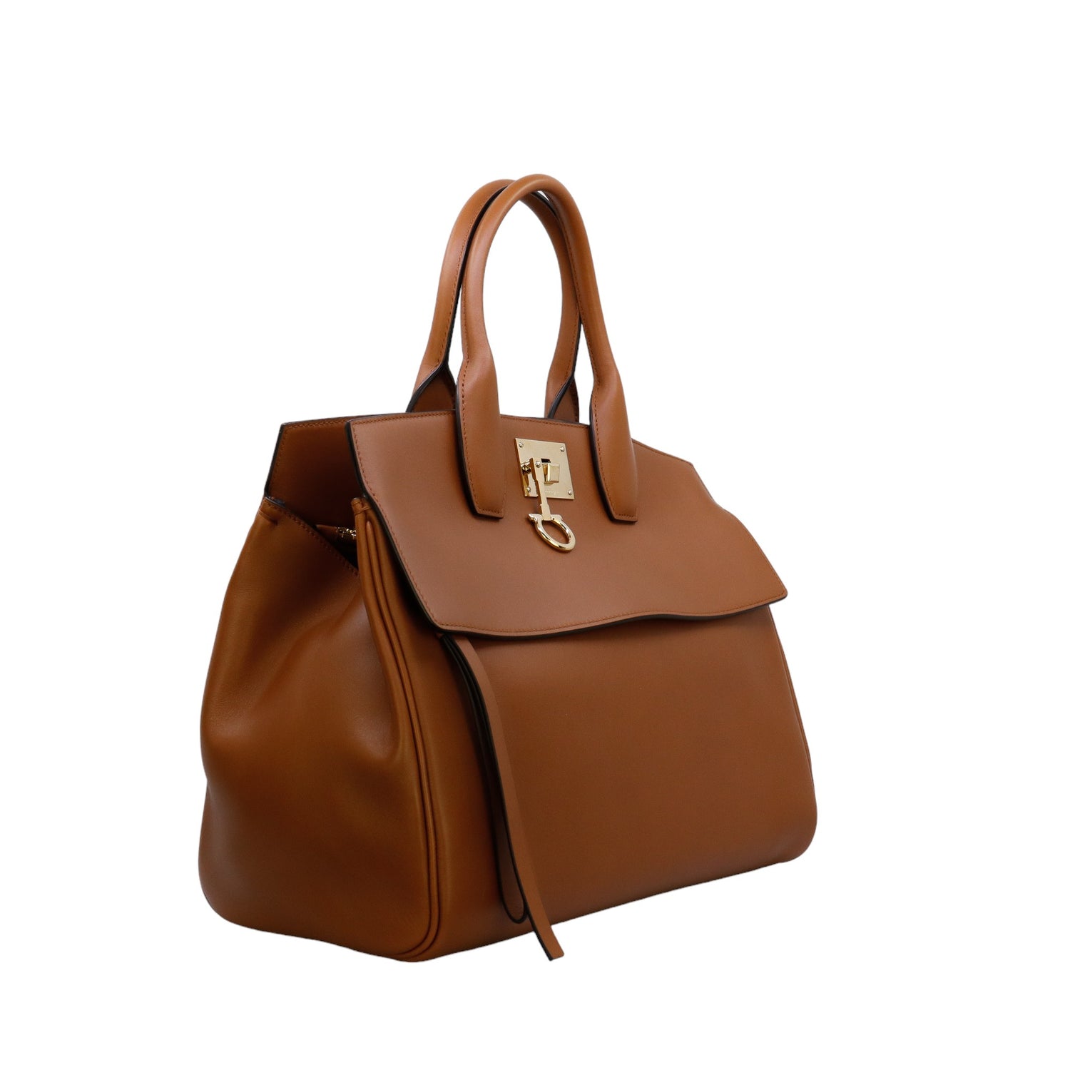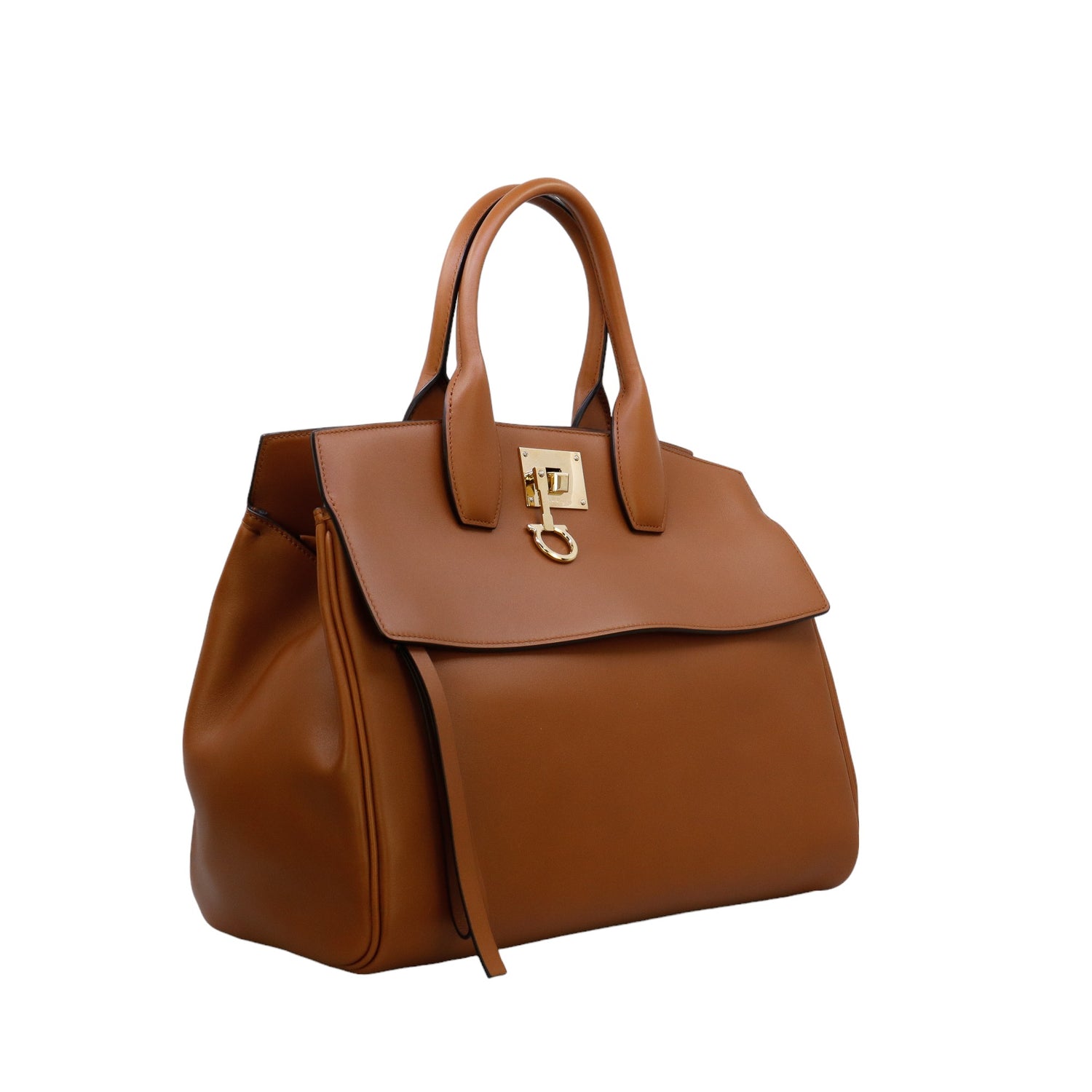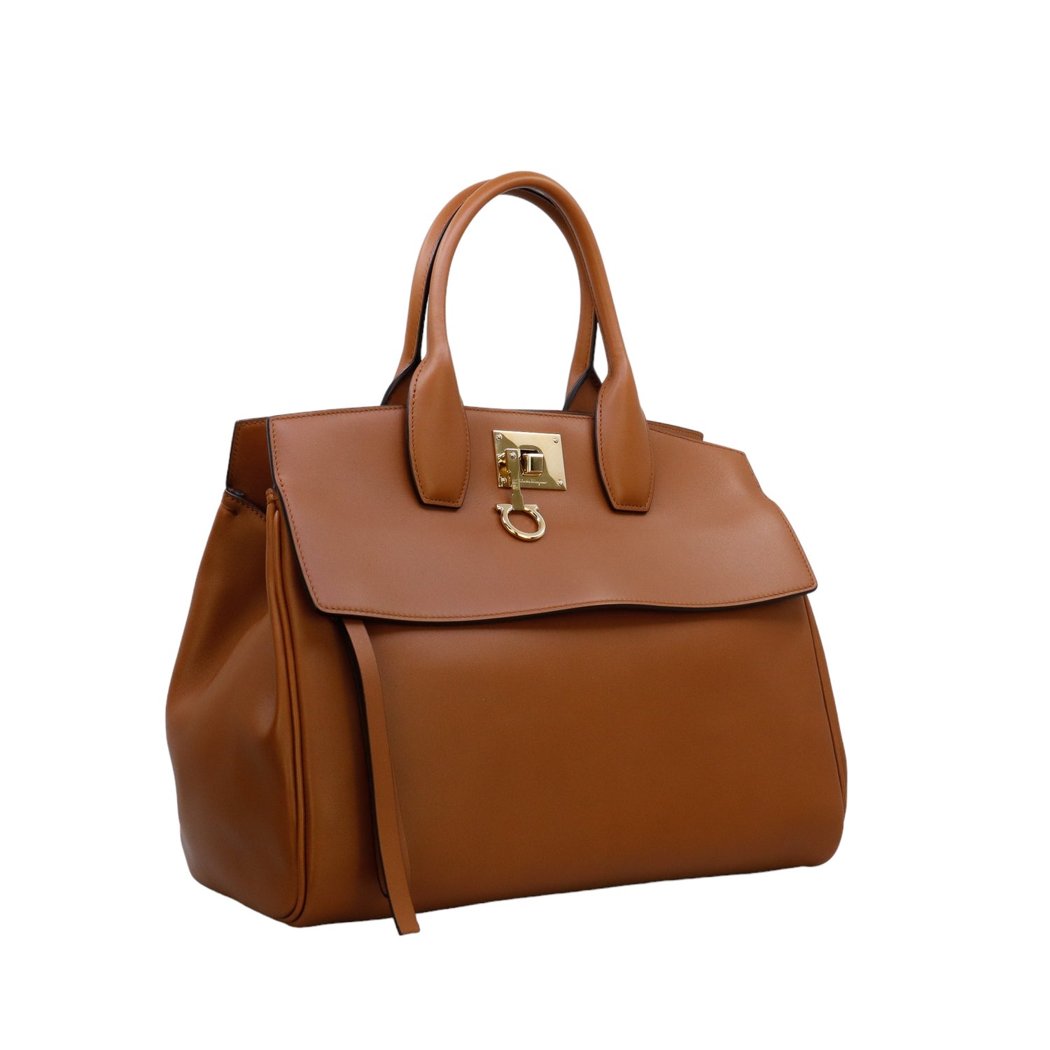 Bolso Salvatore Ferragamo de la línea Studio Bag, confeccionado en piel de becerro a grano color café, con 2 asas rígidas en la parte superior, incluye bolsillo interno plano extraíble y correa en piel para llevar al hombro o cruzado, cierre frontal metálico con el logo Gancini.