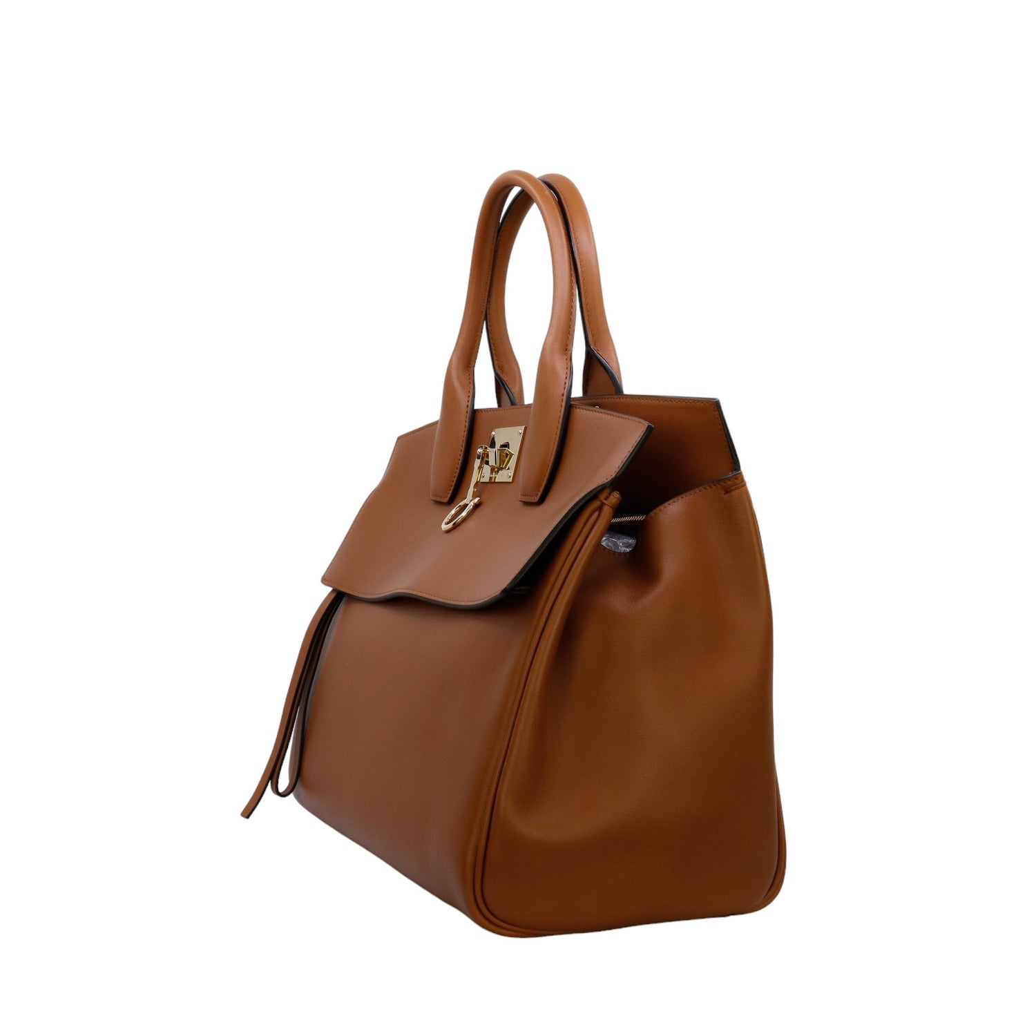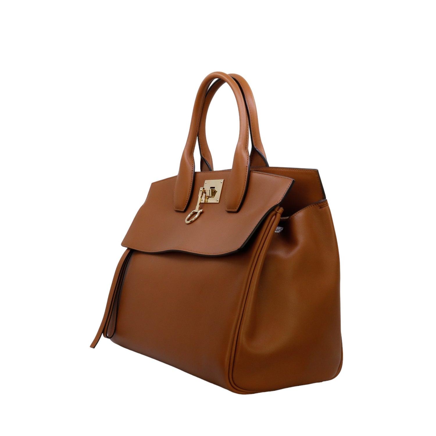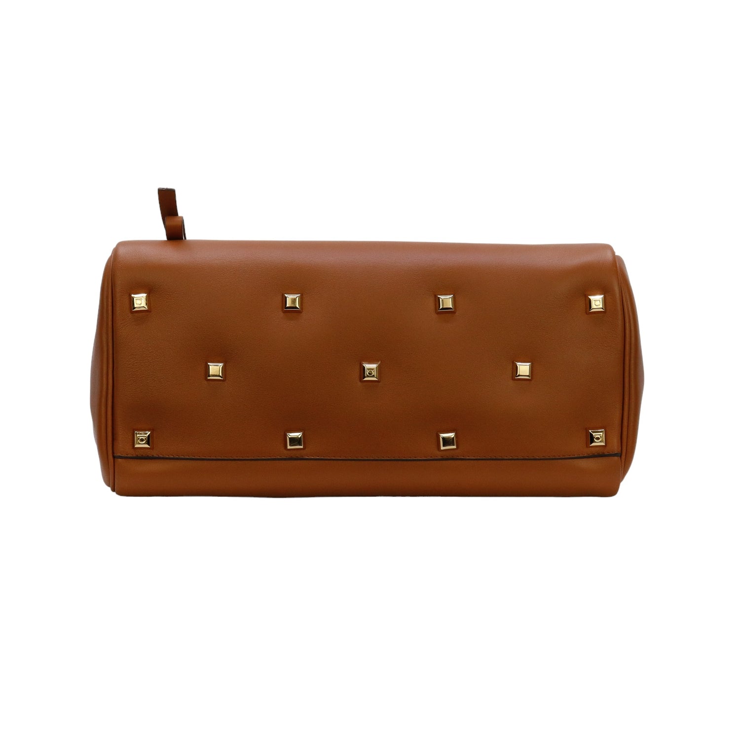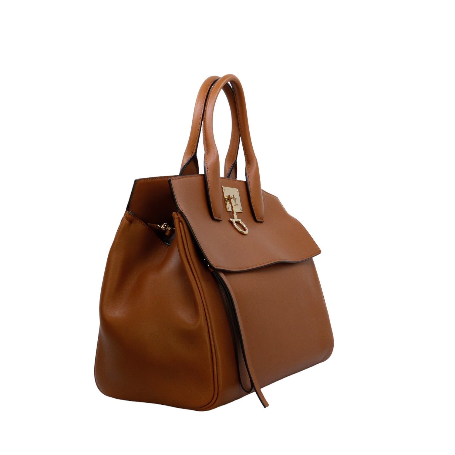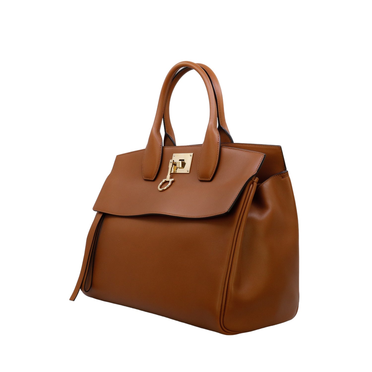 Bolso Salvatore Ferragamo de la línea Studio Bag, confeccionado en piel de becerro a grano color café, con 2 asas rígidas en la parte superior, incluye bolsillo interno plano extraíble y correa en piel para llevar al hombro o cruzado, cierre frontal metálico con el logo Gancini.