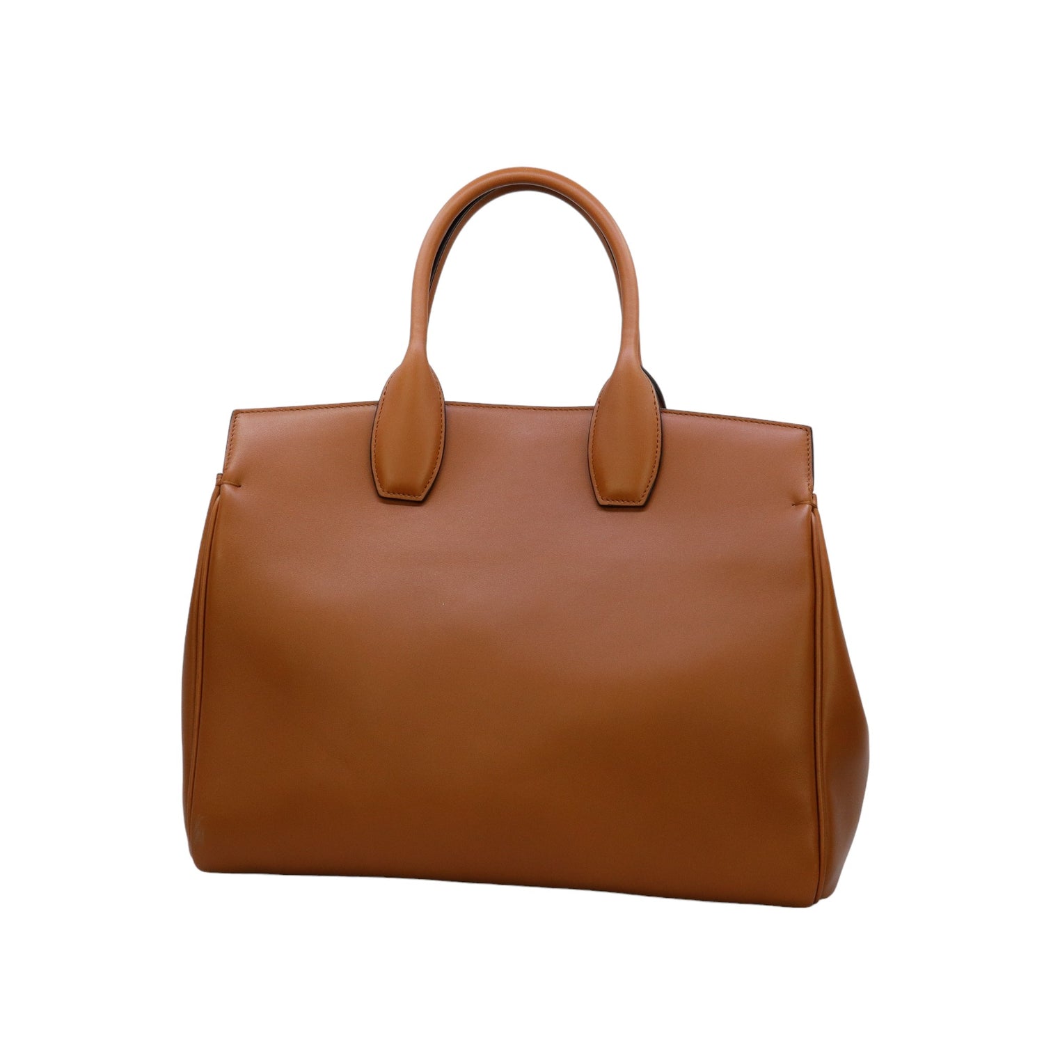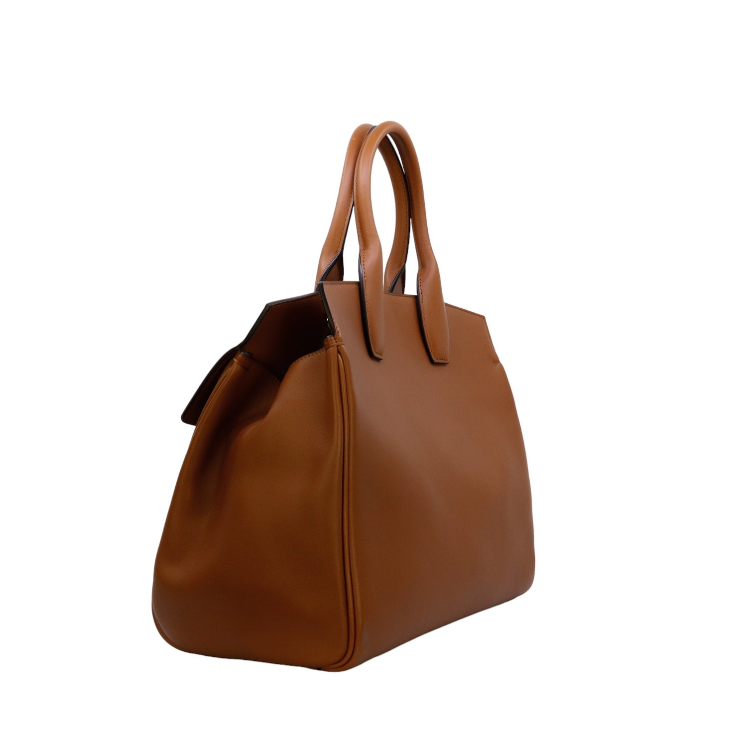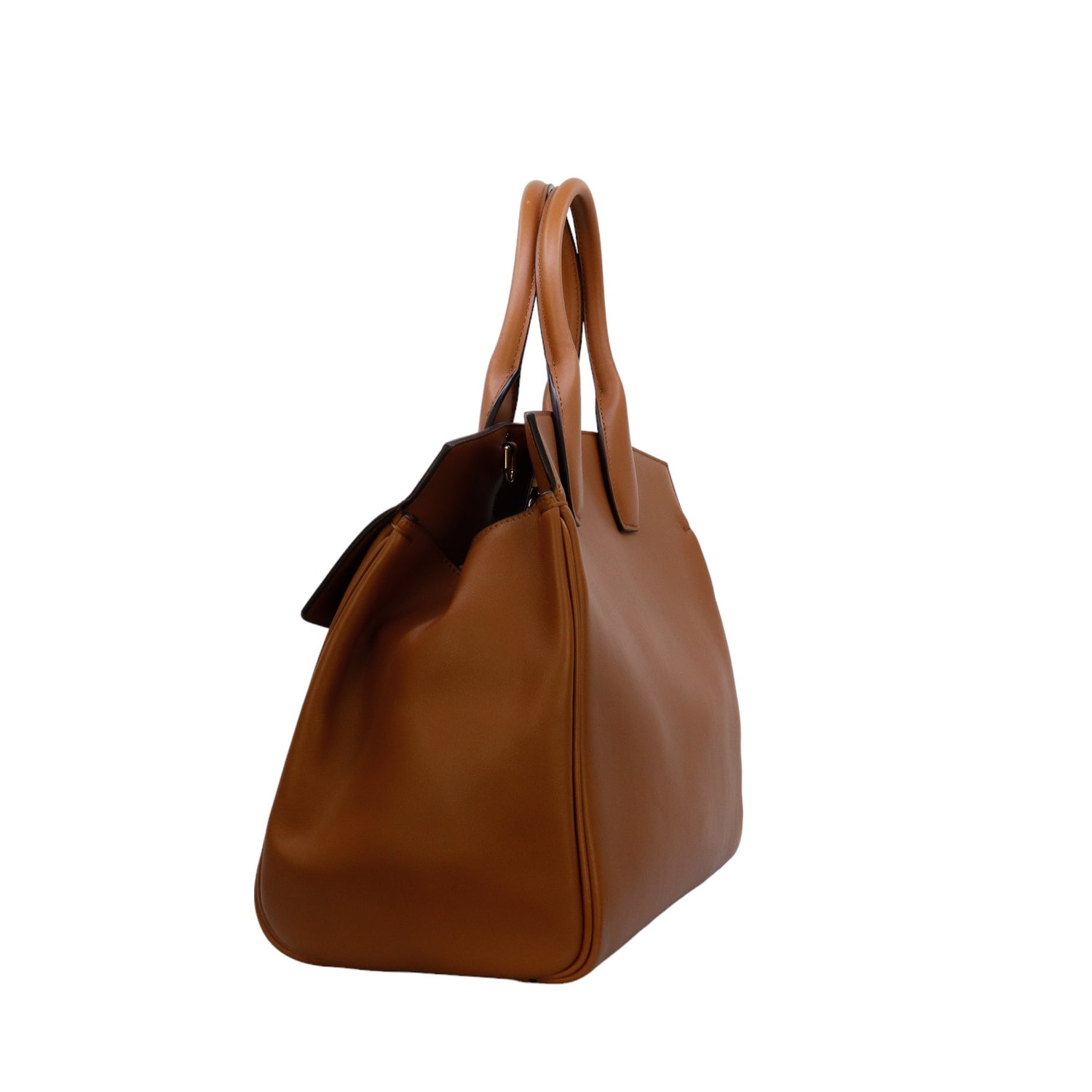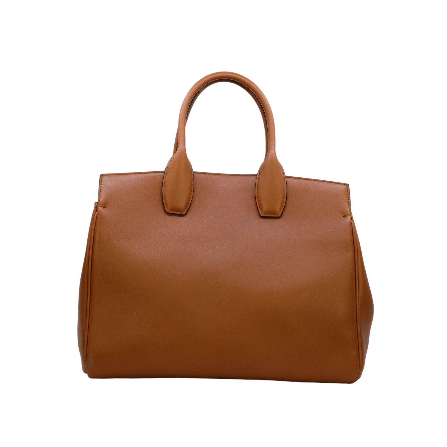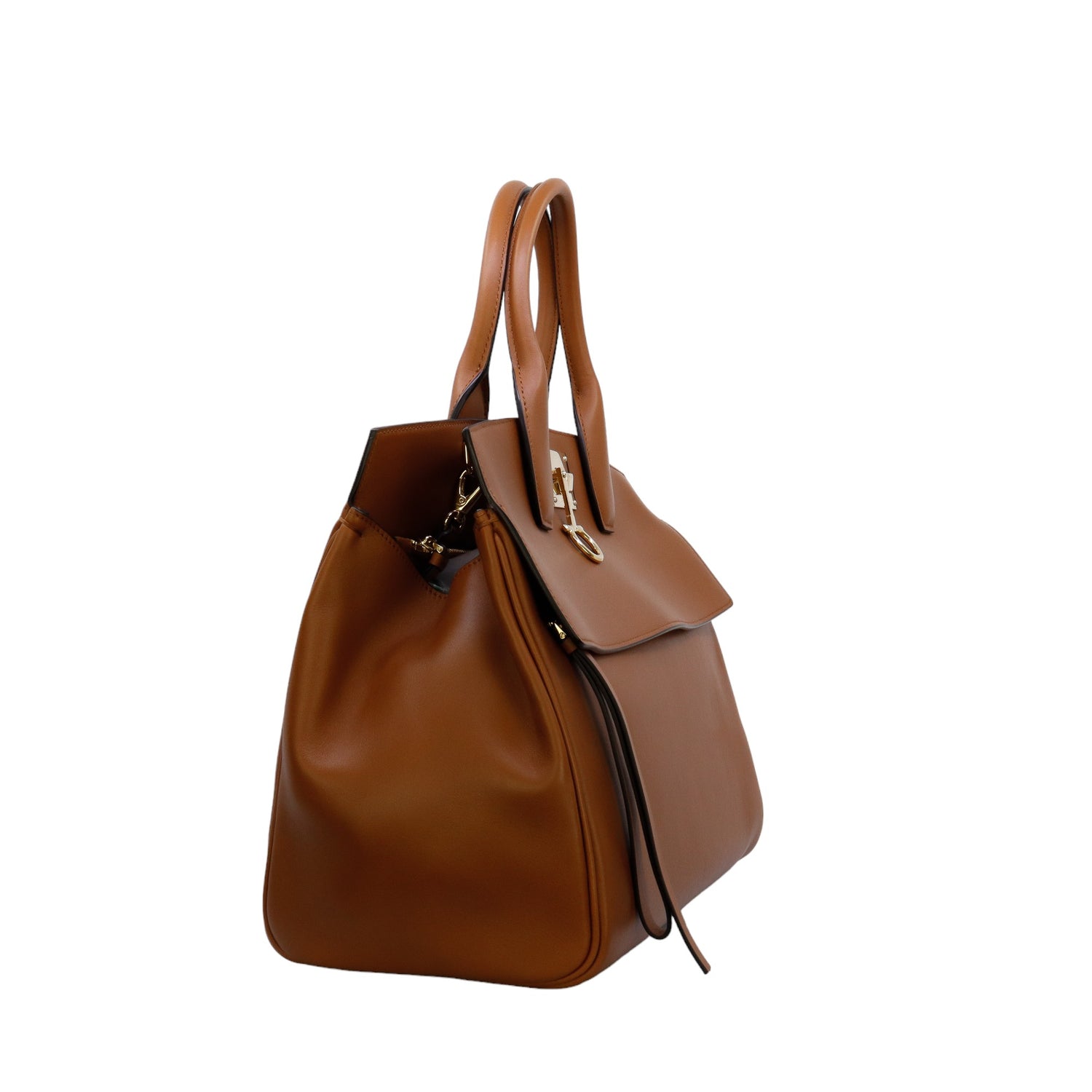 Bolso Salvatore Ferragamo de la línea Studio Bag, confeccionado en piel de becerro a grano color café, con 2 asas rígidas en la parte superior, incluye bolsillo interno plano extraíble y correa en piel para llevar al hombro o cruzado, cierre frontal metálico con el logo Gancini.