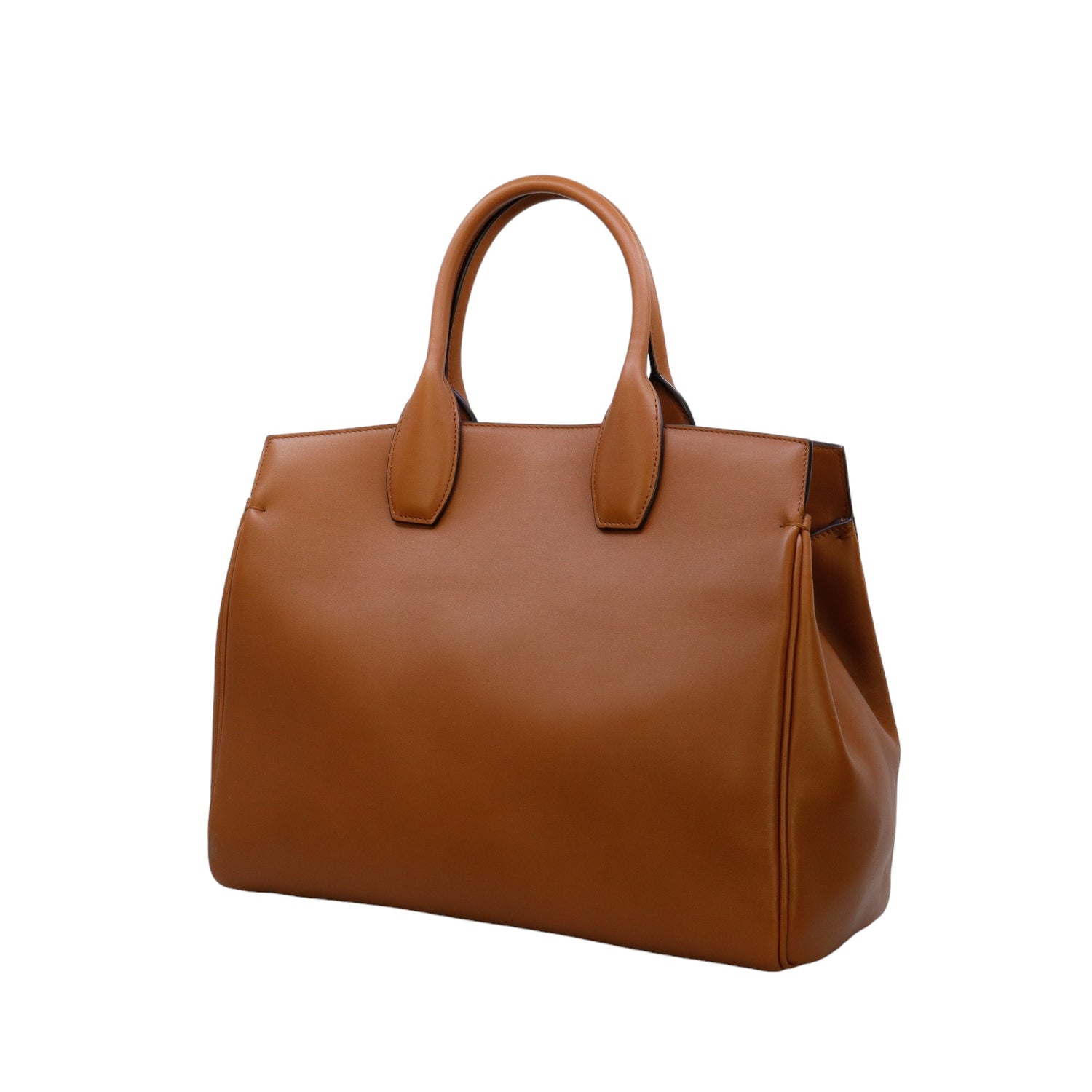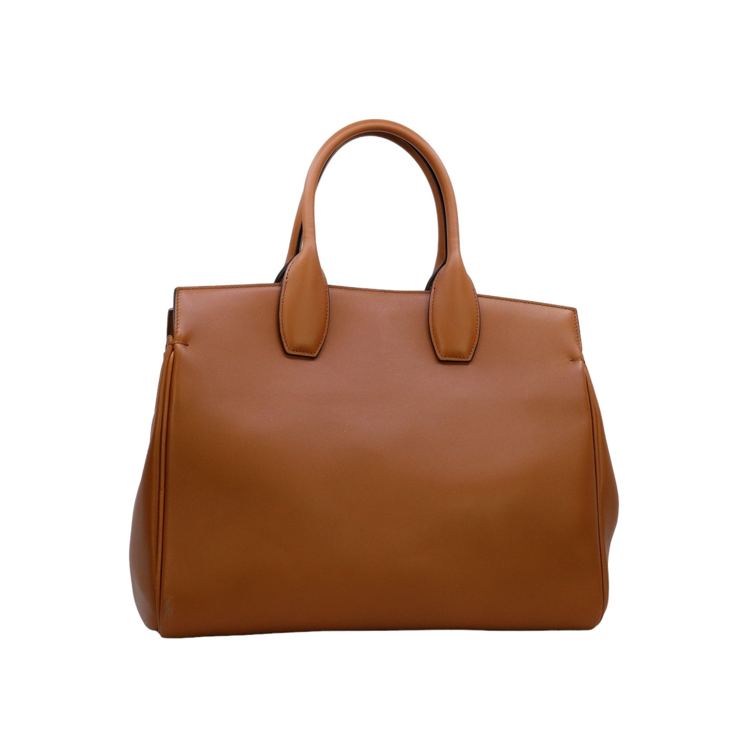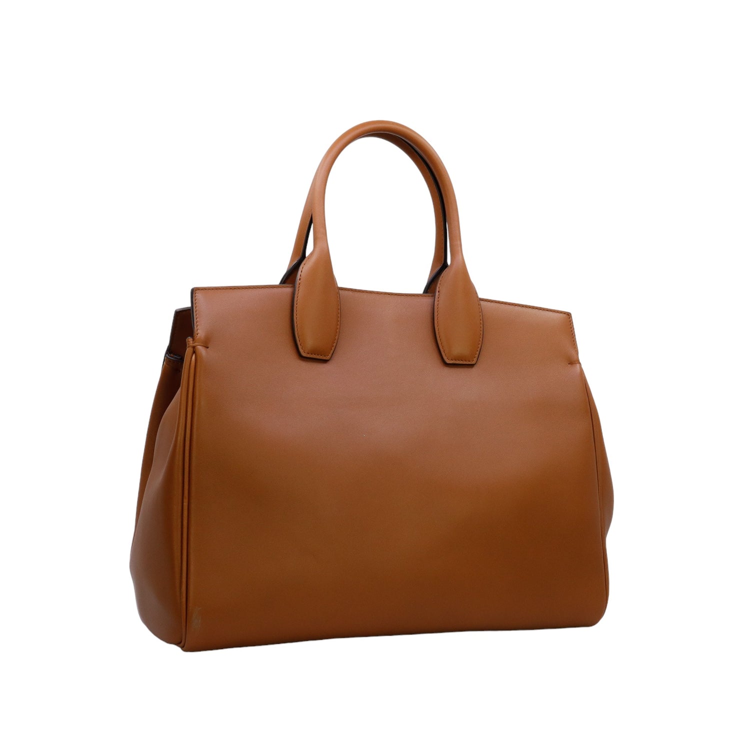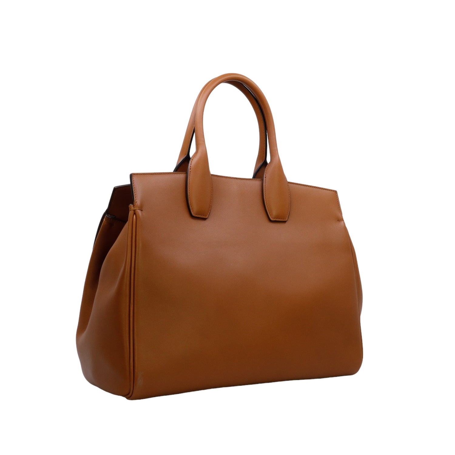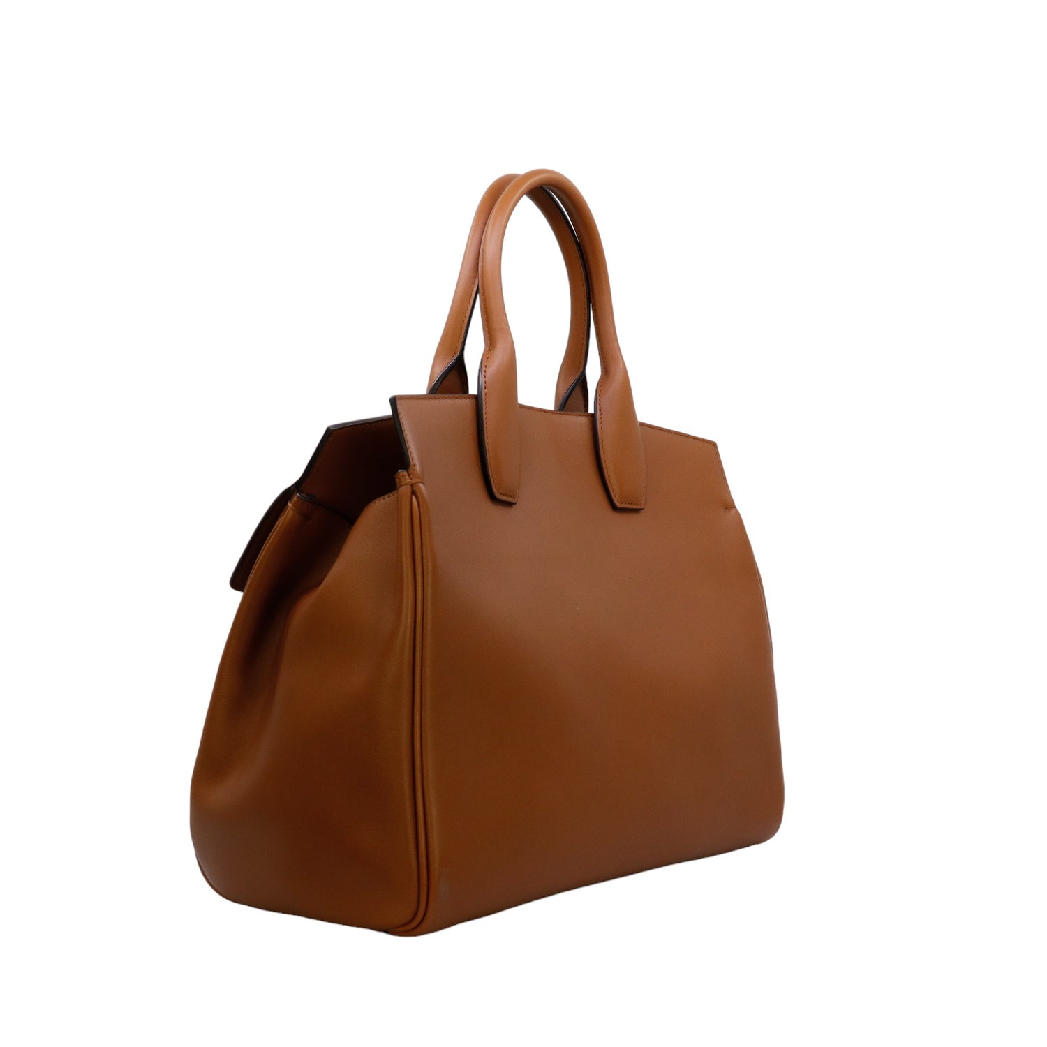 Bolso Salvatore Ferragamo de la línea Studio Bag, confeccionado en piel de becerro a grano color café, con 2 asas rígidas en la parte superior, incluye bolsillo interno plano extraíble y correa en piel para llevar al hombro o cruzado, cierre frontal metálico con el logo Gancini.