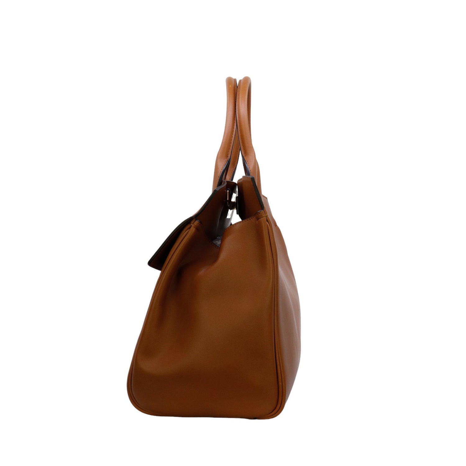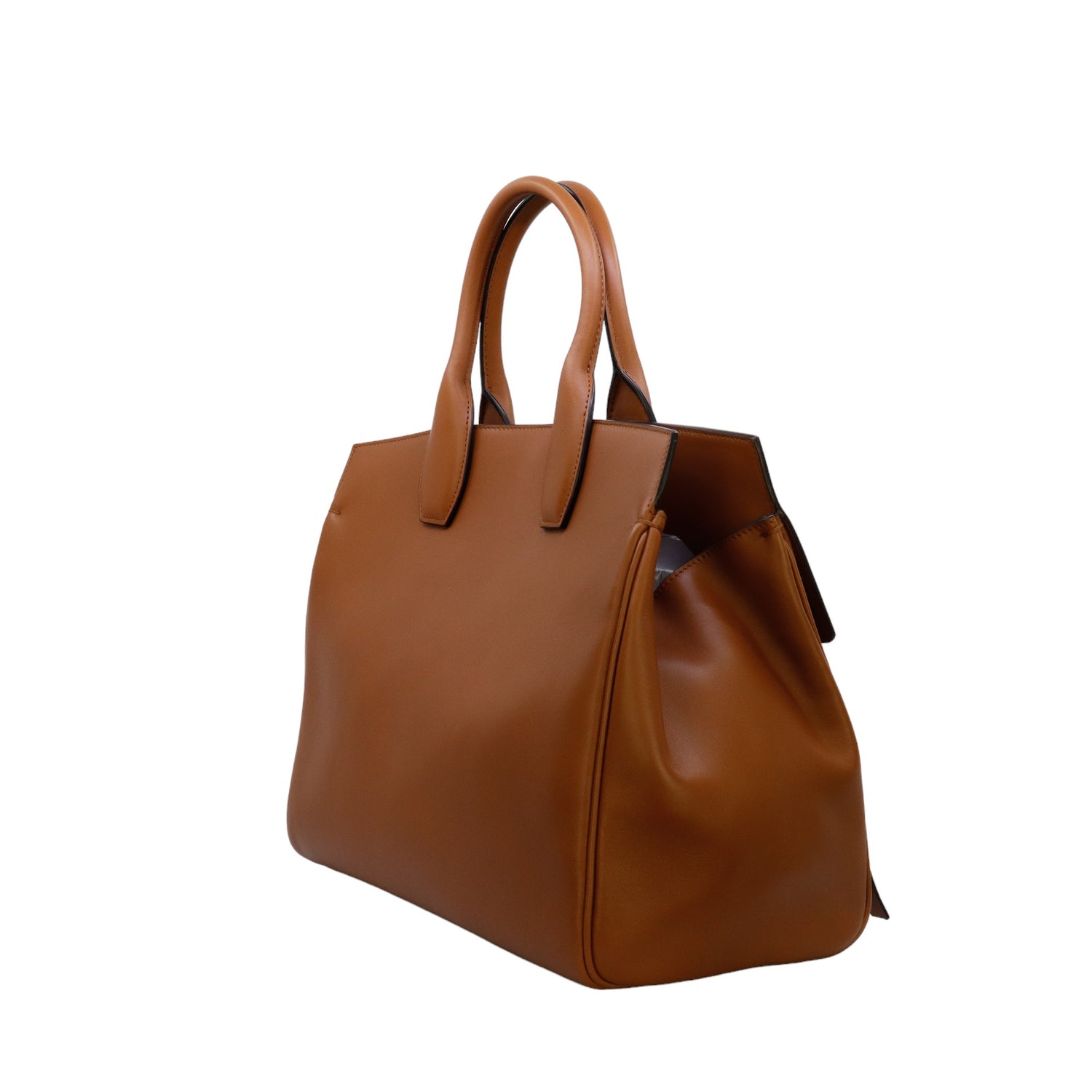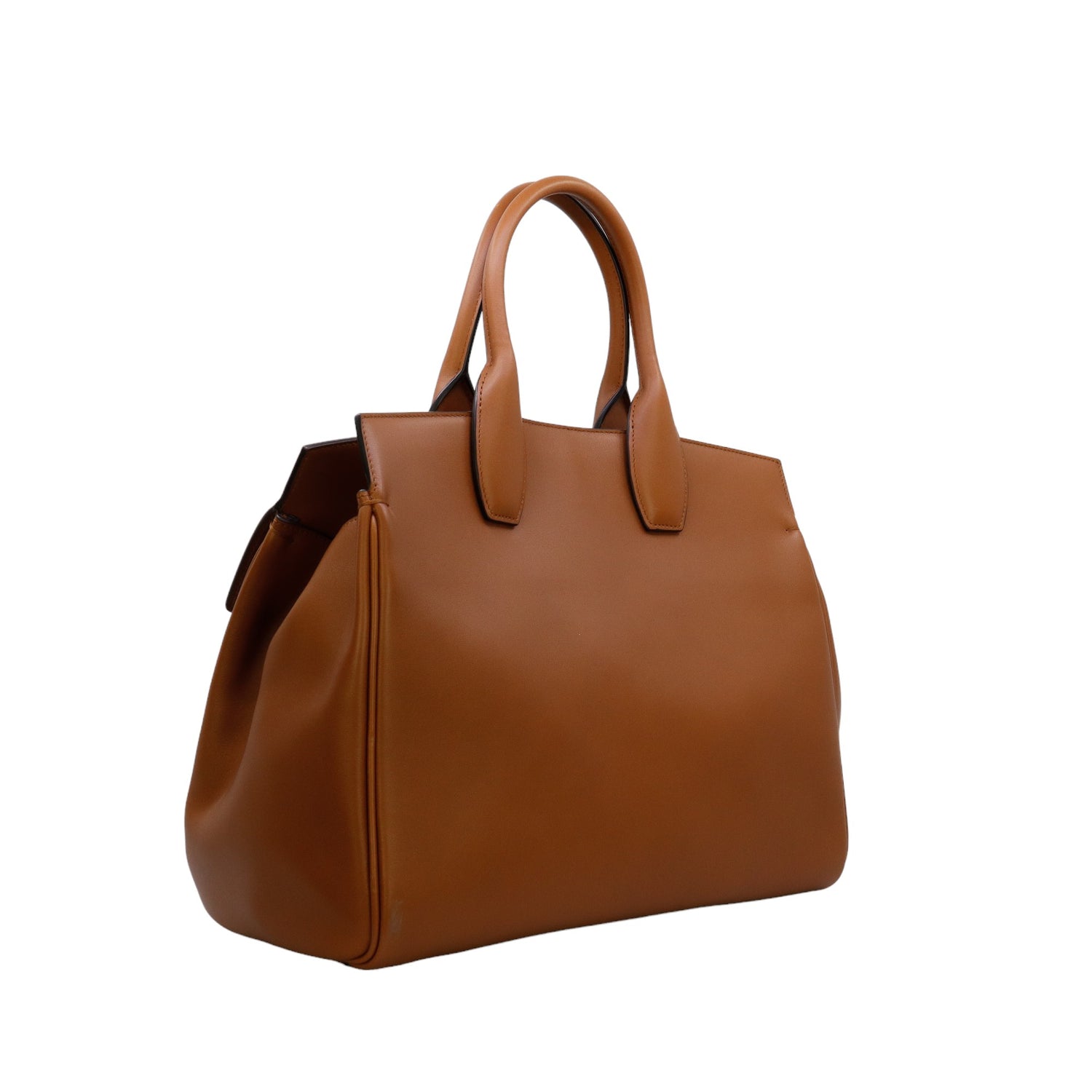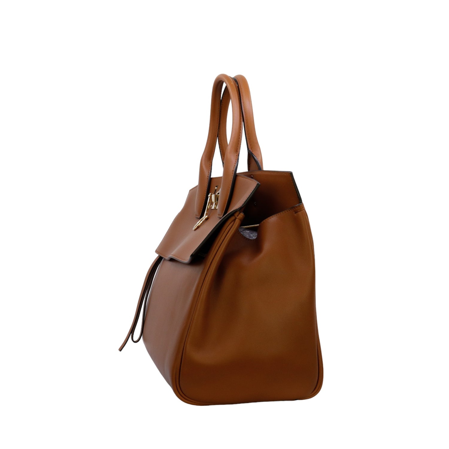 Bolso Salvatore Ferragamo de la línea Studio Bag, confeccionado en piel de becerro a grano color café, con 2 asas rígidas en la parte superior, incluye bolsillo interno plano extraíble y correa en piel para llevar al hombro o cruzado, cierre frontal metálico con el logo Gancini.