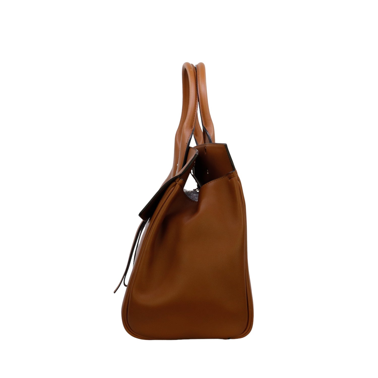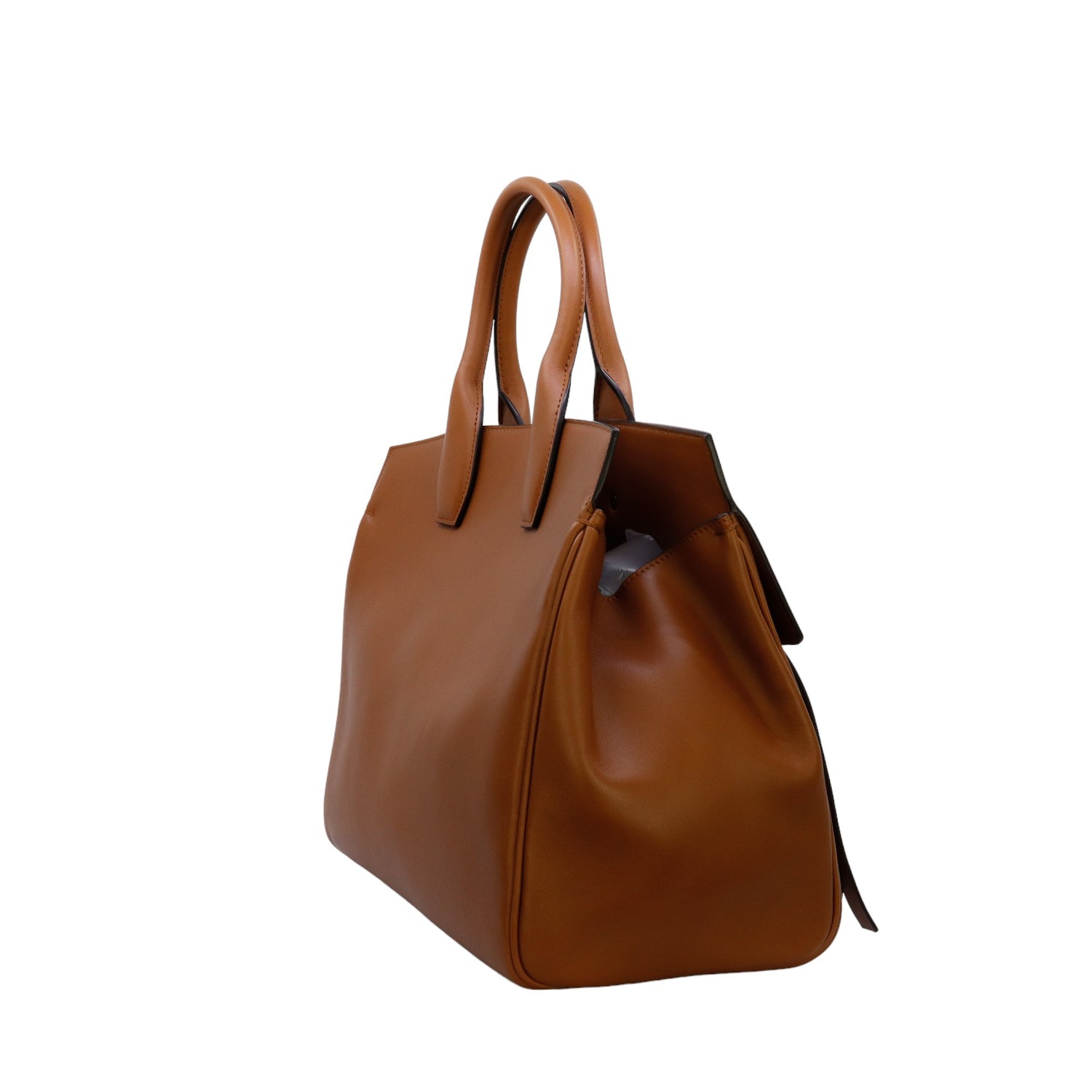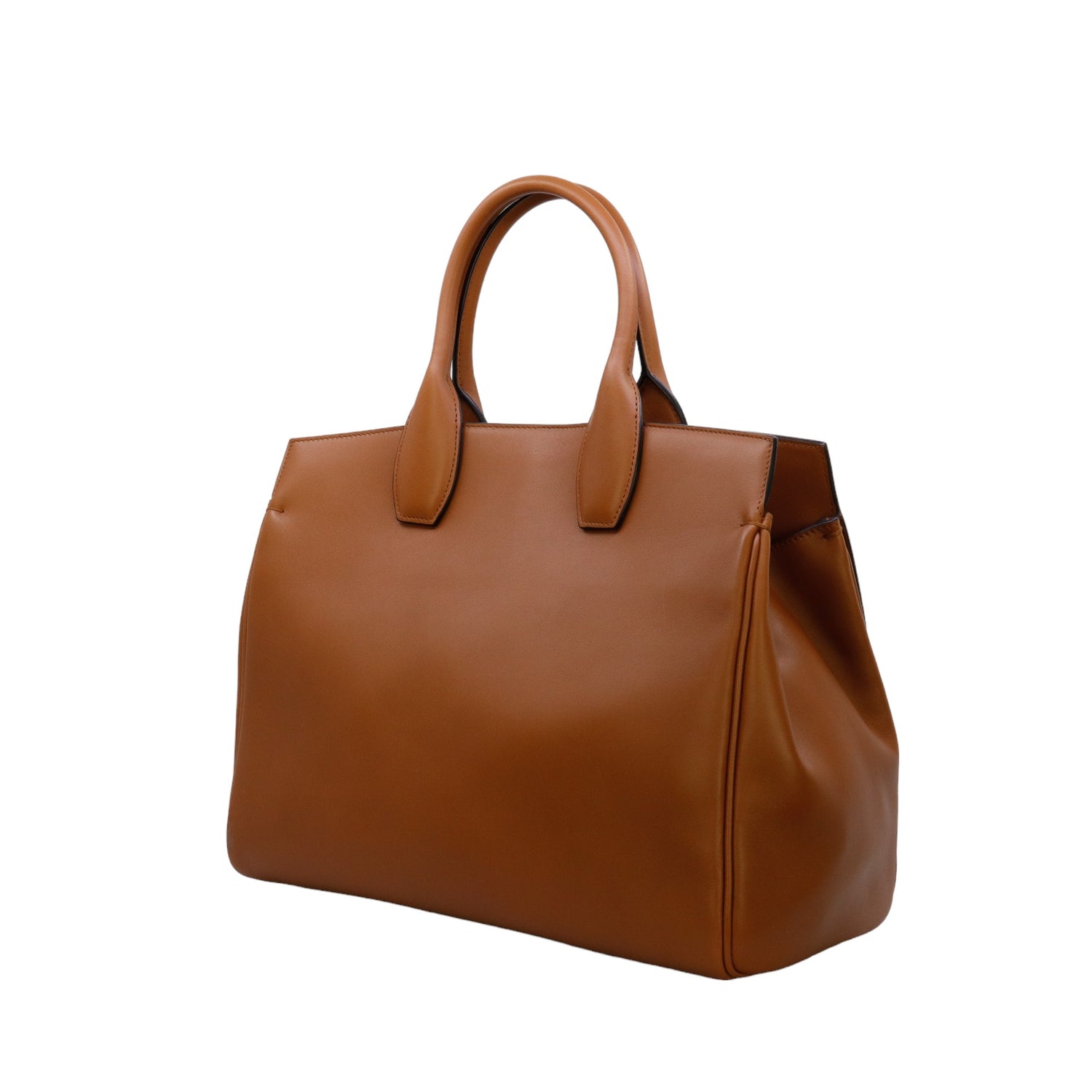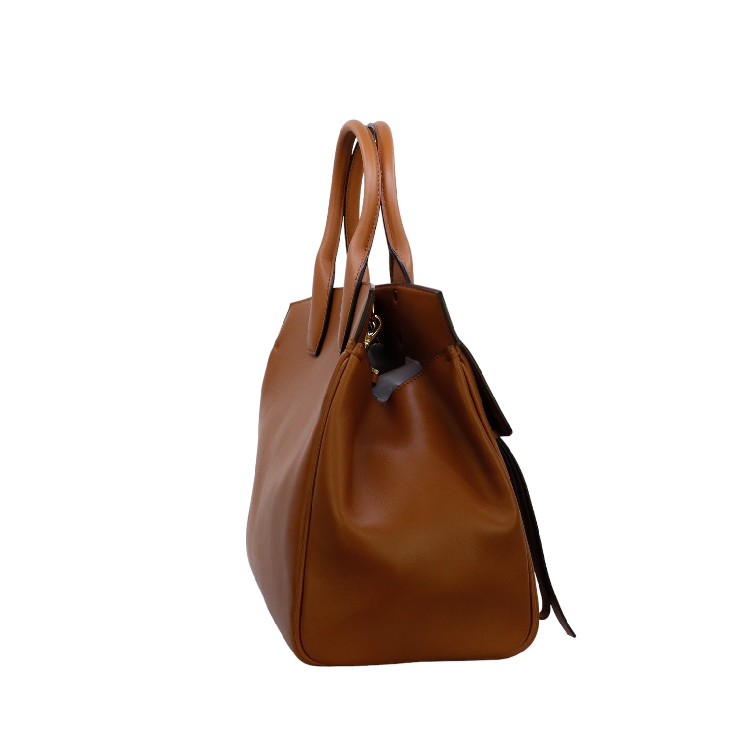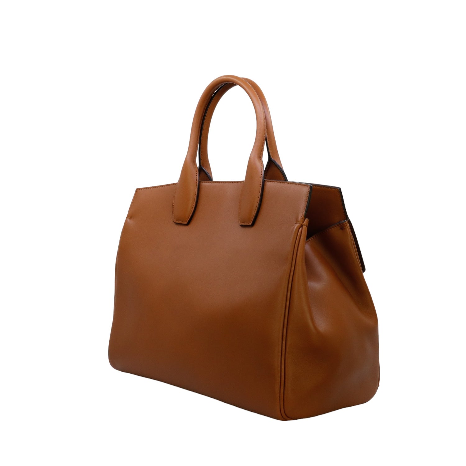 Bolso Salvatore Ferragamo de la línea Studio Bag, confeccionado en piel de becerro a grano color café, con 2 asas rígidas en la parte superior, incluye bolsillo interno plano extraíble y correa en piel para llevar al hombro o cruzado, cierre frontal metálico con el logo Gancini.
