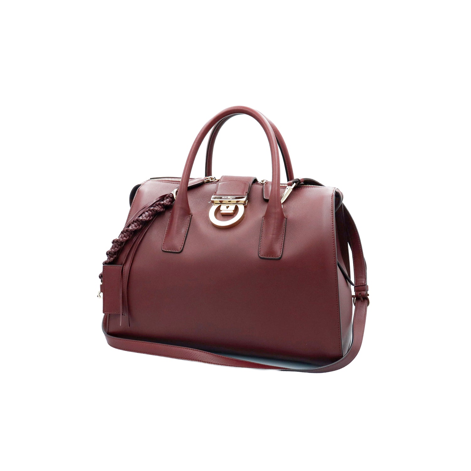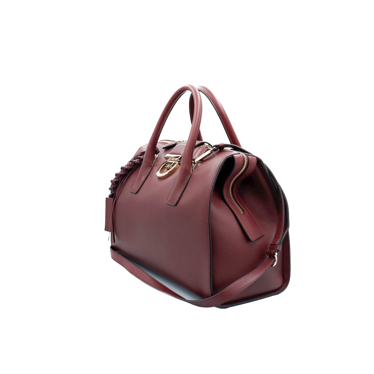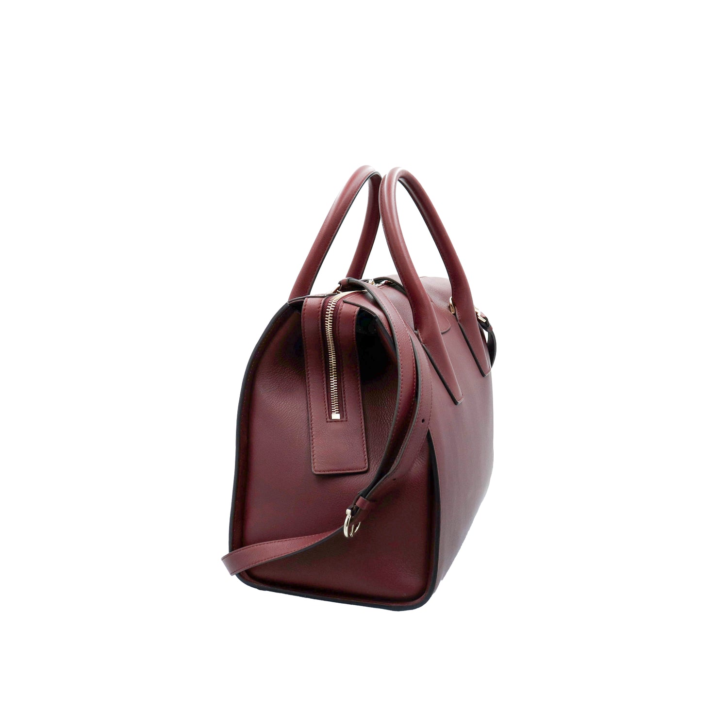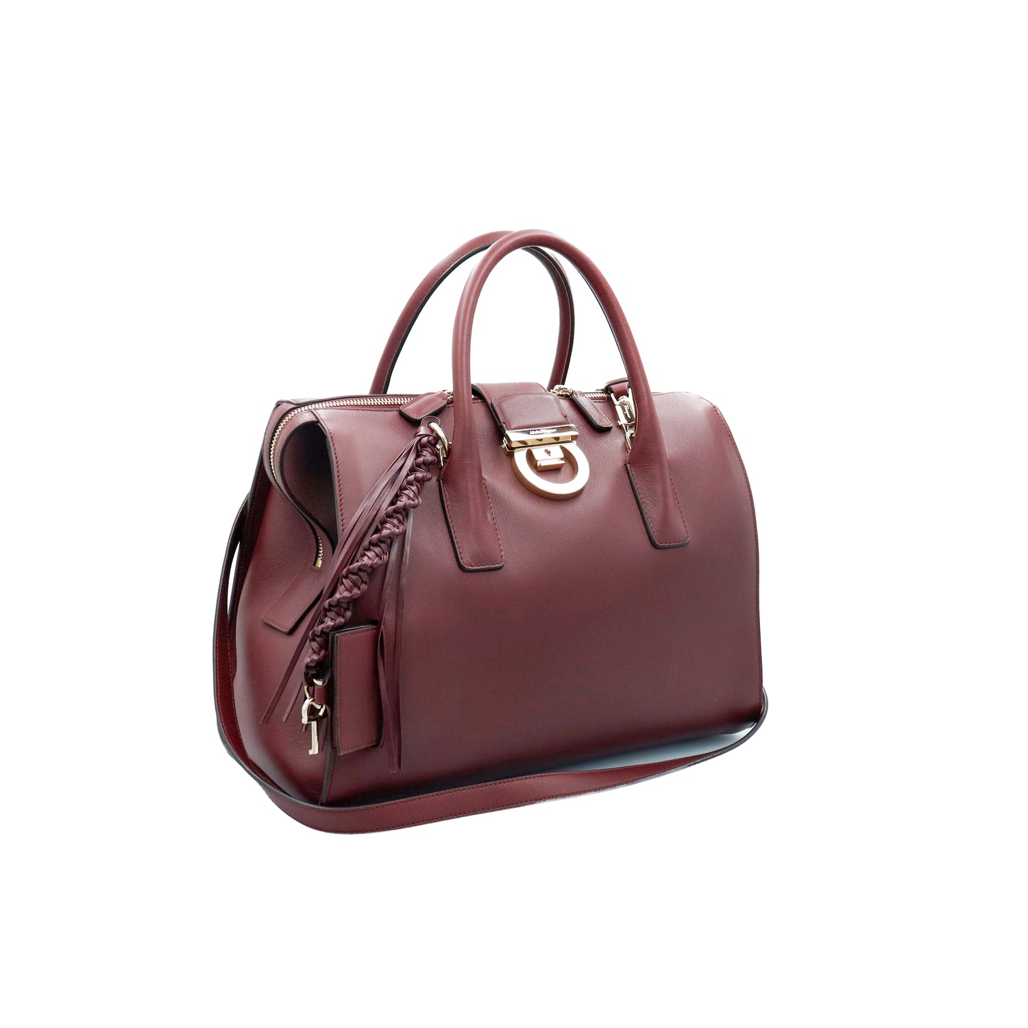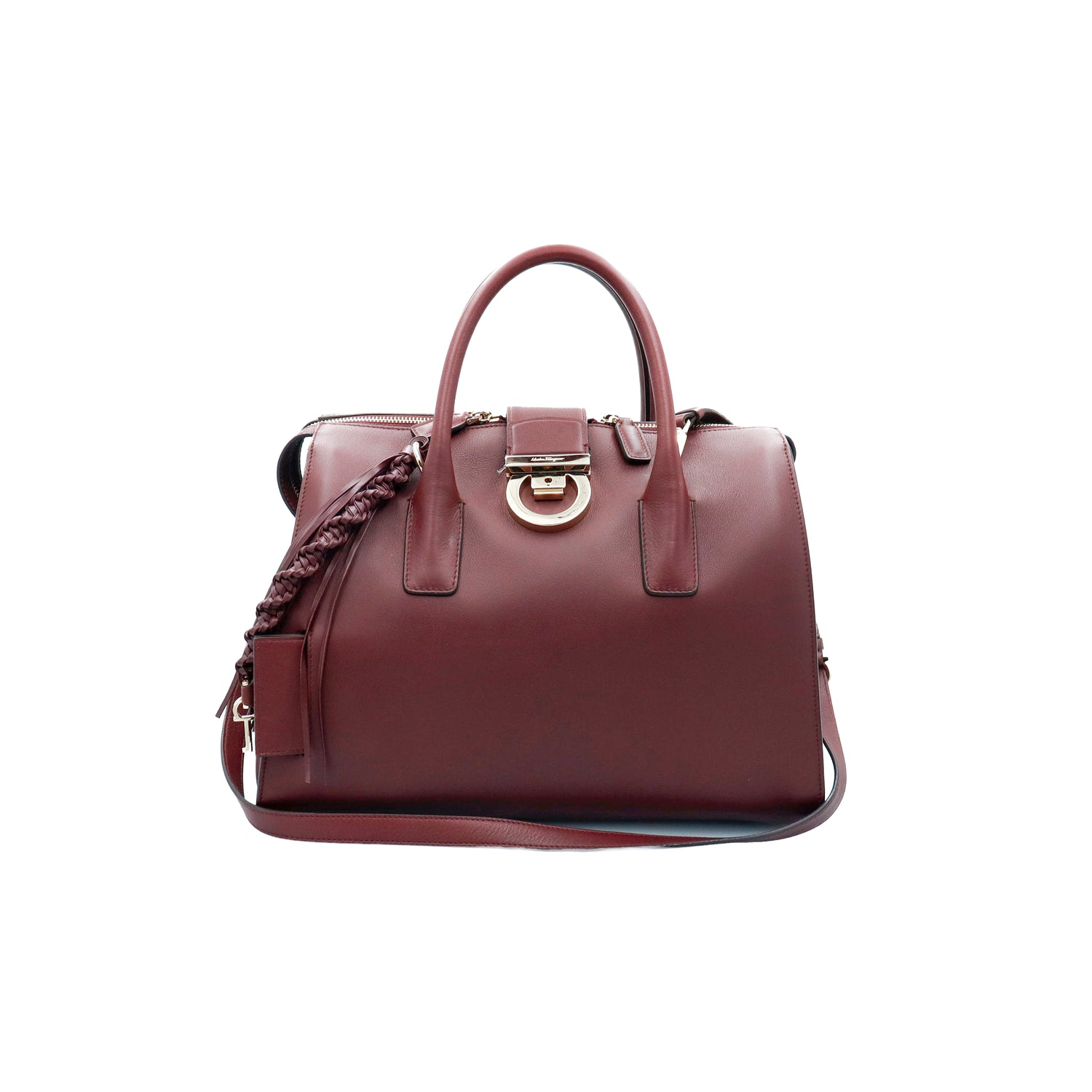 Bolso Salvatore Ferragamo Gancini confeccionado en piel color rojo burdeos, con 2 asas rígidas, una correa de cuero plana desmontable, forro interno en cuero con cierre superior tipo cremallera y herraje con el logo Gancini al frente.