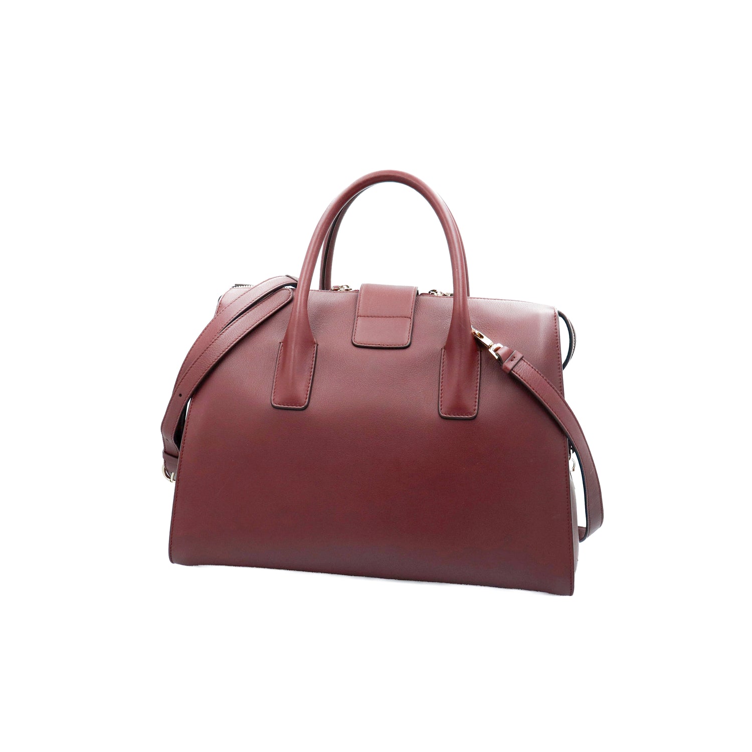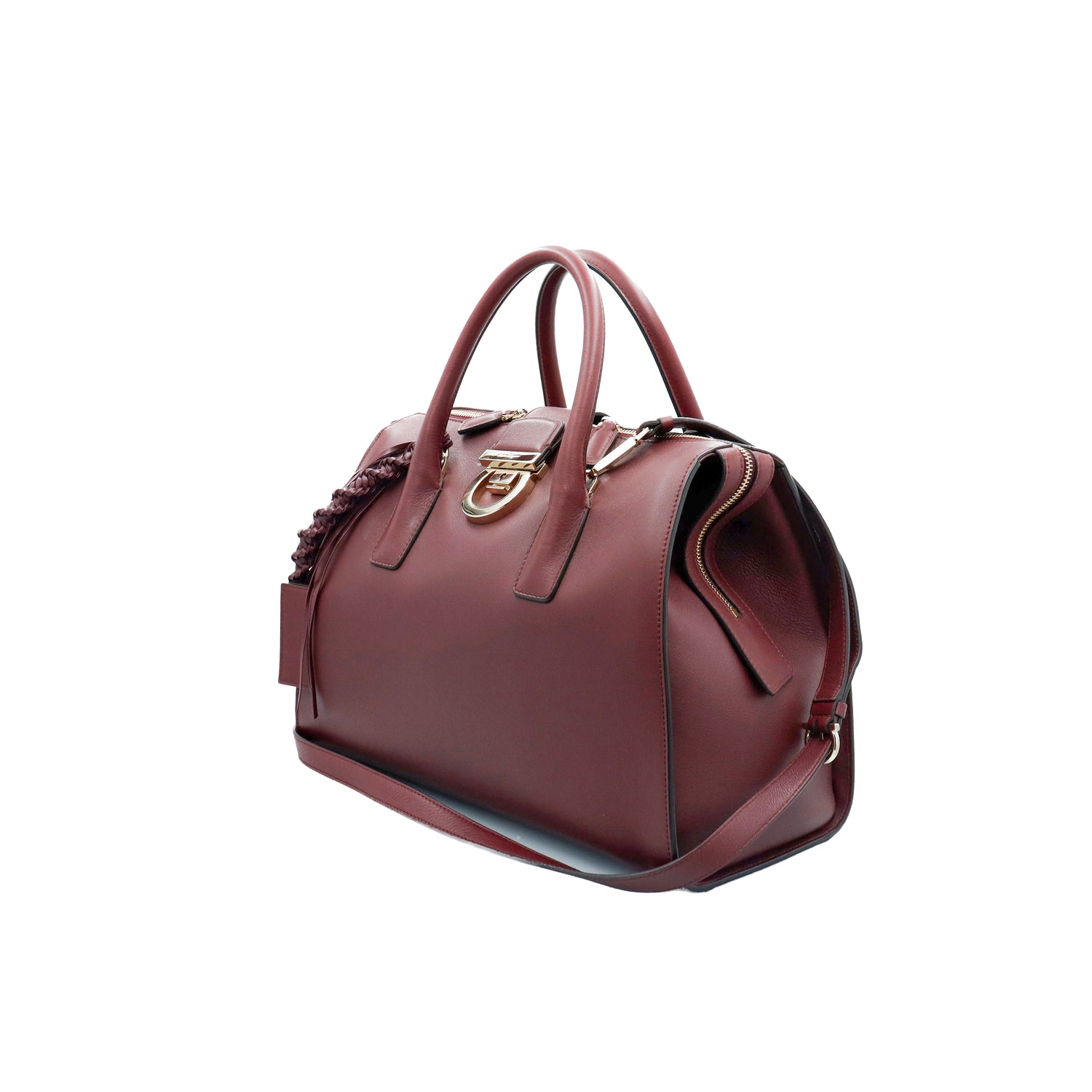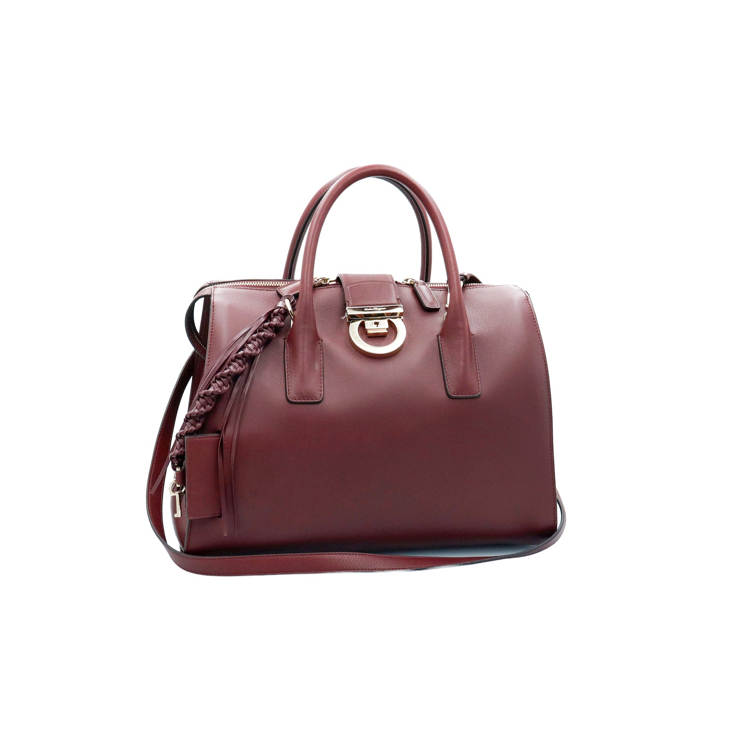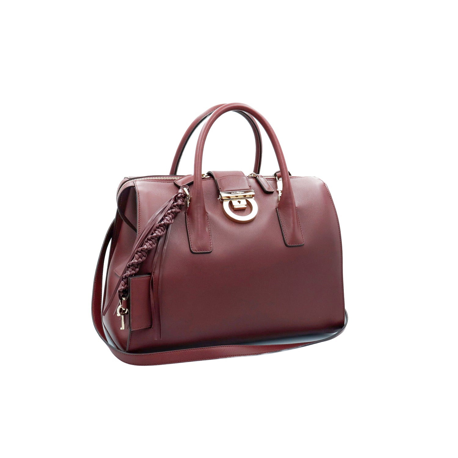 Bolso Salvatore Ferragamo Gancini confeccionado en piel color rojo burdeos, con 2 asas rígidas, una correa de cuero plana desmontable, forro interno en cuero con cierre superior tipo cremallera y herraje con el logo Gancini al frente.