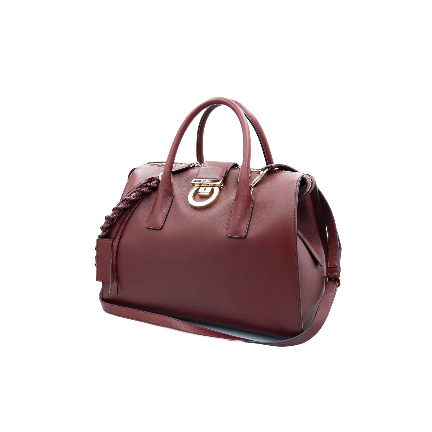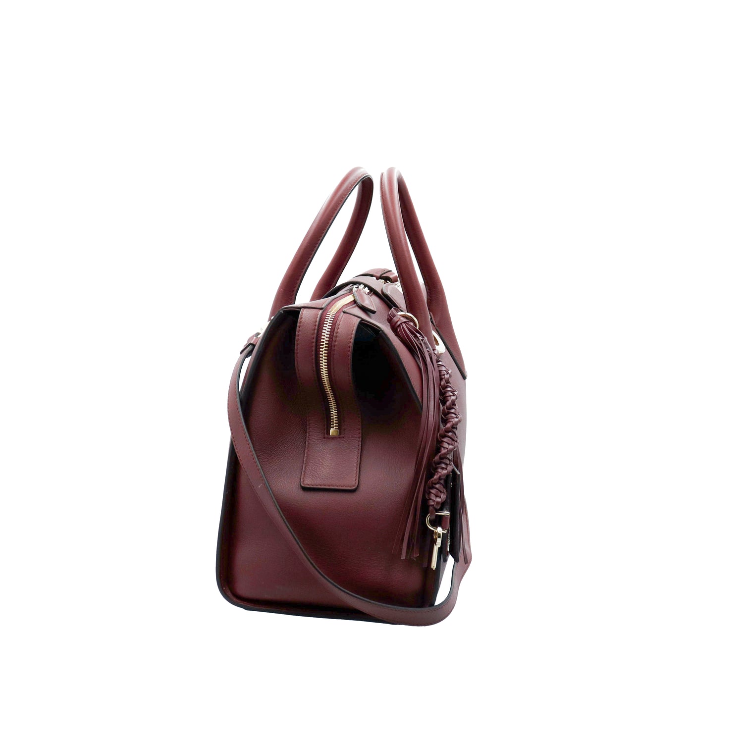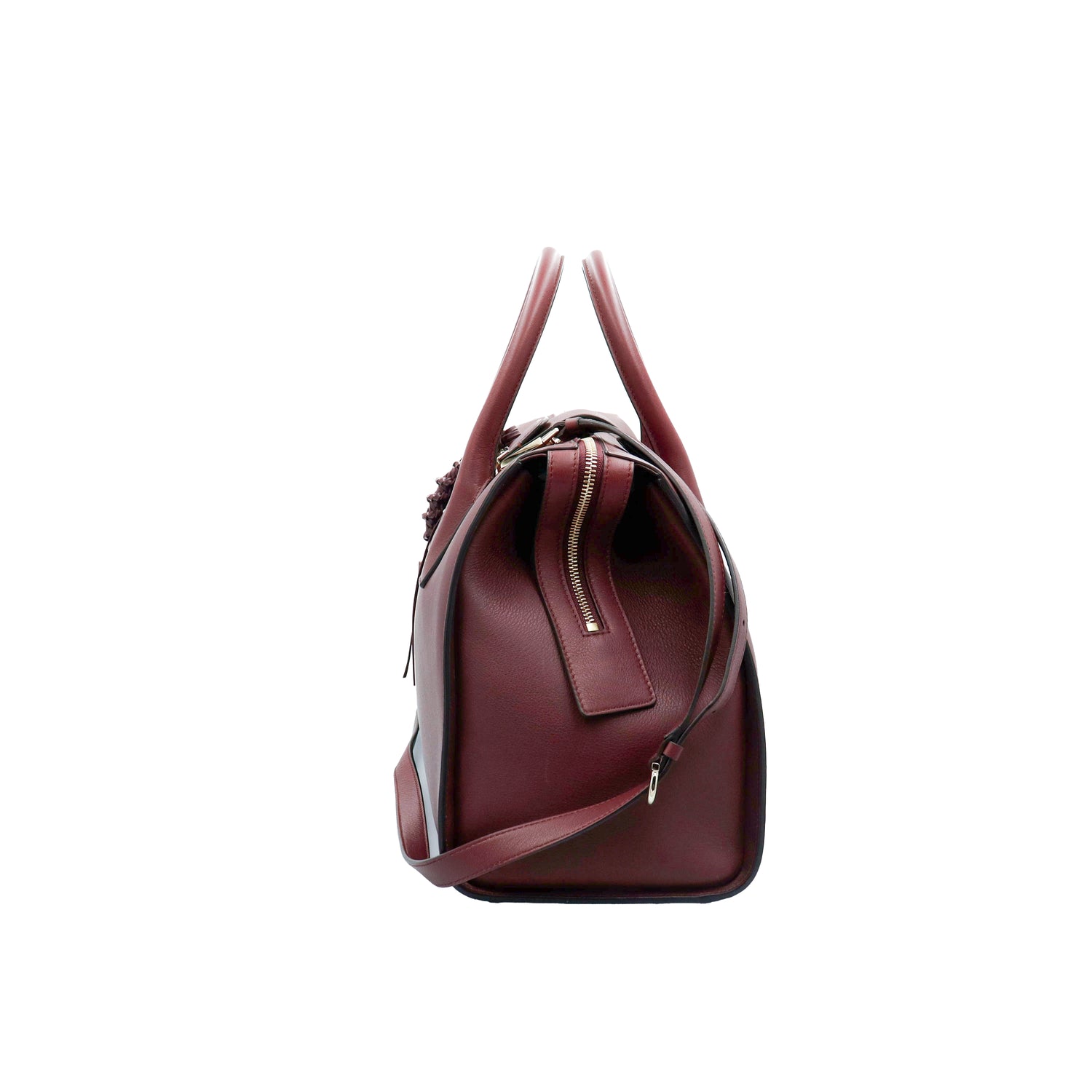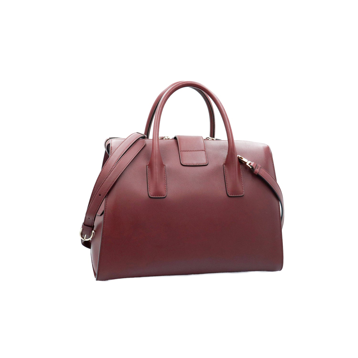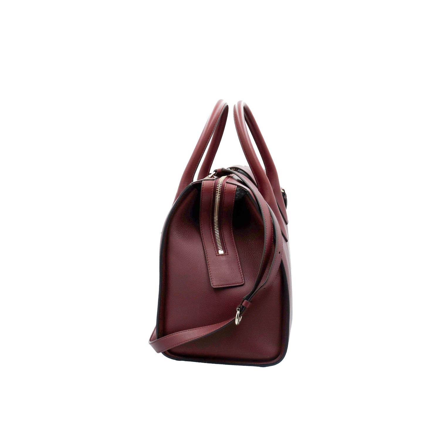 Bolso Salvatore Ferragamo Gancini confeccionado en piel color rojo burdeos, con 2 asas rígidas, una correa de cuero plana desmontable, forro interno en cuero con cierre superior tipo cremallera y herraje con el logo Gancini al frente.