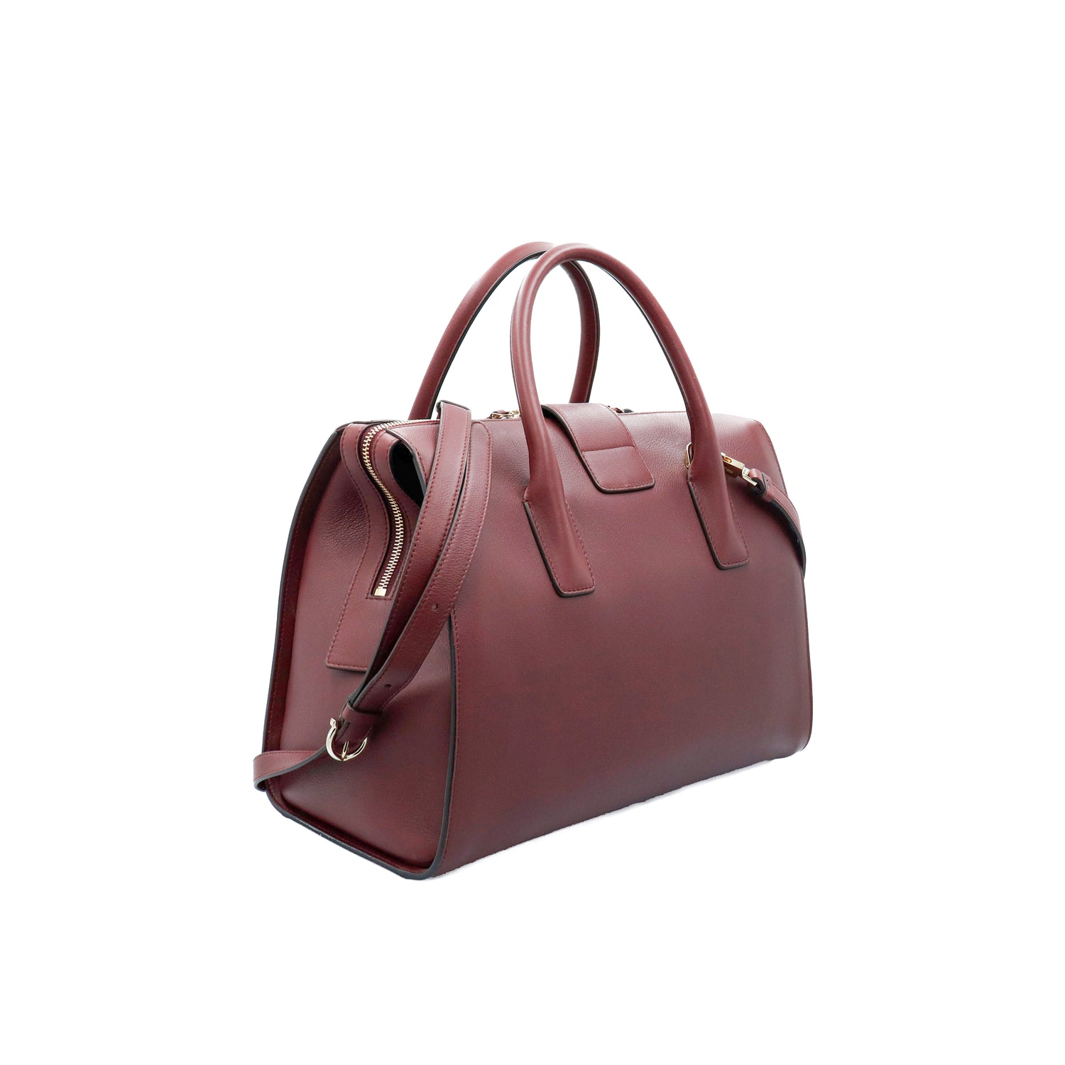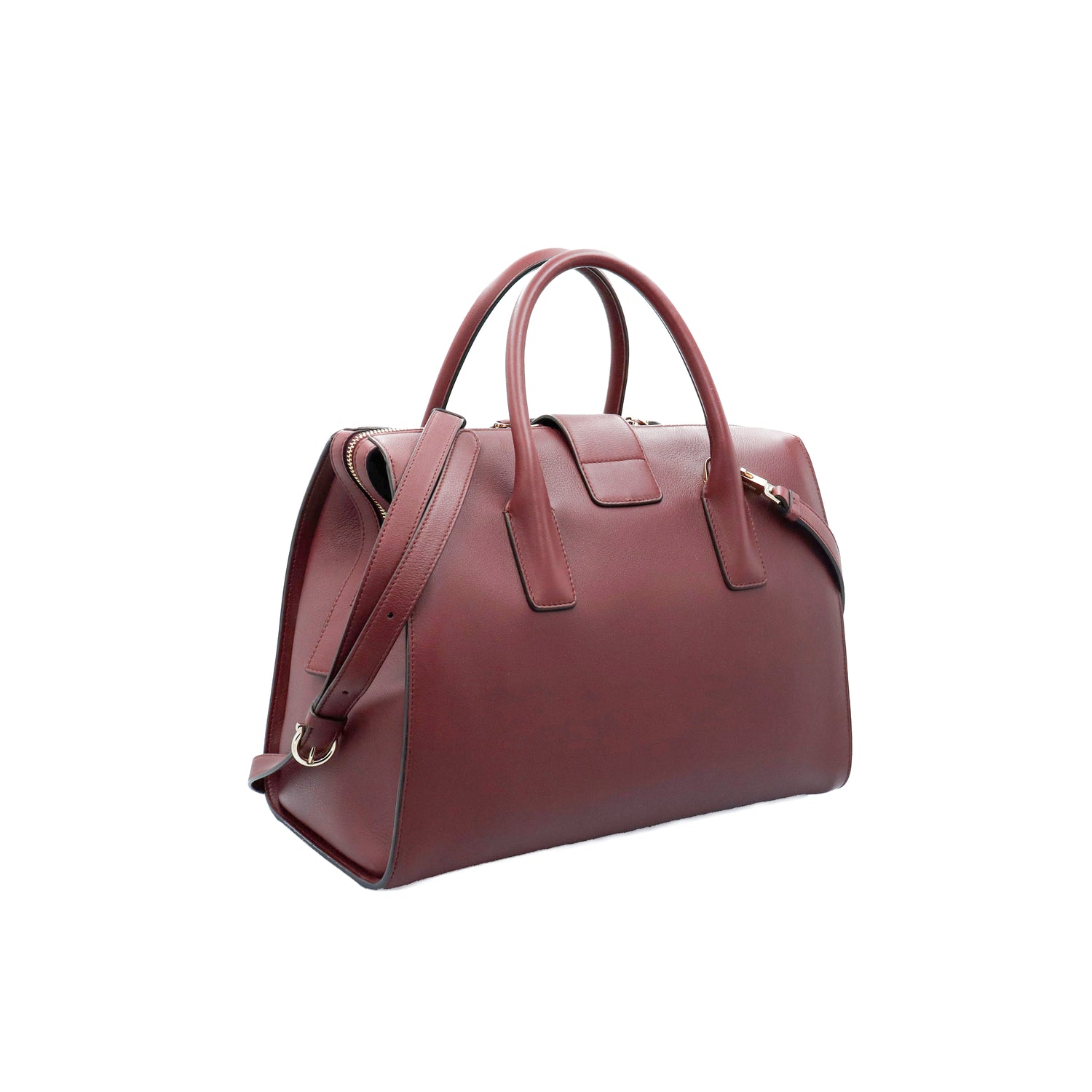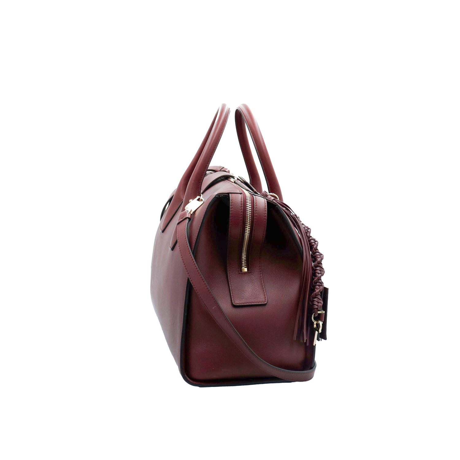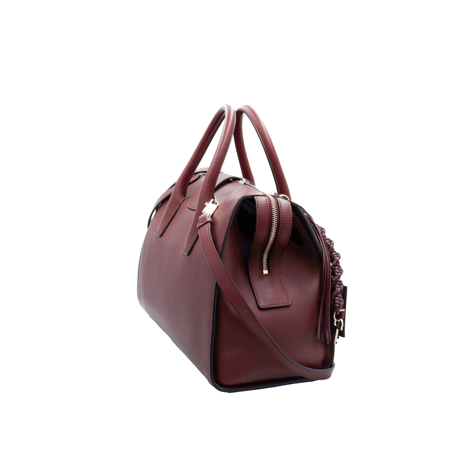 Bolso Salvatore Ferragamo Gancini confeccionado en piel color rojo burdeos, con 2 asas rígidas, una correa de cuero plana desmontable, forro interno en cuero con cierre superior tipo cremallera y herraje con el logo Gancini al frente.