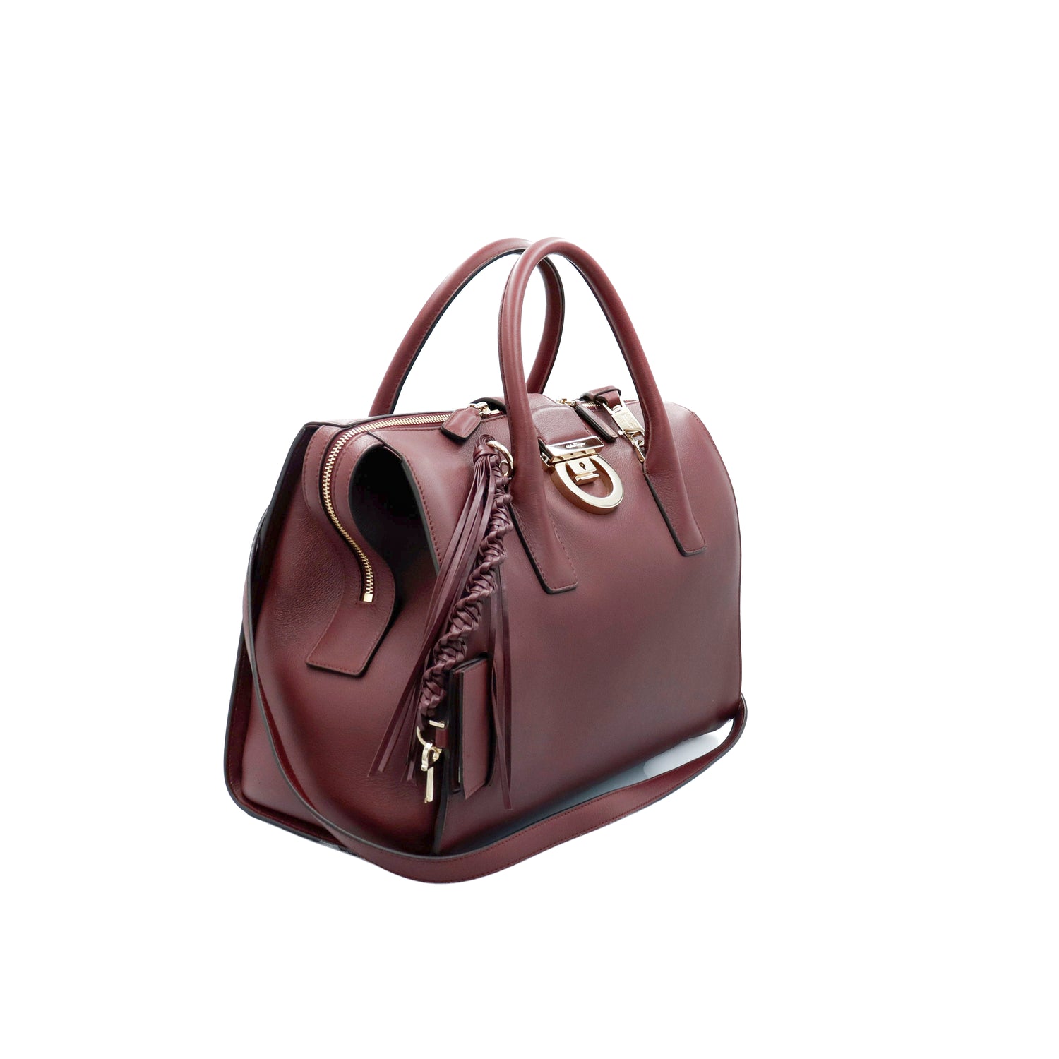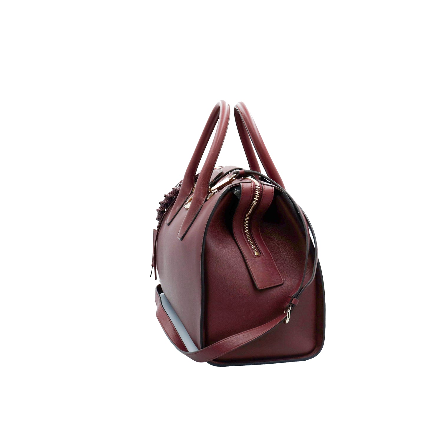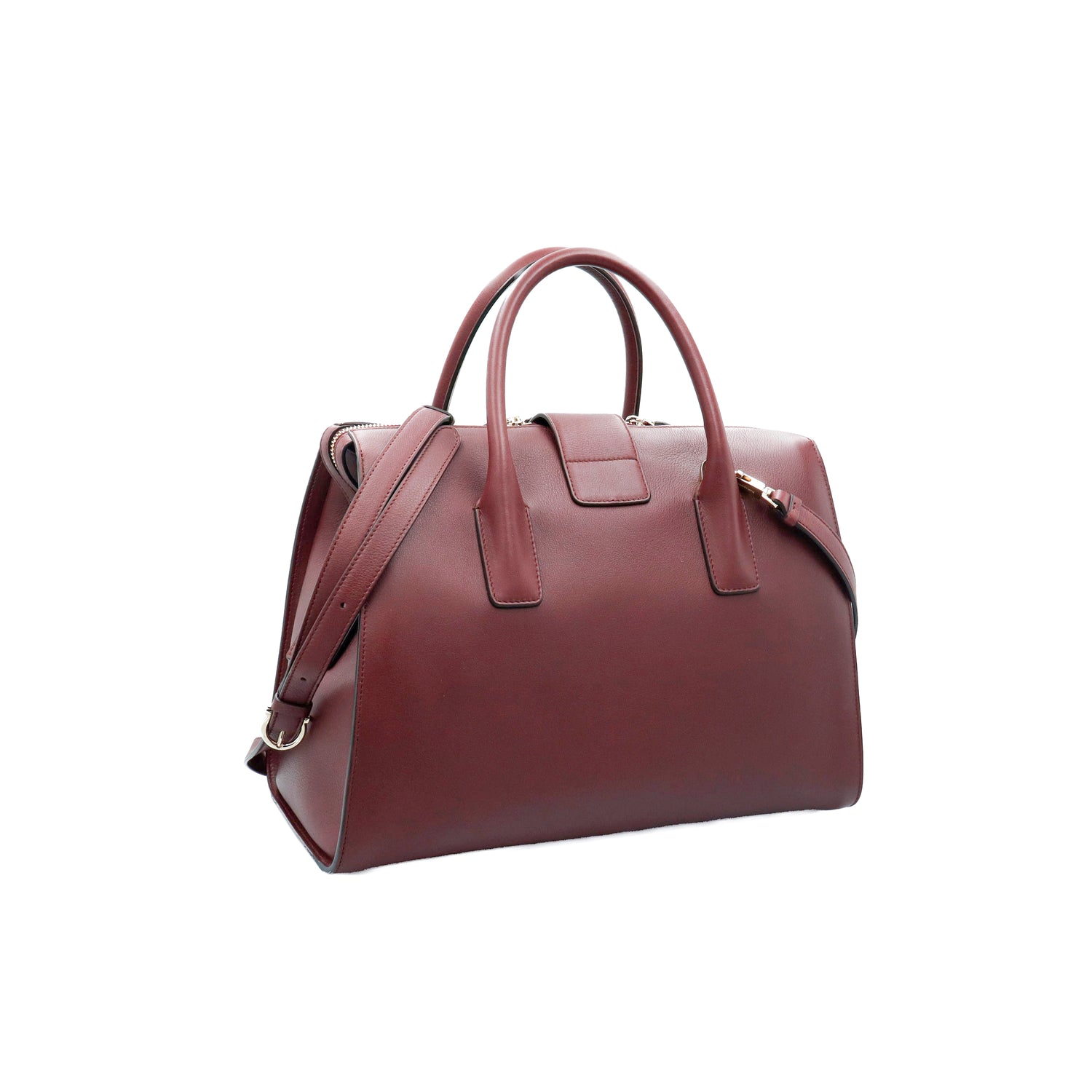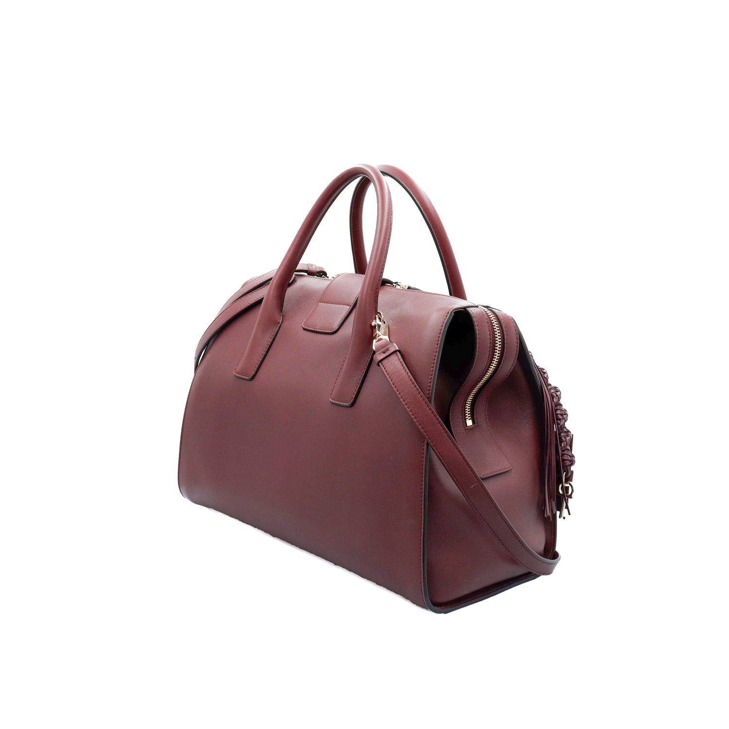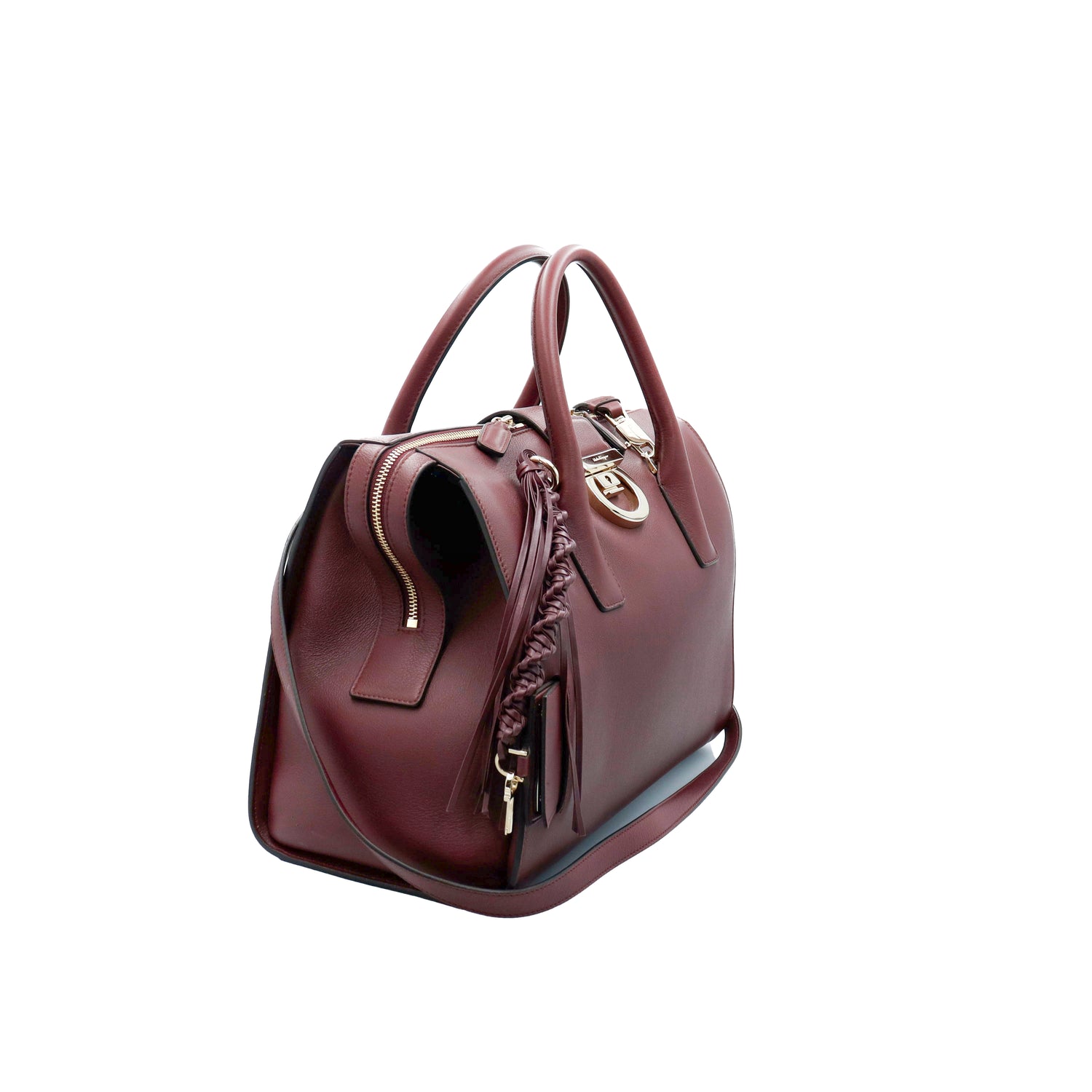 Bolso Salvatore Ferragamo Gancini confeccionado en piel color rojo burdeos, con 2 asas rígidas, una correa de cuero plana desmontable, forro interno en cuero con cierre superior tipo cremallera y herraje con el logo Gancini al frente.