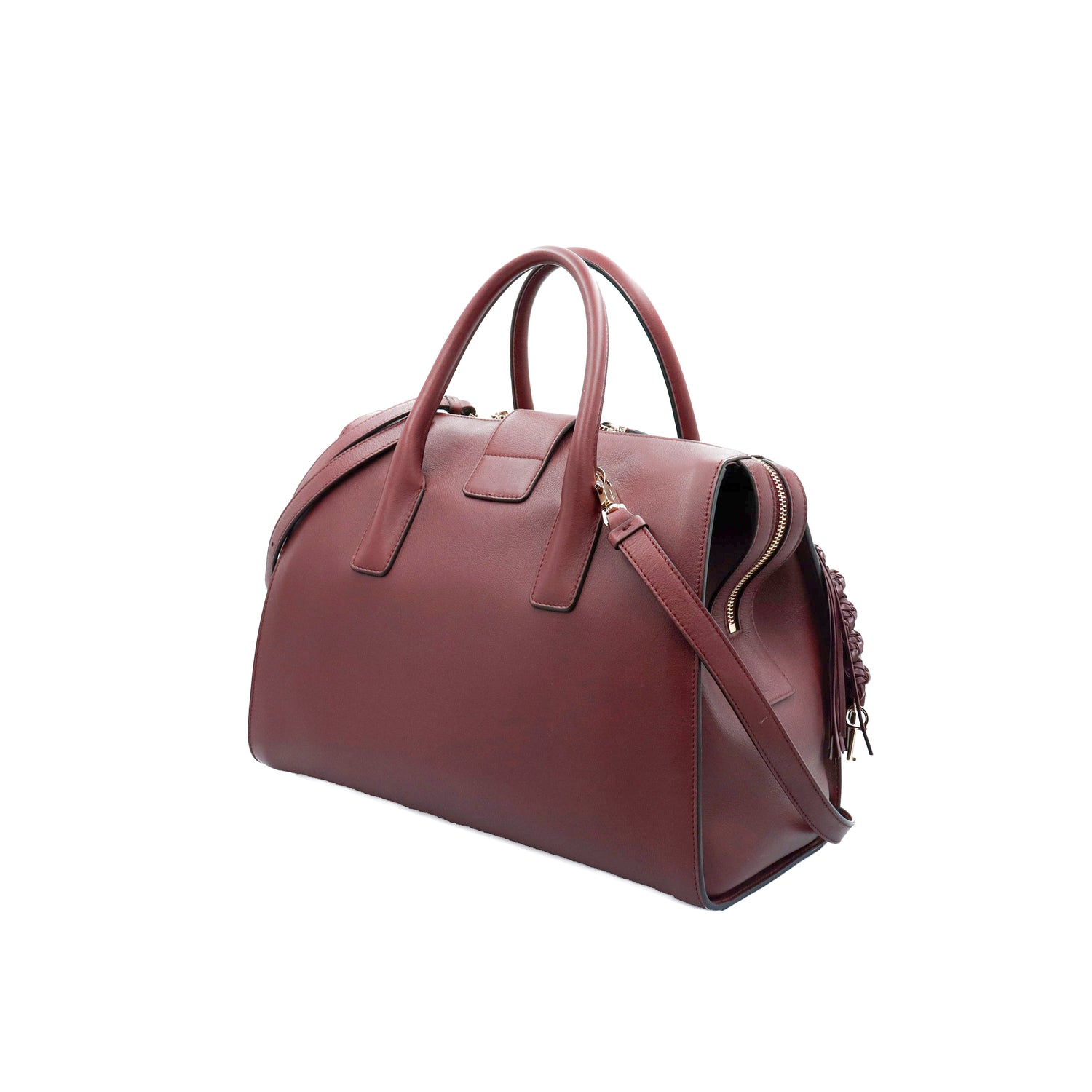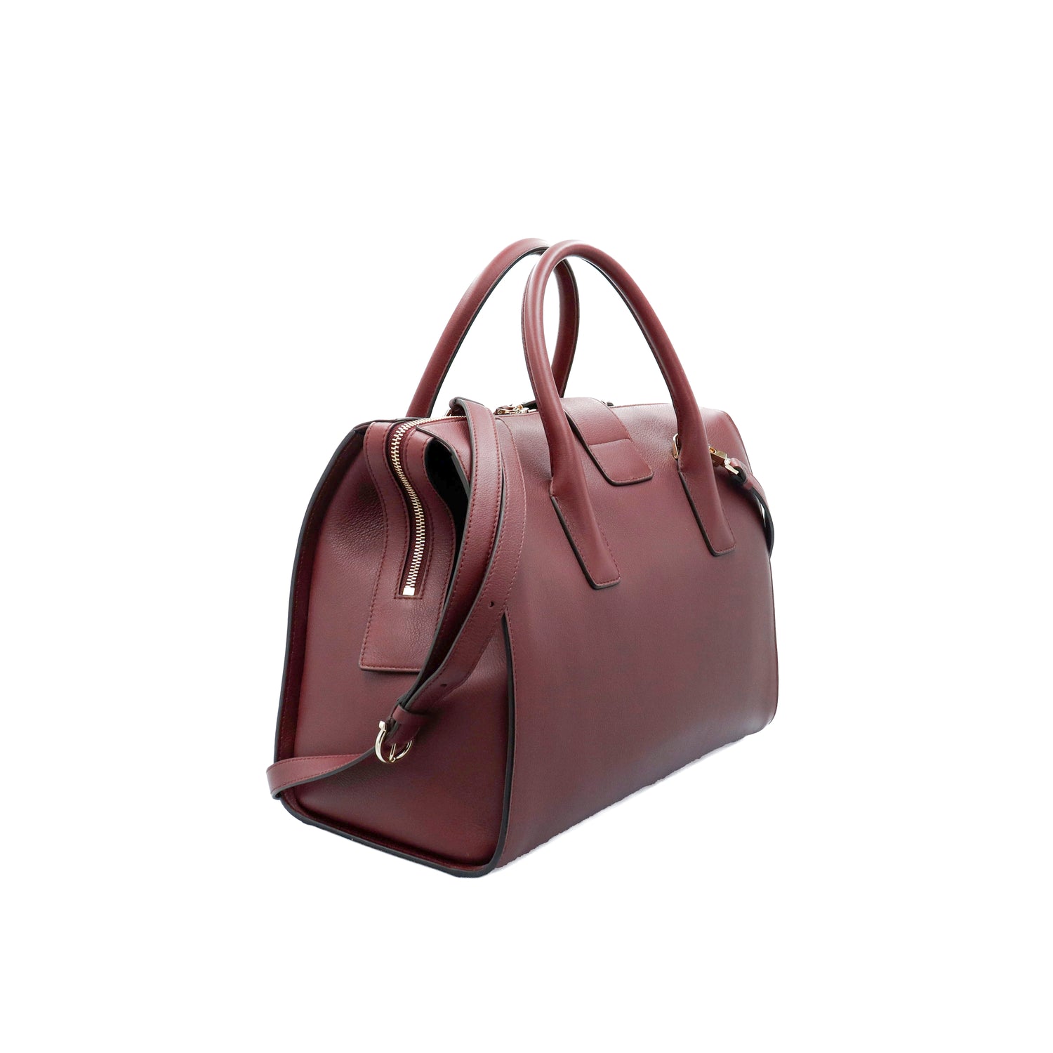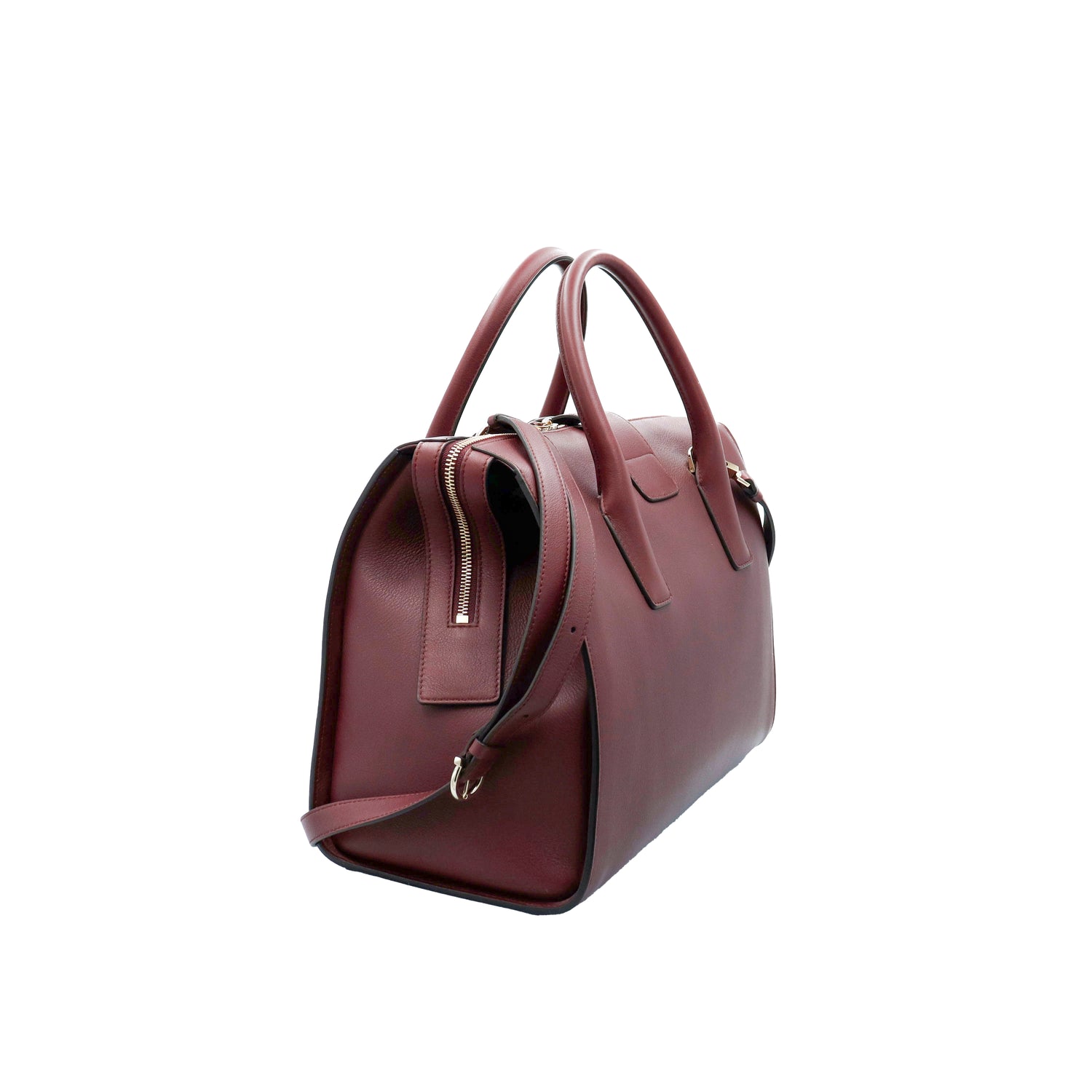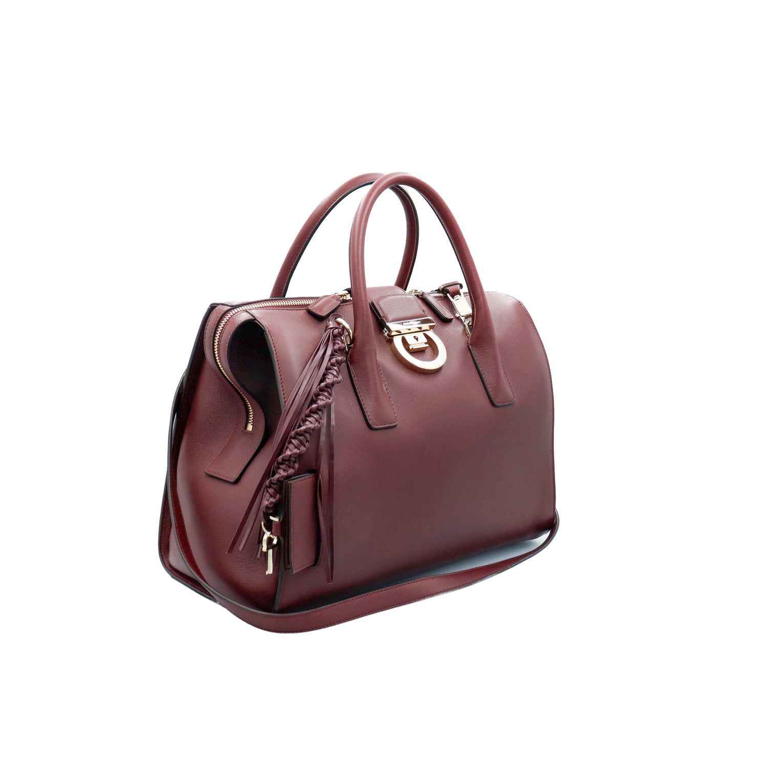 Bolso Salvatore Ferragamo Gancini confeccionado en piel color rojo burdeos, con 2 asas rígidas, una correa de cuero plana desmontable, forro interno en cuero con cierre superior tipo cremallera y herraje con el logo Gancini al frente.