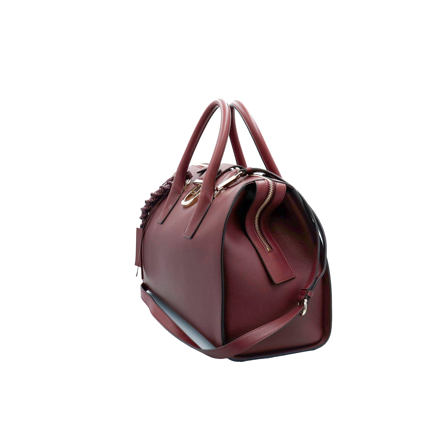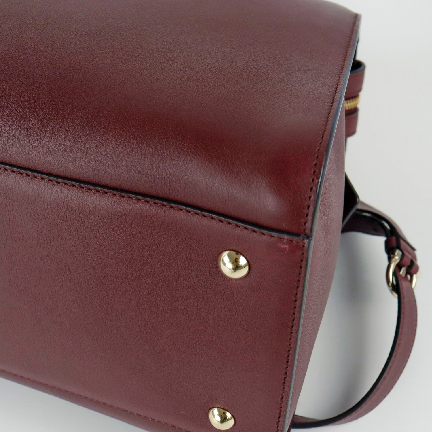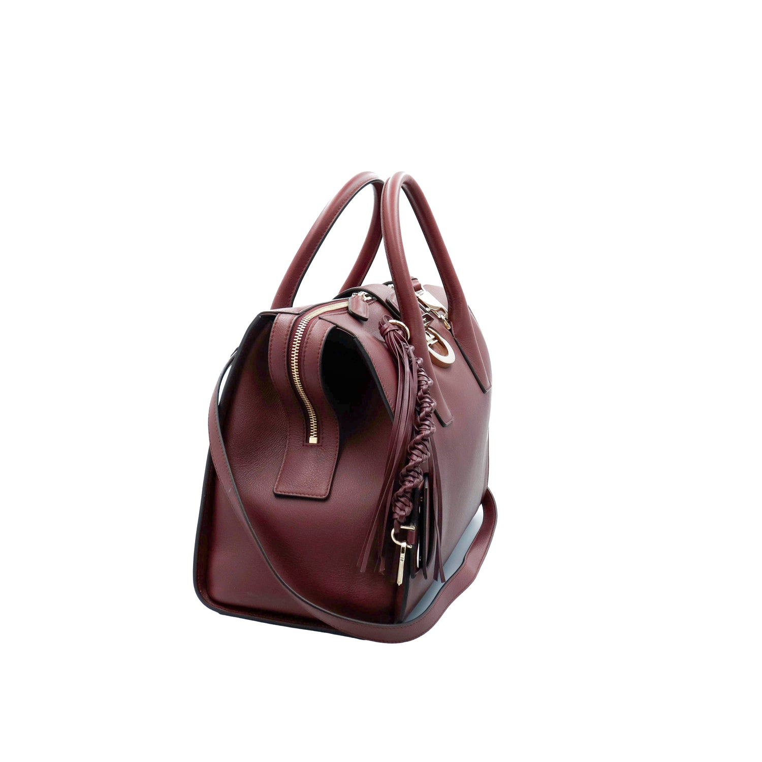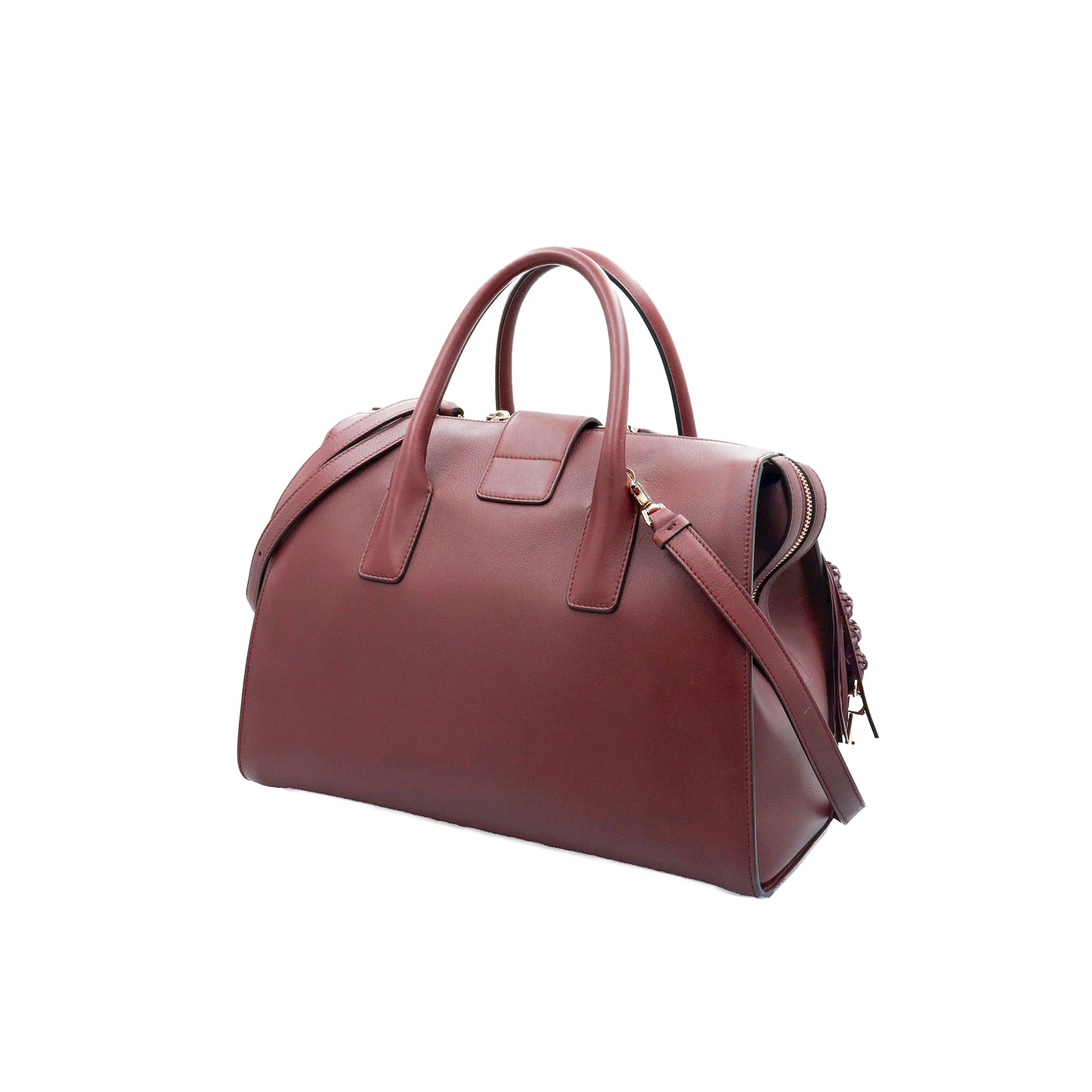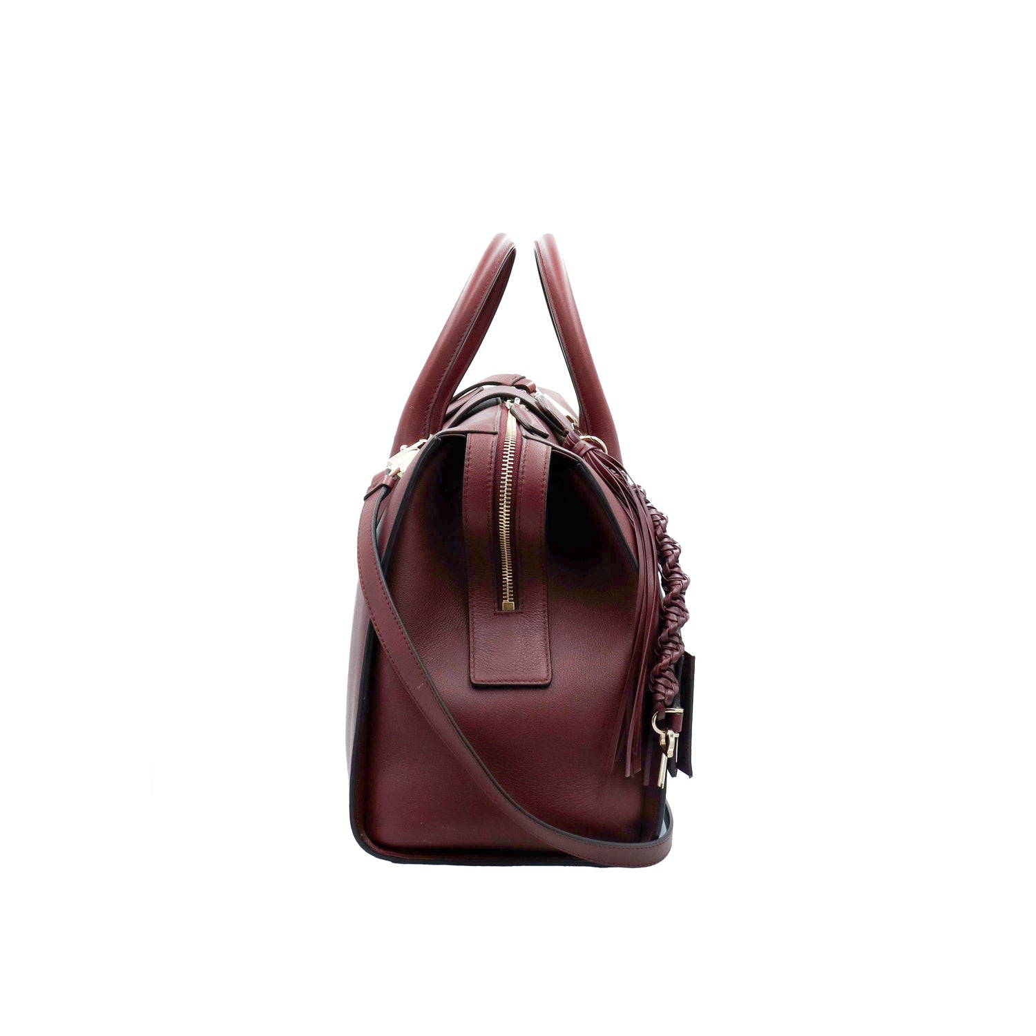 Bolso Salvatore Ferragamo Gancini confeccionado en piel color rojo burdeos, con 2 asas rígidas, una correa de cuero plana desmontable, forro interno en cuero con cierre superior tipo cremallera y herraje con el logo Gancini al frente.