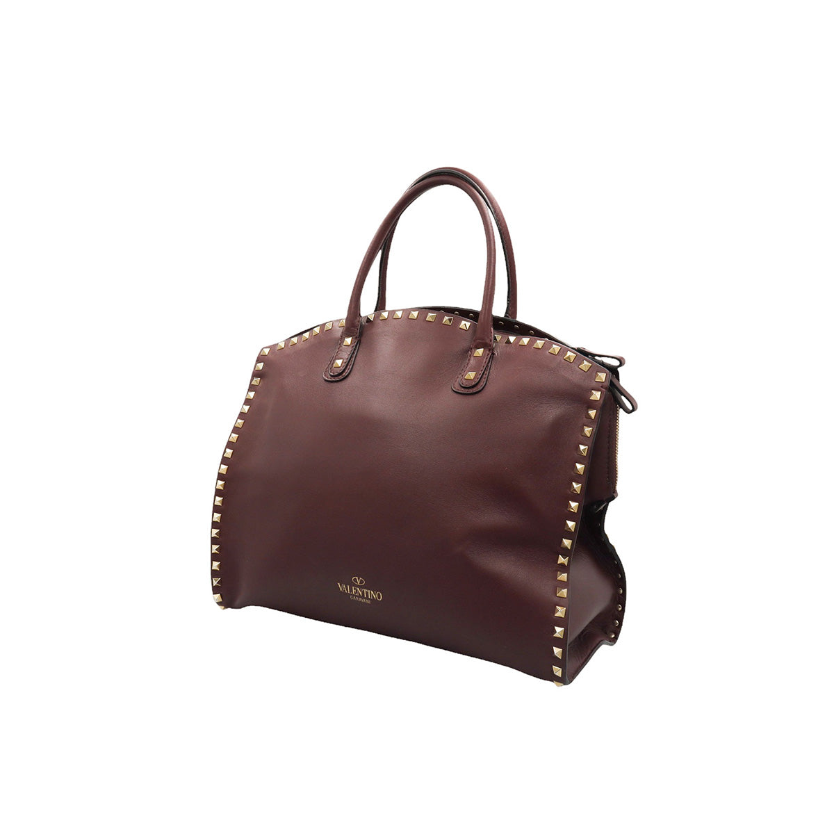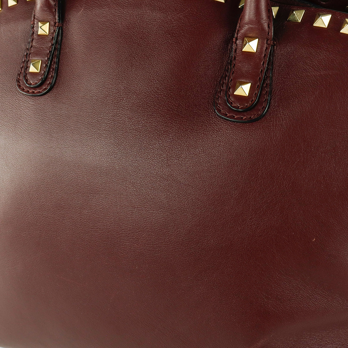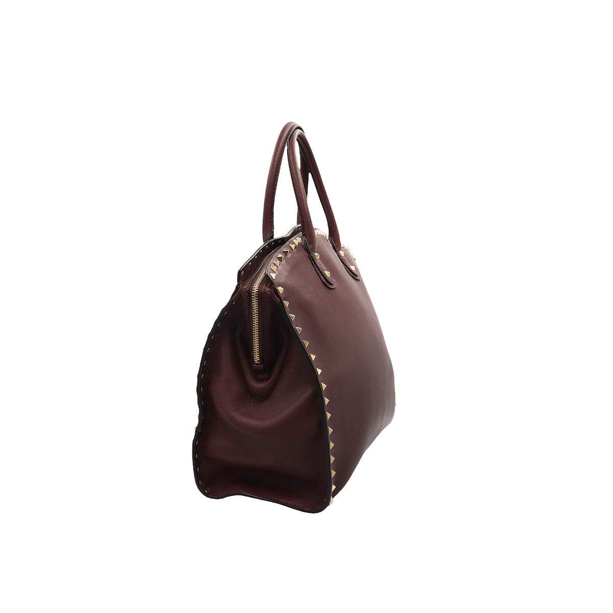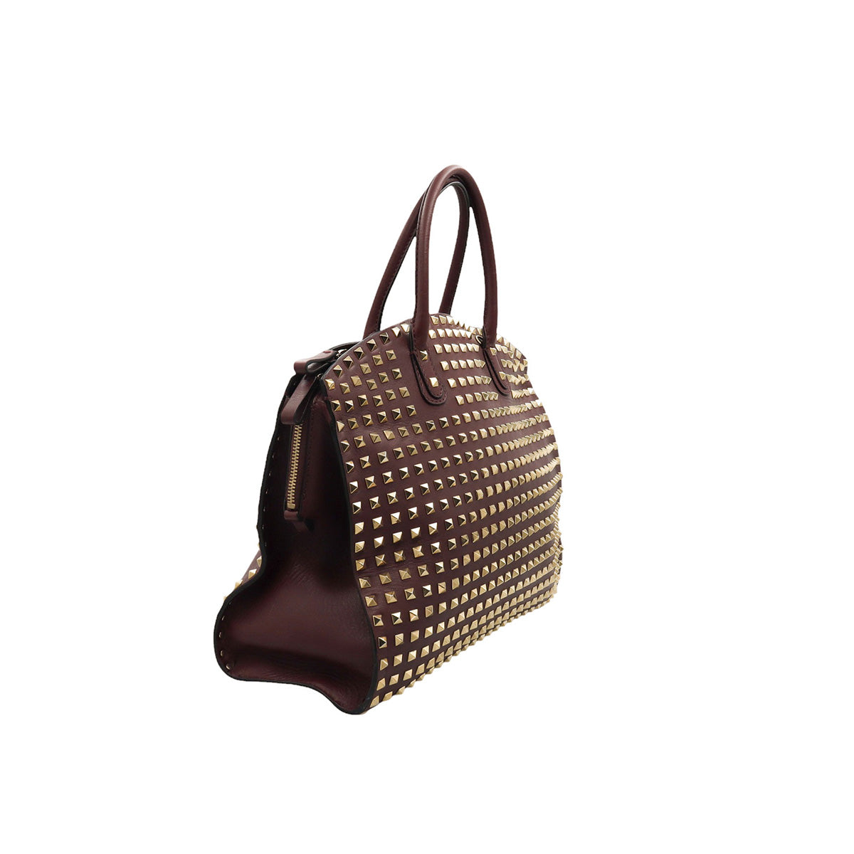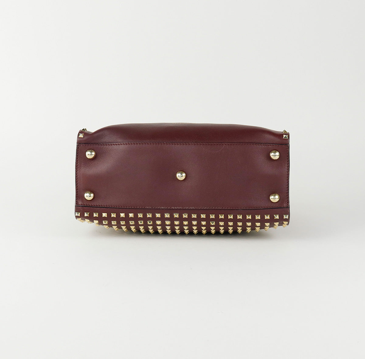 Bolso Valentino Garavani, modelo Rockstud Dome, confeccionado en piel de becerro color vino, con studs y herrajes en color dorado, forro interno en tela tipo yute color beige, con 2 asas rígidas y cierre superior tipo cremallera, con detalles por uso regular.