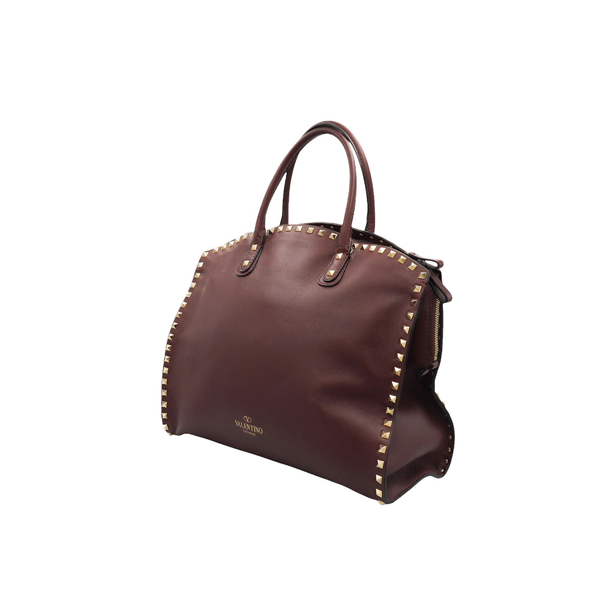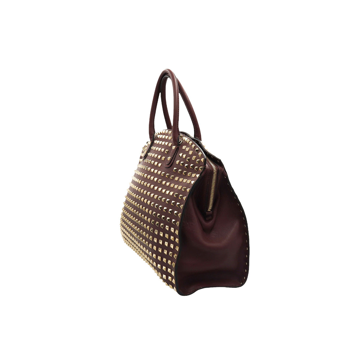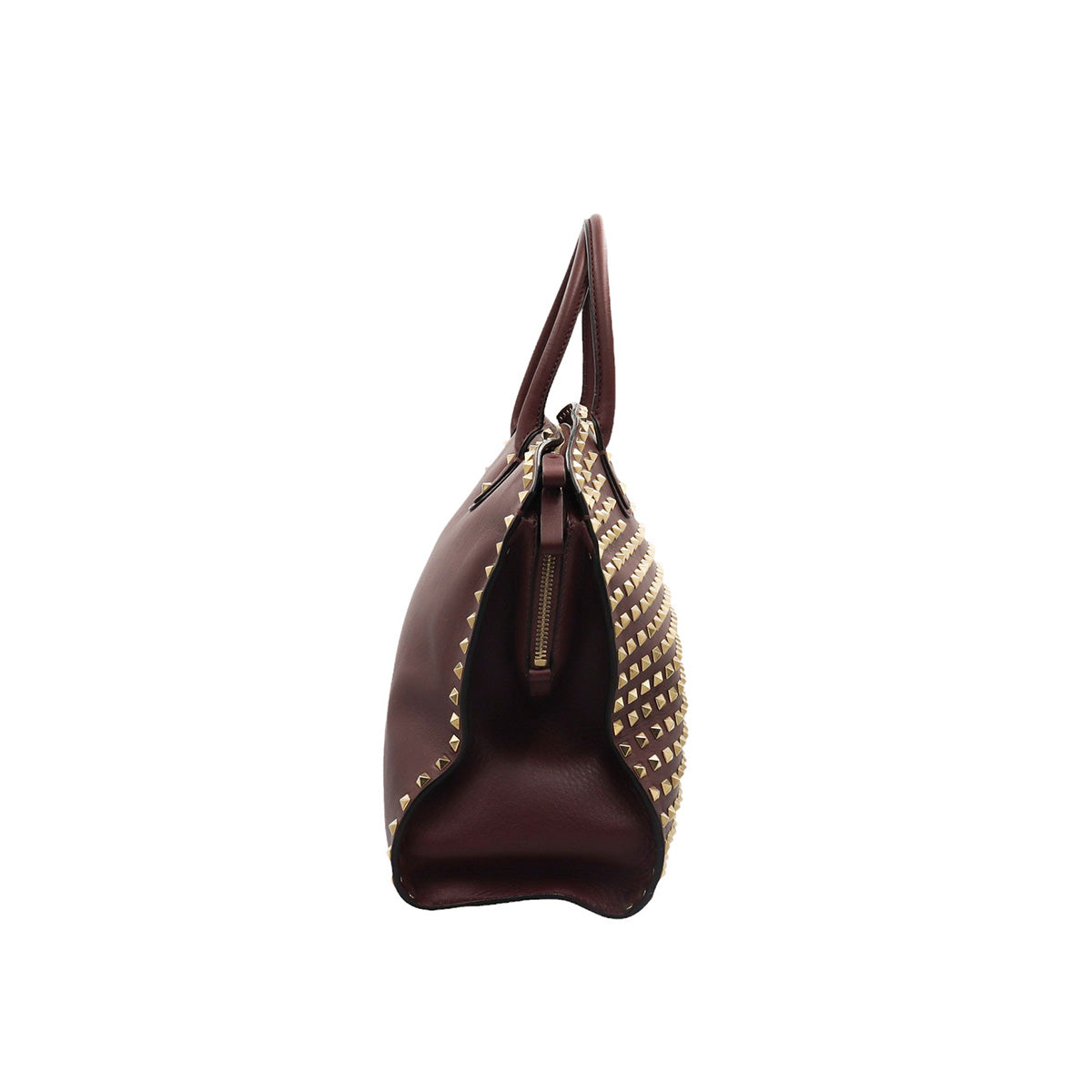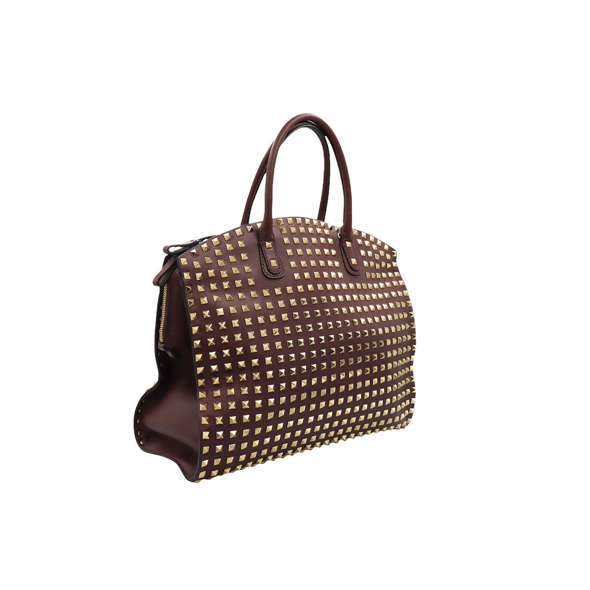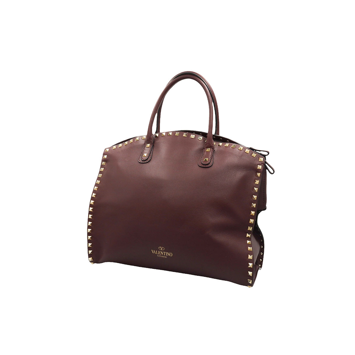 Bolso Valentino Garavani, modelo Rockstud Dome, confeccionado en piel de becerro color vino, con studs y herrajes en color dorado, forro interno en tela tipo yute color beige, con 2 asas rígidas y cierre superior tipo cremallera, con detalles por uso regular.