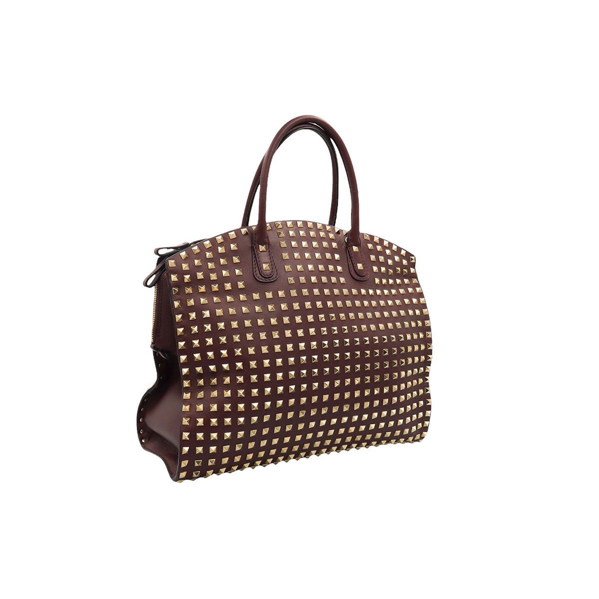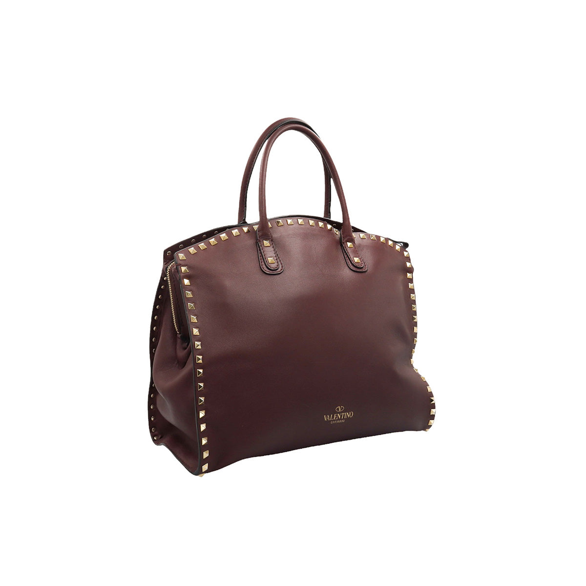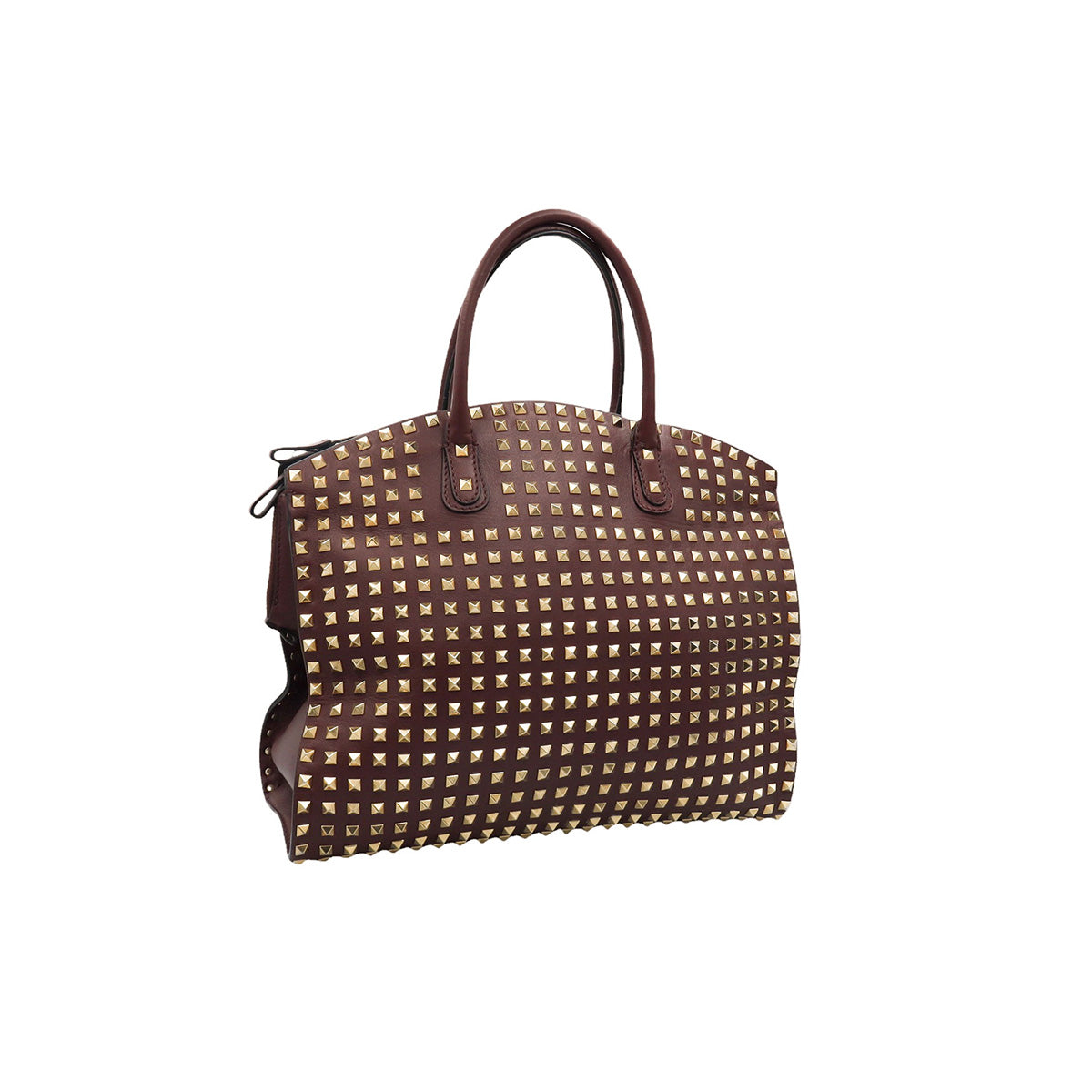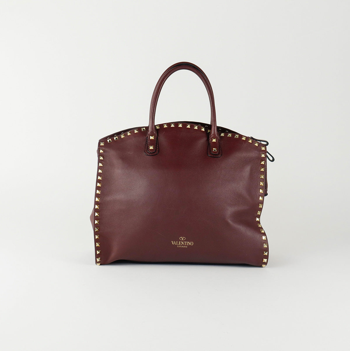 Bolso Valentino Garavani, modelo Rockstud Dome, confeccionado en piel de becerro color vino, con studs y herrajes en color dorado, forro interno en tela tipo yute color beige, con 2 asas rígidas y cierre superior tipo cremallera, con detalles por uso regular.