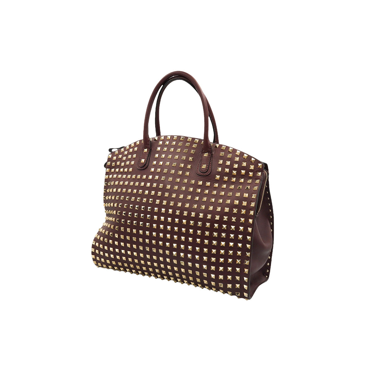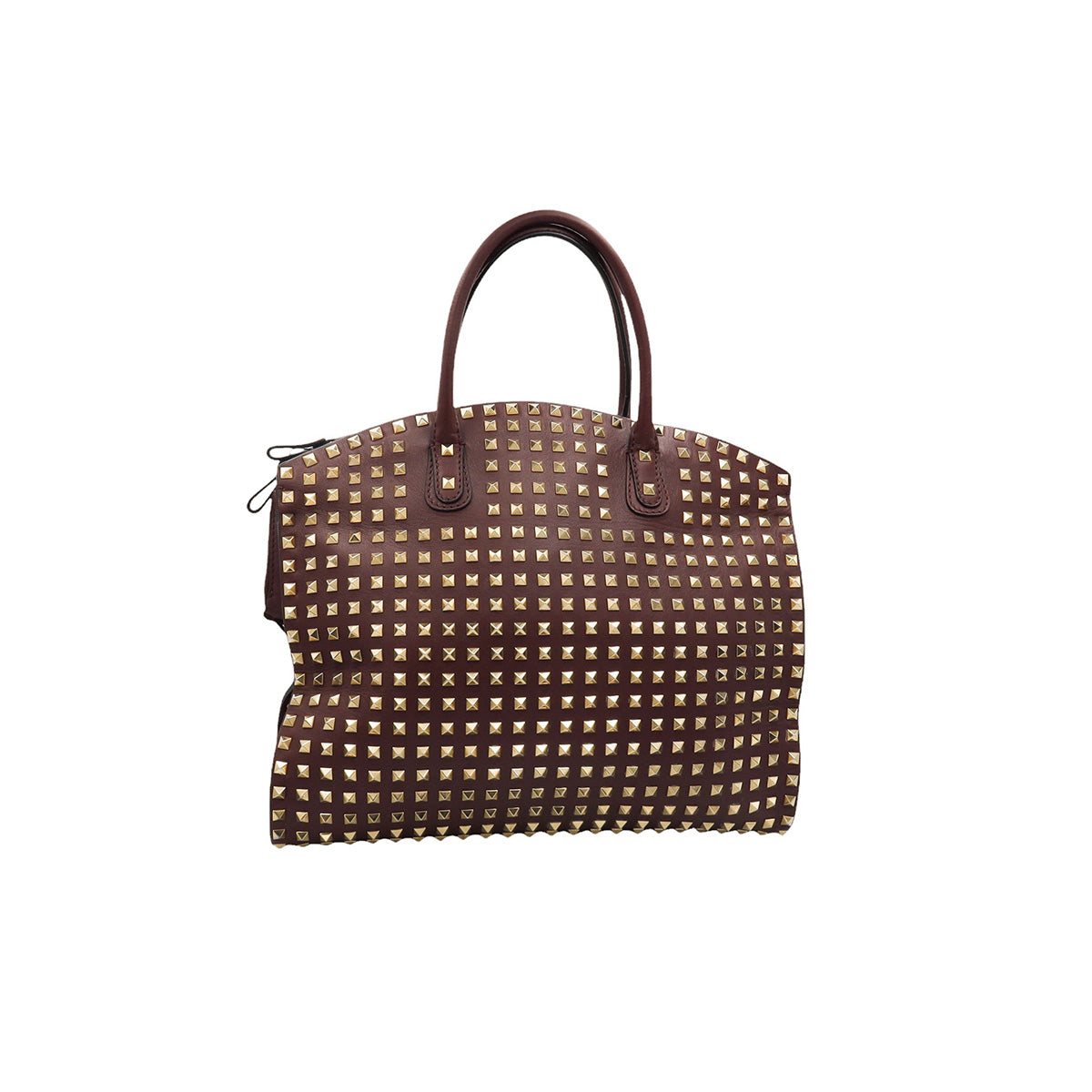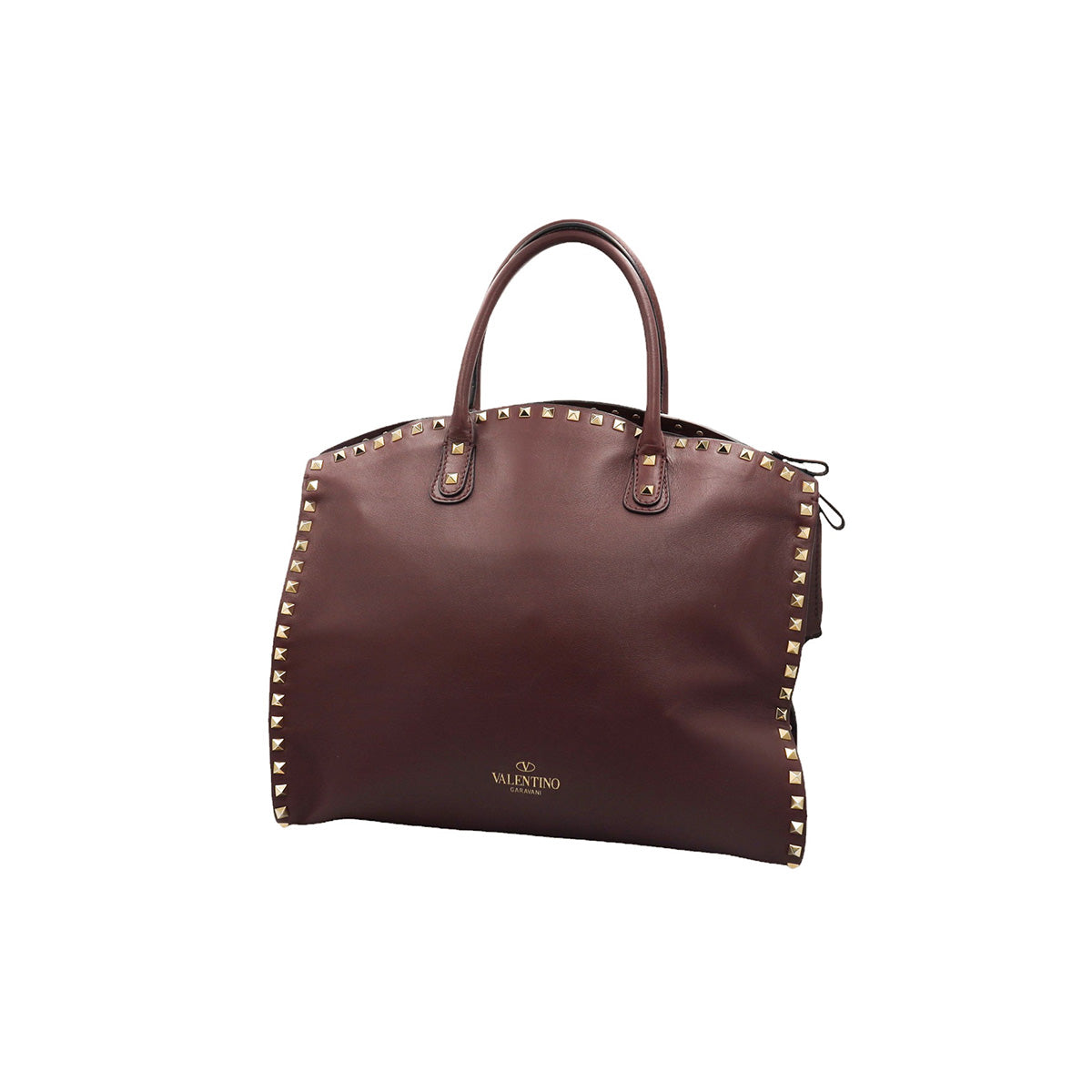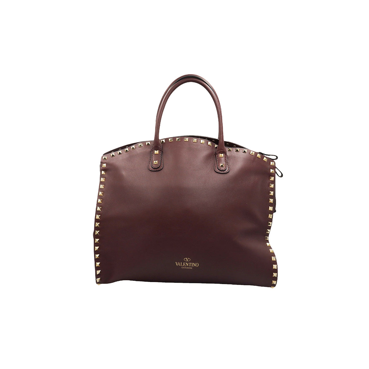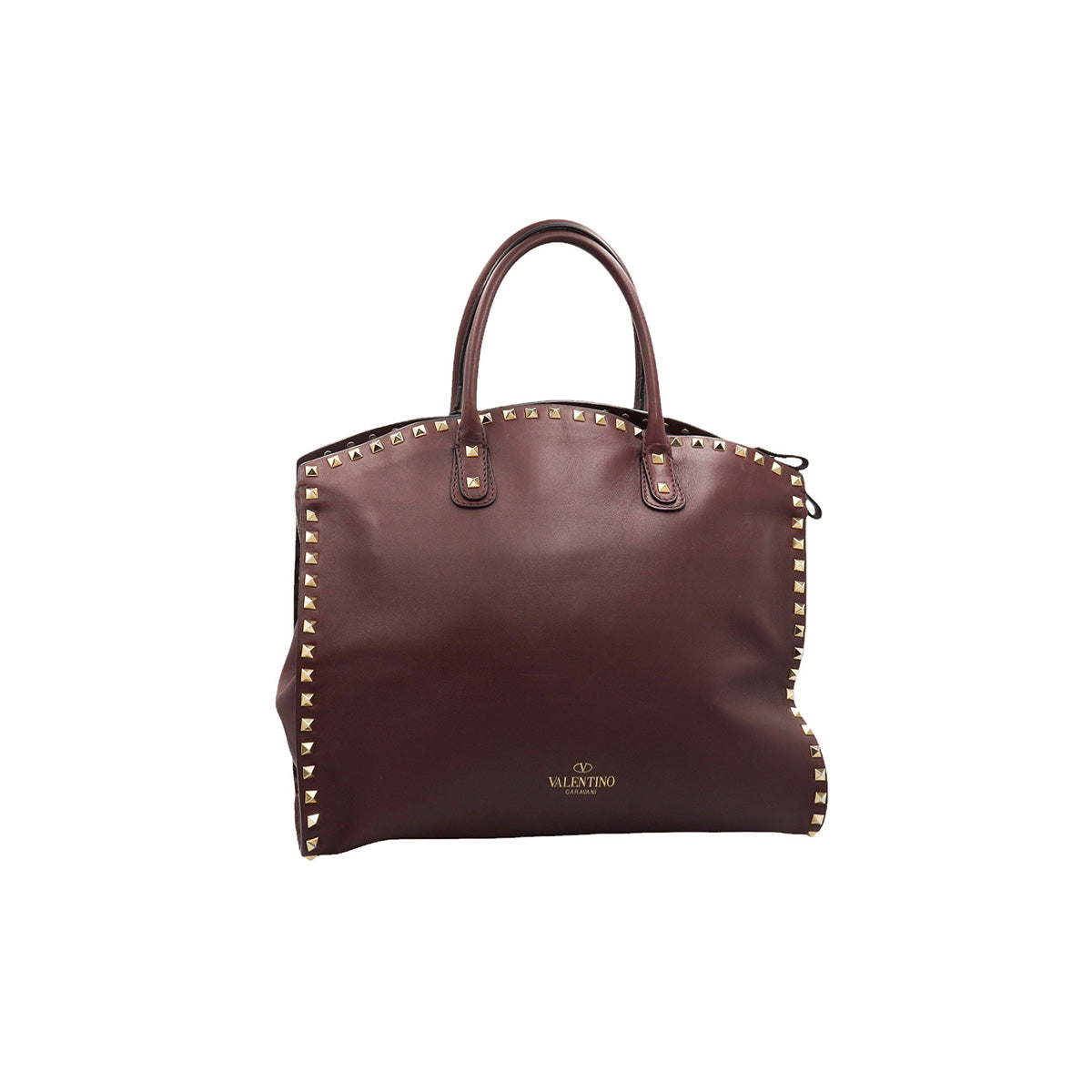Bolso Valentino Garavani, modelo Rockstud Dome, confeccionado en piel de becerro color vino, con studs y herrajes en color dorado, forro interno en tela tipo yute color beige, con 2 asas rígidas y cierre superior tipo cremallera, con detalles por uso regular.