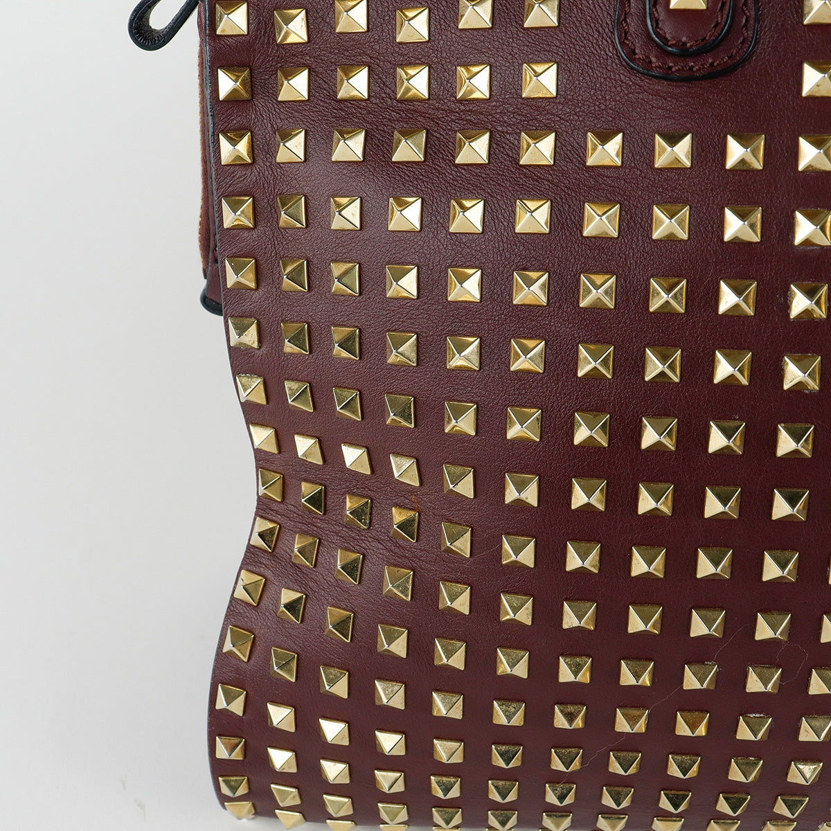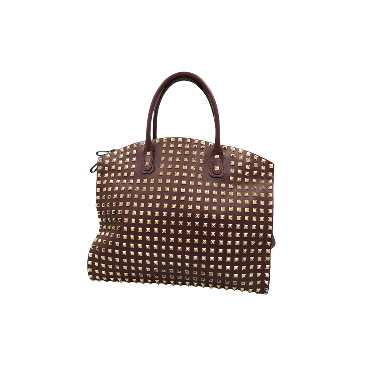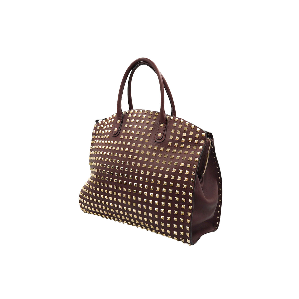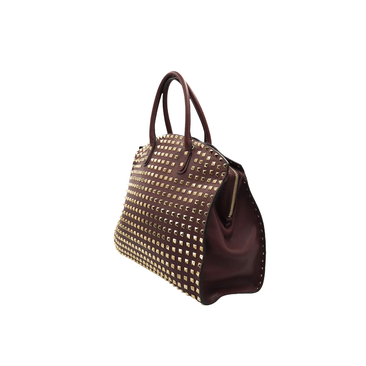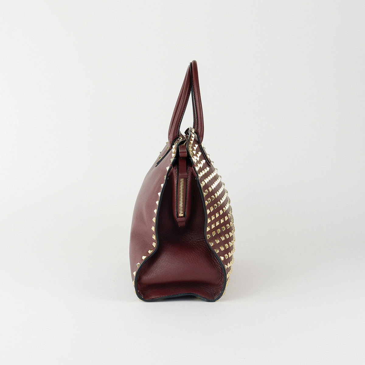 Bolso Valentino Garavani, modelo Rockstud Dome, confeccionado en piel de becerro color vino, con studs y herrajes en color dorado, forro interno en tela tipo yute color beige, con 2 asas rígidas y cierre superior tipo cremallera, con detalles por uso regular.