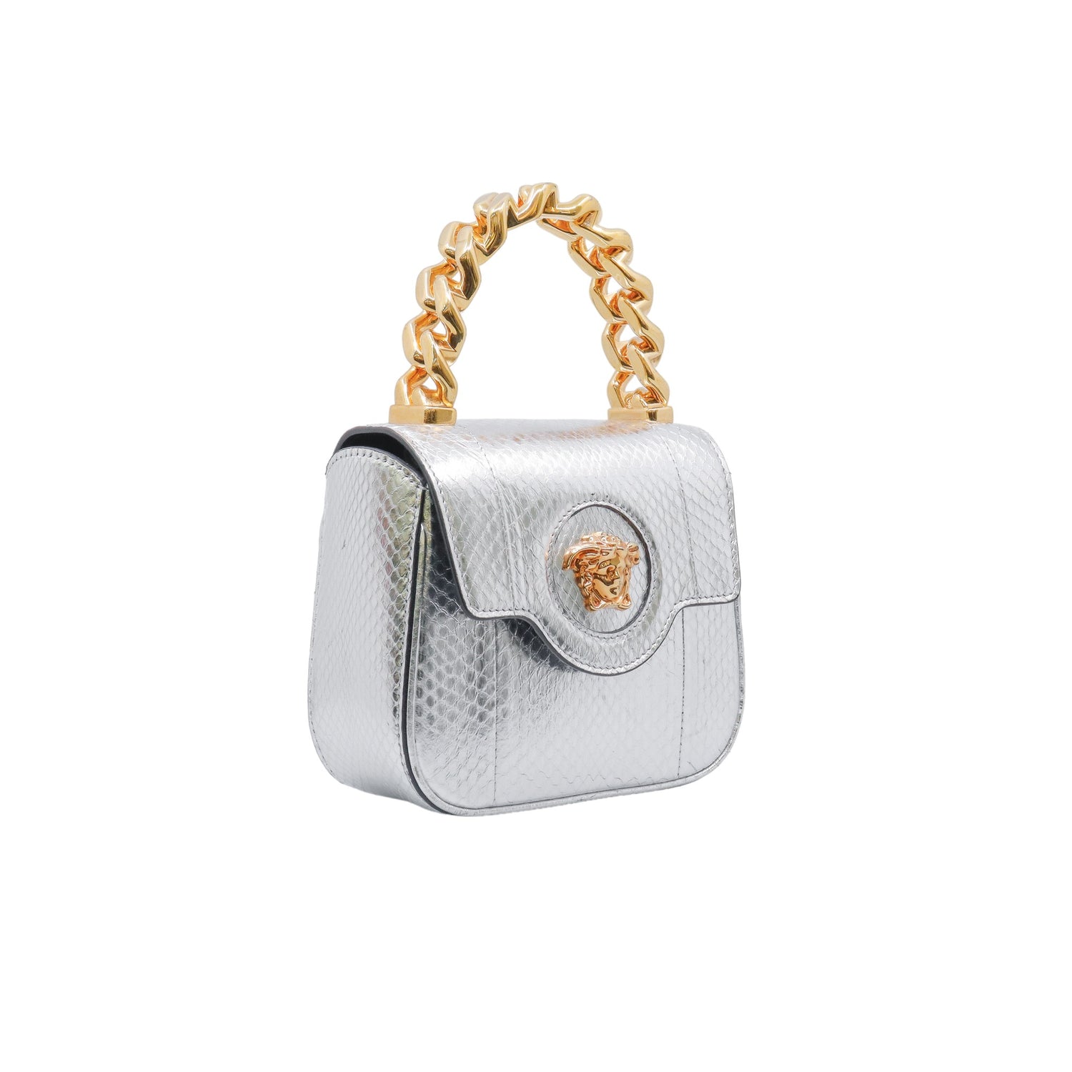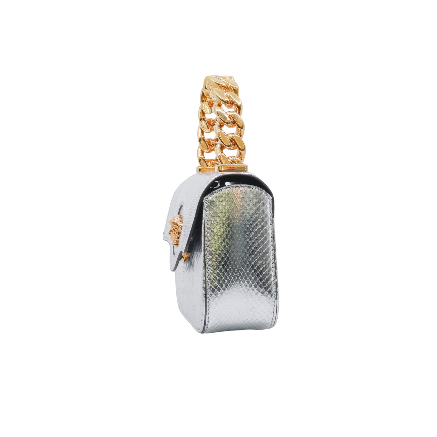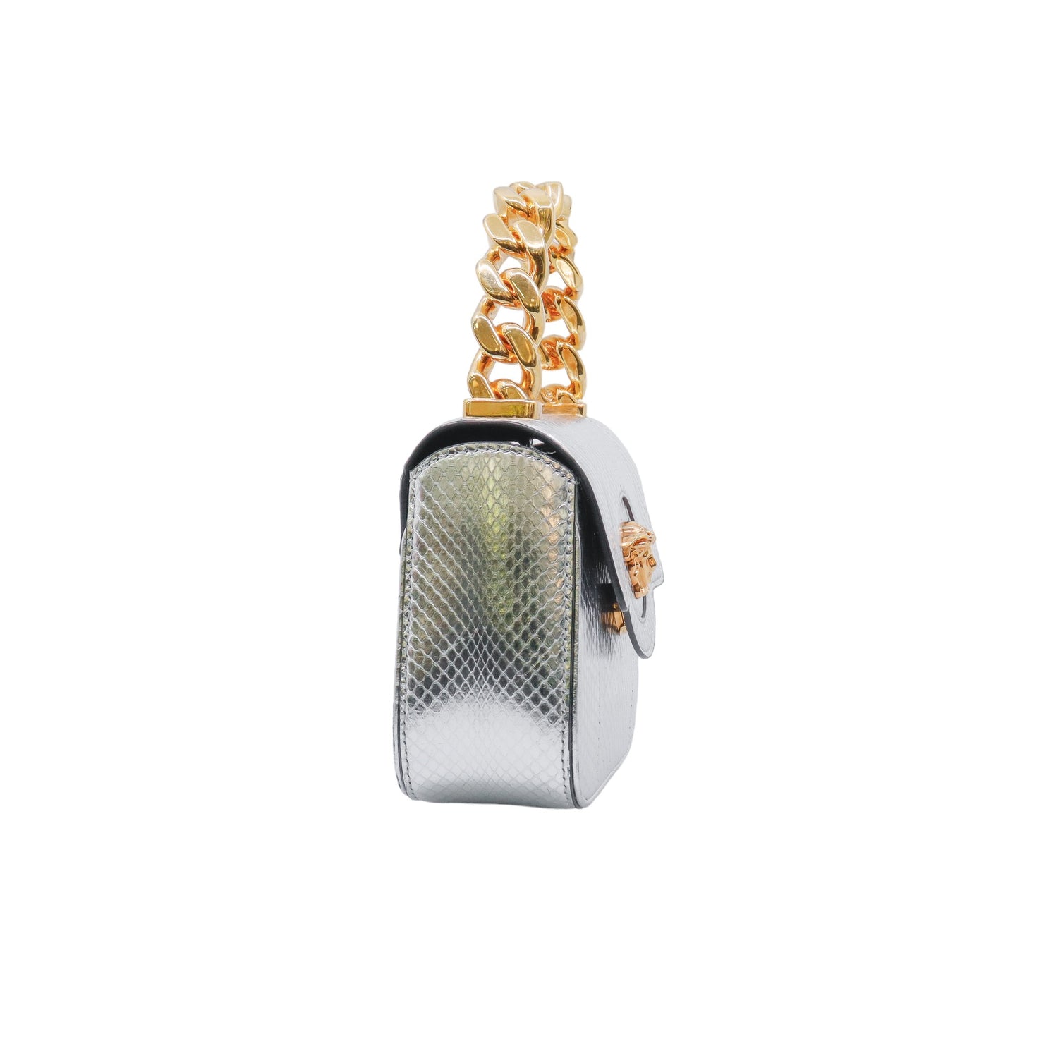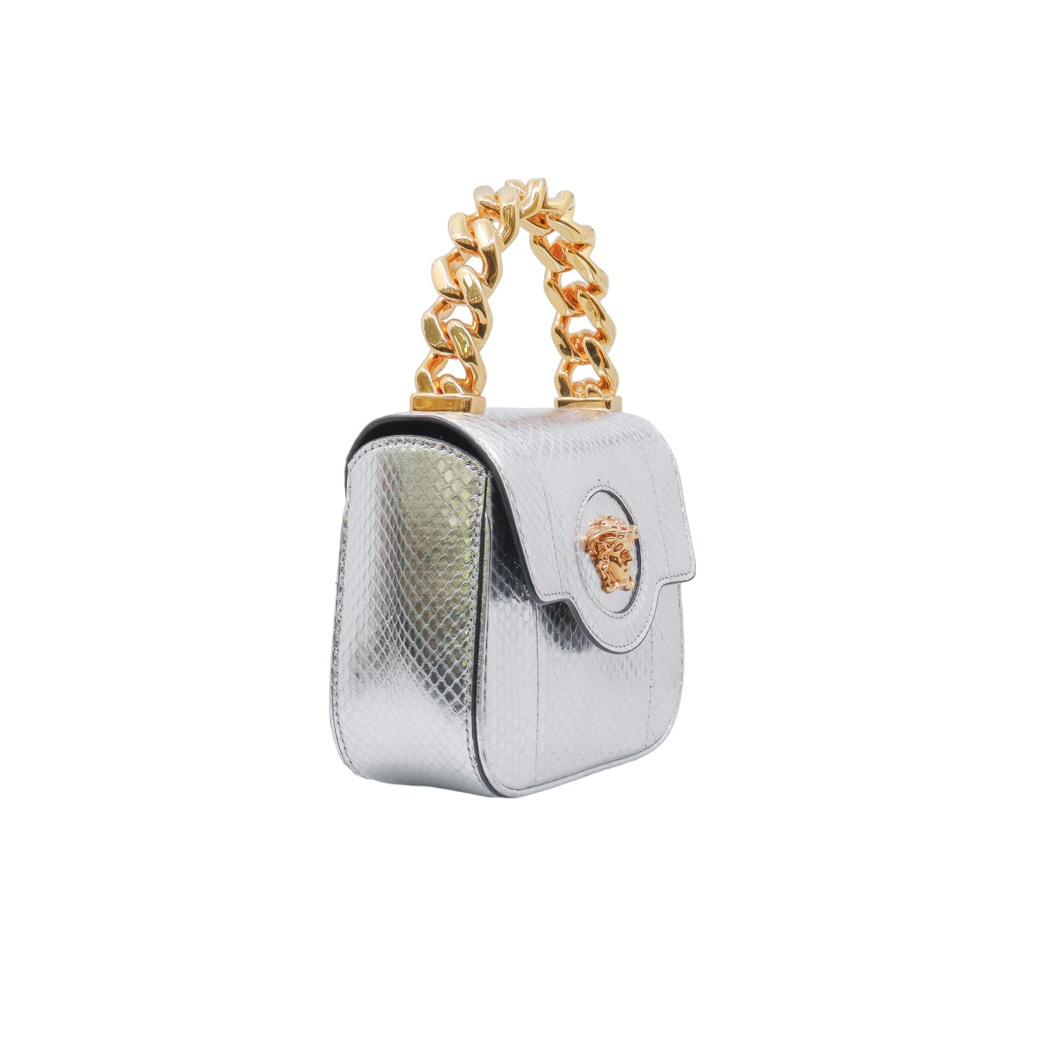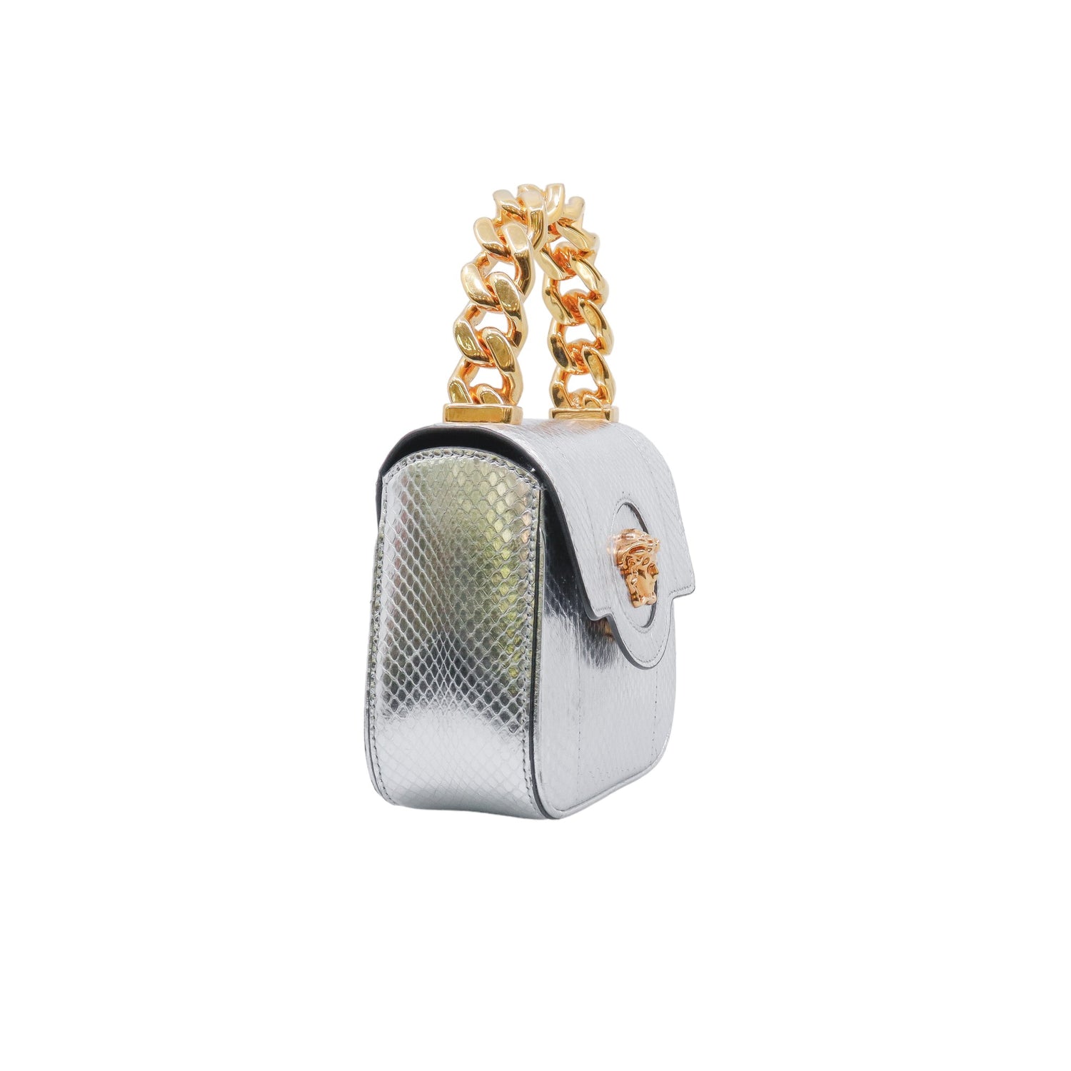 Mini Bolso Versace de la colección La Medusa, confeccionado en piel color plata, con asa rígida y herrajes en color dorado, no cuenta con strap.
