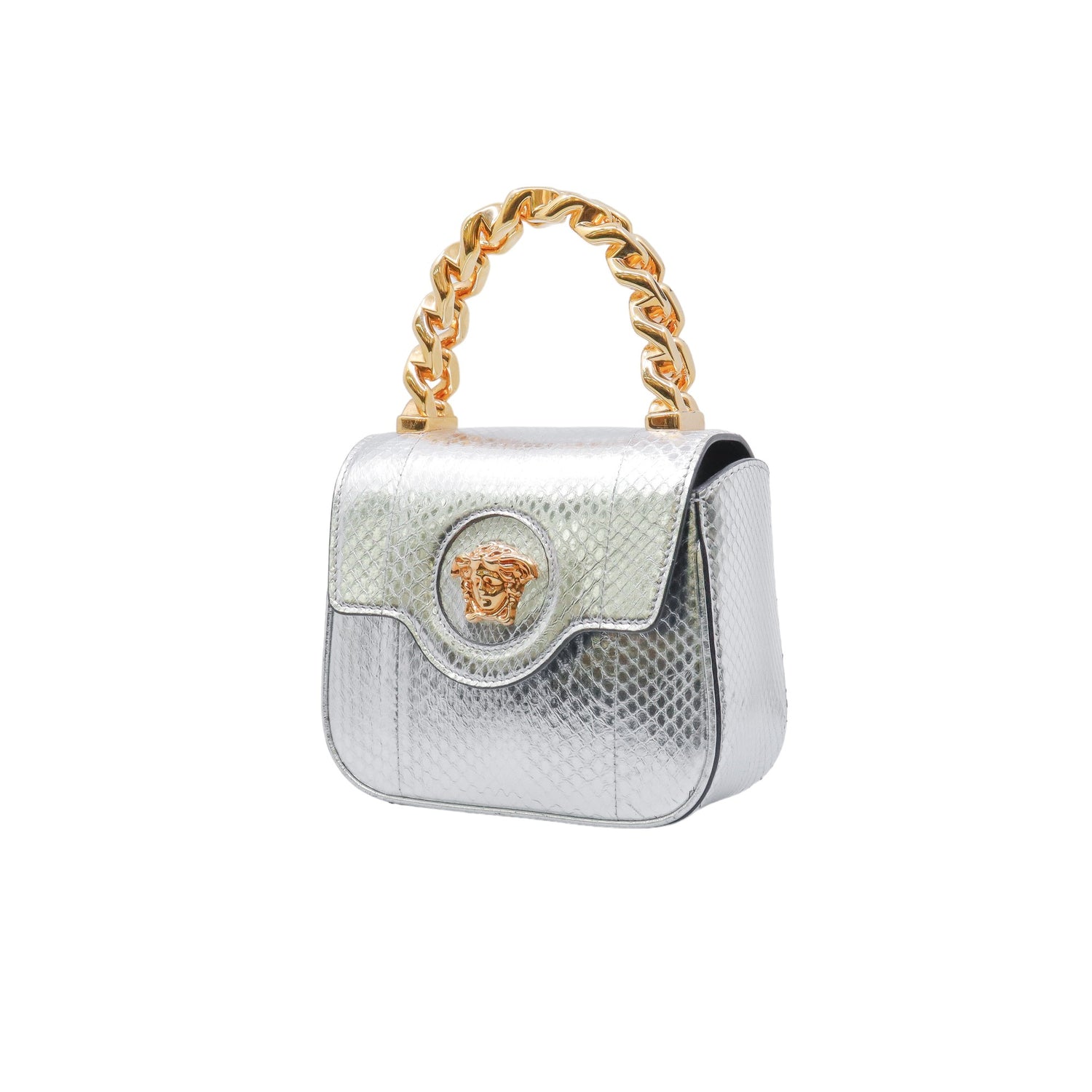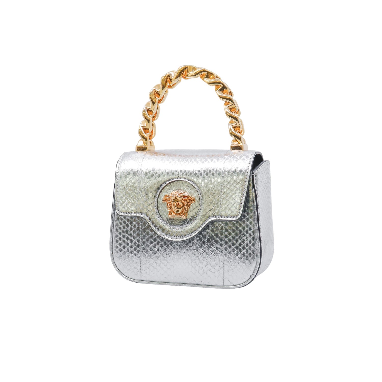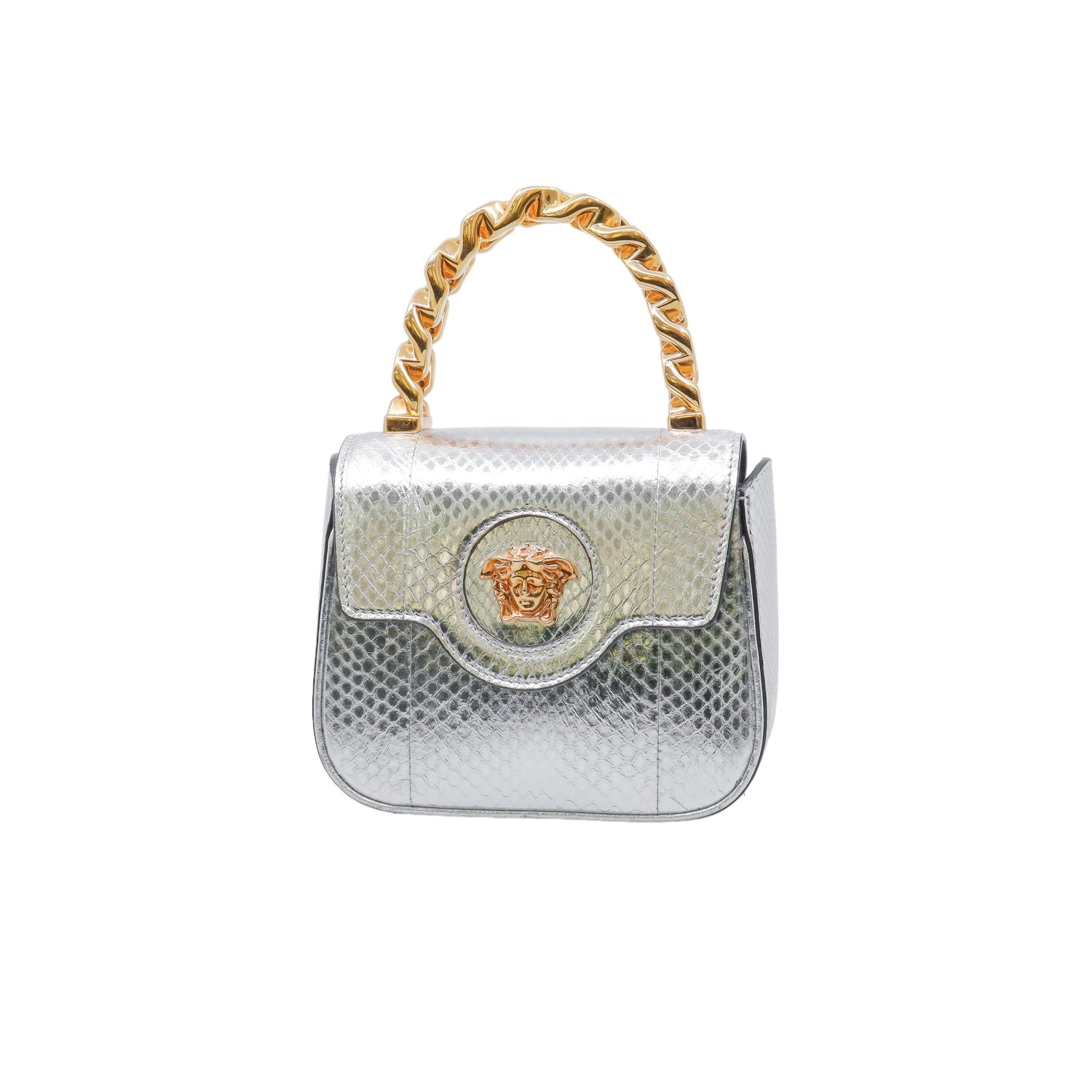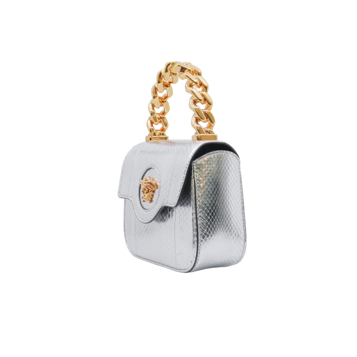 Mini Bolso Versace de la colección La Medusa, confeccionado en piel color plata, con asa rígida y herrajes en color dorado, no cuenta con strap.