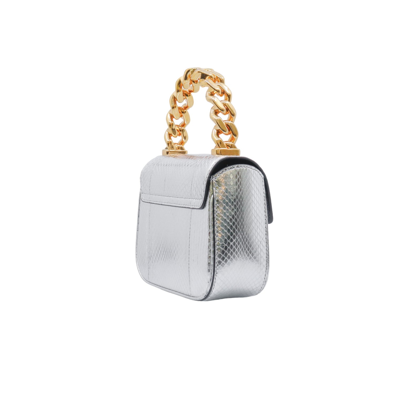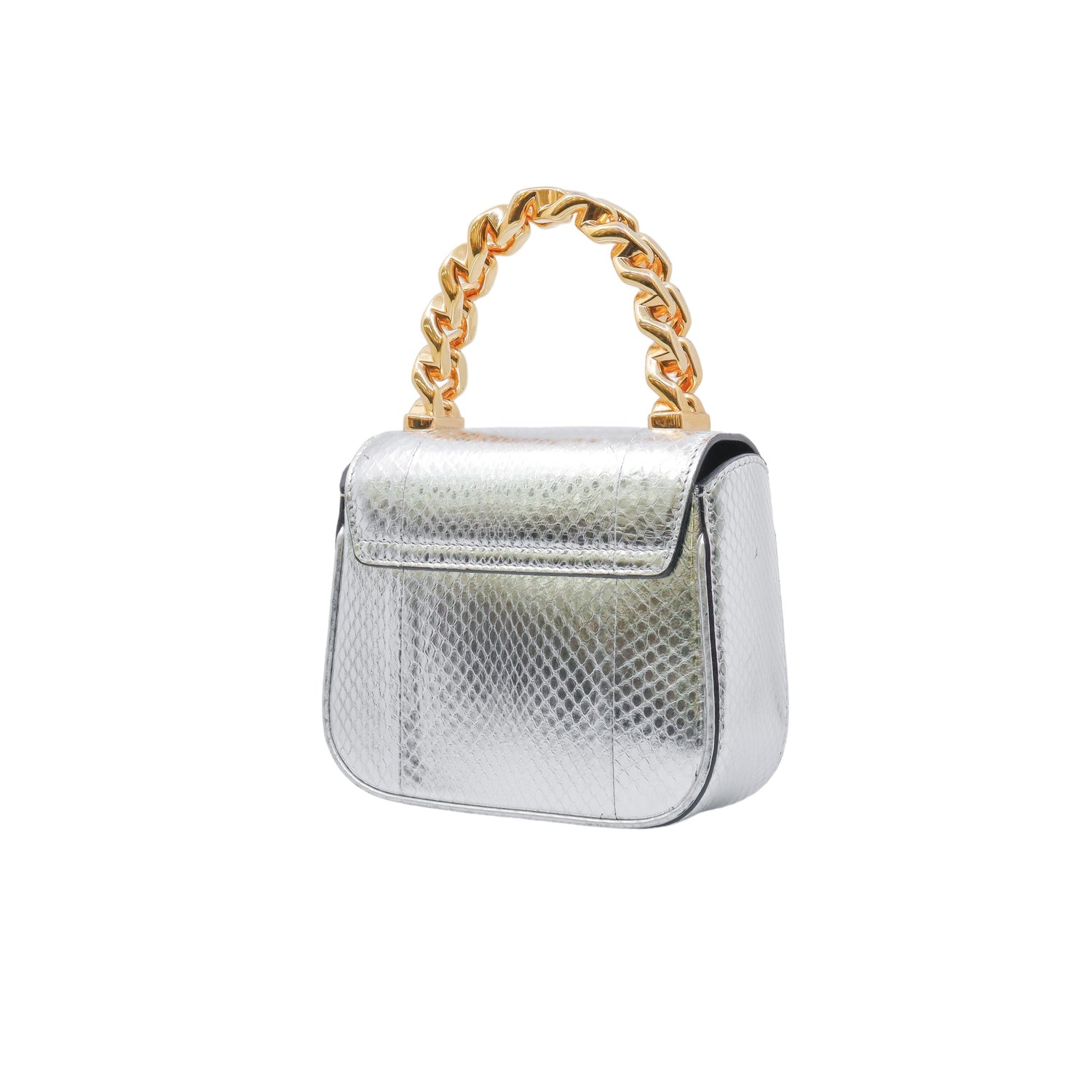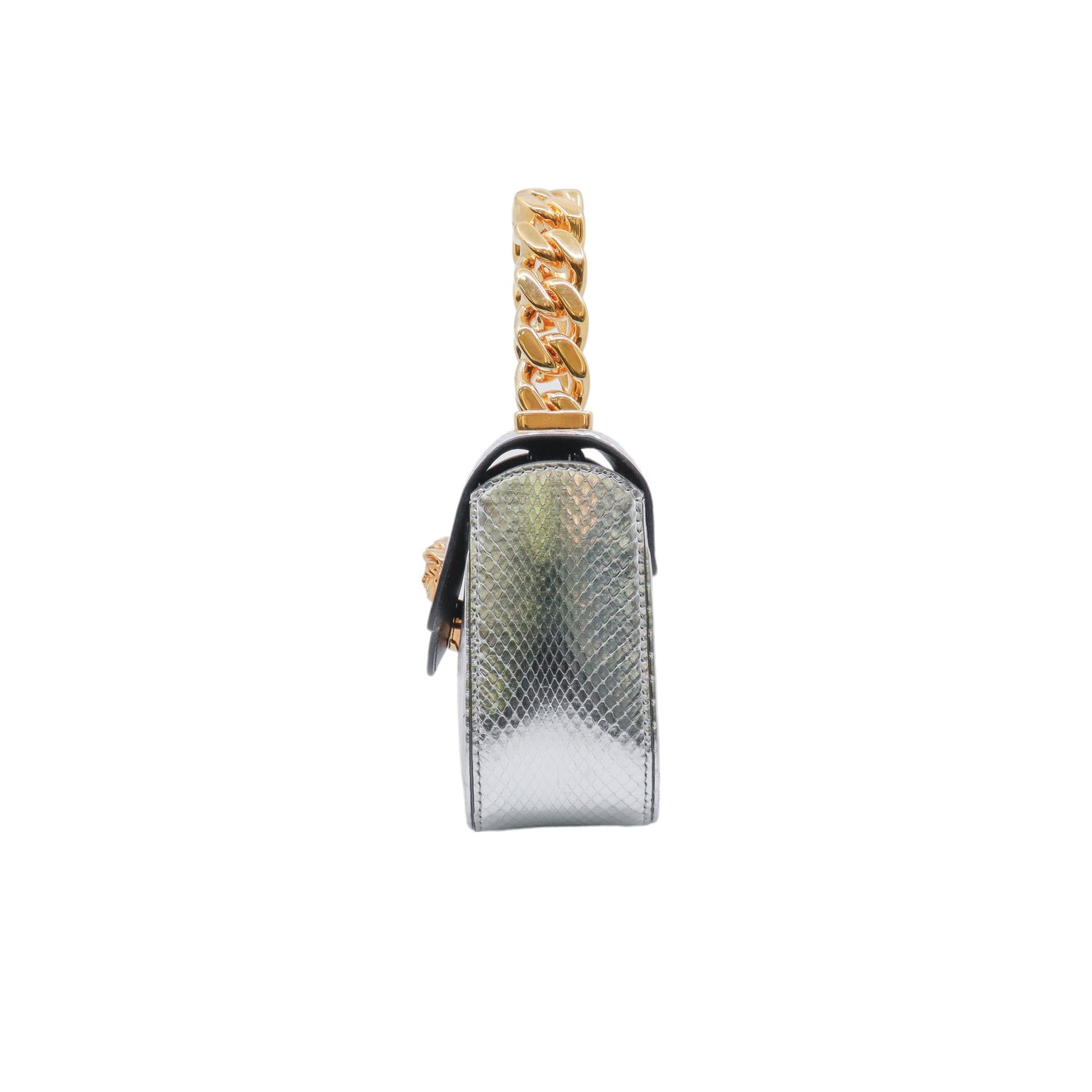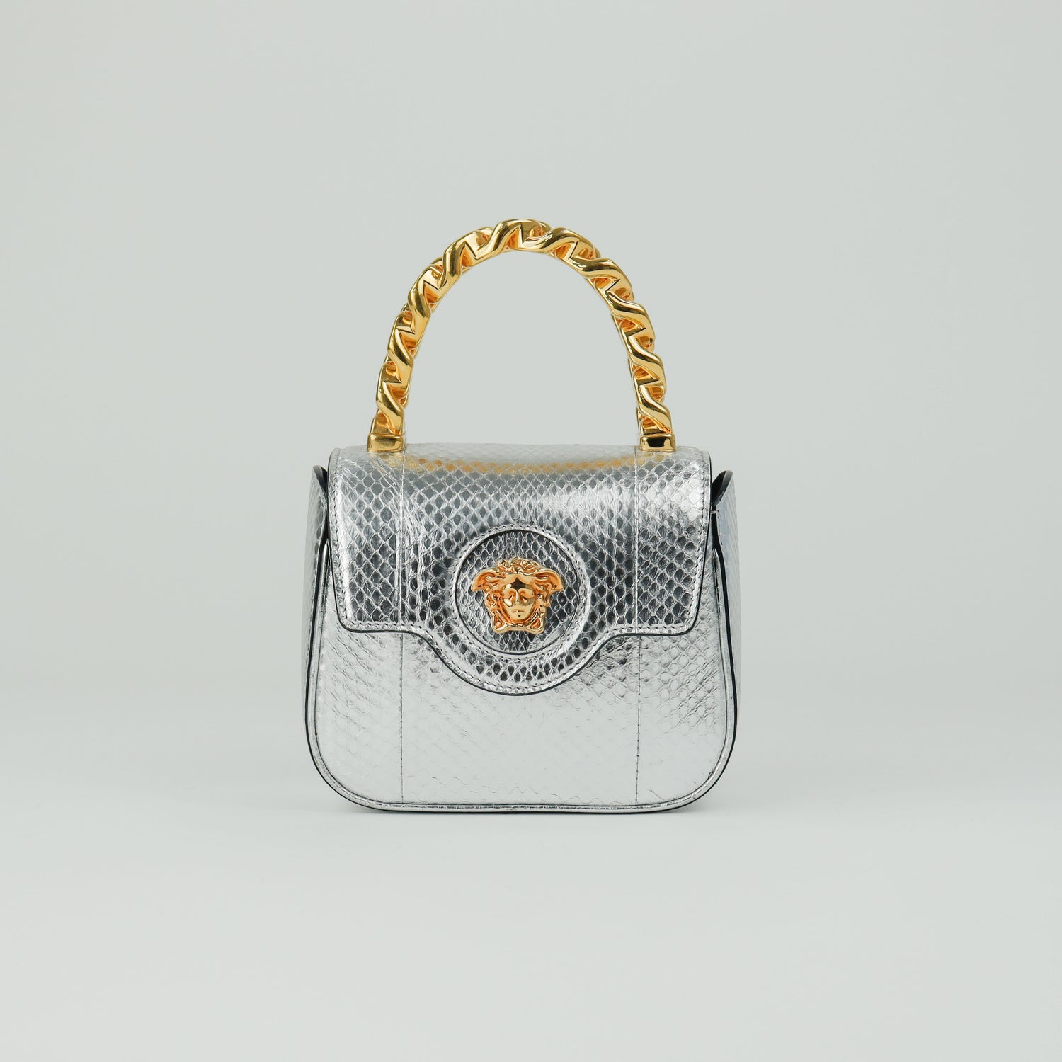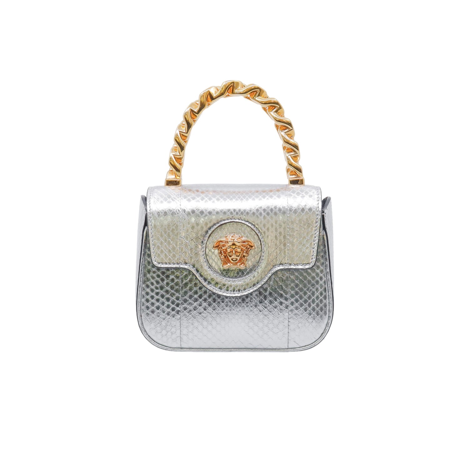 Mini Bolso Versace de la colección La Medusa, confeccionado en piel color plata, con asa rígida y herrajes en color dorado, no cuenta con strap.