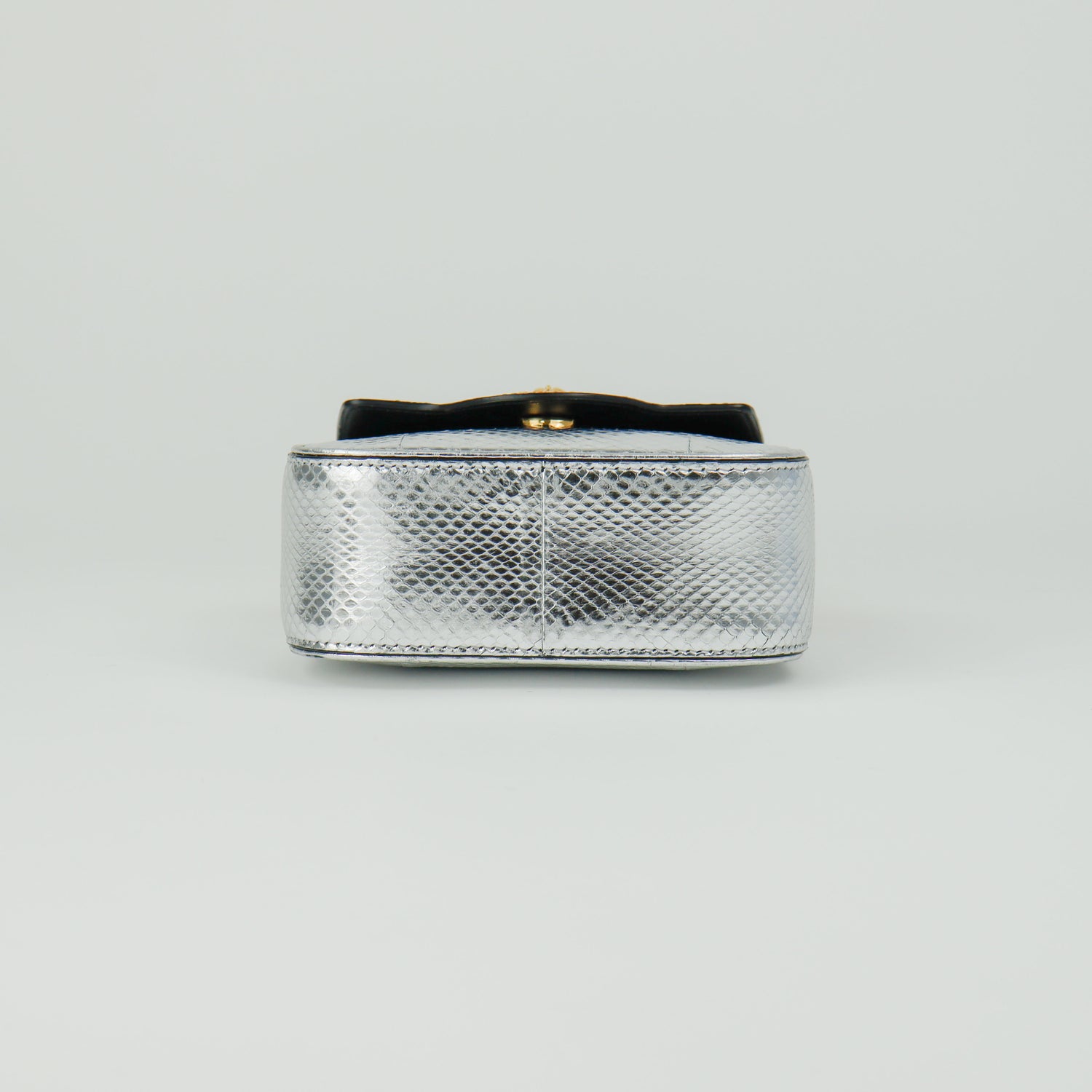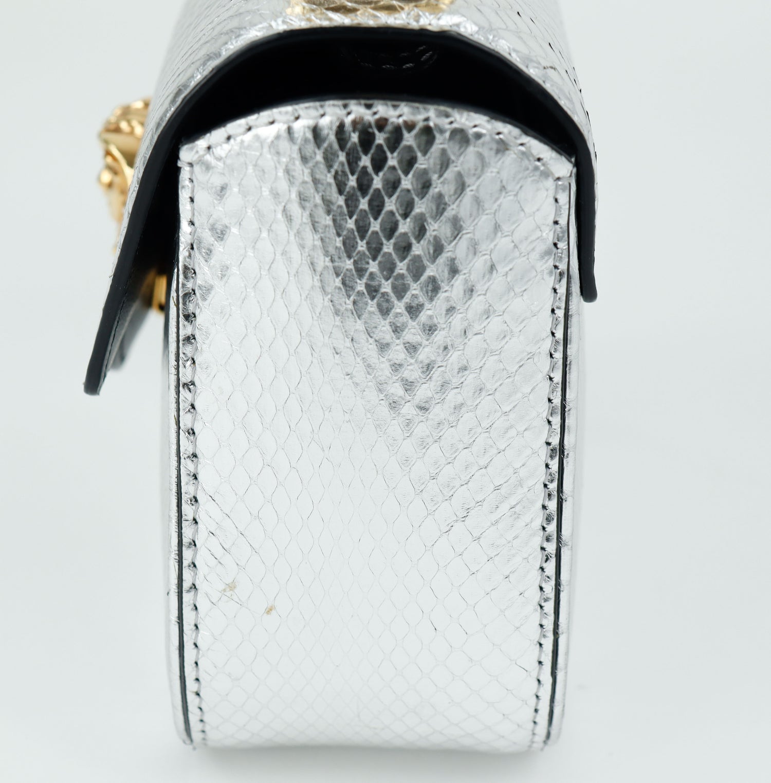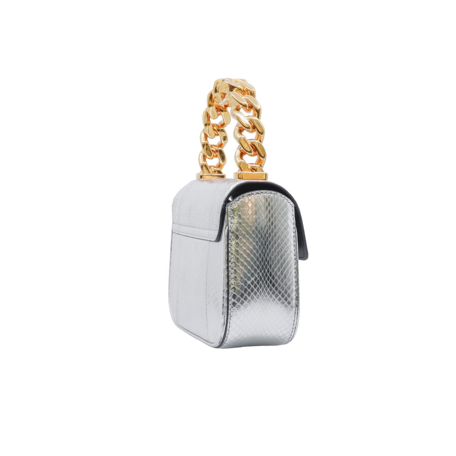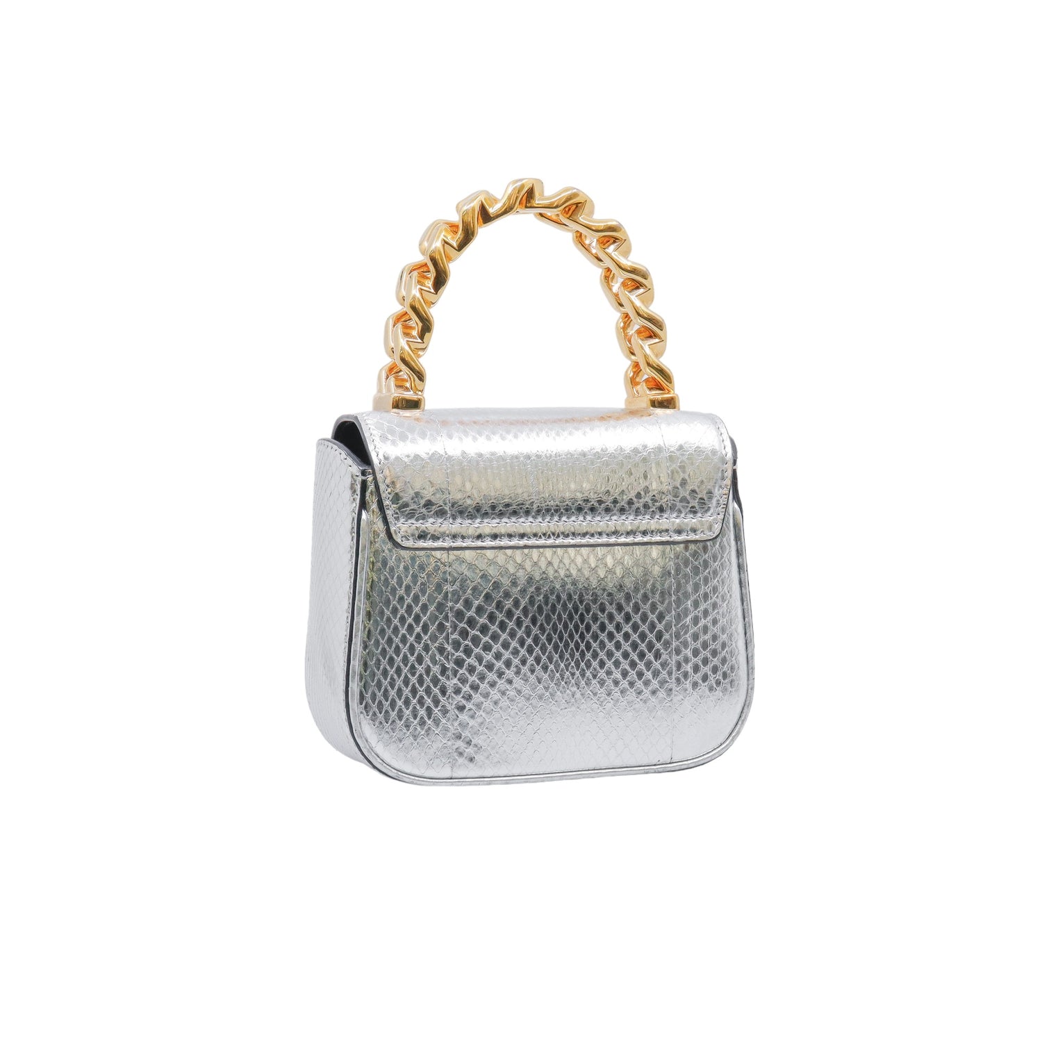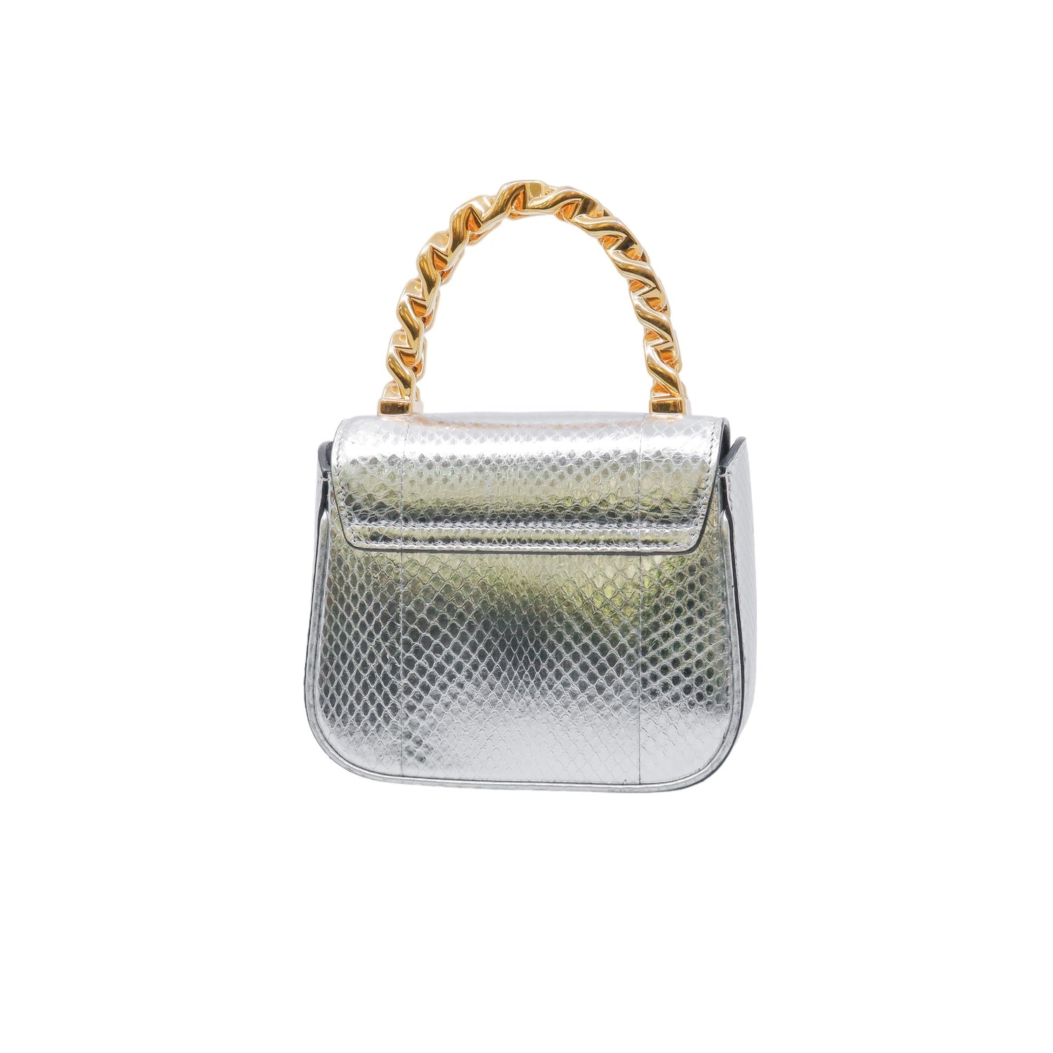 Mini Bolso Versace de la colección La Medusa, confeccionado en piel color plata, con asa rígida y herrajes en color dorado, no cuenta con strap.