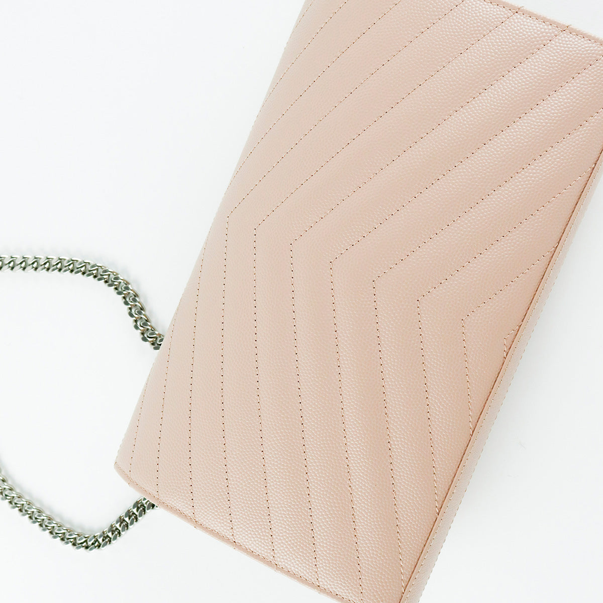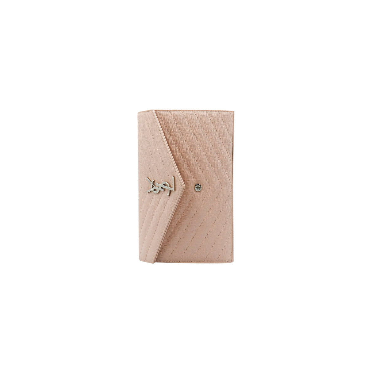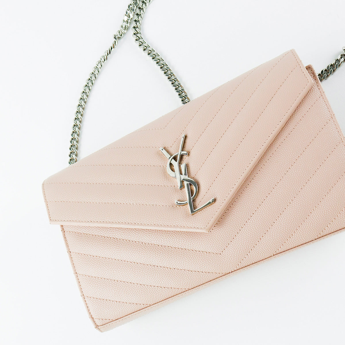 Bolso con cadena de la marca Yves Saint Laurent, línea Cassandre, confeccionado en piel color nude, con bolsillo interno con cremallera y compartimento para tarjetas, herrajes y siglas en la solapa en color plata.