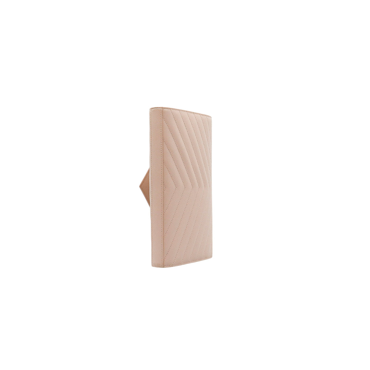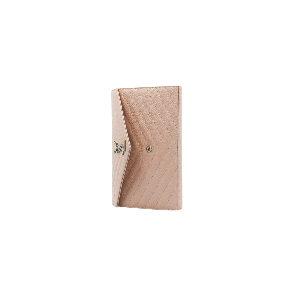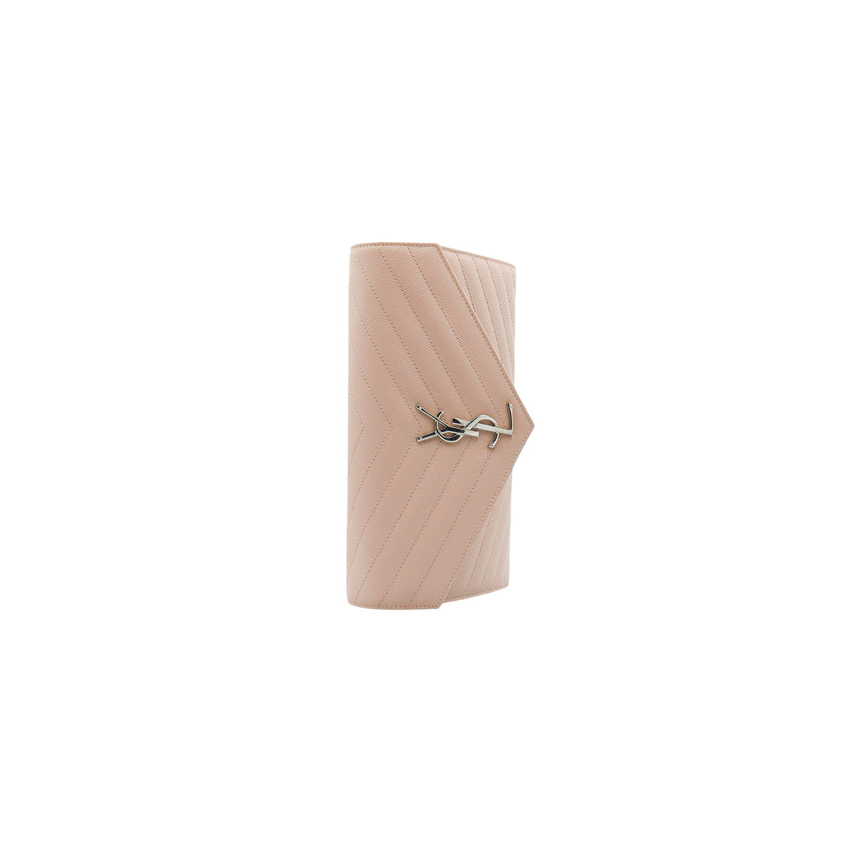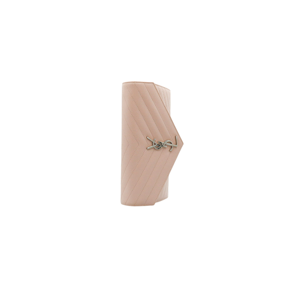 Bolso con cadena de la marca Yves Saint Laurent, línea Cassandre, confeccionado en piel color nude, con bolsillo interno con cremallera y compartimento para tarjetas, herrajes y siglas en la solapa en color plata.