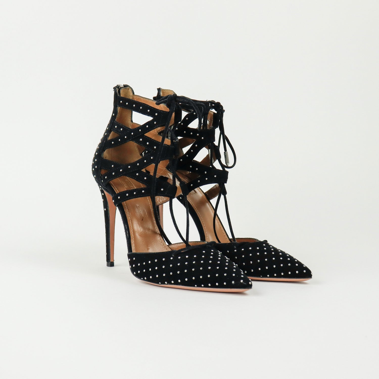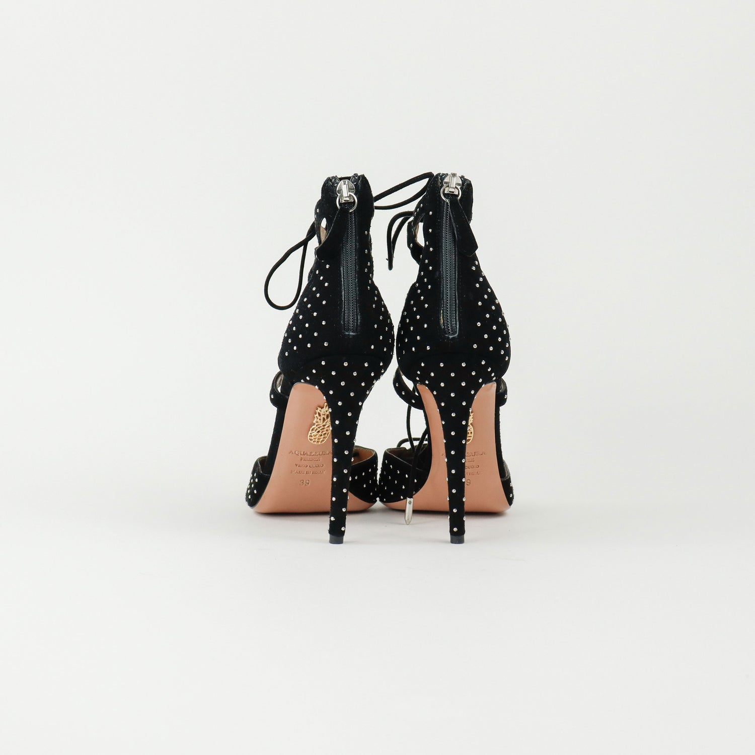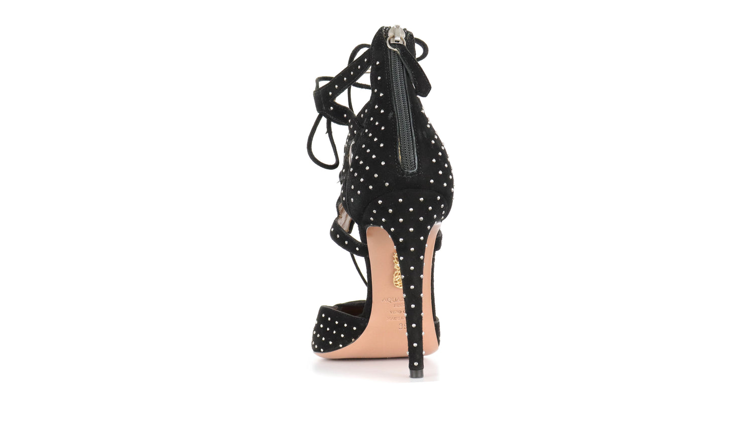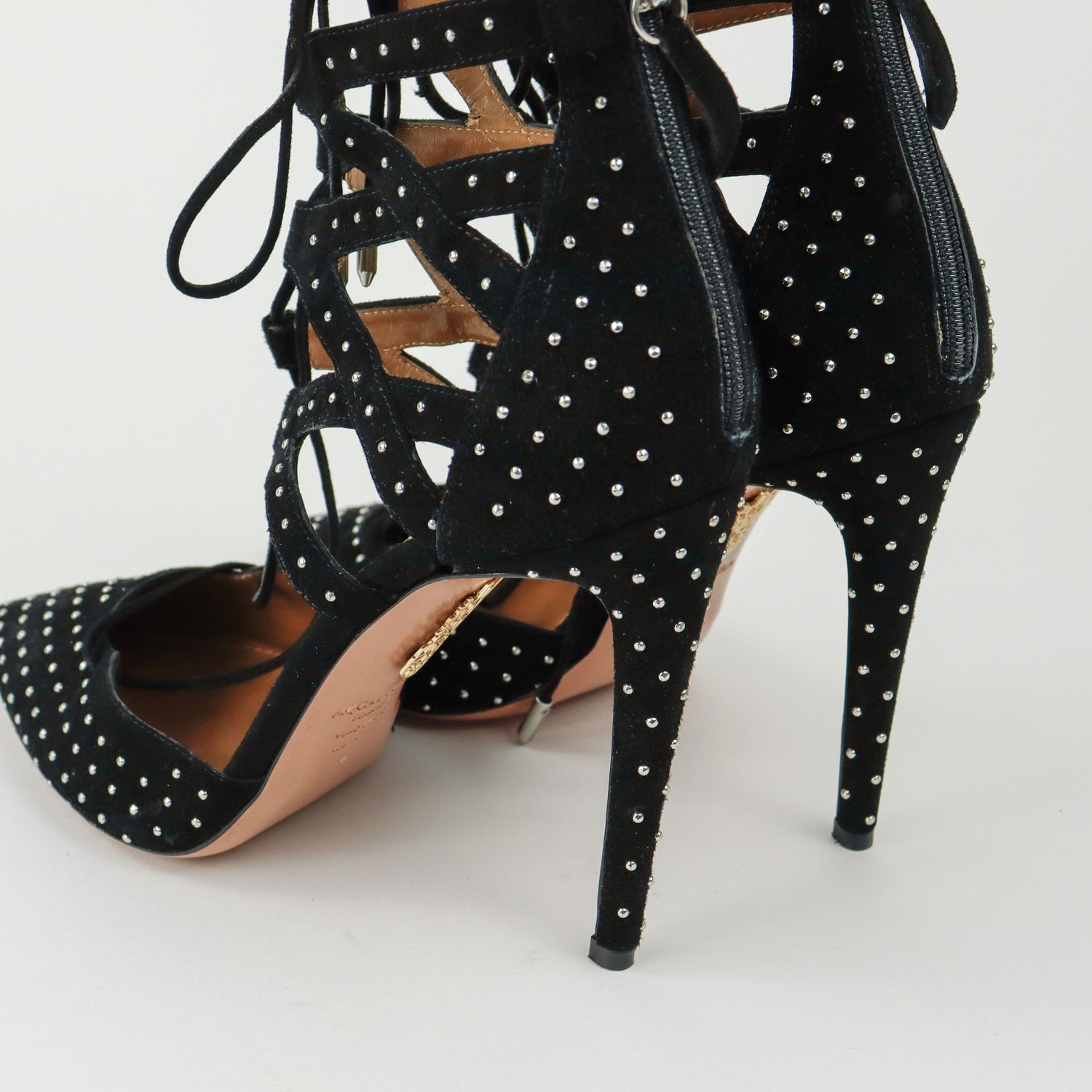 Tacones marca Aquazzura fabricados en gamuza color negro, con detalles de estoperol en toda la superficie, puntera en V cerrada, cierre de cremallera ajustable en la parte de la plantilla y en la parte frontal ajustables con agujeta.
