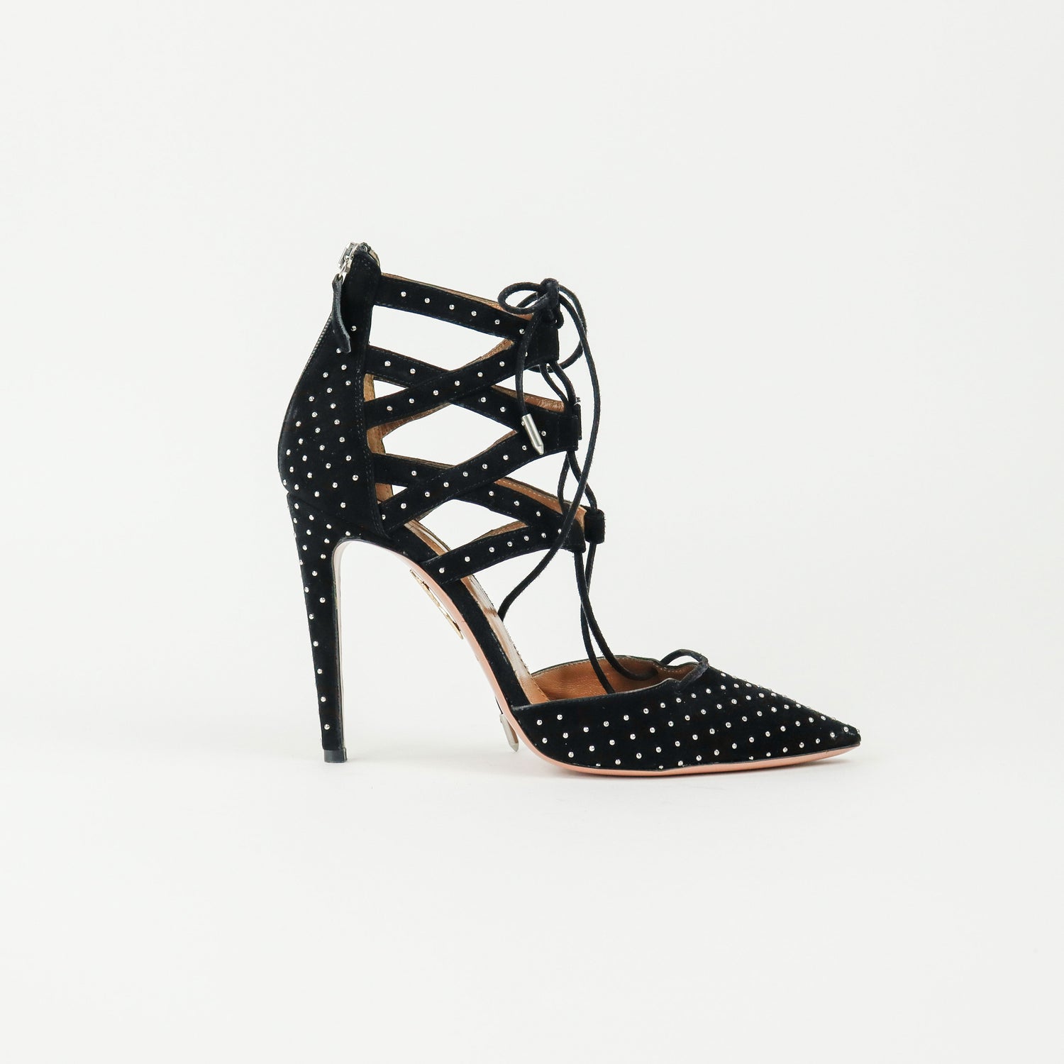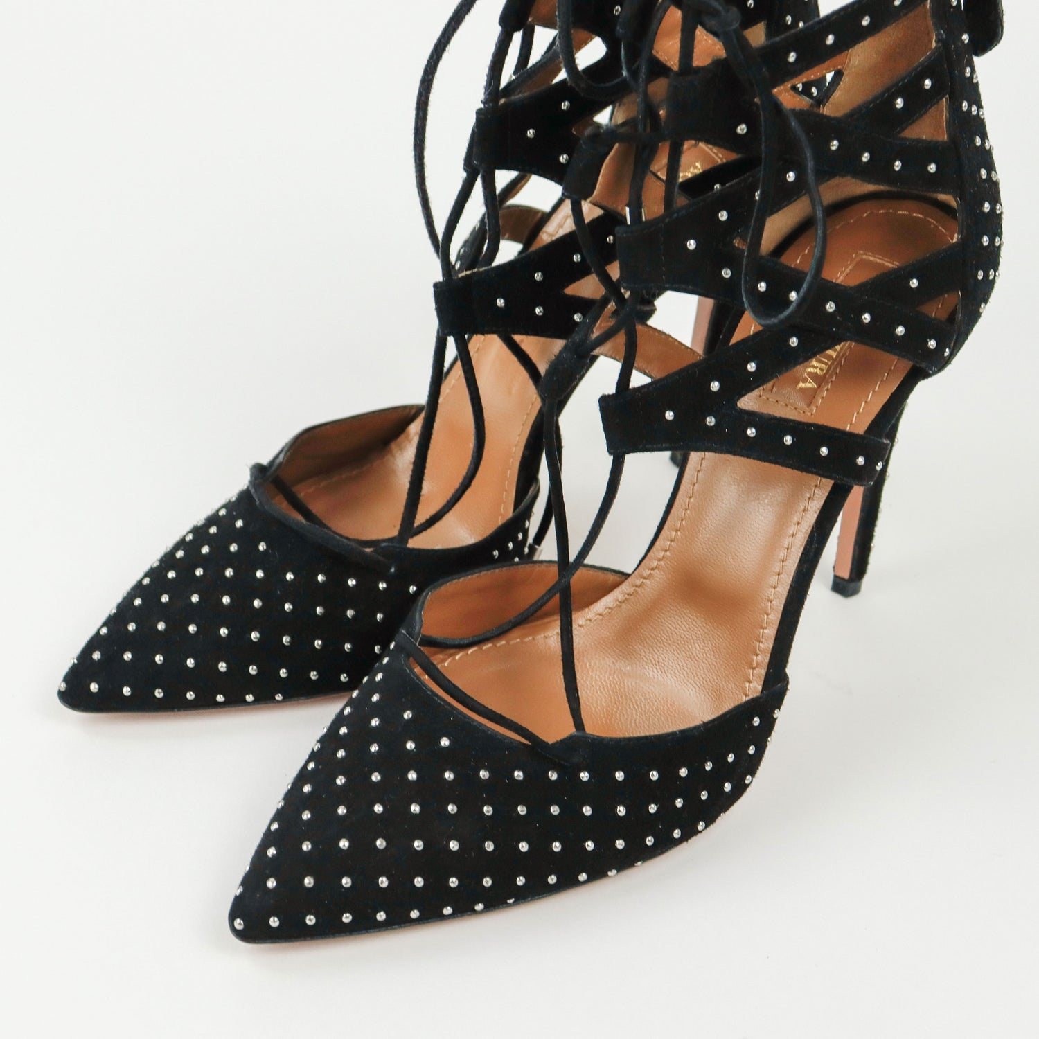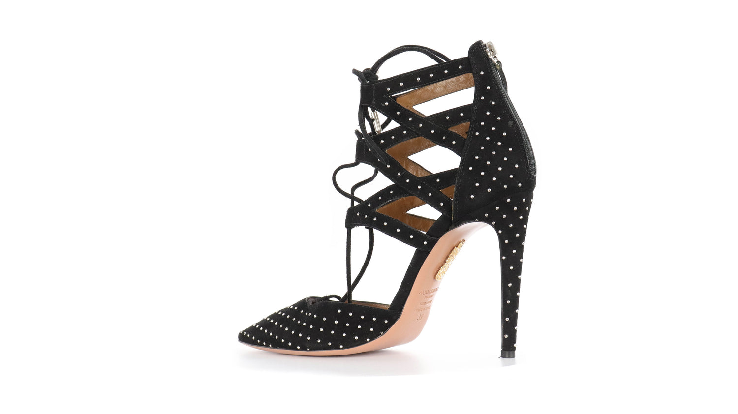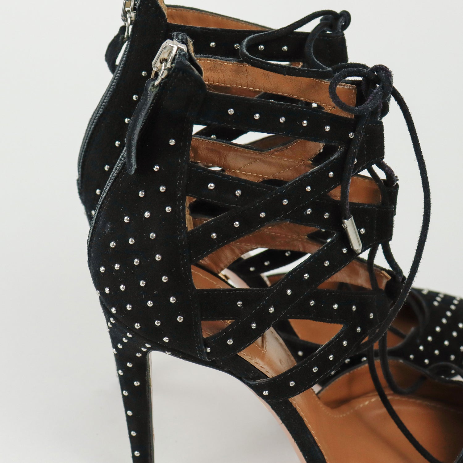 Tacones marca Aquazzura fabricados en gamuza color negro, con detalles de estoperol en toda la superficie, puntera en V cerrada, cierre de cremallera ajustable en la parte de la plantilla y en la parte frontal ajustables con agujeta.