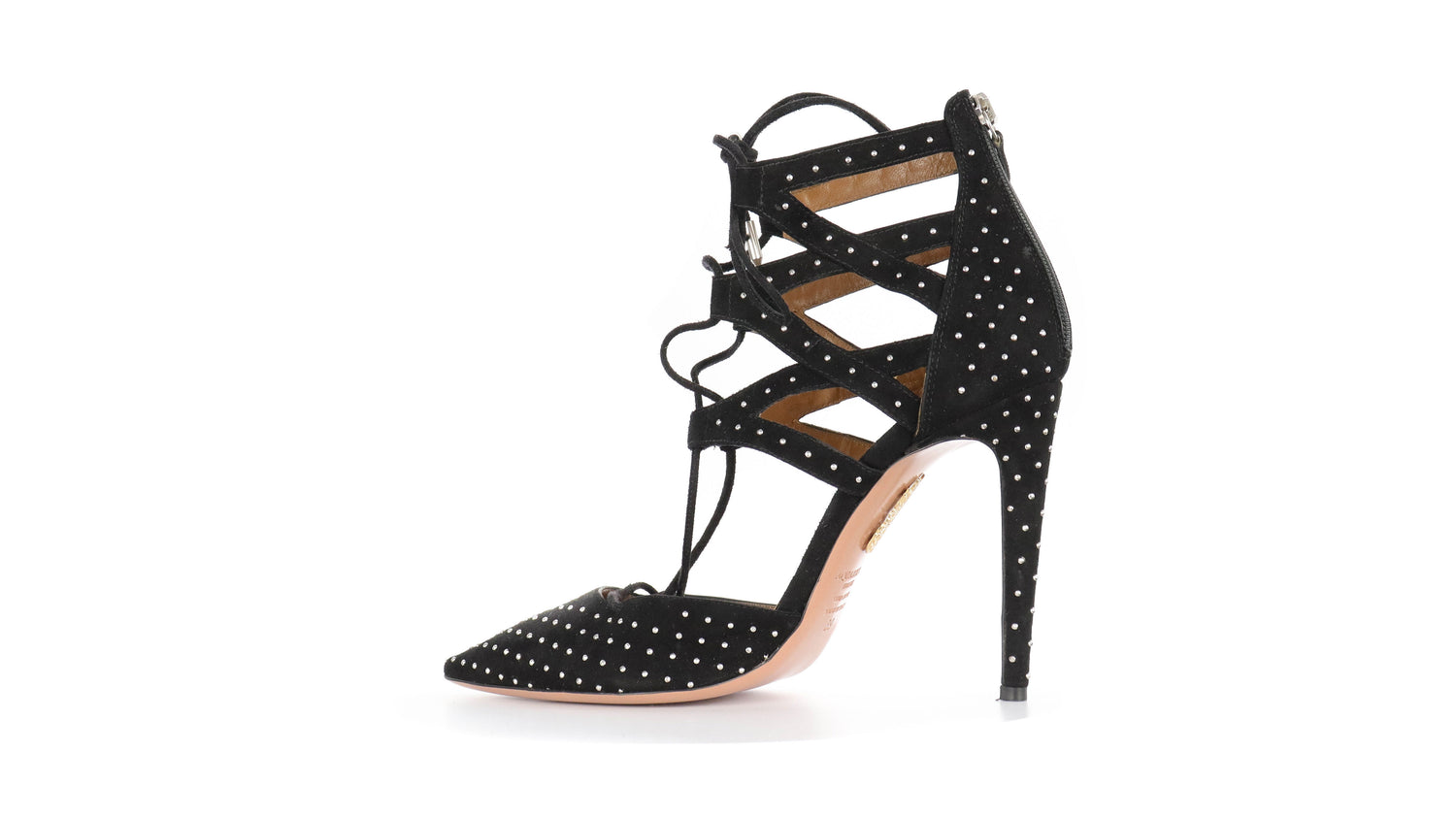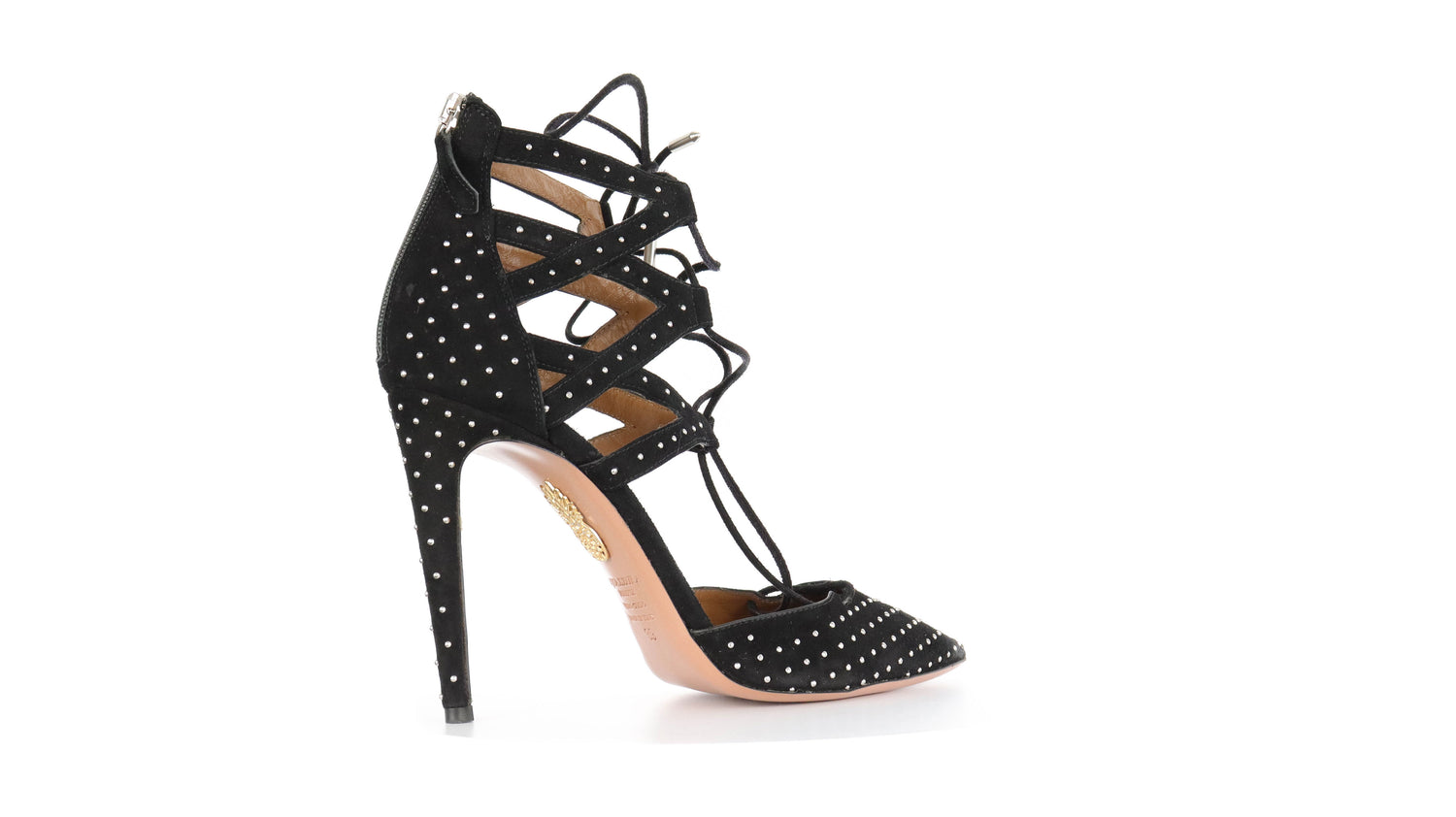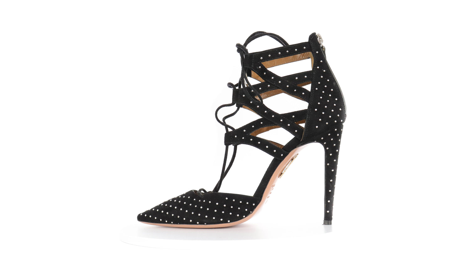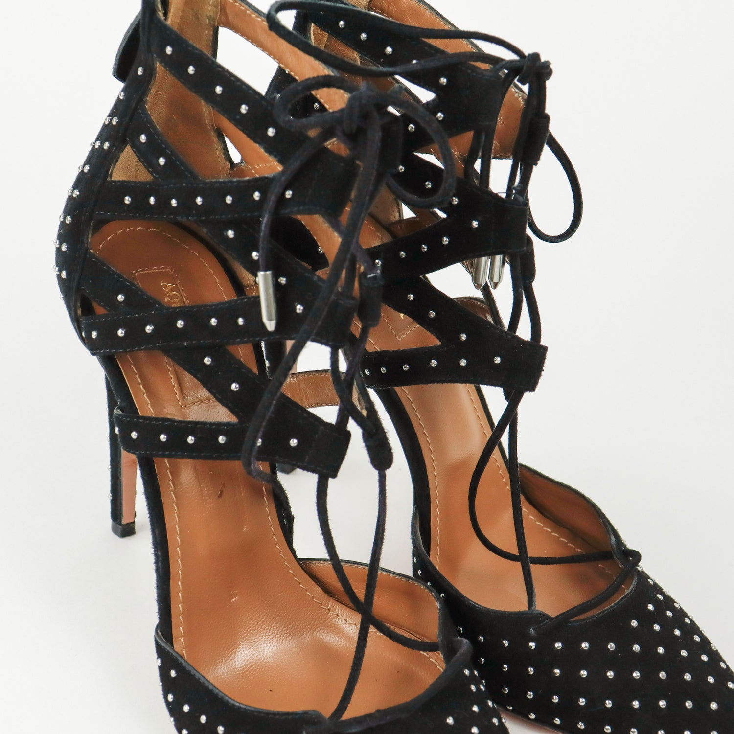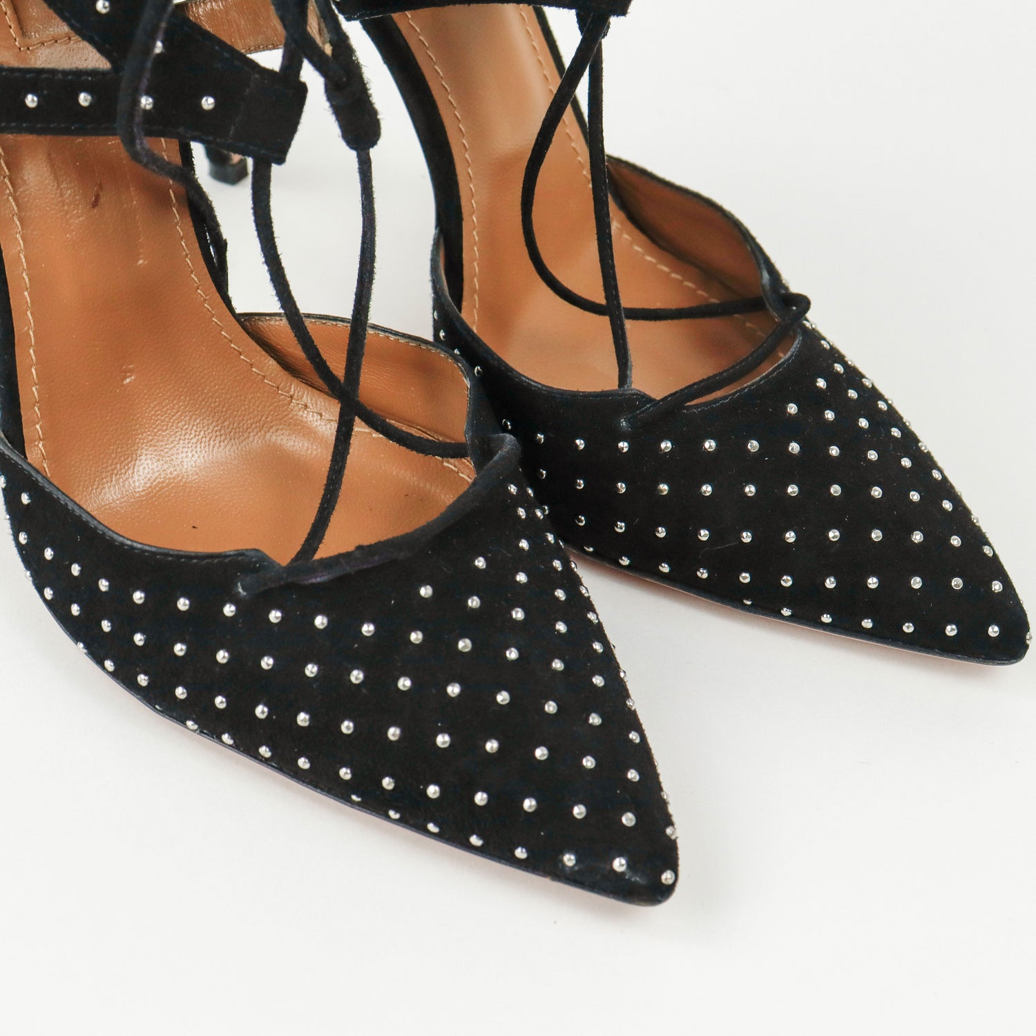 Tacones marca Aquazzura fabricados en gamuza color negro, con detalles de estoperol en toda la superficie, puntera en V cerrada, cierre de cremallera ajustable en la parte de la plantilla y en la parte frontal ajustables con agujeta.