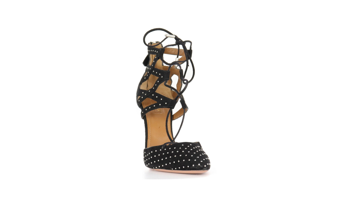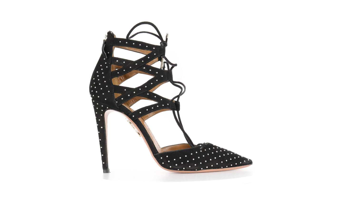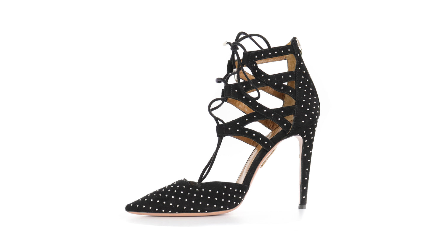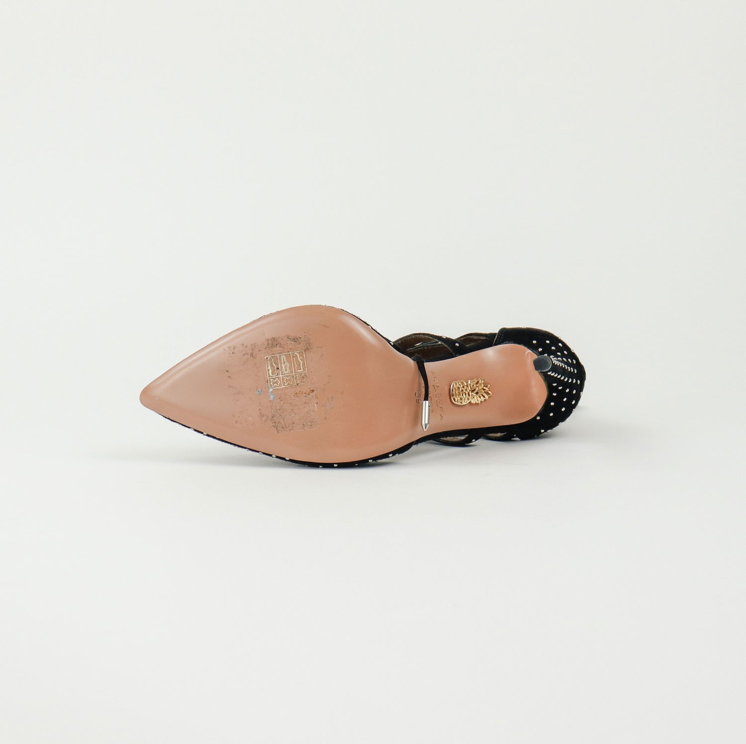 Tacones marca Aquazzura fabricados en gamuza color negro, con detalles de estoperol en toda la superficie, puntera en V cerrada, cierre de cremallera ajustable en la parte de la plantilla y en la parte frontal ajustables con agujeta.
