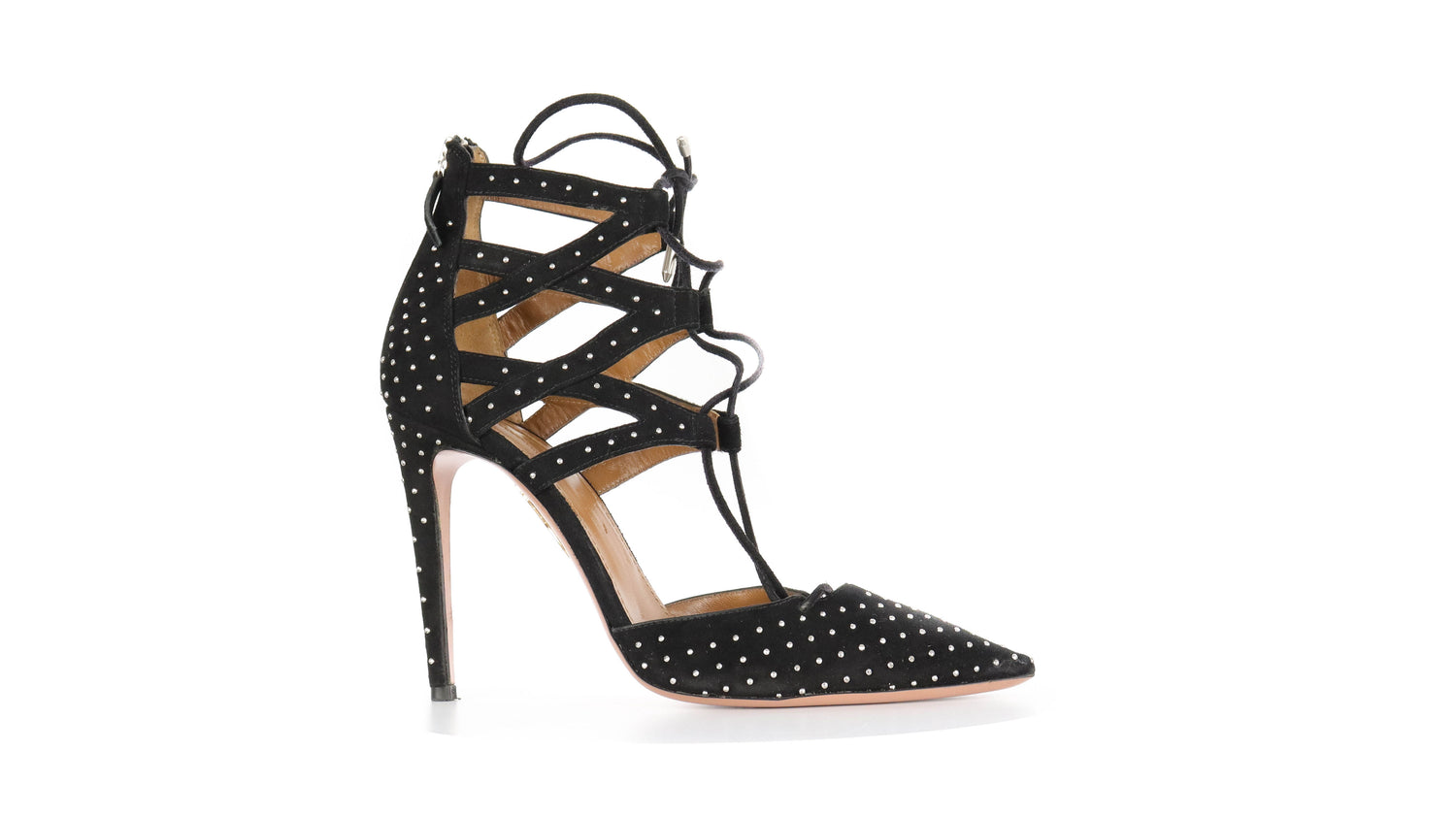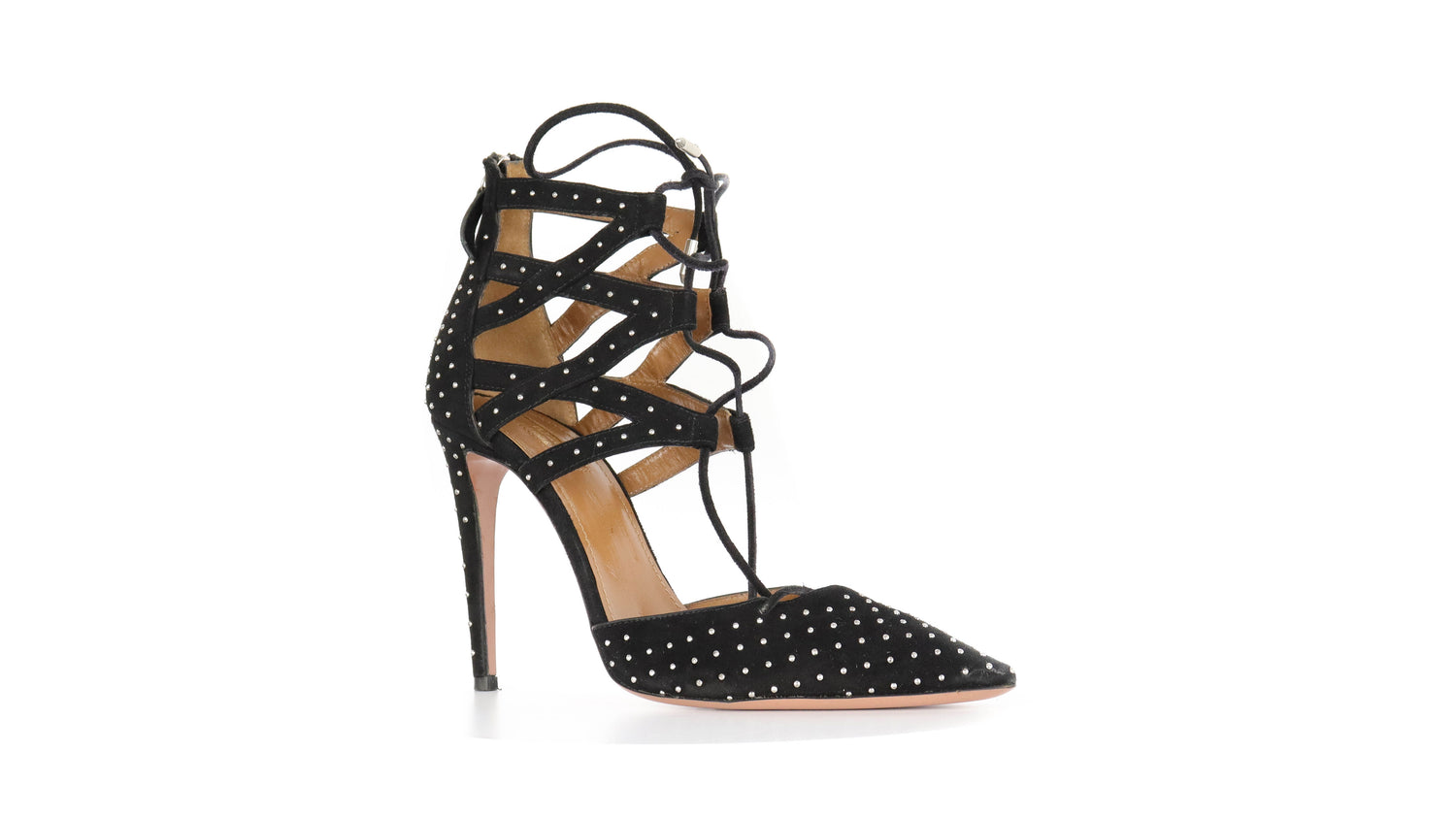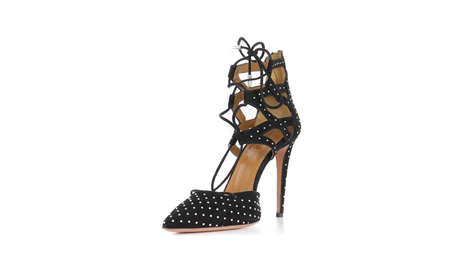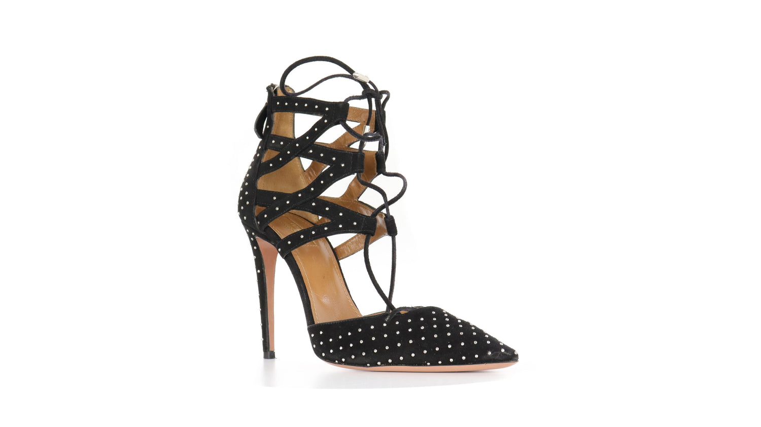 Tacones marca Aquazzura fabricados en gamuza color negro, con detalles de estoperol en toda la superficie, puntera en V cerrada, cierre de cremallera ajustable en la parte de la plantilla y en la parte frontal ajustables con agujeta.