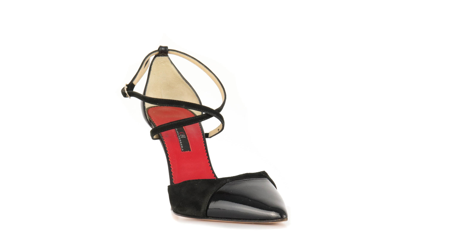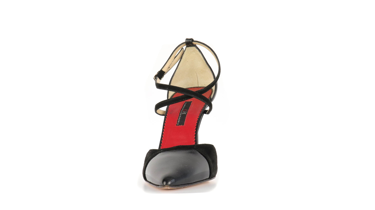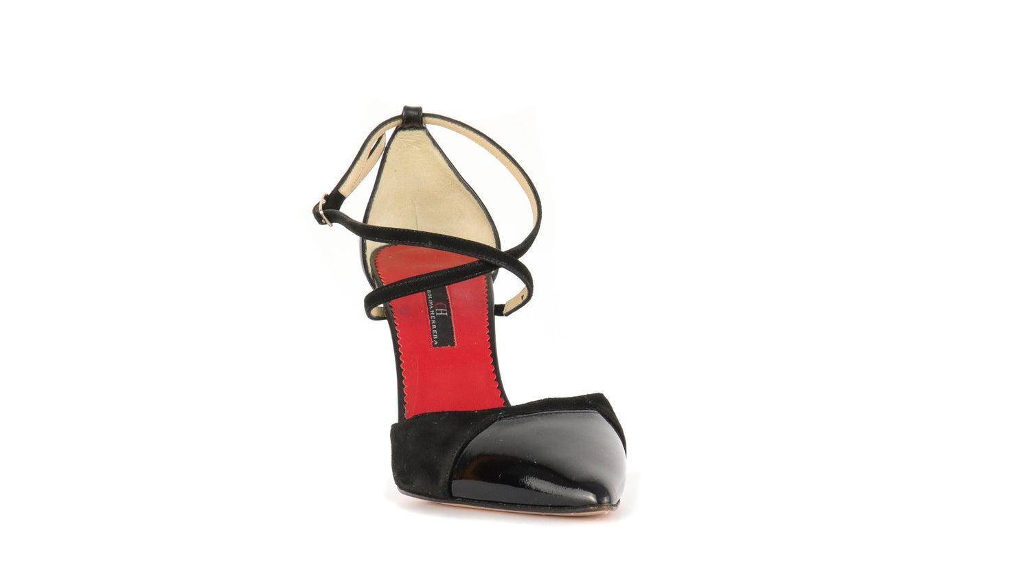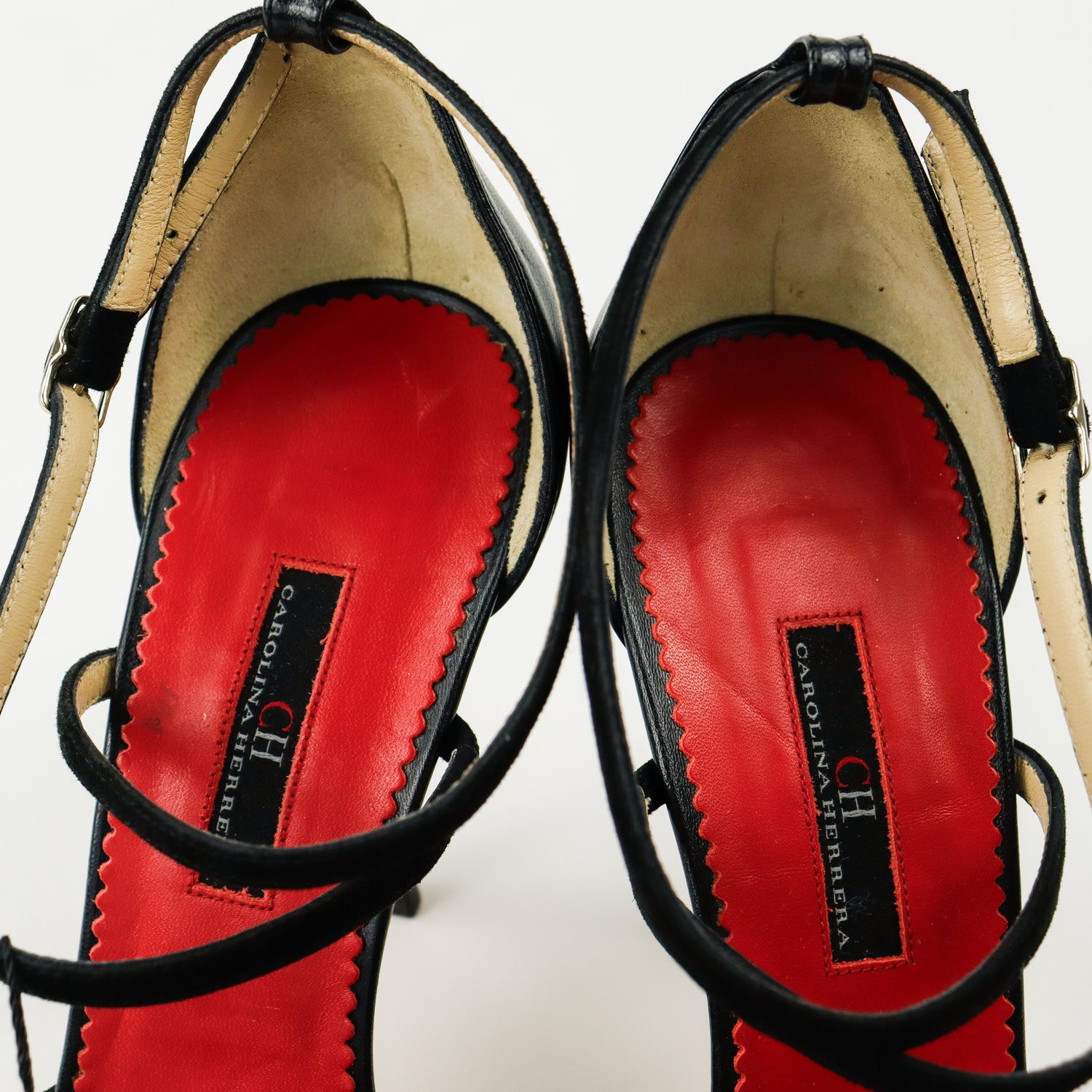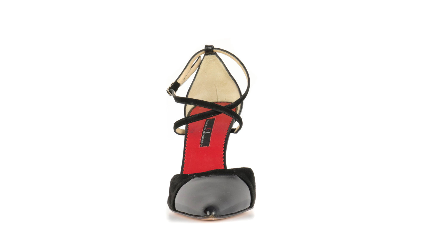 Tacones Carolina Herrera confeccionados en piel y charol negro, talonera con cintas cruzadas.