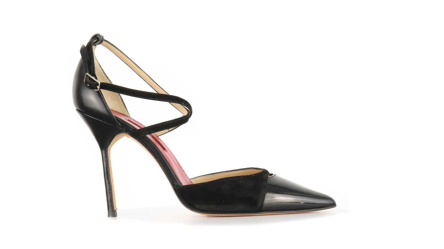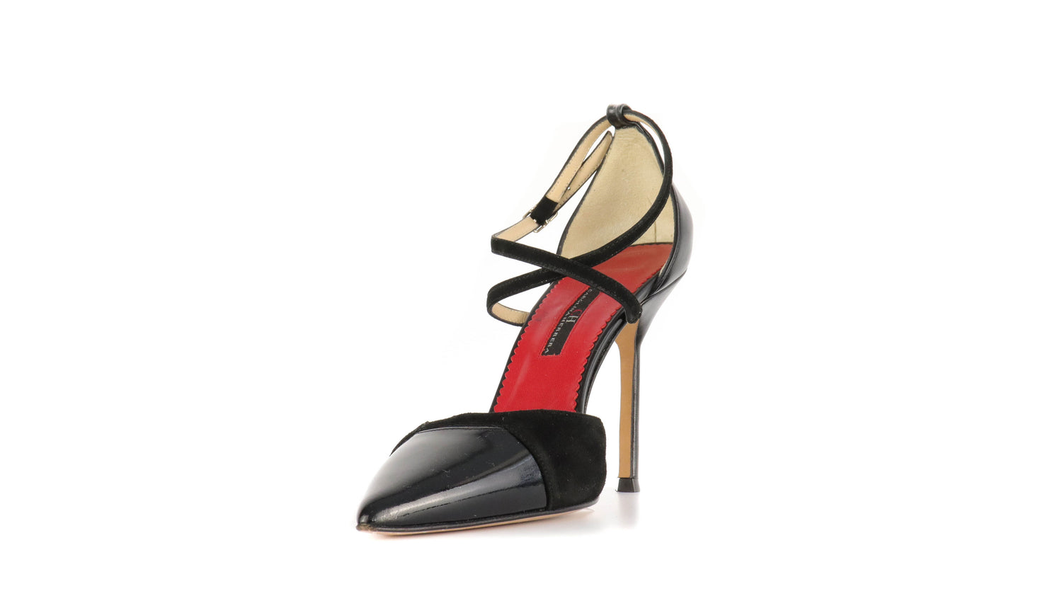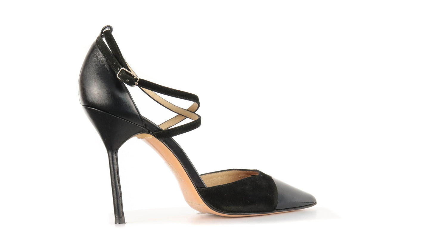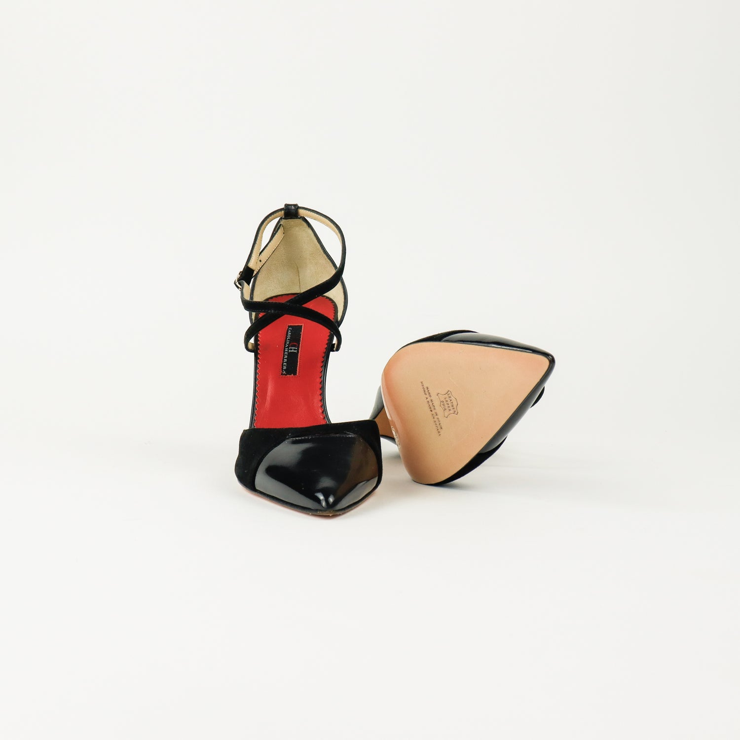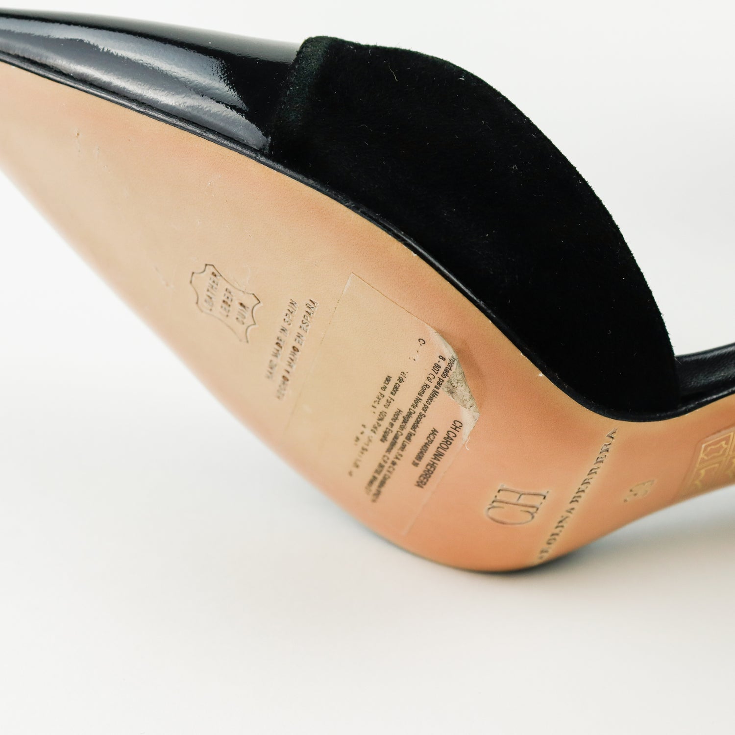 Tacones Carolina Herrera confeccionados en piel y charol negro, talonera con cintas cruzadas.
