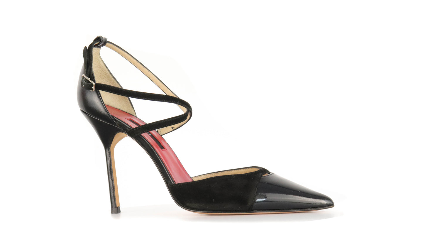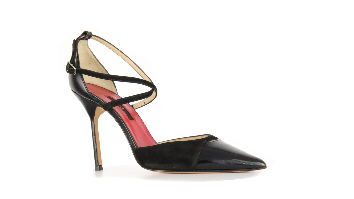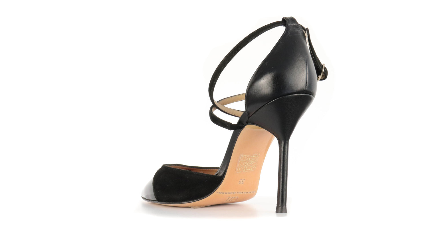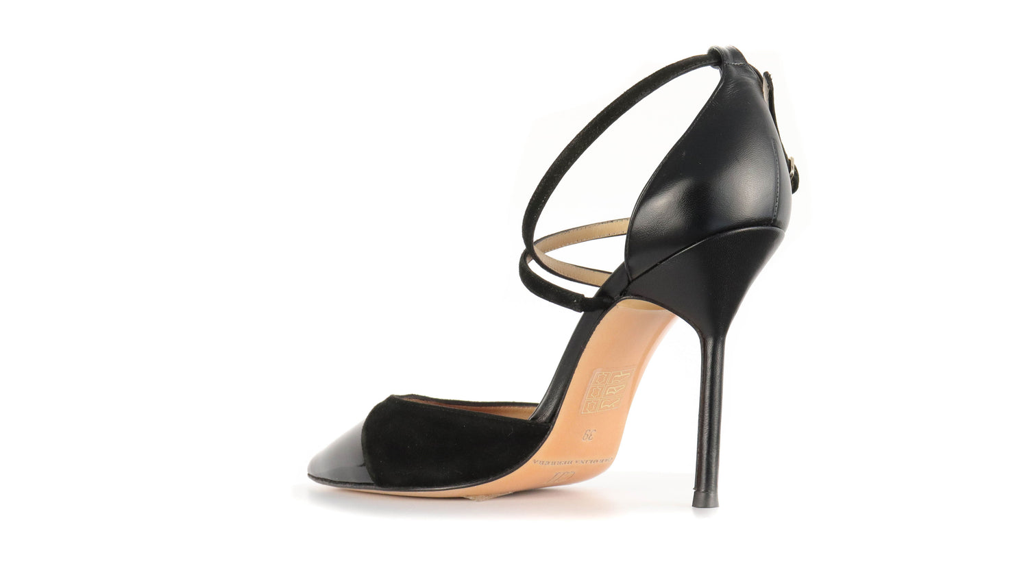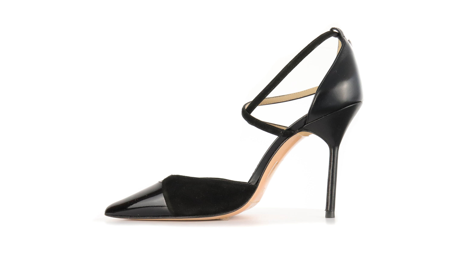 Tacones Carolina Herrera confeccionados en piel y charol negro, talonera con cintas cruzadas.