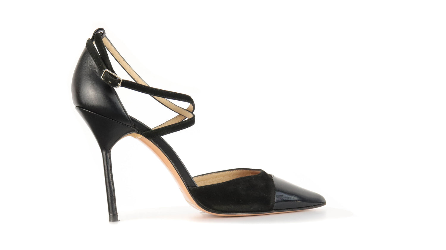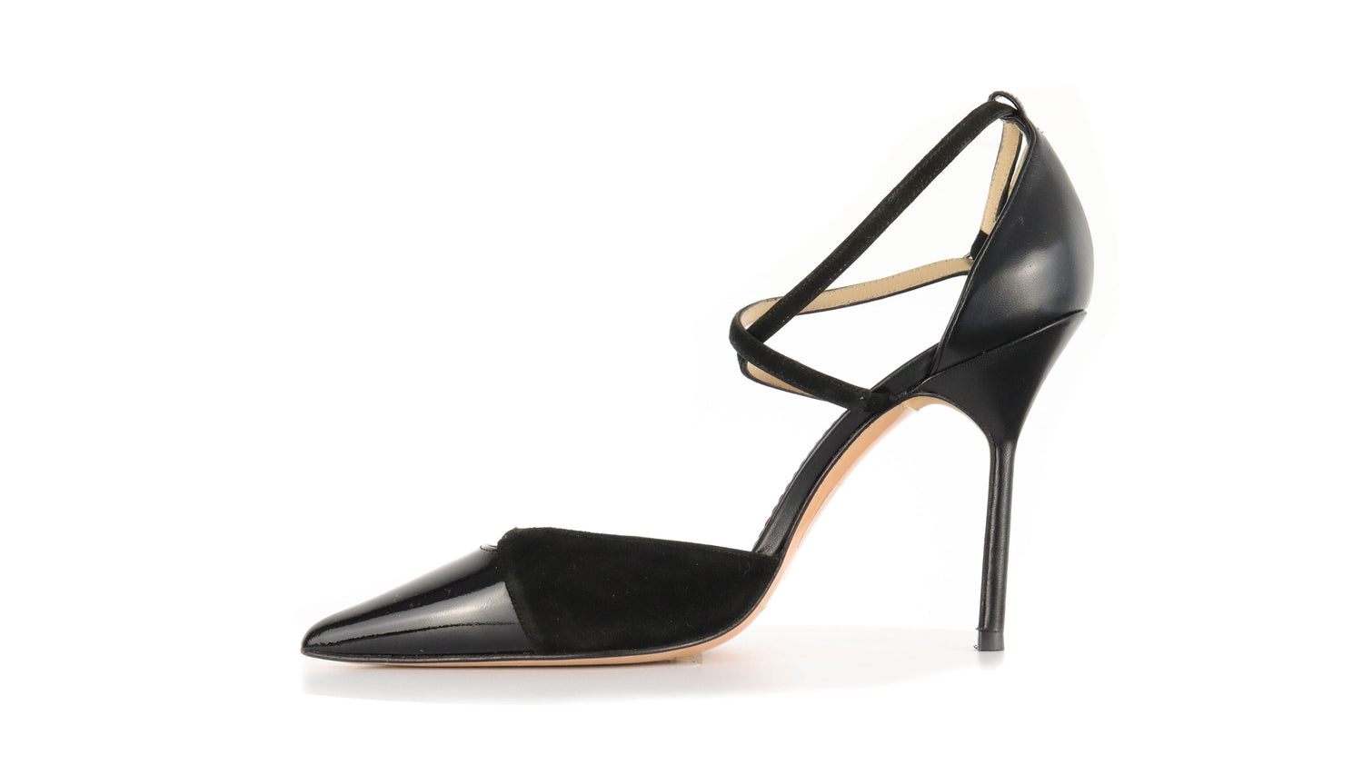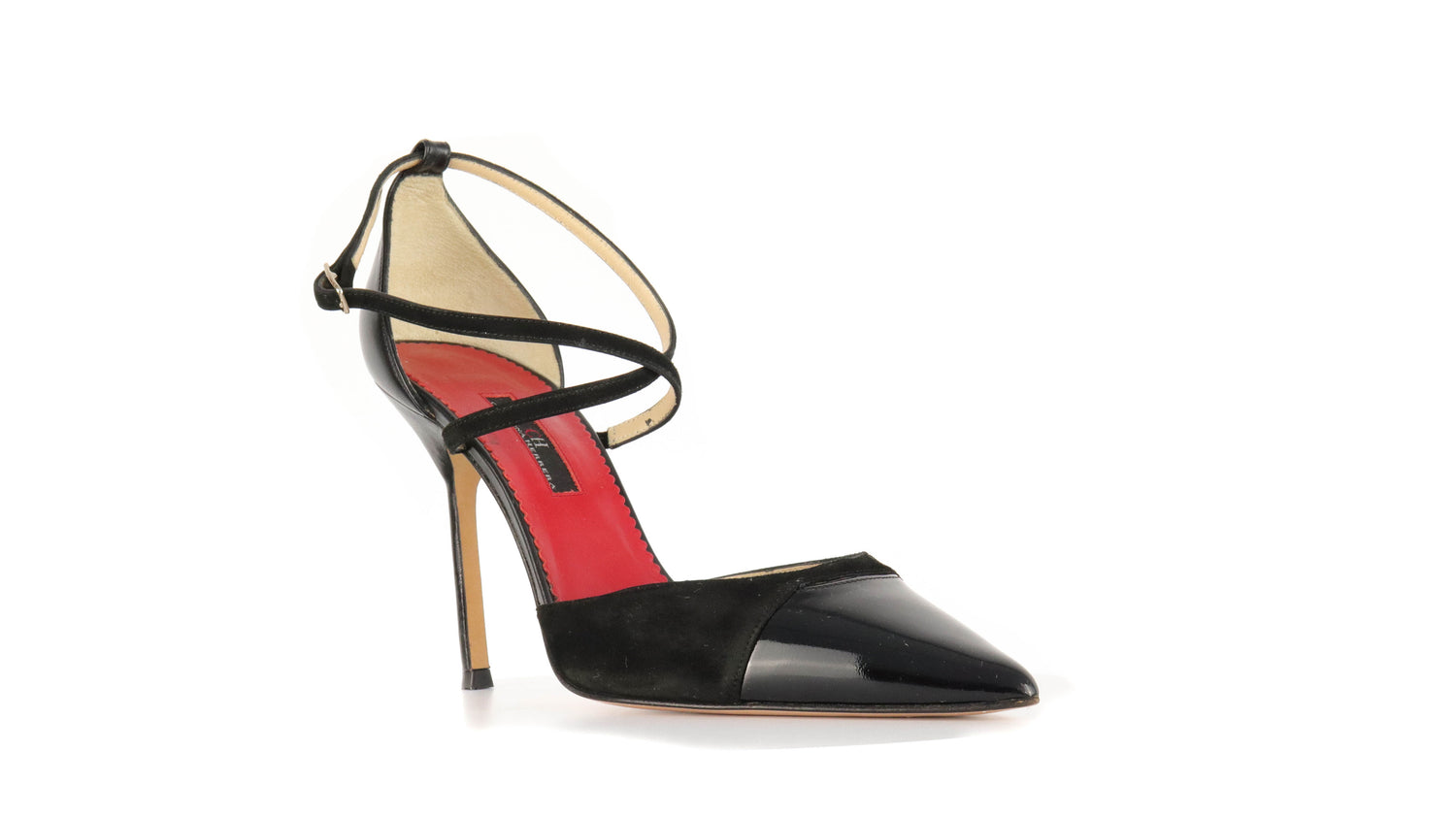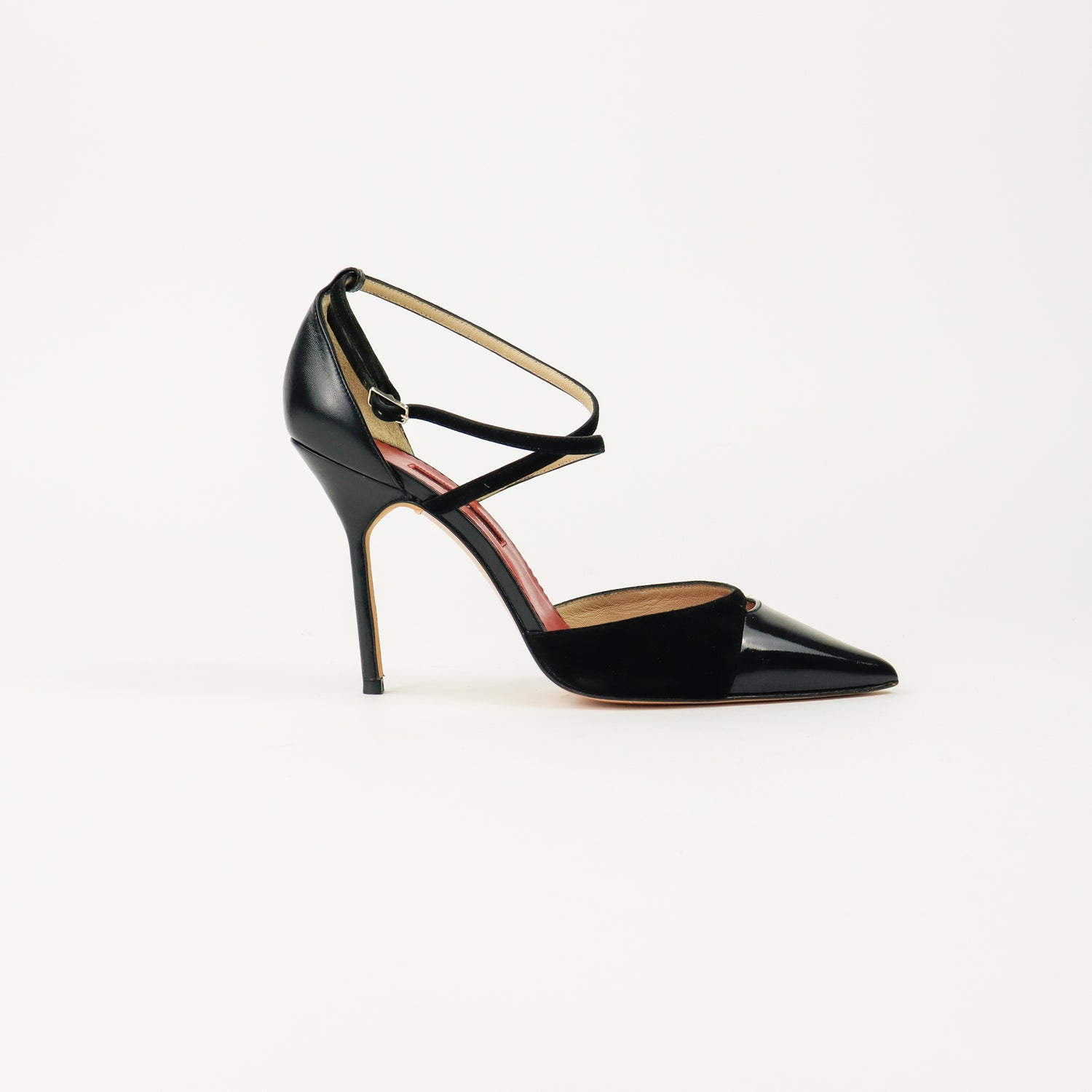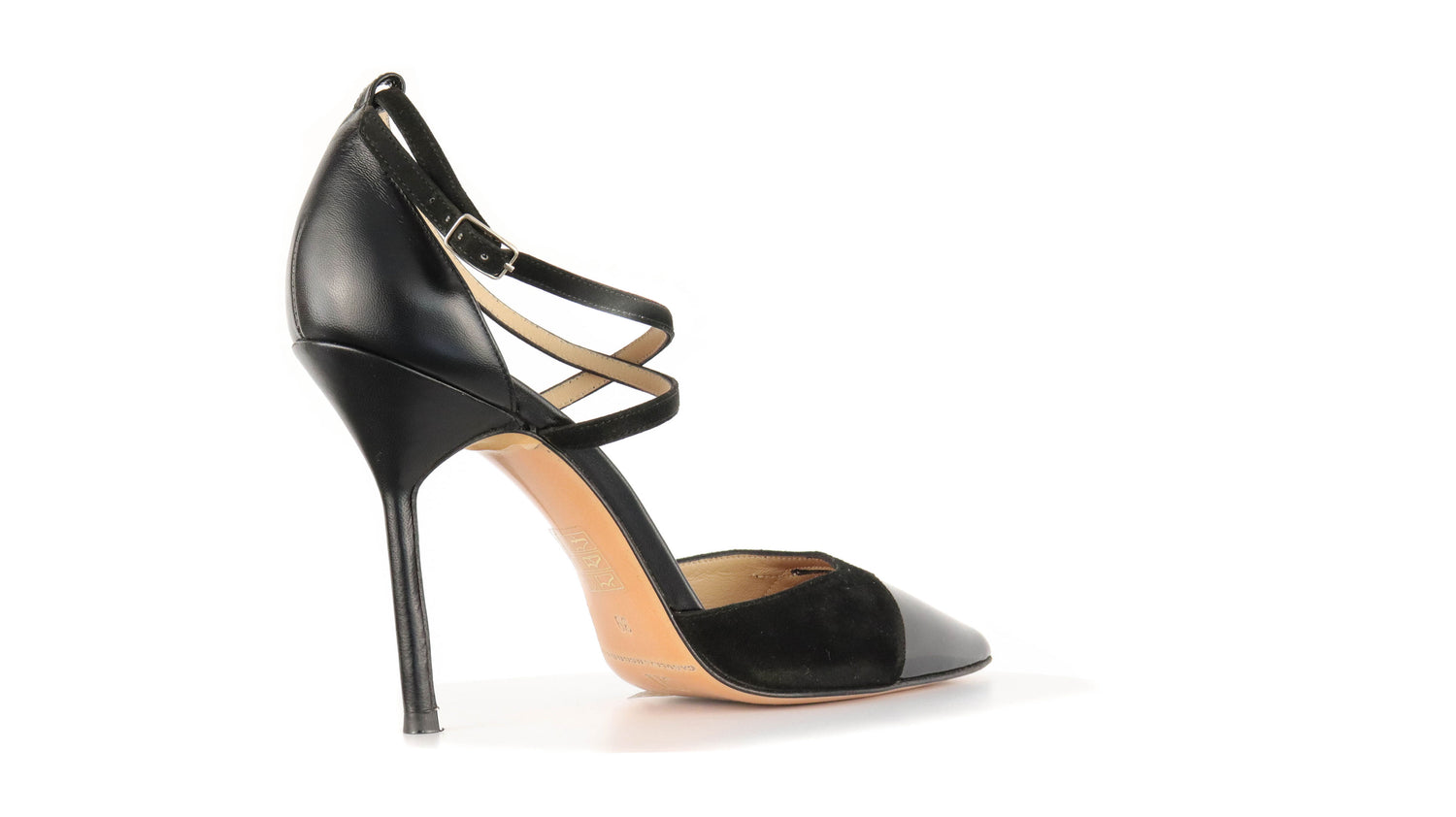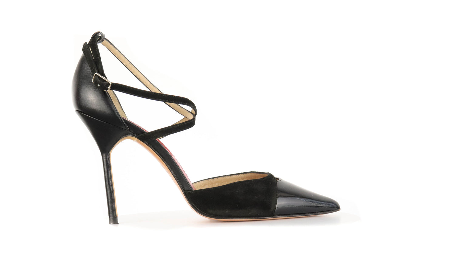 Tacones Carolina Herrera confeccionados en piel y charol negro, talonera con cintas cruzadas.